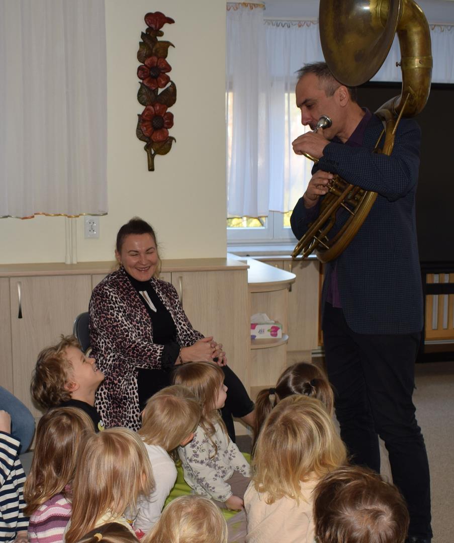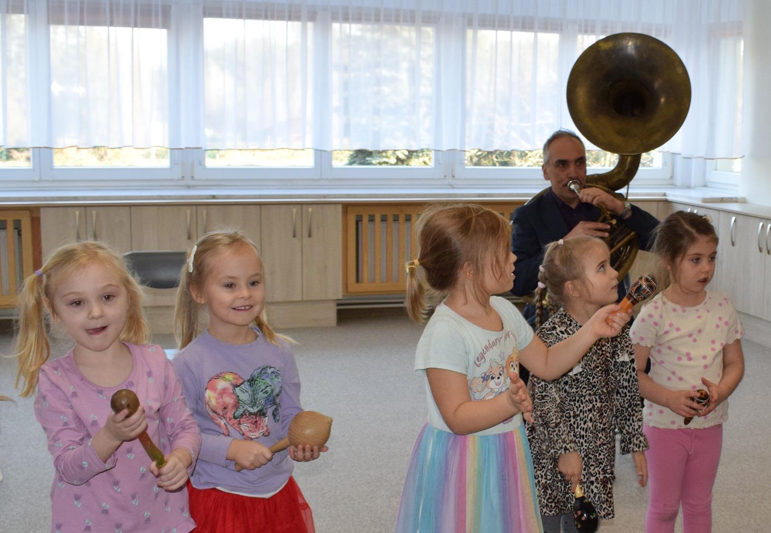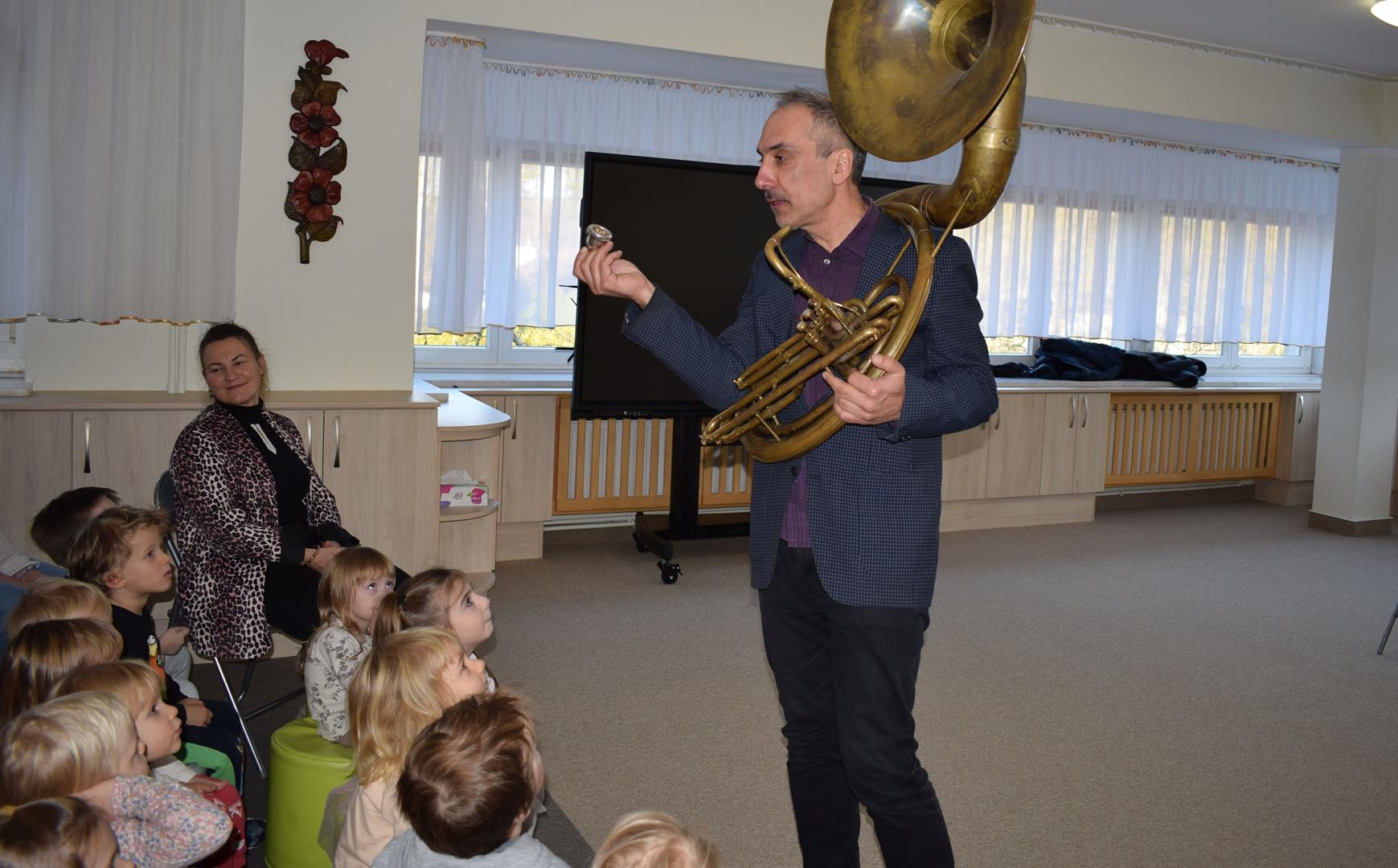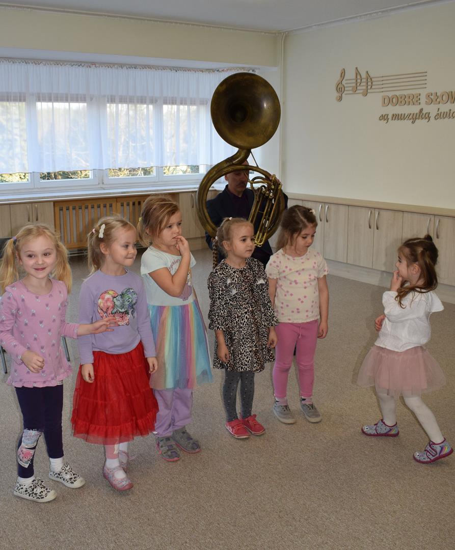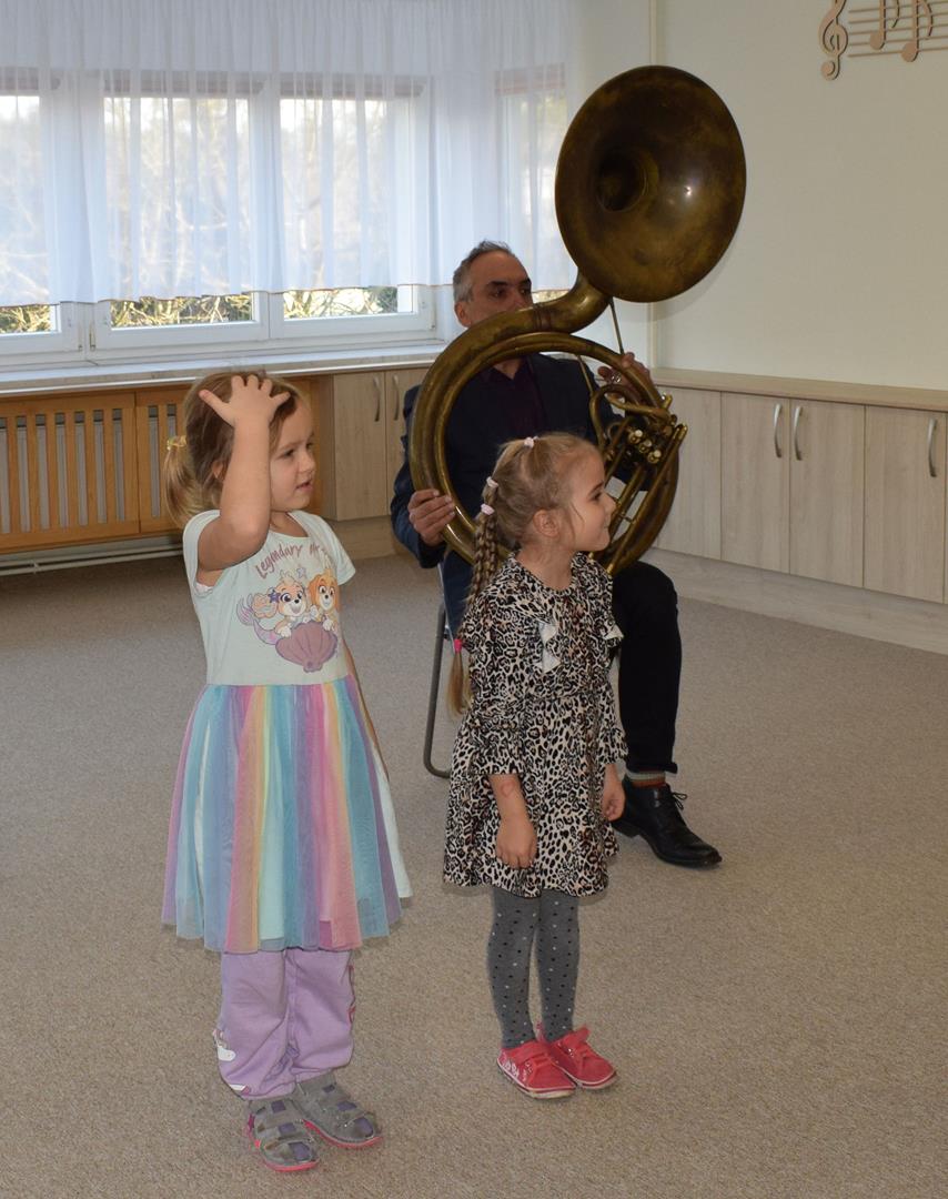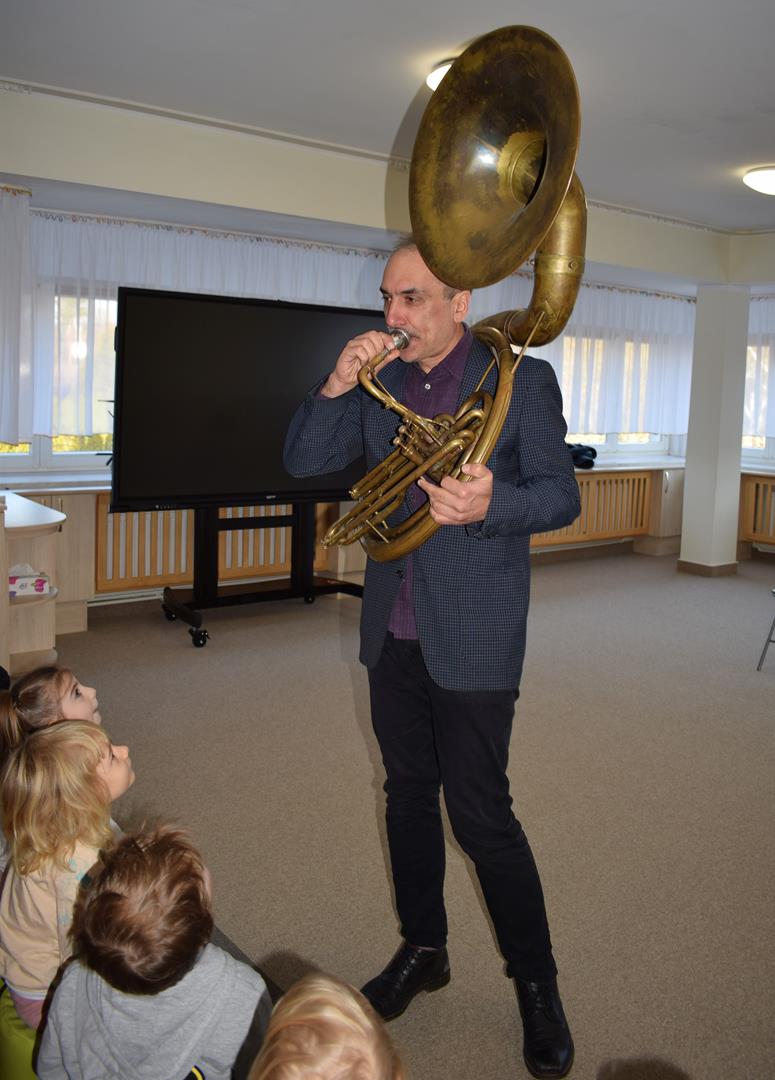 W miesiącu listopadzie pani Izabella zabrała nas w podróż do Krainy Muzyki. Tym razem mogliśmy poznać największy i najniżej brzmiący instrument w orkiestrowej rodzinie dętych blaszanych – suzafon. Wielki i wydający potężne dźwięki przyciągnął samego słonia, który rozpoznał w niej znajomo brzmiące nuty. A nas najbardziej zachwycił jego wygląd. Gdyby nie ciężar, mógłby stanowić iście oryginalne nakrycie głowy każdej damy.