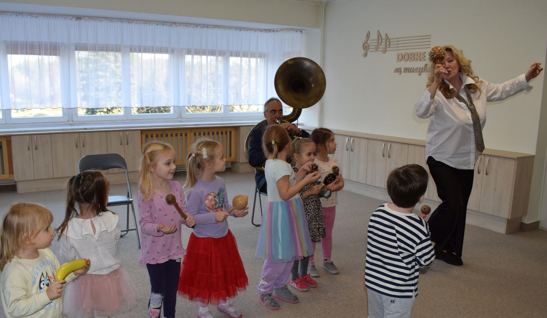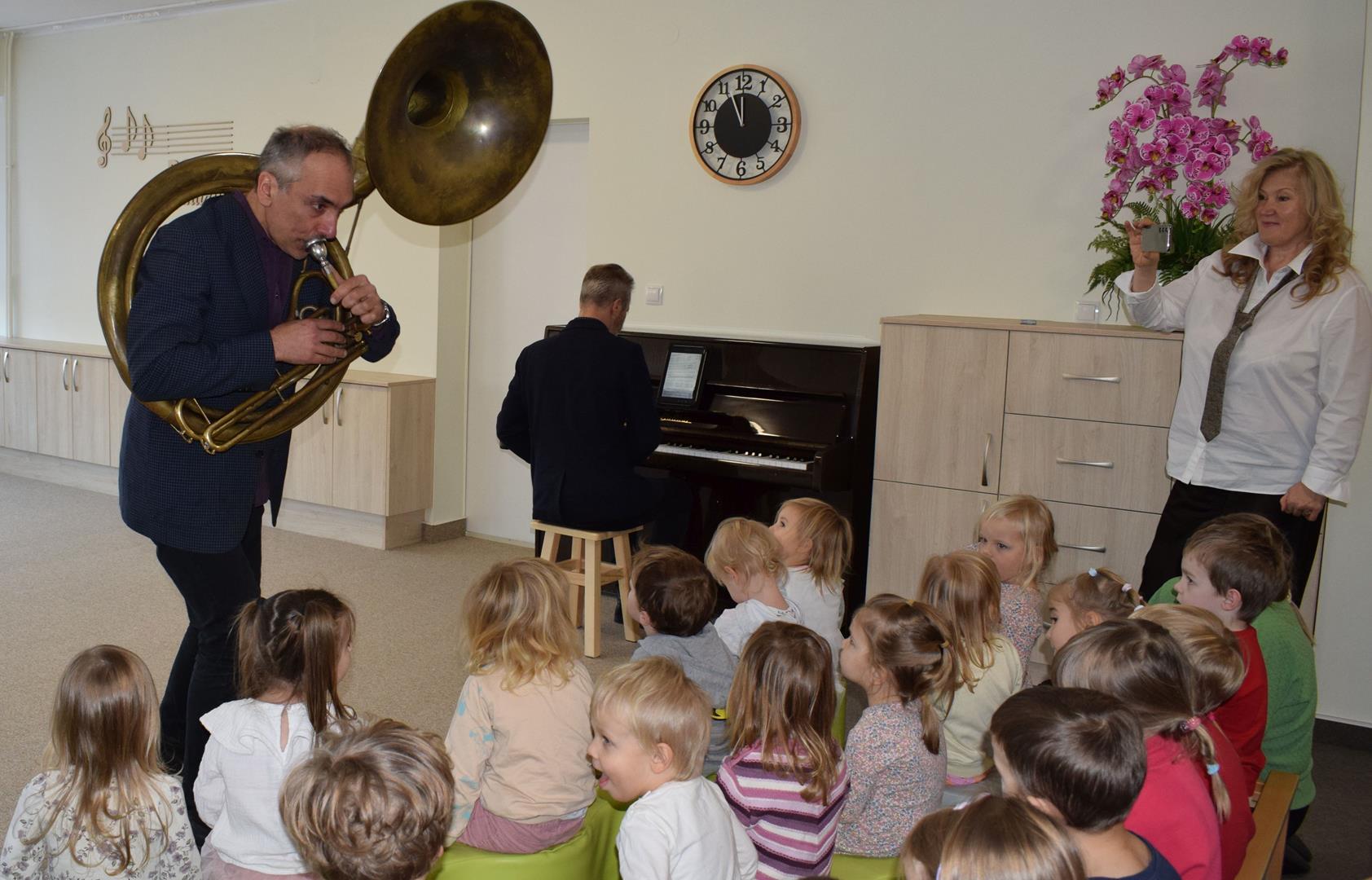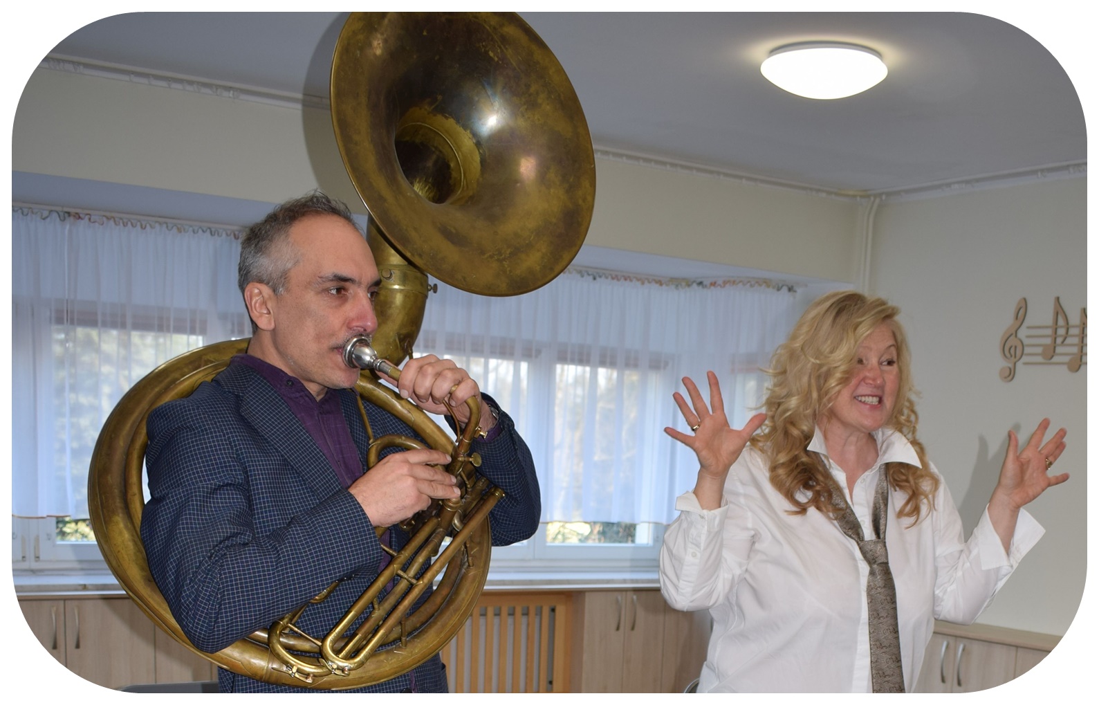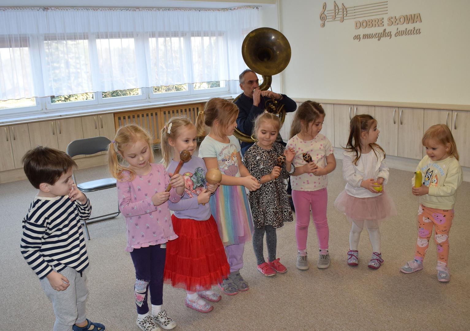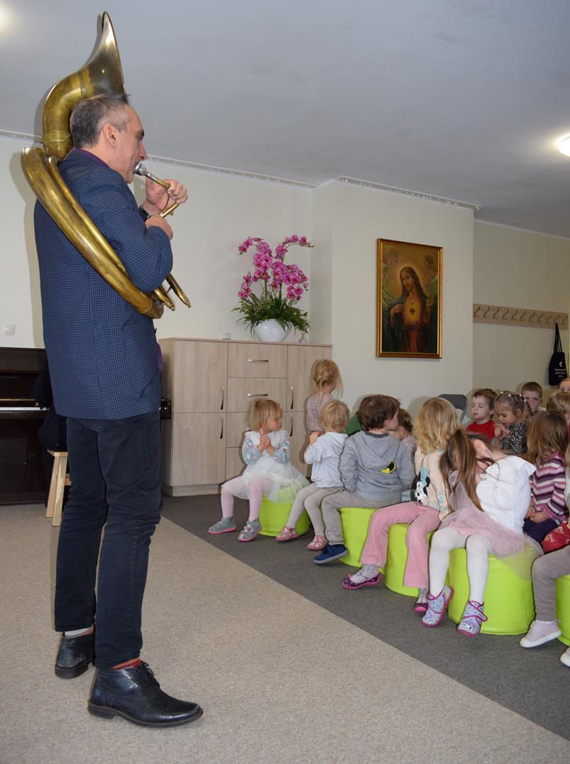 W miesiącu listopadzie pani Izabella zabrała nas w podróż do Krainy Muzyki. Tym razem mogliśmy poznać największy i najniżej brzmiący instrument w orkiestrowej rodzinie dętych blaszanych – suzafon. Wielki i wydający potężne dźwięki przyciągnął samego słonia, który rozpoznał w niej znajomo brzmiące nuty. A nas najbardziej zachwycił jego wygląd. Gdyby nie ciężar, mógłby stanowić iście oryginalne nakrycie głowy każdej damy.