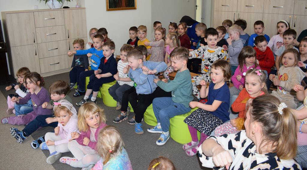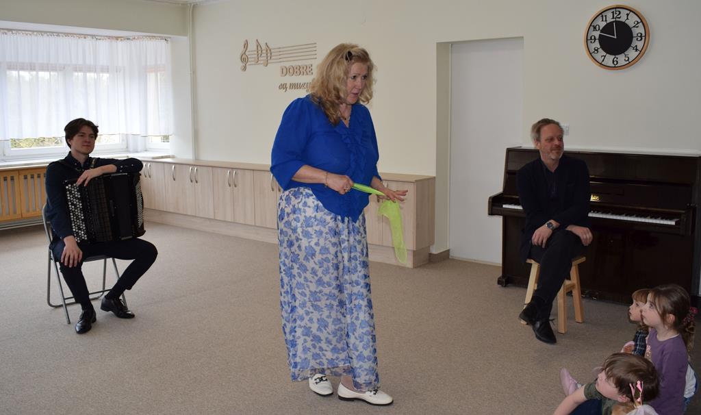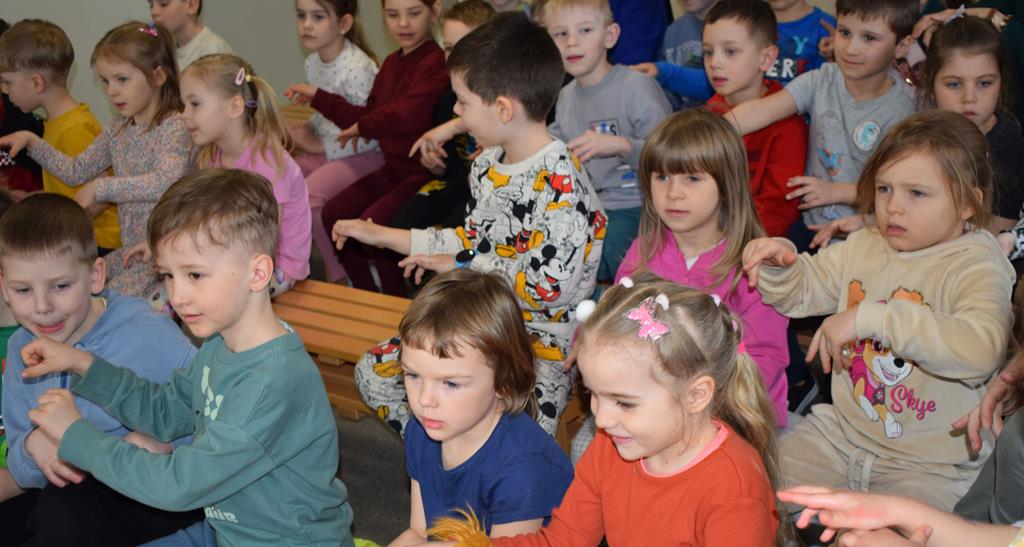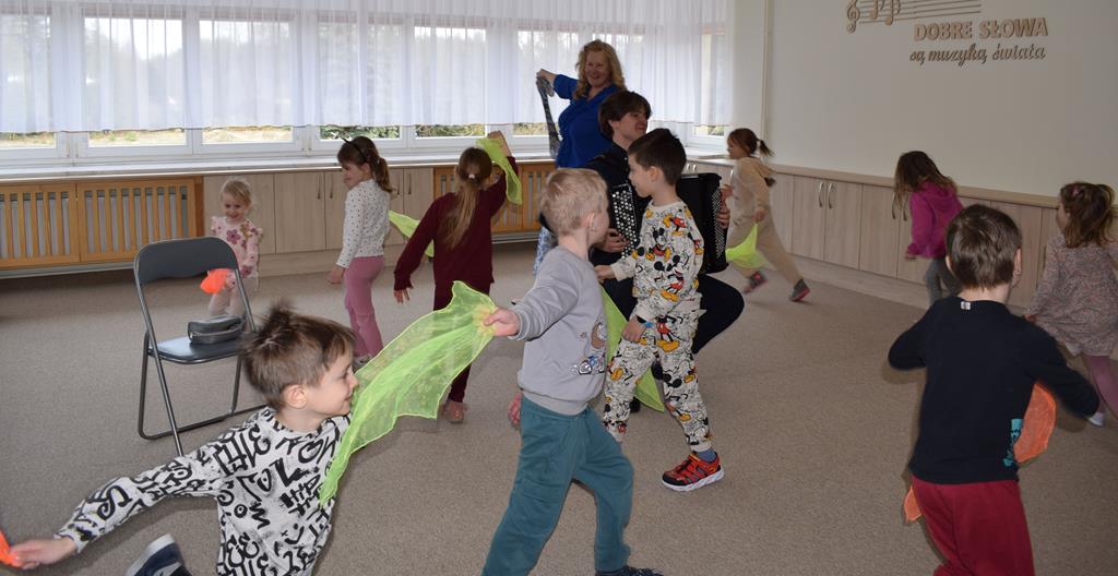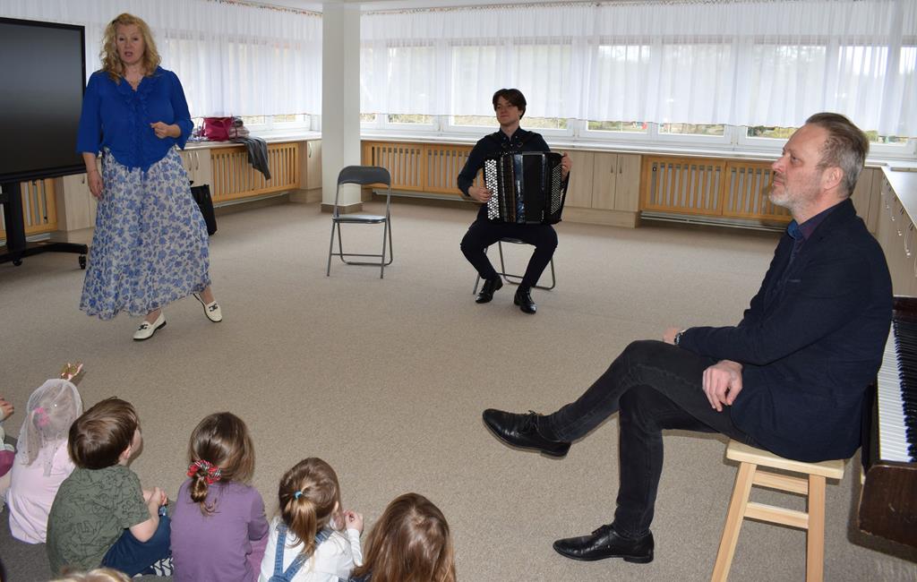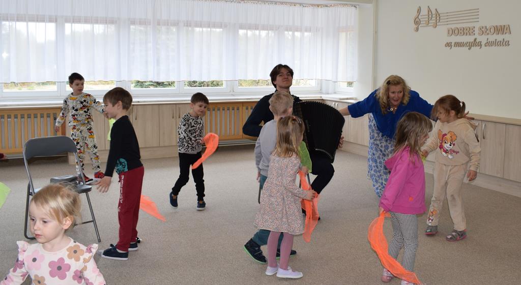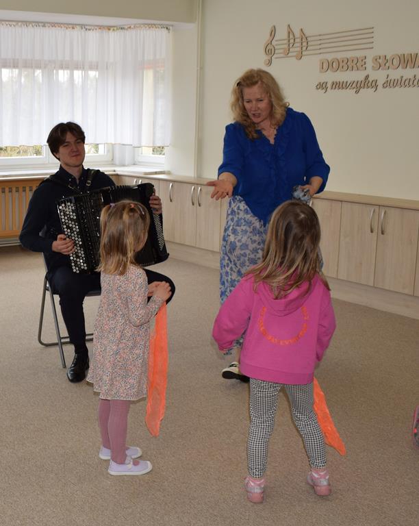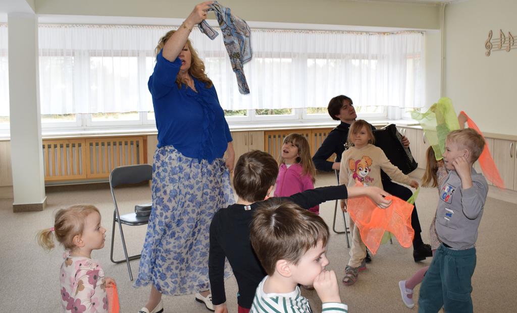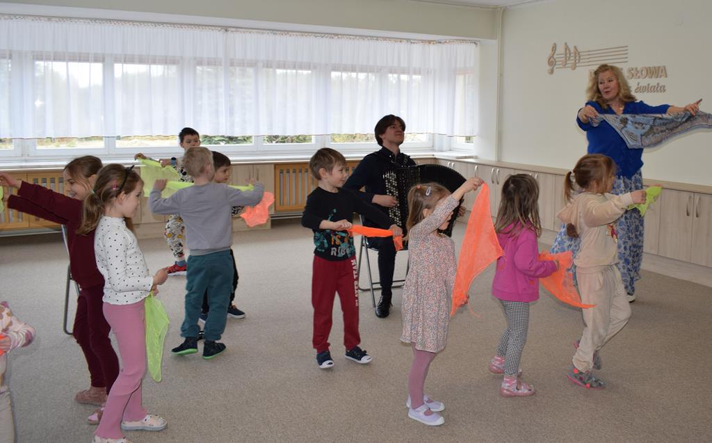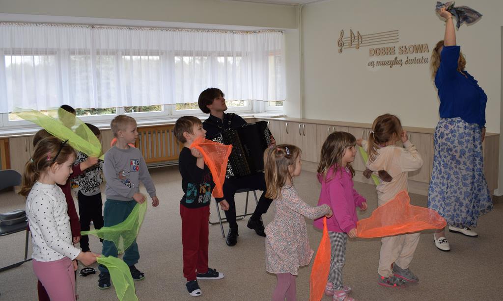 Podczas interaktywnej audycji „Jak skrzaty i trolle szukały wiosny w lesie” dzieci wyruszyły w podróż do budzącego się z zimowego snu lasu, by wraz z bajkowymi bohaterami – skrzatami i trollami – odnaleźć pierwsze oznaki wiosny. Głównym bohaterem spotkania, obok leśnych postaci, był akordeon. Muzycy w przystępny i zabawny sposób przybliżyli dzieciom ten niezwykły instrument. Dowiedzieliśmy się, do czego służy miech i jak akordeon „oddycha”. Odkryliśmy różnicę między klawiszami a guzikami basowymi. Słuchaliśmy, jak za pomocą instrumentów można opowiadać historie bez słów. Największą atrakcją było naśladowanie dźwięków pracy drwala – rytmiczne, mocne uderzenia w akordeon idealnie oddawały odgłos rąbania drewna. Kontrastem dla nich była subtelna gra na gwizdku, która do złudzenia przypominała ptasie trele, obwieszczające wszystkim zwierzętom powrót wiosny.
