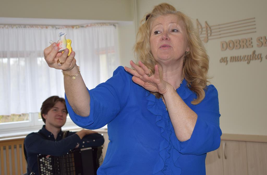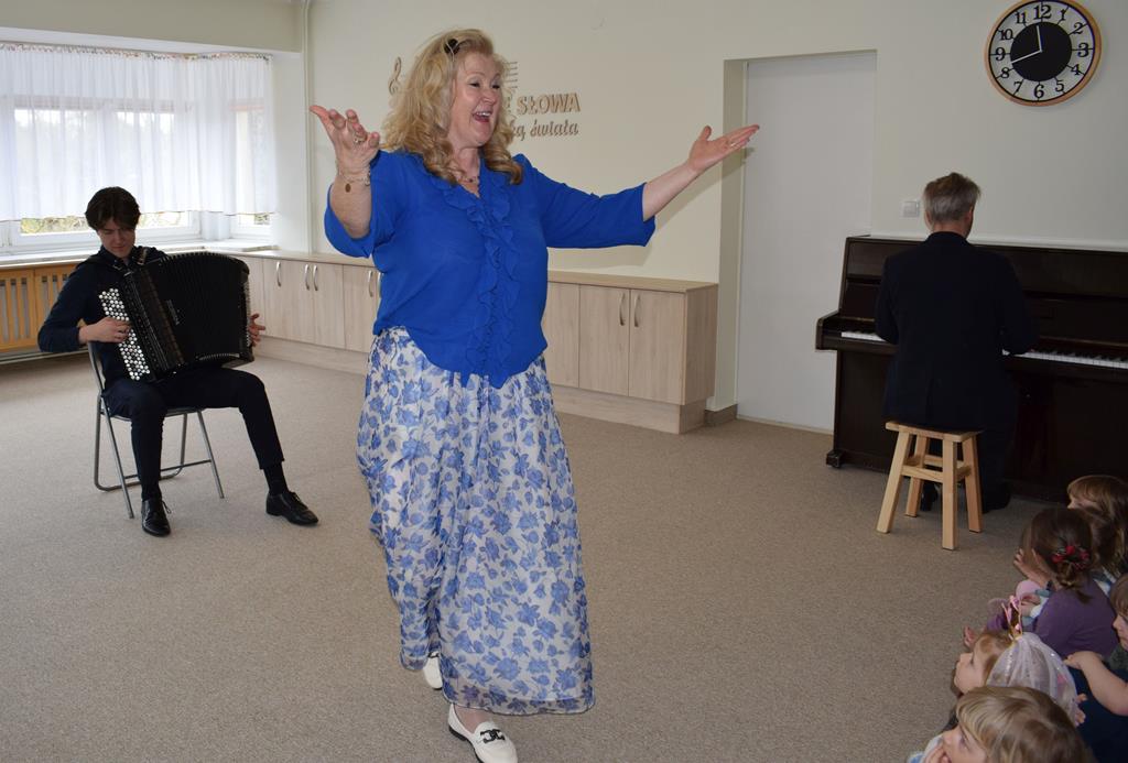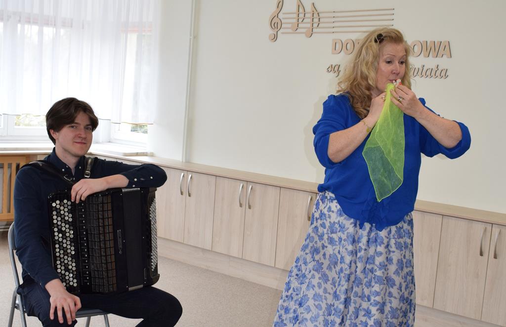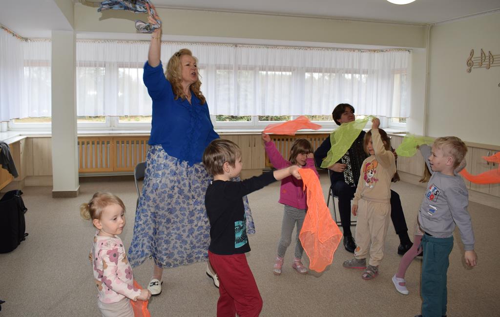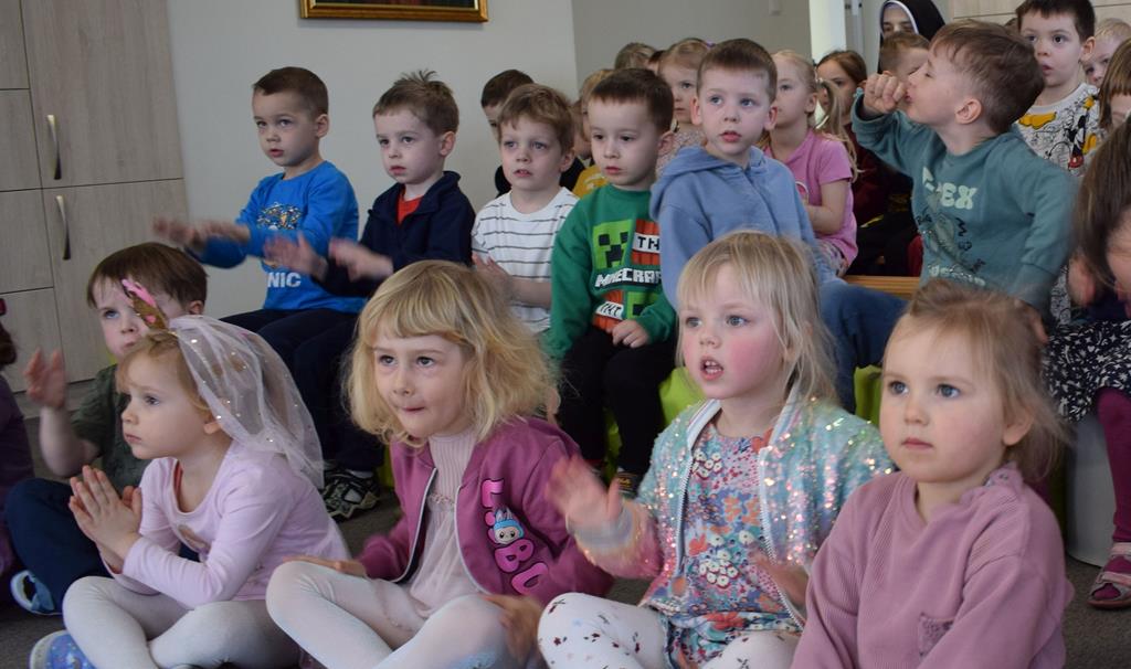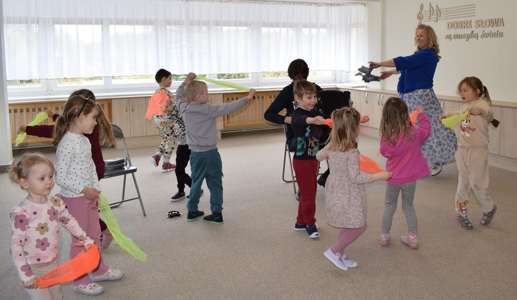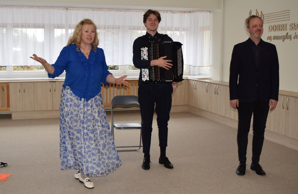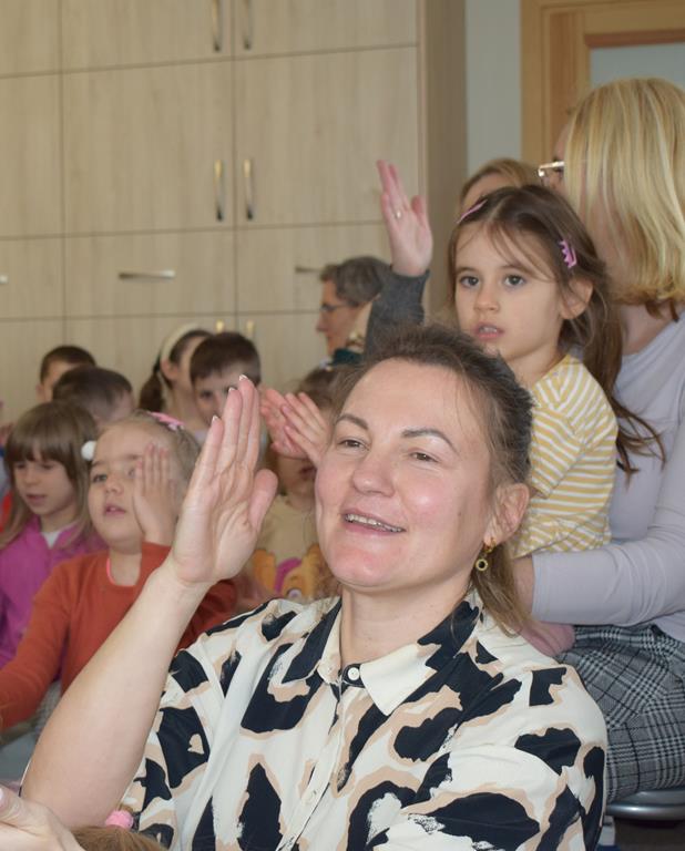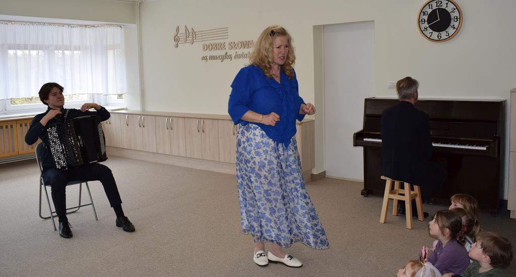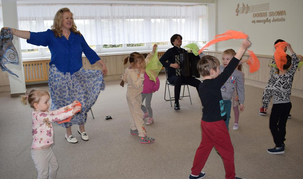Podczas interaktywnej audycji „Jak skrzaty i trolle szukały wiosny w lesie” dzieci wyruszyły w podróż do budzącego się z zimowego snu lasu, by wraz z bajkowymi bohaterami – skrzatami i trollami – odnaleźć pierwsze oznaki wiosny. Głównym bohaterem spotkania, obok leśnych postaci, był akordeon. Muzycy w przystępny i zabawny sposób przybliżyli dzieciom ten niezwykły instrument. Dowiedzieliśmy się, do czego służy miech i jak akordeon „oddycha”. Odkryliśmy różnicę między klawiszami a guzikami basowymi. Słuchaliśmy, jak za pomocą instrumentów można opowiadać historie bez słów. Największą atrakcją było naśladowanie dźwięków pracy drwala – rytmiczne, mocne uderzenia w akordeon idealnie oddawały odgłos rąbania drewna. Kontrastem dla nich była subtelna gra na gwizdku, która do złudzenia przypominała ptasie trele, obwieszczające wszystkim zwierzętom powrót wiosny.