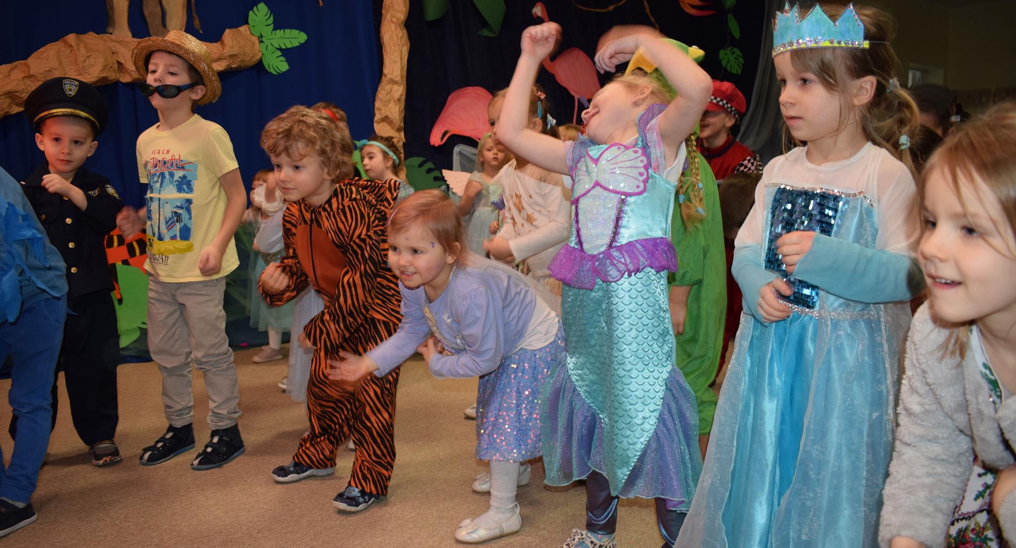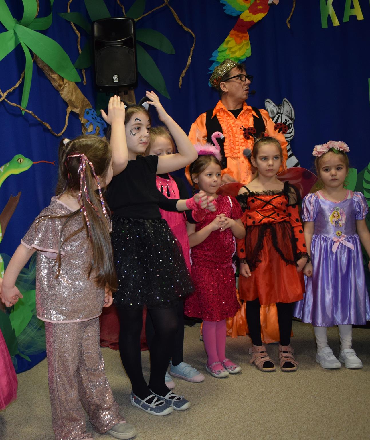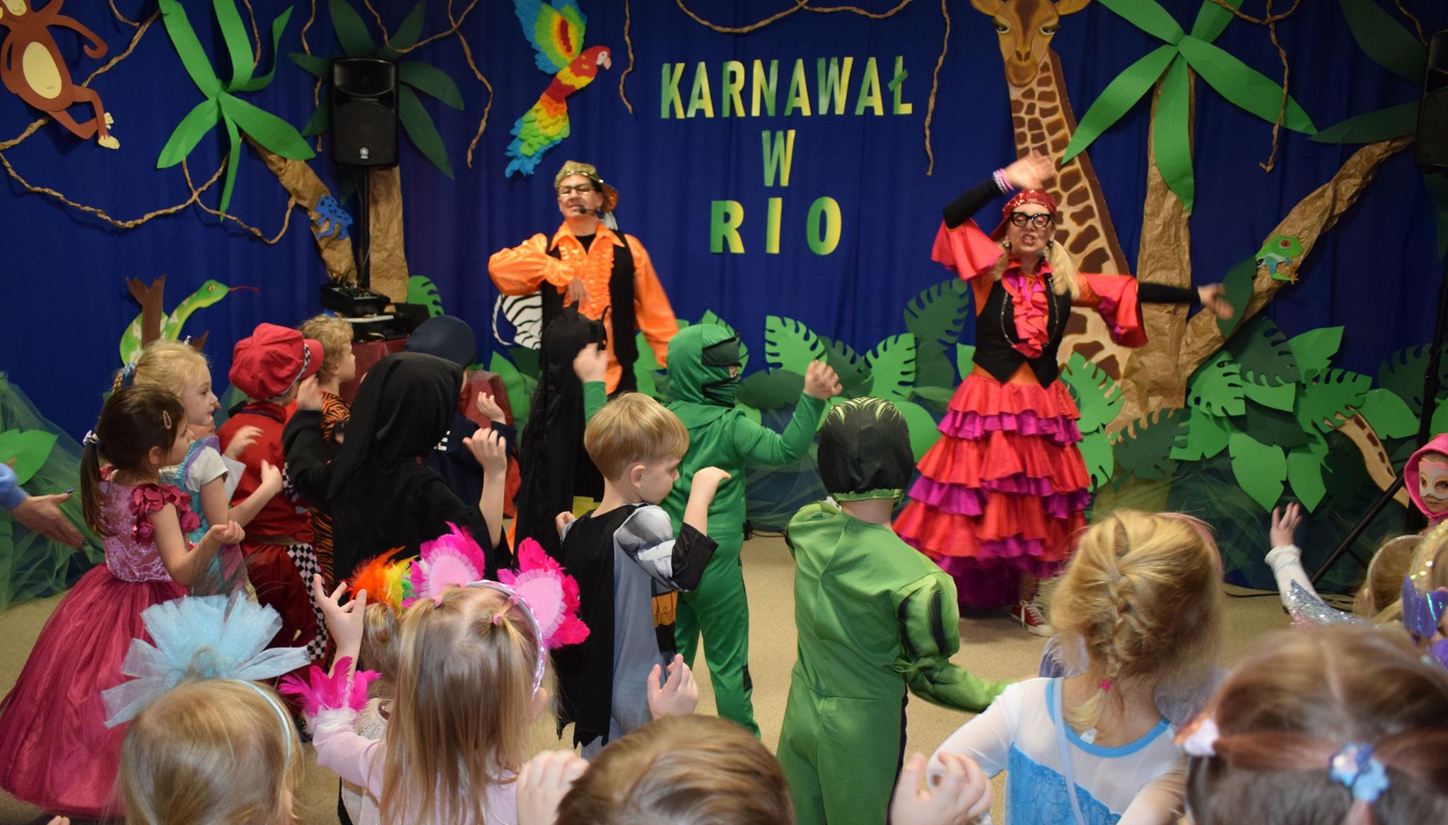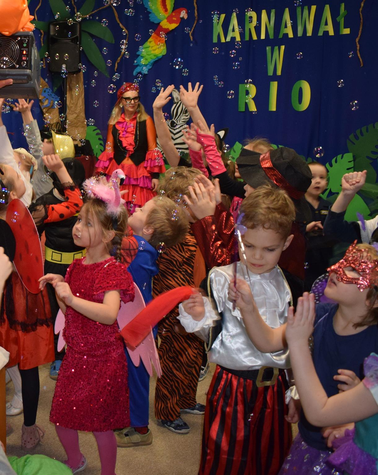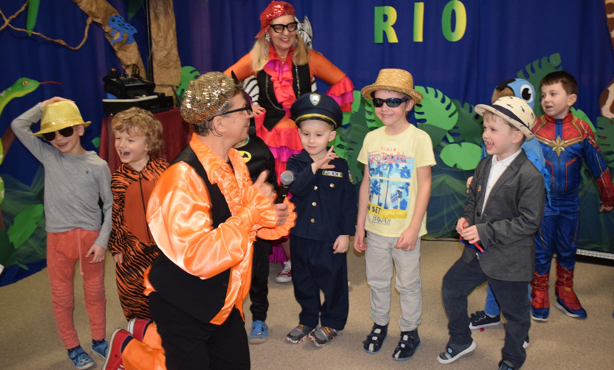 Tegoroczny karnawał rozpoczęliśmy taneczną imprezą. Żywiołowa muzyka pobudziła do tańca nawet najbardziej zasiedziałe przedszkolaki. Sunęliśmy po parkiecie solo, w parach i w wężykach w rytmie gorącej jak brazylijskie słońce samby. Wiele przebojów znaliśmy na pamięć, więc śpiewaliśmy głośno, jakby marząc o tym, by usłyszano nas na Copacabanie. Prowadzących zaś aktorów z Teatru Złoty Dukat zachwyciliśmy nie tylko swoimi umiejętnościami tanecznymi czy wokalnymi, lecz także wielobarwnymi strojami. Na parkiecie nie zabrakło policjantów, strażaków, postaci bajkowych, zwierzątek. Czas karnawałowych pląsów umilały liczne księżniczki i wróżki. Chwilami zdawało się, że wiosna już tuż-tuż, kiedy nagle swym kolorowym skrzydełkiem machnęła jakaś biedronka i motylek.