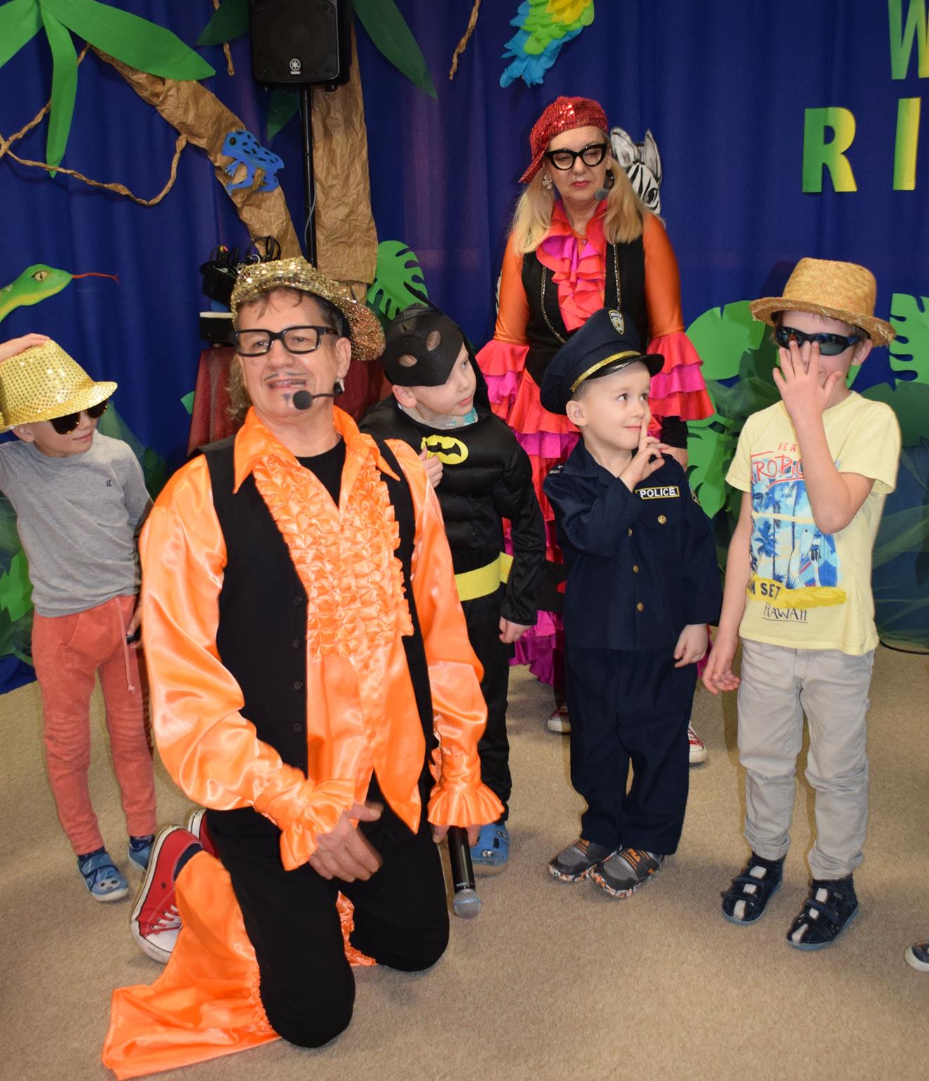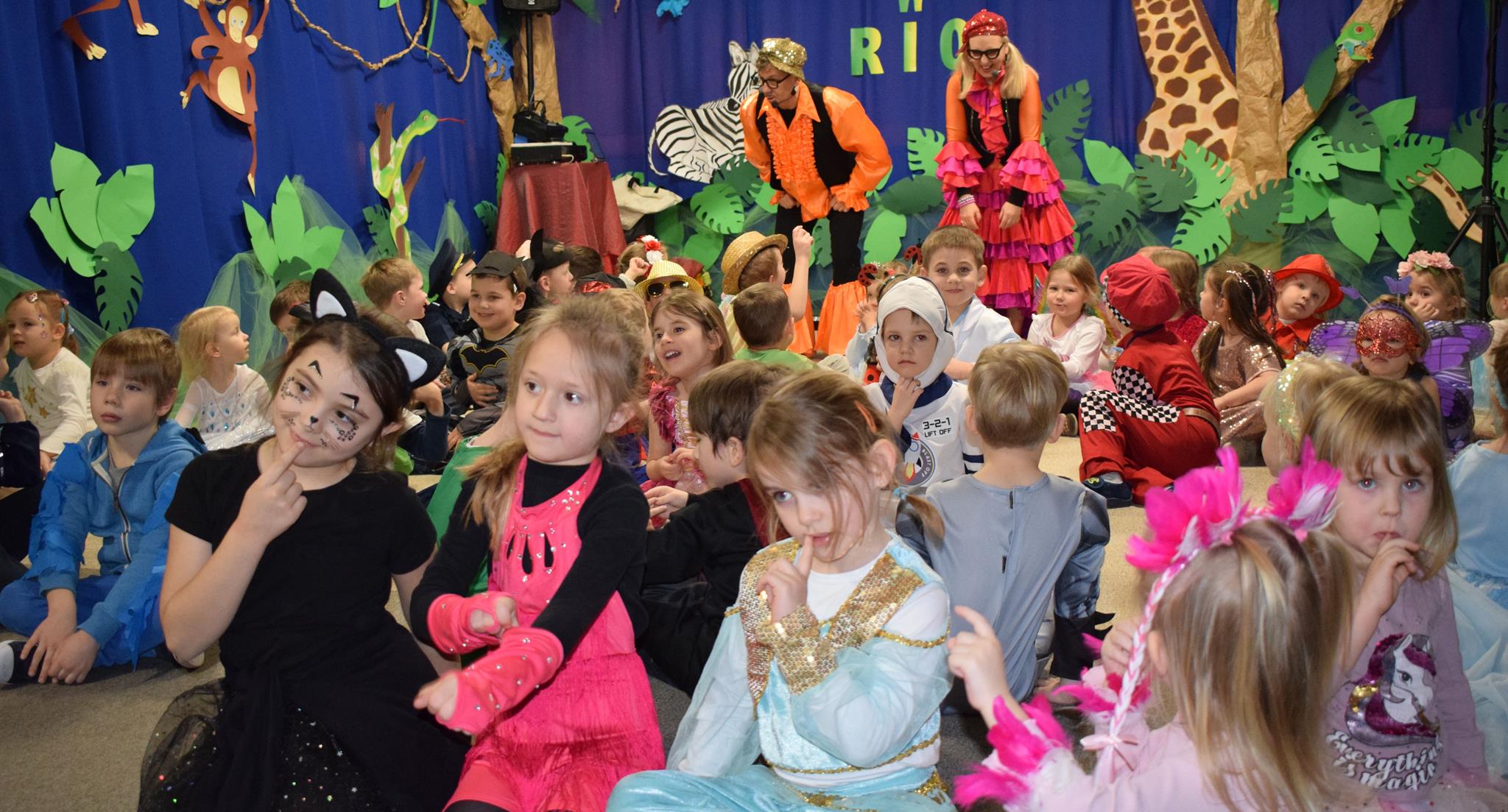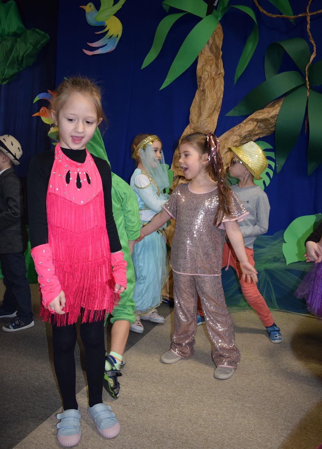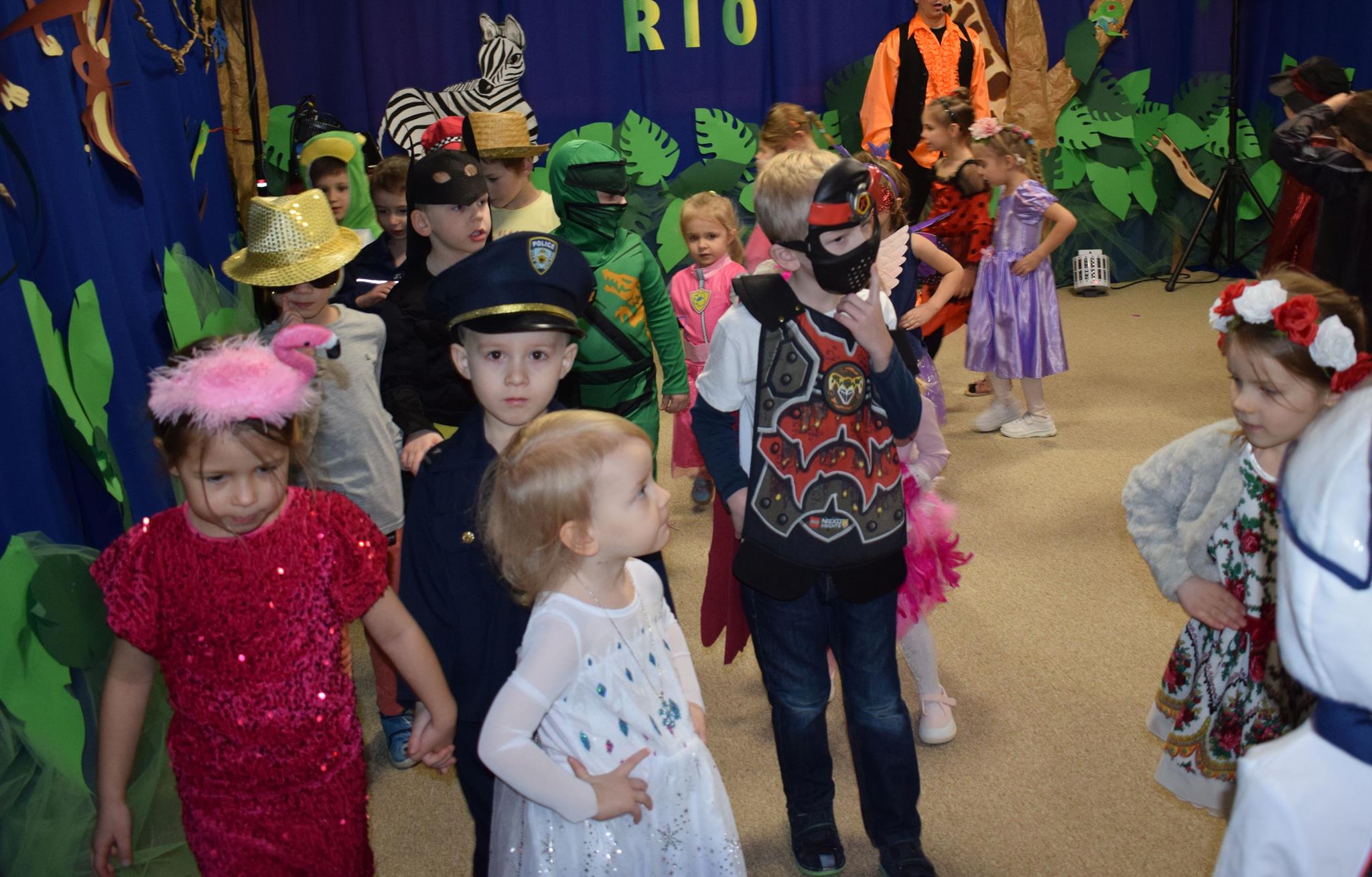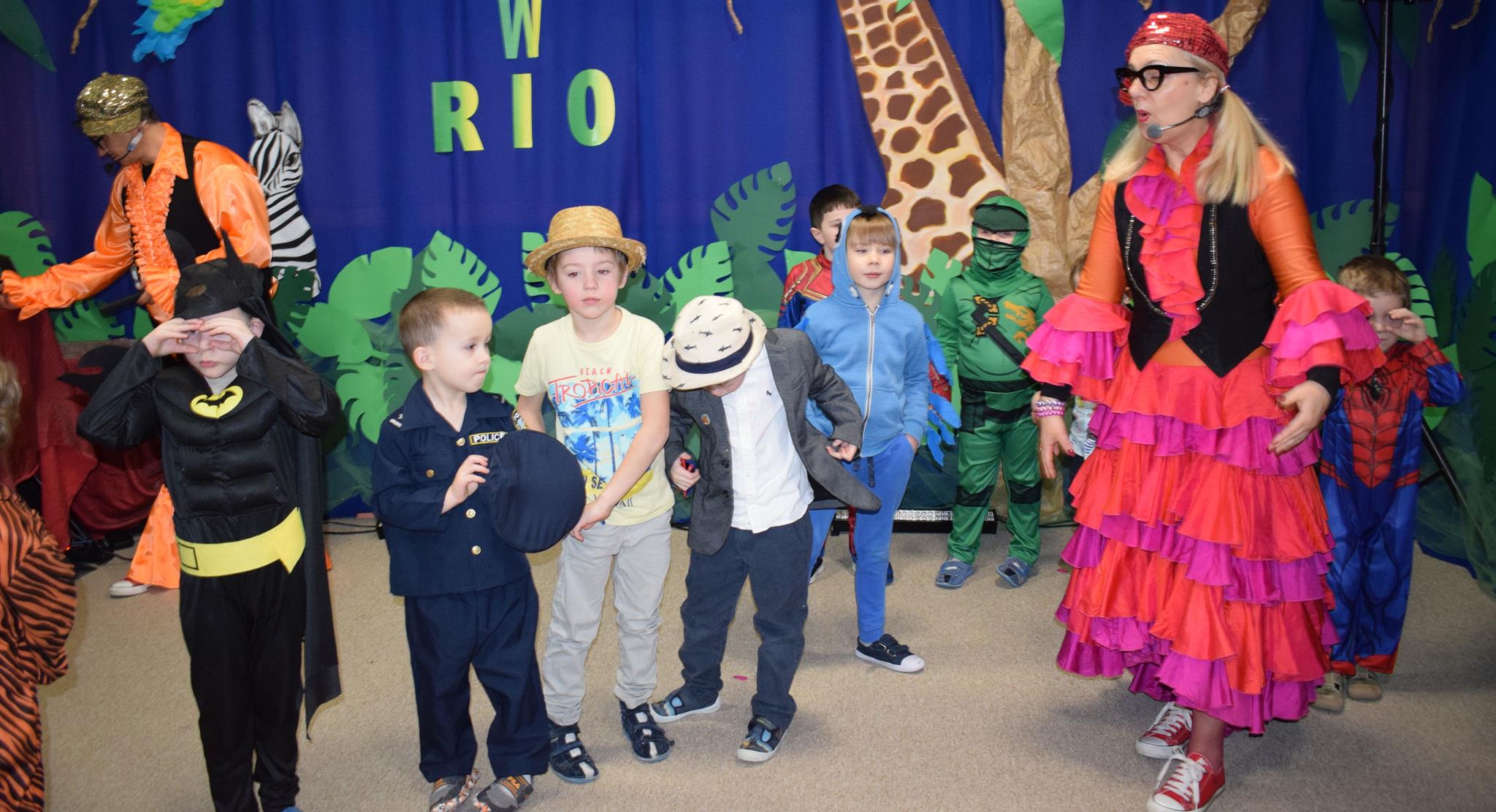 Tegoroczny karnawał rozpoczęliśmy taneczną imprezą. Żywiołowa muzyka pobudziła do tańca nawet najbardziej zasiedziałe przedszkolaki. Sunęliśmy po parkiecie solo, w parach i w wężykach w rytmie gorącej jak brazylijskie słońce samby. Wiele przebojów znaliśmy na pamięć, więc śpiewaliśmy głośno, jakby marząc o tym, by usłyszano nas na Copacabanie. Prowadzących zaś aktorów z Teatru Złoty Dukat zachwyciliśmy nie tylko swoimi umiejętnościami tanecznymi czy wokalnymi, lecz także wielobarwnymi strojami. Na parkiecie nie zabrakło policjantów, strażaków, postaci bajkowych, zwierzątek. Czas karnawałowych pląsów umilały liczne księżniczki i wróżki. Chwilami zdawało się, że wiosna już tuż-tuż, kiedy nagle swym kolorowym skrzydełkiem machnęła jakaś biedronka i motylek.
