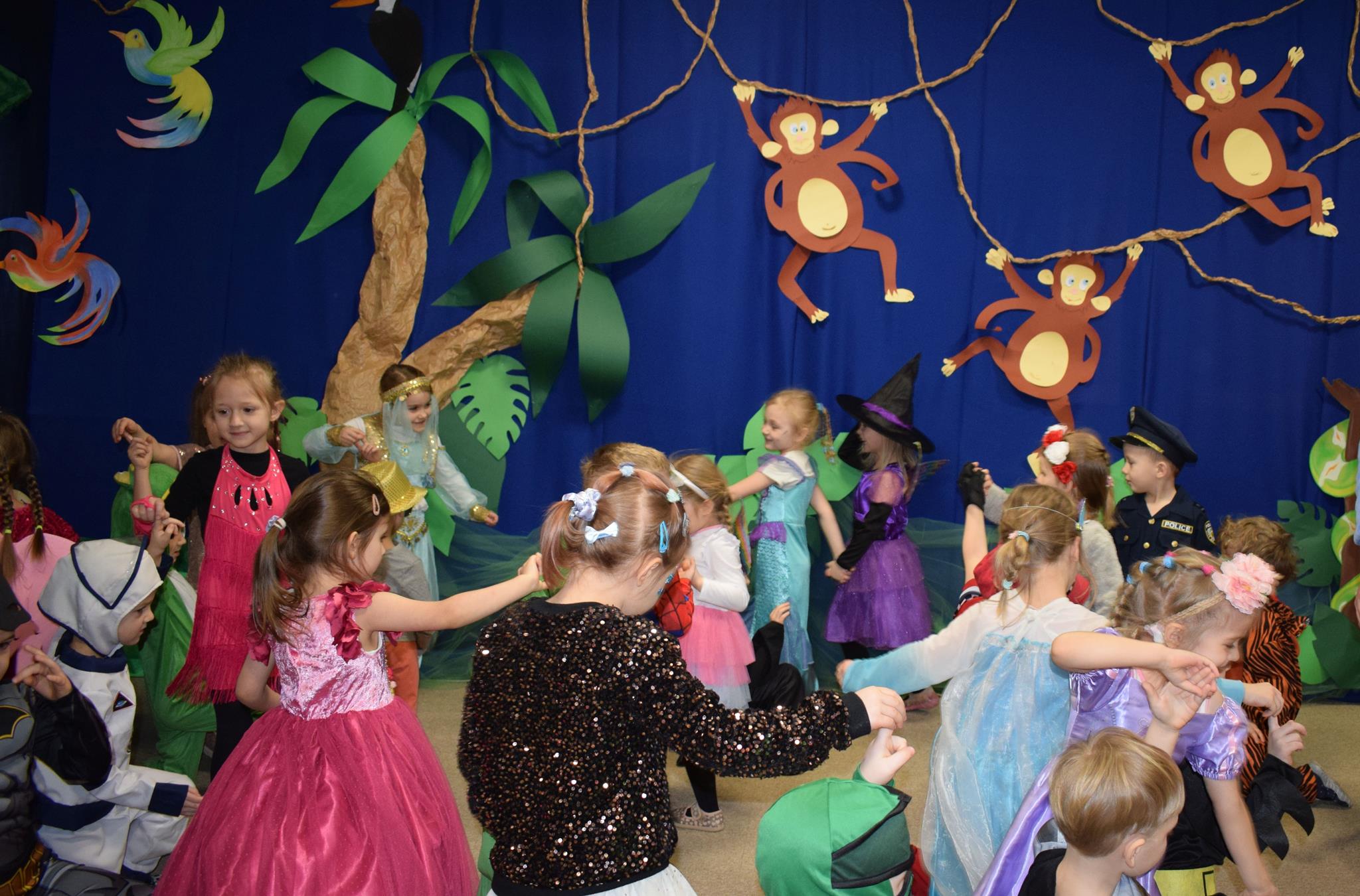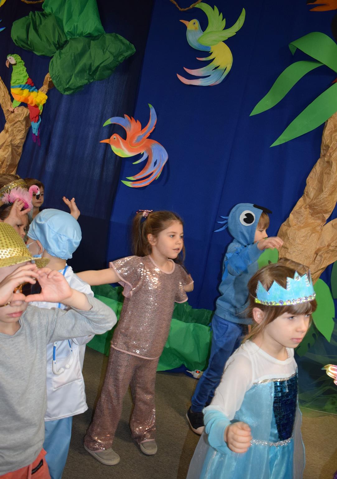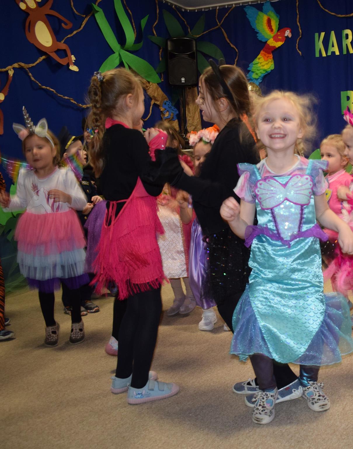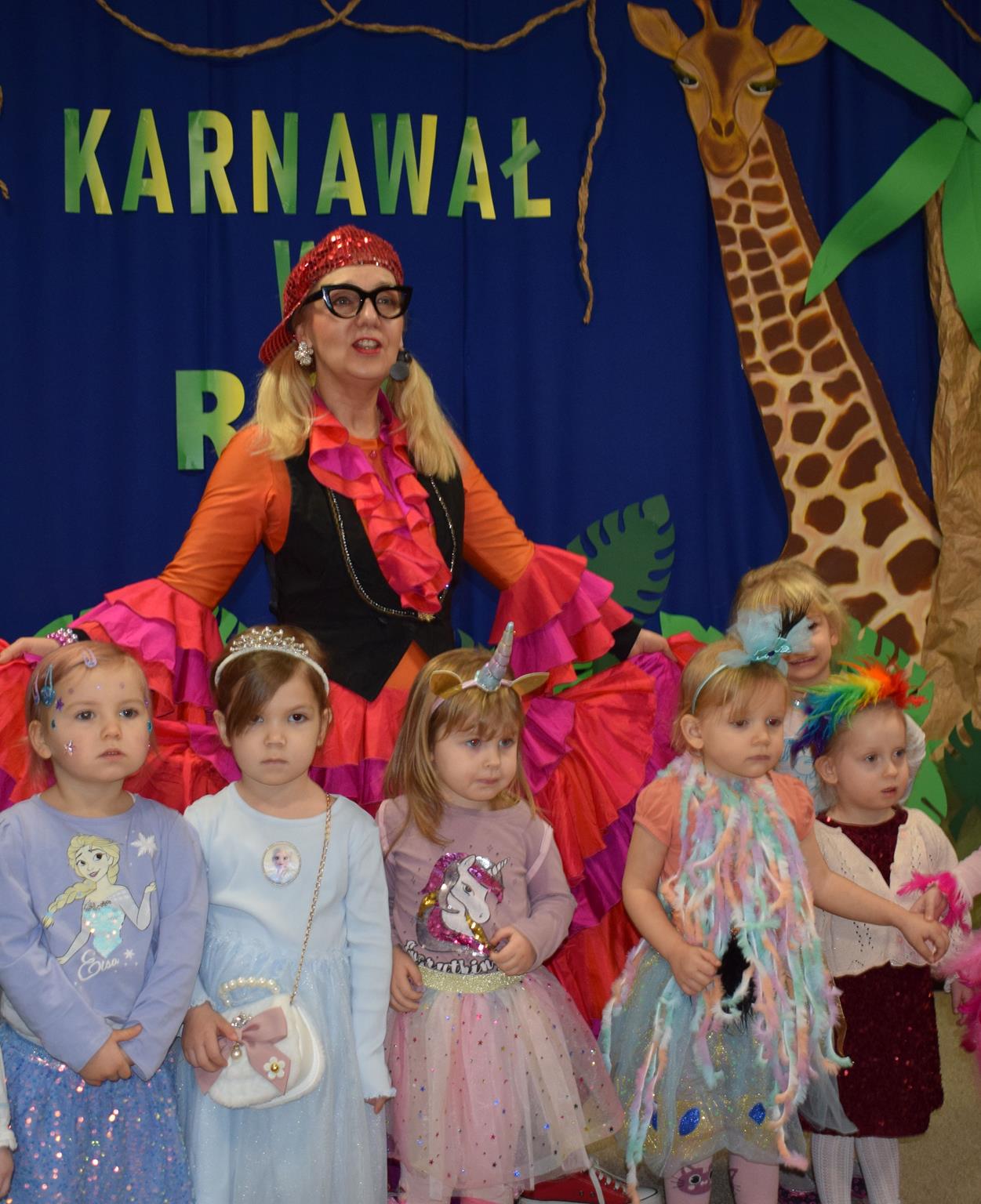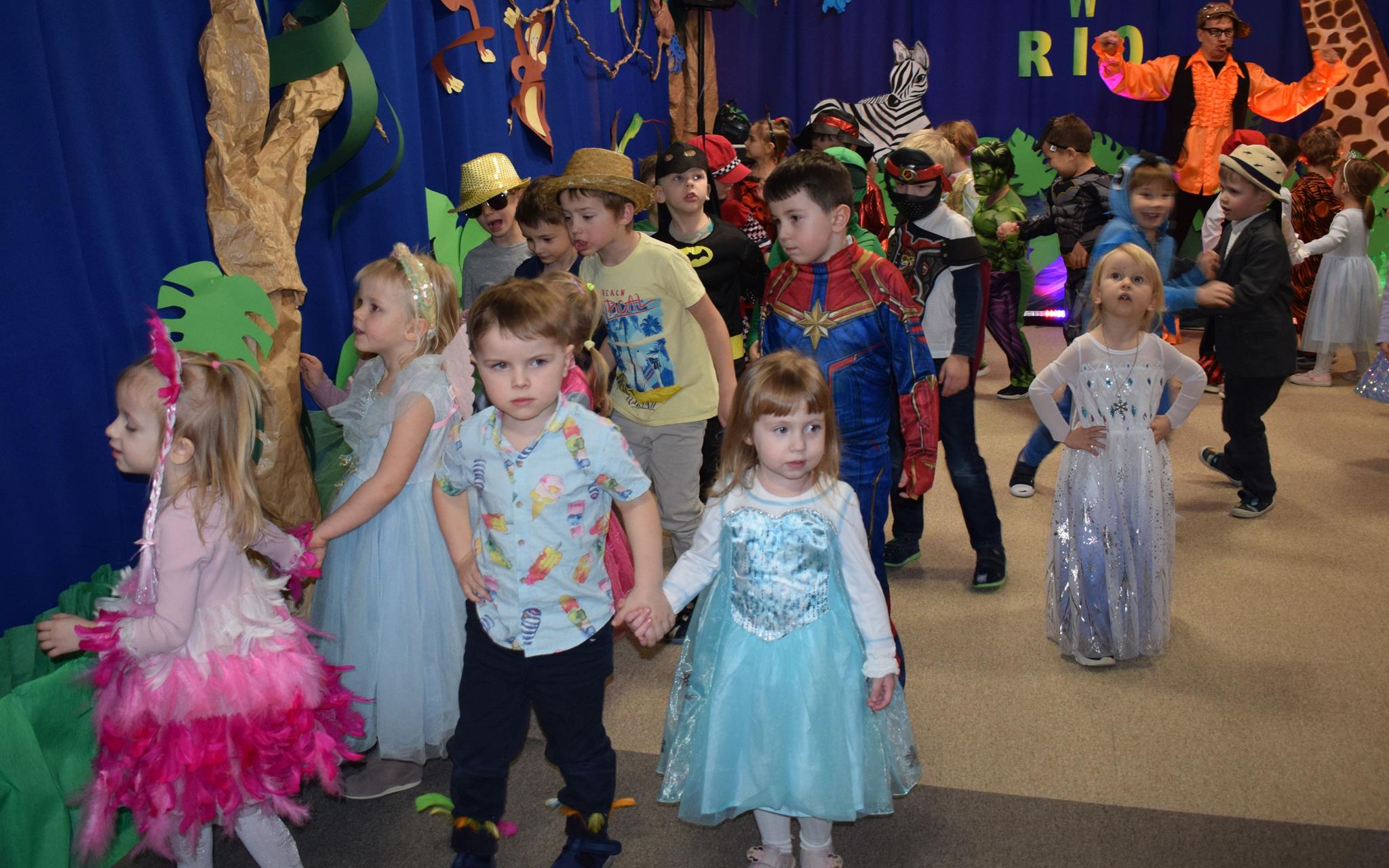 Tegoroczny karnawał rozpoczęliśmy taneczną imprezą. Żywiołowa muzyka pobudziła do tańca nawet najbardziej zasiedziałe przedszkolaki. Sunęliśmy po parkiecie solo, w parach i w wężykach w rytmie gorącej jak brazylijskie słońce samby. Wiele przebojów znaliśmy na pamięć, więc śpiewaliśmy głośno, jakby marząc o tym, by usłyszano nas na Copacabanie. Prowadzących zaś aktorów z Teatru Złoty Dukat zachwyciliśmy nie tylko swoimi umiejętnościami tanecznymi czy wokalnymi, lecz także wielobarwnymi strojami. Na parkiecie nie zabrakło policjantów, strażaków, postaci bajkowych, zwierzątek. Czas karnawałowych pląsów umilały liczne księżniczki i wróżki. Chwilami zdawało się, że wiosna już tuż-tuż, kiedy nagle swym kolorowym skrzydełkiem machnęła jakaś biedronka i motylek.