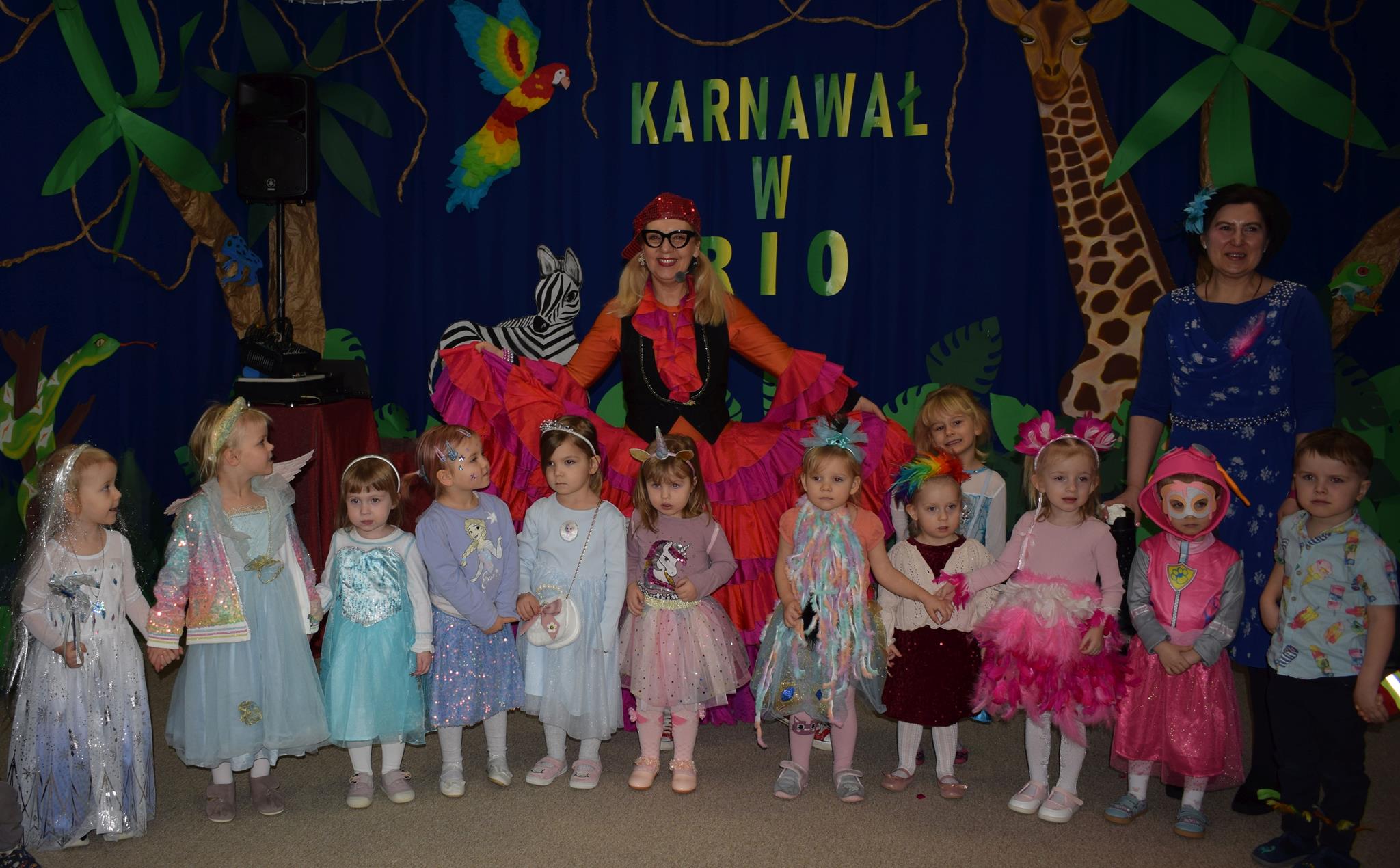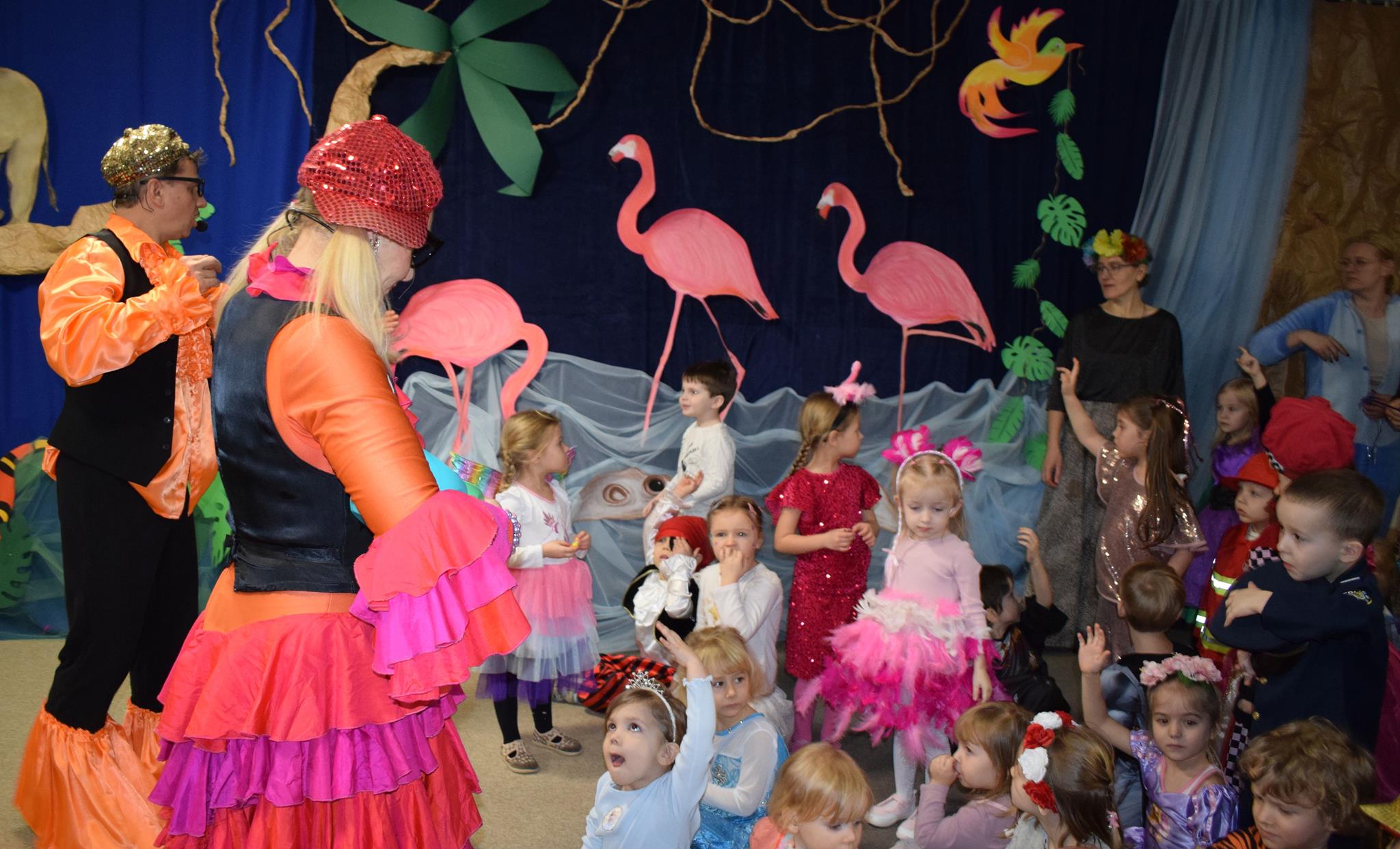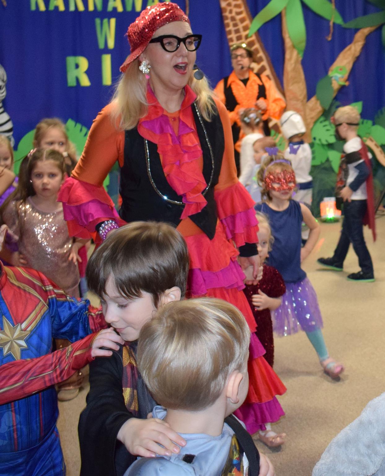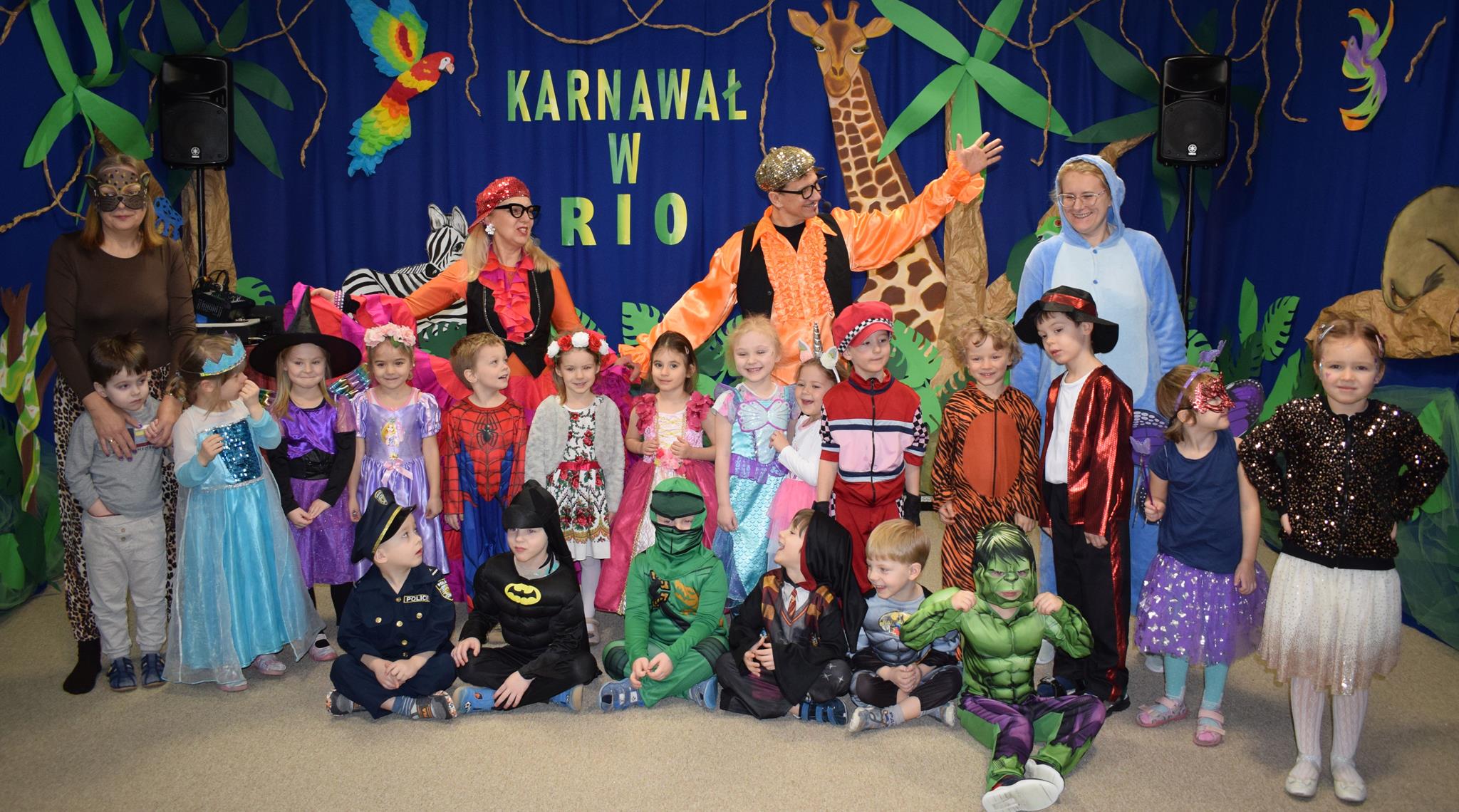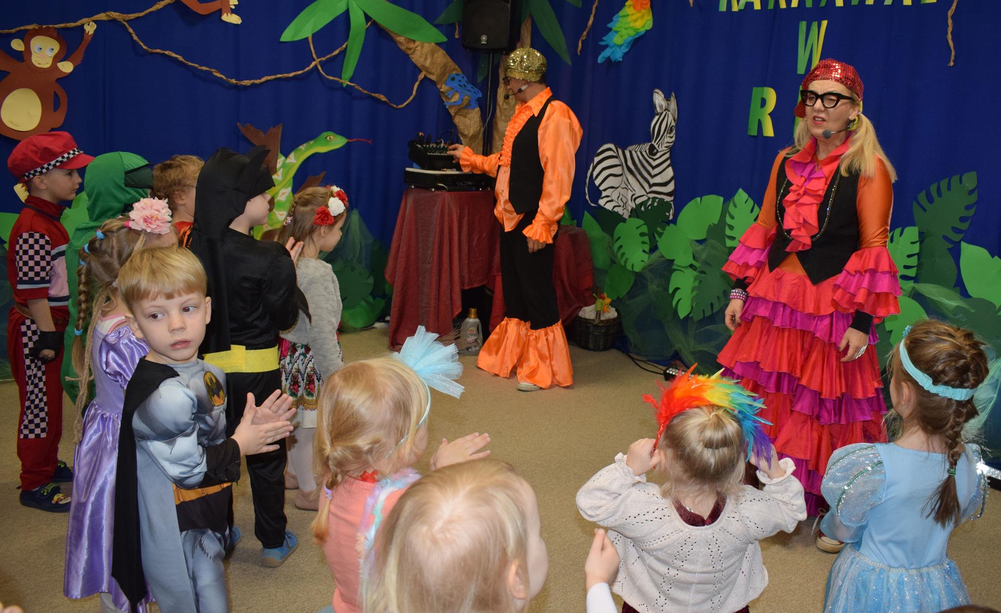 Tegoroczny karnawał rozpoczęliśmy taneczną imprezą. Żywiołowa muzyka pobudziła do tańca nawet najbardziej zasiedziałe przedszkolaki. Sunęliśmy po parkiecie solo, w parach i w wężykach w rytmie gorącej jak brazylijskie słońce samby. Wiele przebojów znaliśmy na pamięć, więc śpiewaliśmy głośno, jakby marząc o tym, by usłyszano nas na Copacabanie. Prowadzących zaś aktorów z Teatru Złoty Dukat zachwyciliśmy nie tylko swoimi umiejętnościami tanecznymi czy wokalnymi, lecz także wielobarwnymi strojami. Na parkiecie nie zabrakło policjantów, strażaków, postaci bajkowych, zwierzątek. Czas karnawałowych pląsów umilały liczne księżniczki i wróżki. Chwilami zdawało się, że wiosna już tuż-tuż, kiedy nagle swym kolorowym skrzydełkiem machnęła jakaś biedronka i motylek.