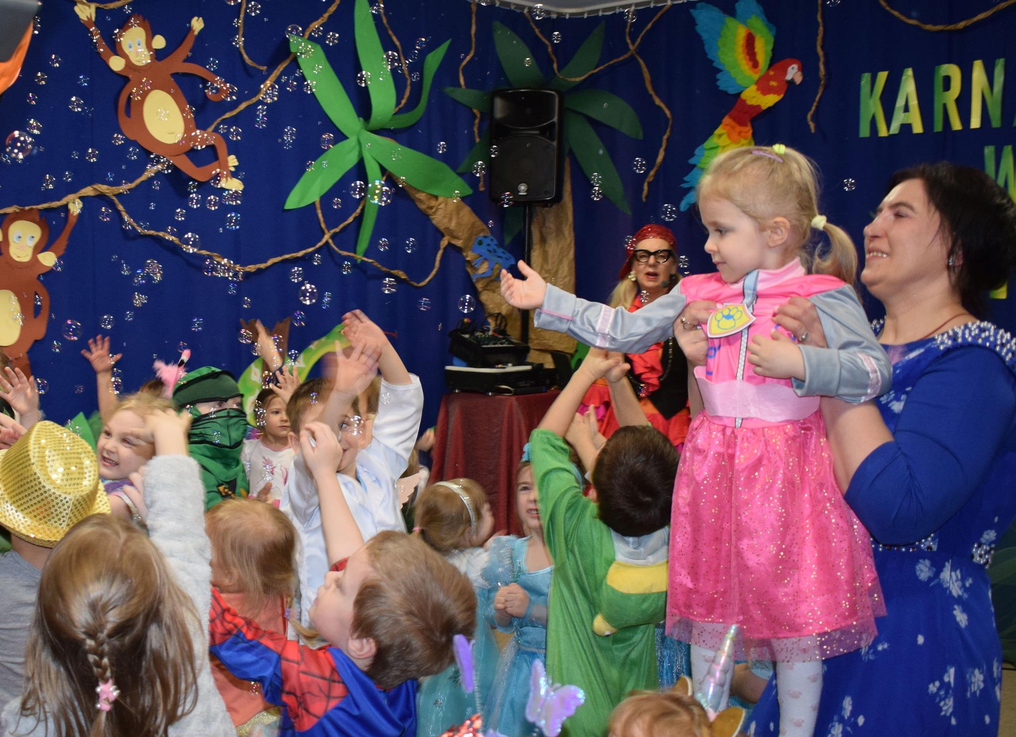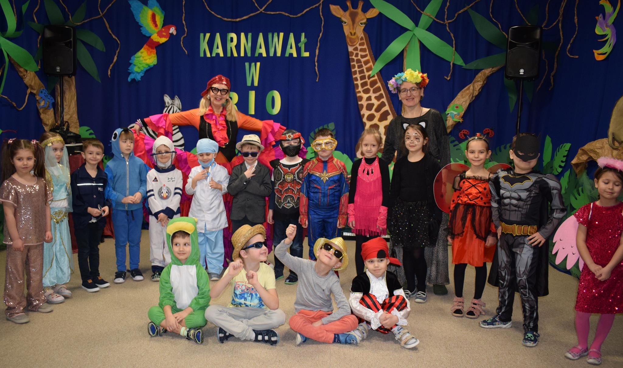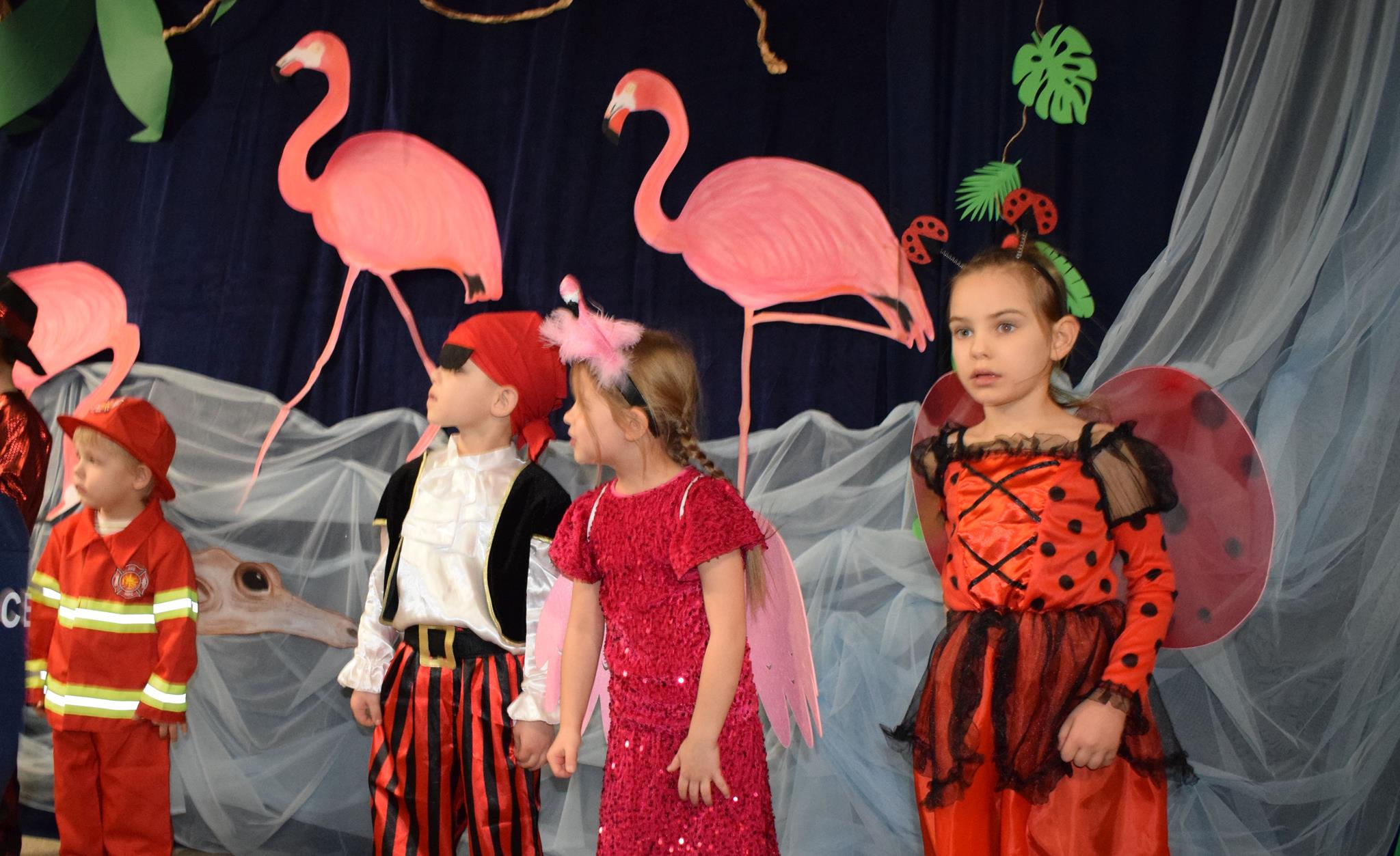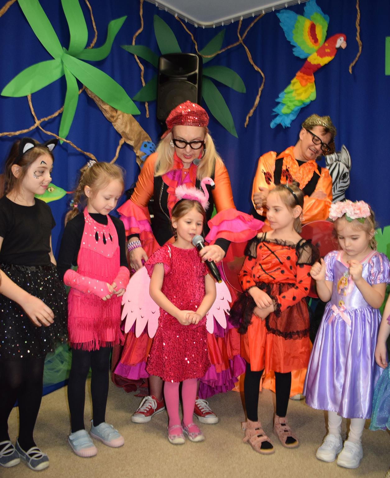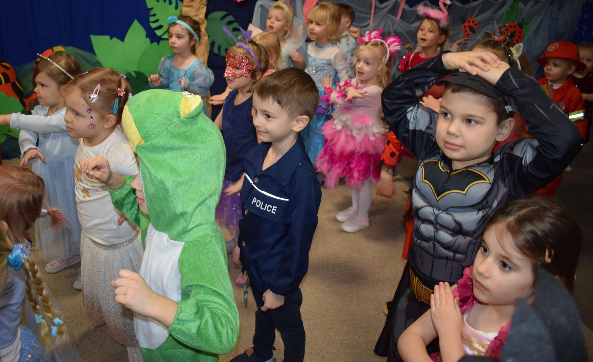 Tegoroczny karnawał rozpoczęliśmy taneczną imprezą. Żywiołowa muzyka pobudziła do tańca nawet najbardziej zasiedziałe przedszkolaki. Sunęliśmy po parkiecie solo, w parach i w wężykach w rytmie gorącej jak brazylijskie słońce samby. Wiele przebojów znaliśmy na pamięć, więc śpiewaliśmy głośno, jakby marząc o tym, by usłyszano nas na Copacabanie. Prowadzących zaś aktorów z Teatru Złoty Dukat zachwyciliśmy nie tylko swoimi umiejętnościami tanecznymi czy wokalnymi, lecz także wielobarwnymi strojami. Na parkiecie nie zabrakło policjantów, strażaków, postaci bajkowych, zwierzątek. Czas karnawałowych pląsów umilały liczne księżniczki i wróżki. Chwilami zdawało się, że wiosna już tuż-tuż, kiedy nagle swym kolorowym skrzydełkiem machnęła jakaś biedronka i motylek.