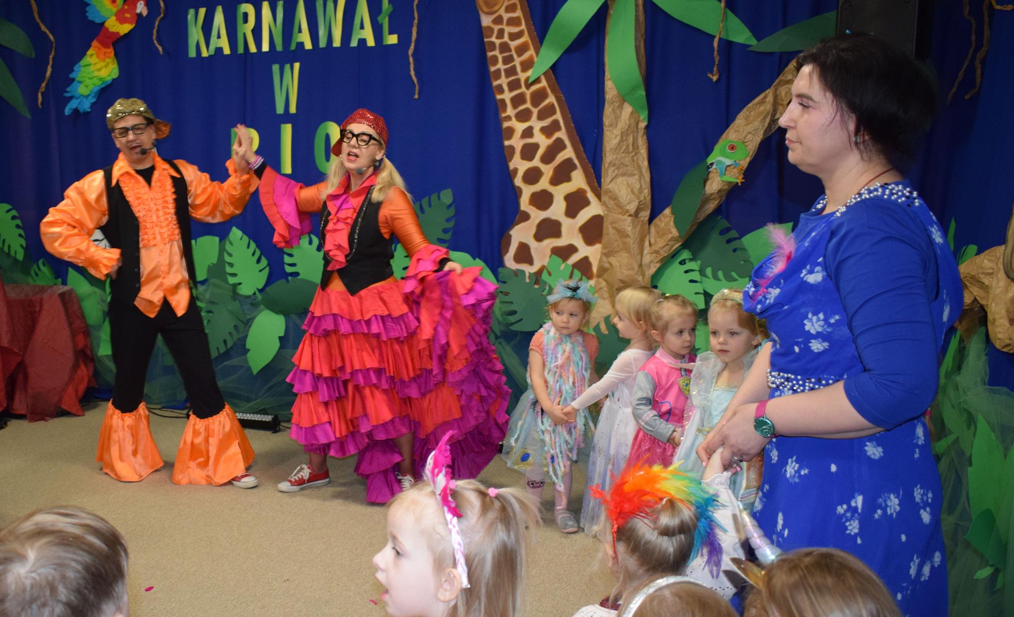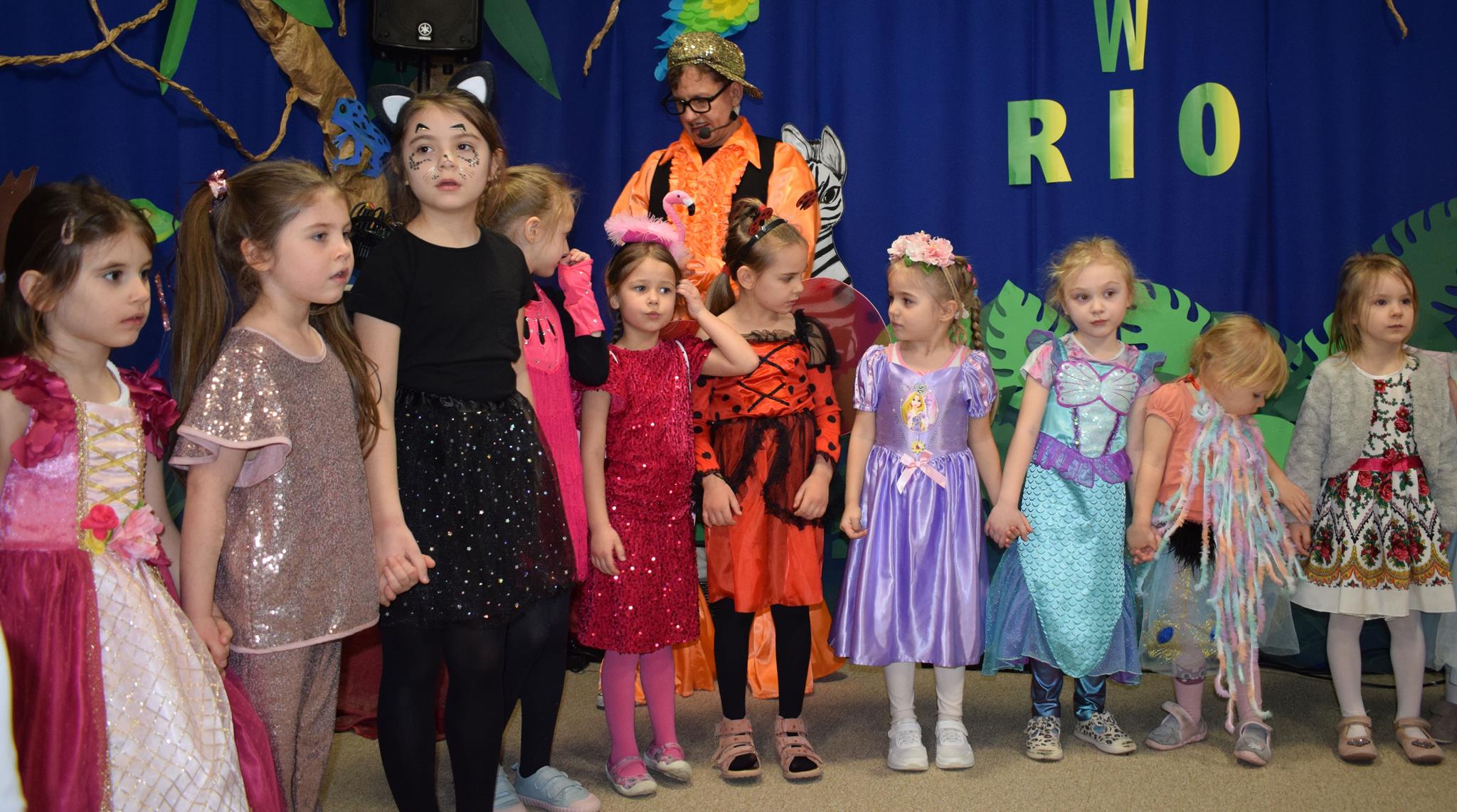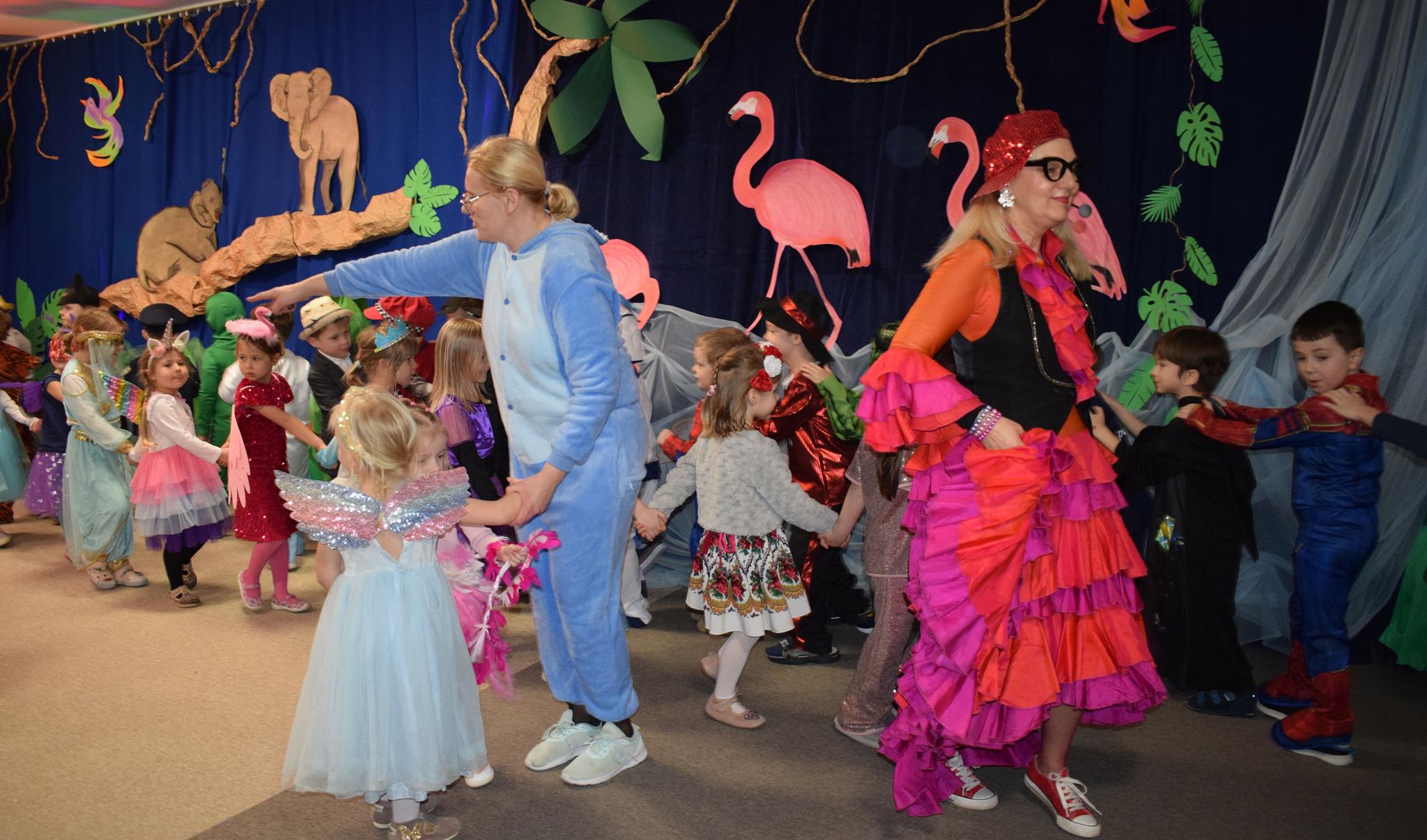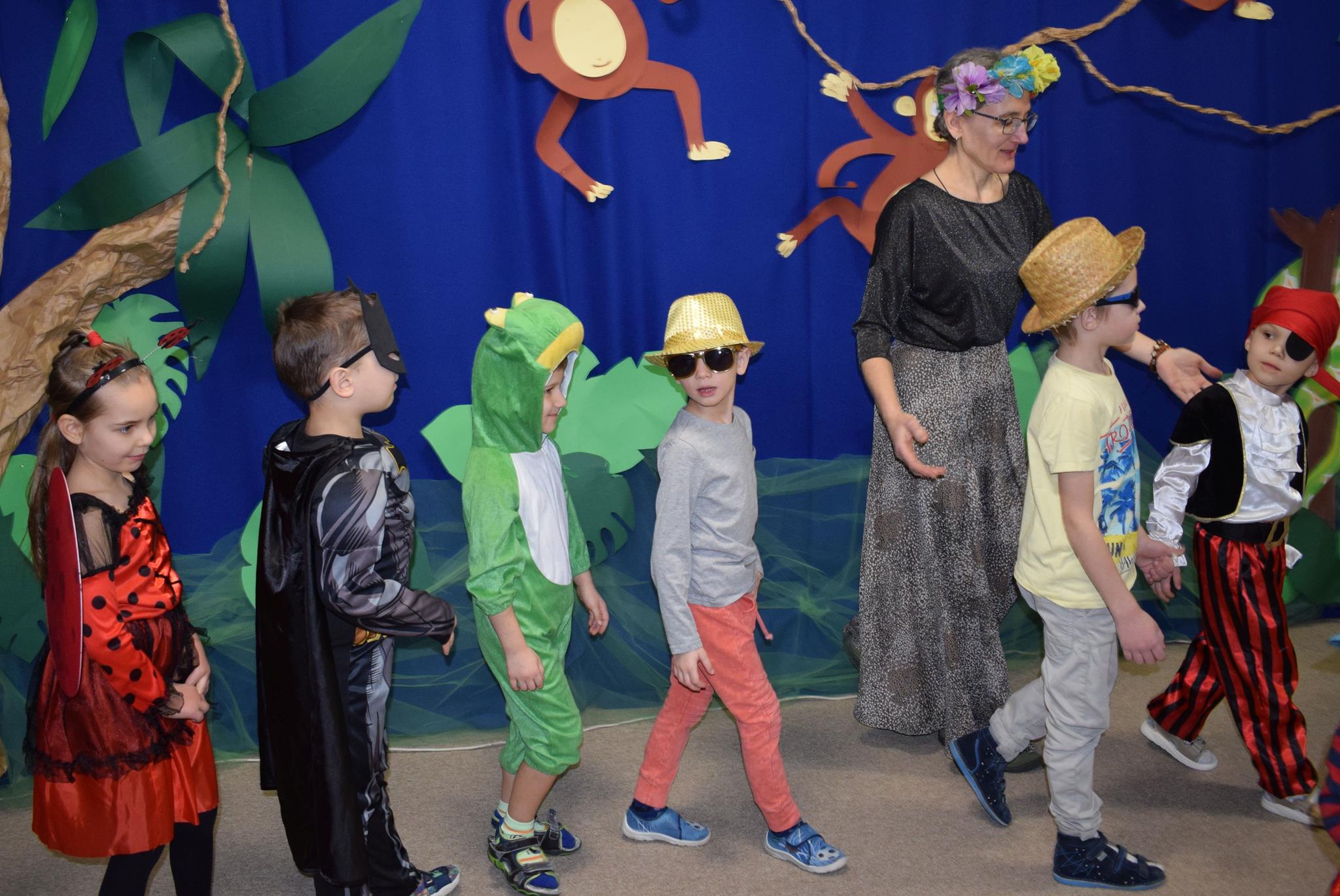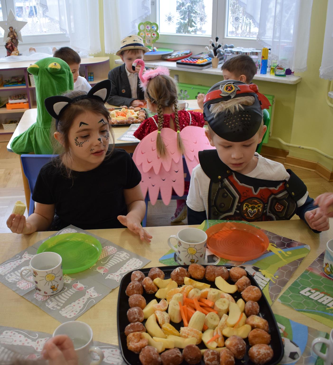 Tegoroczny karnawał rozpoczęliśmy taneczną imprezą. Żywiołowa muzyka pobudziła do tańca nawet najbardziej zasiedziałe przedszkolaki. Sunęliśmy po parkiecie solo, w parach i w wężykach w rytmie gorącej jak brazylijskie słońce samby. Wiele przebojów znaliśmy na pamięć, więc śpiewaliśmy głośno, jakby marząc o tym, by usłyszano nas na Copacabanie. Prowadzących zaś aktorów z Teatru Złoty Dukat zachwyciliśmy nie tylko swoimi umiejętnościami tanecznymi czy wokalnymi, lecz także wielobarwnymi strojami. Na parkiecie nie zabrakło policjantów, strażaków, postaci bajkowych, zwierzątek. Czas karnawałowych pląsów umilały liczne księżniczki i wróżki. Chwilami zdawało się, że wiosna już tuż-tuż, kiedy nagle swym kolorowym skrzydełkiem machnęła jakaś biedronka i motylek.