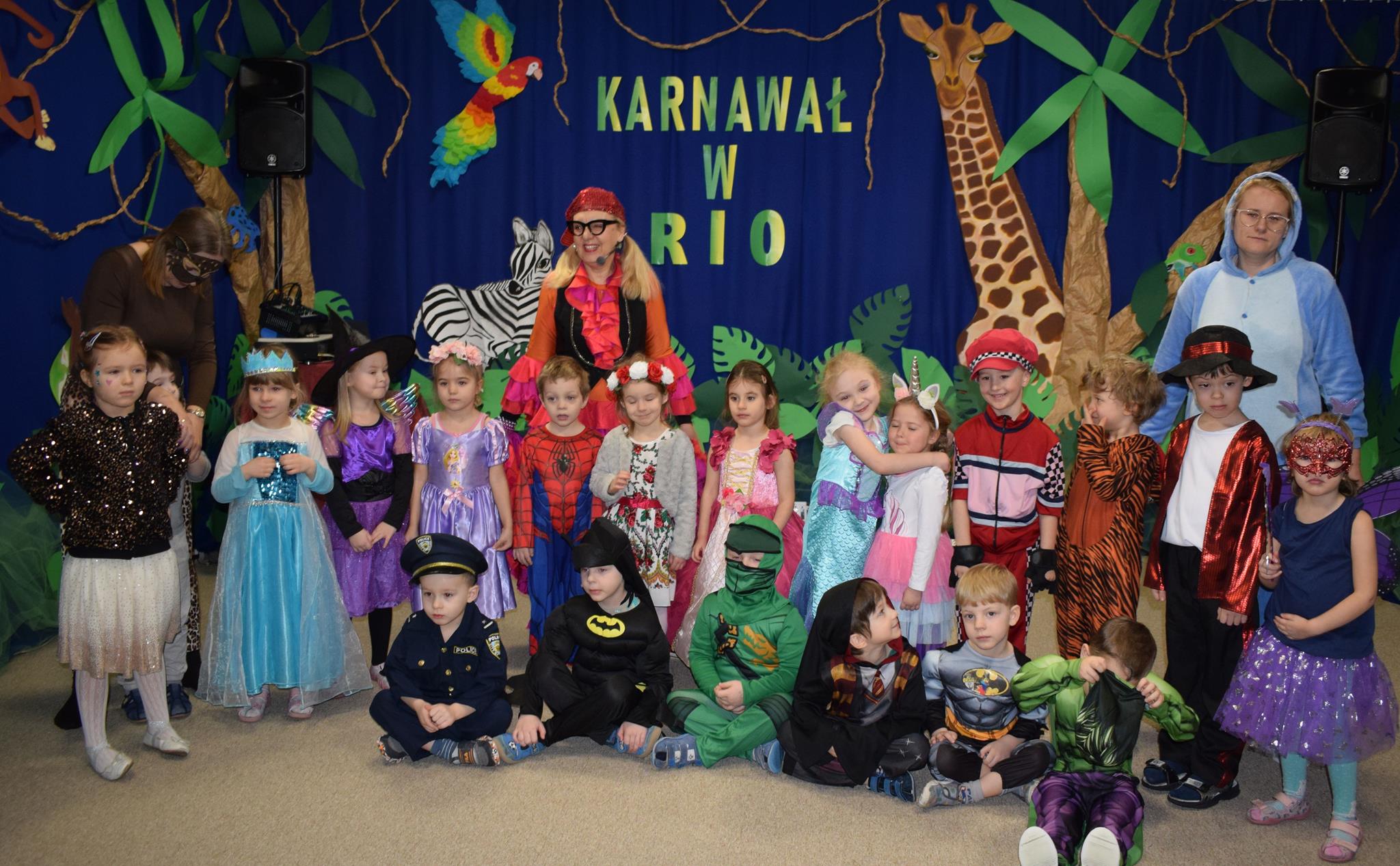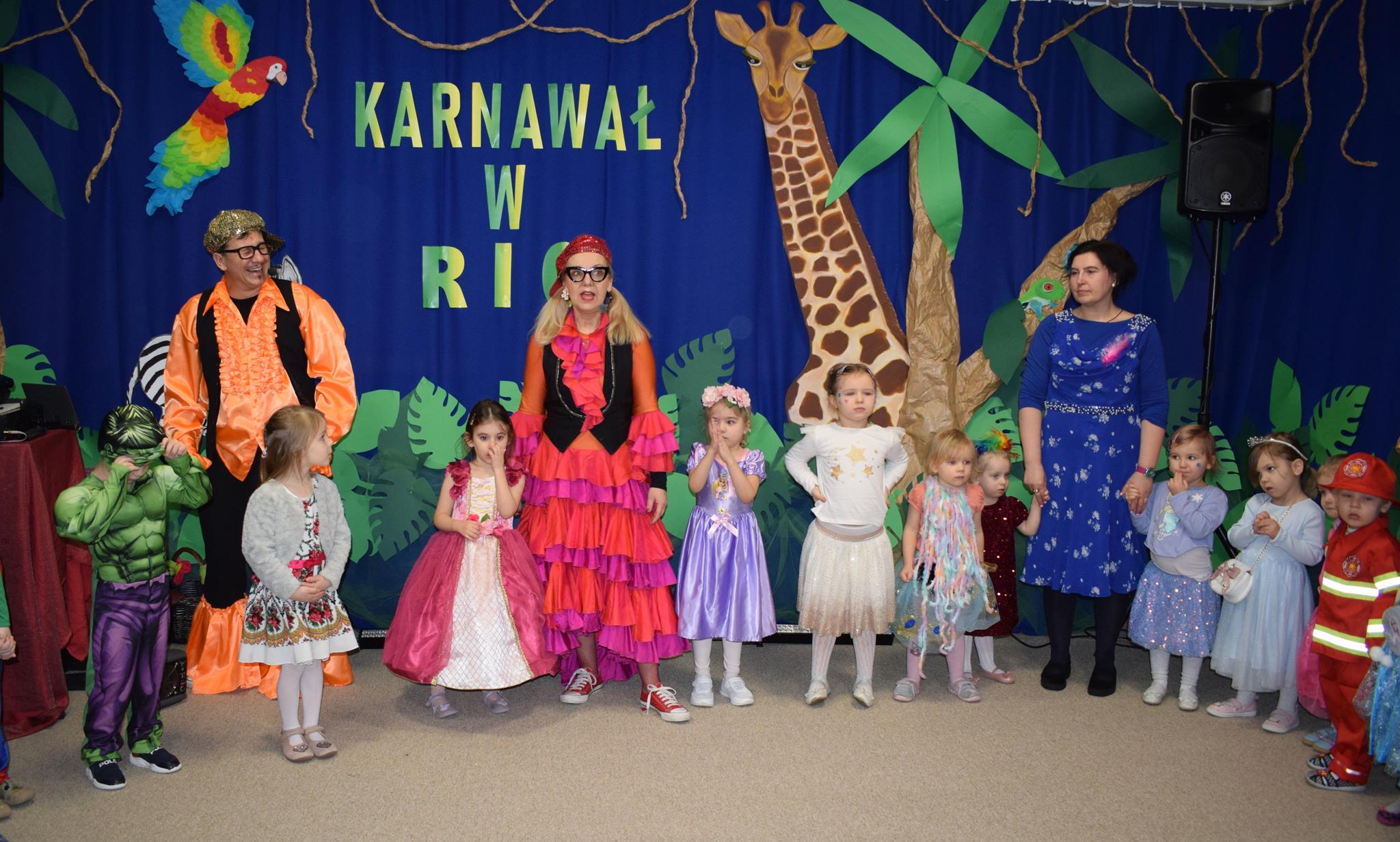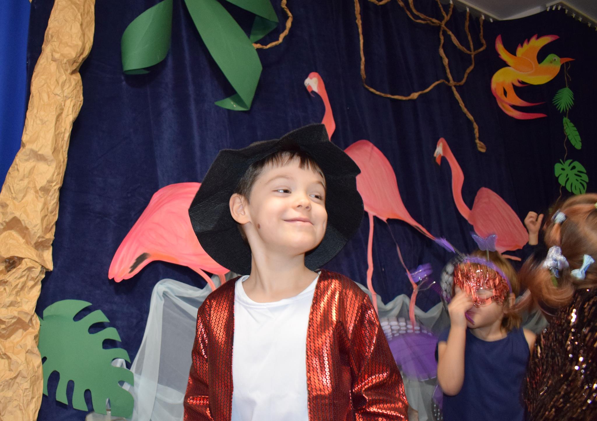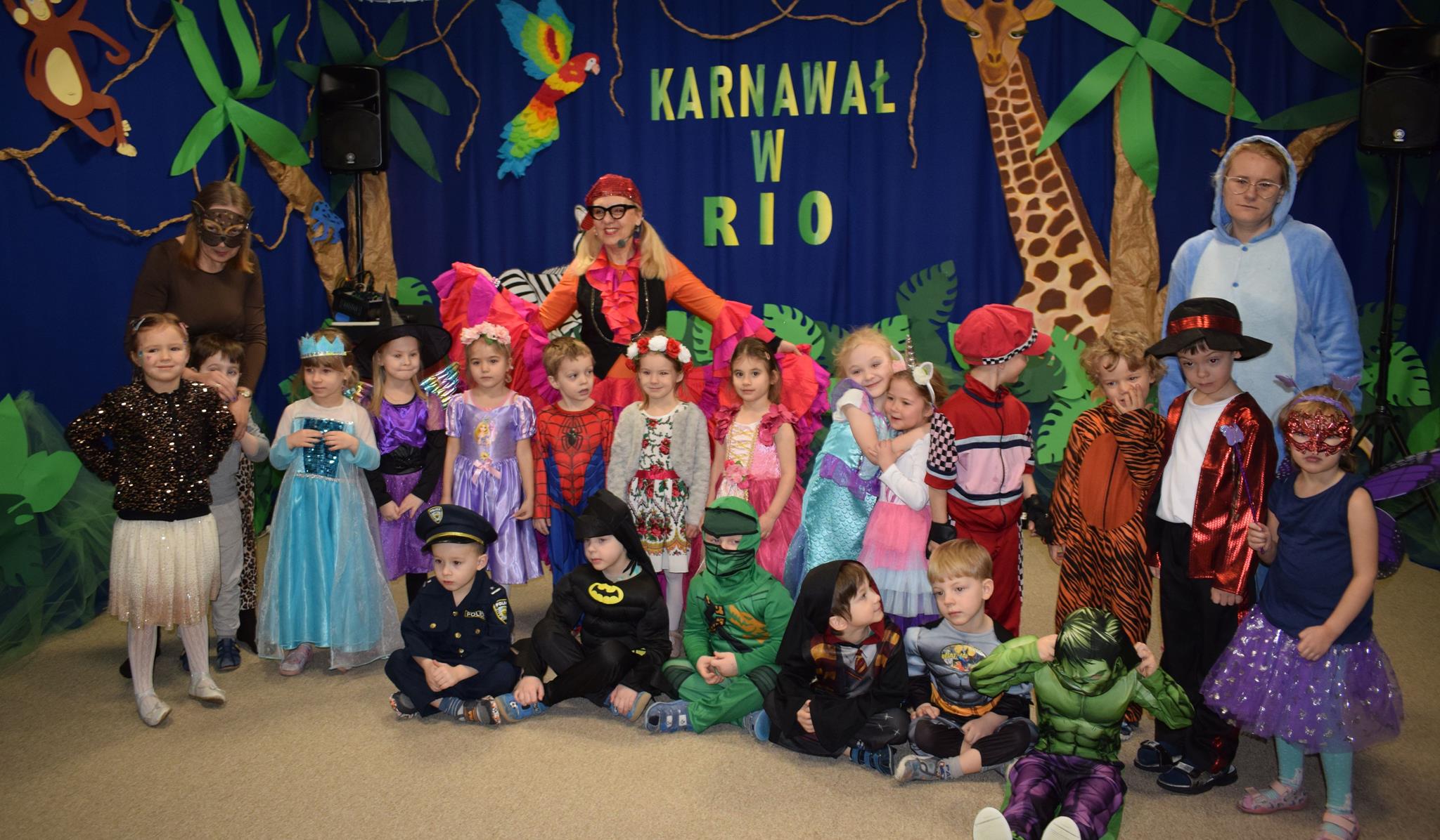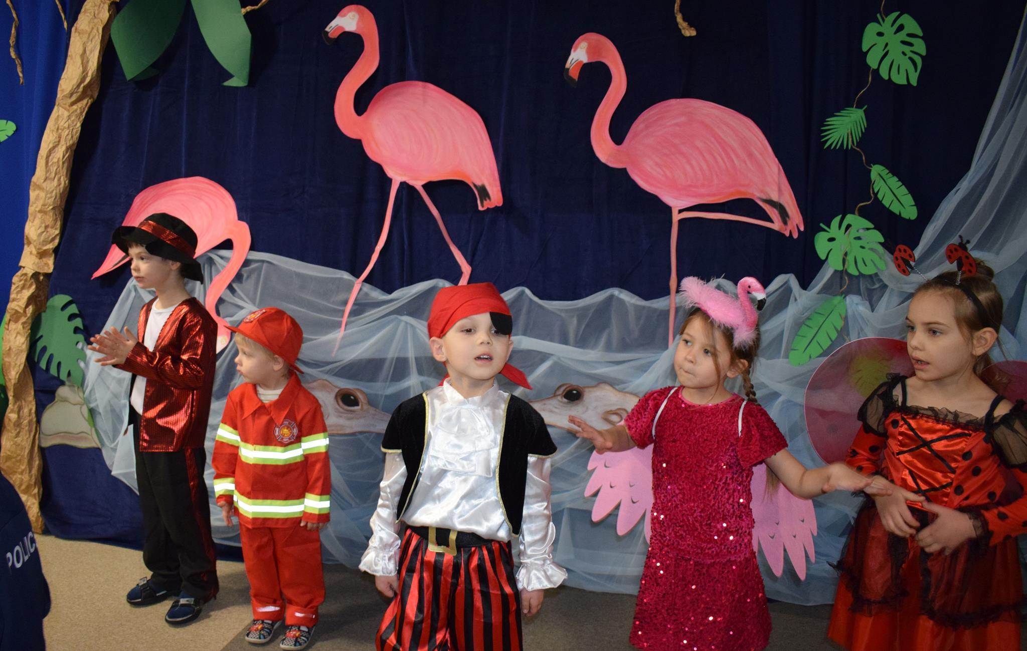 Tegoroczny karnawał rozpoczęliśmy taneczną imprezą. Żywiołowa muzyka pobudziła do tańca nawet najbardziej zasiedziałe przedszkolaki. Sunęliśmy po parkiecie solo, w parach i w wężykach w rytmie gorącej jak brazylijskie słońce samby. Wiele przebojów znaliśmy na pamięć, więc śpiewaliśmy głośno, jakby marząc o tym, by usłyszano nas na Copacabanie. Prowadzących zaś aktorów z Teatru Złoty Dukat zachwyciliśmy nie tylko swoimi umiejętnościami tanecznymi czy wokalnymi, lecz także wielobarwnymi strojami. Na parkiecie nie zabrakło policjantów, strażaków, postaci bajkowych, zwierzątek. Czas karnawałowych pląsów umilały liczne księżniczki i wróżki. Chwilami zdawało się, że wiosna już tuż-tuż, kiedy nagle swym kolorowym skrzydełkiem machnęła jakaś biedronka i motylek.
