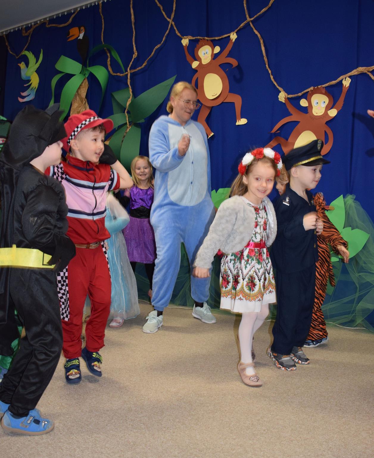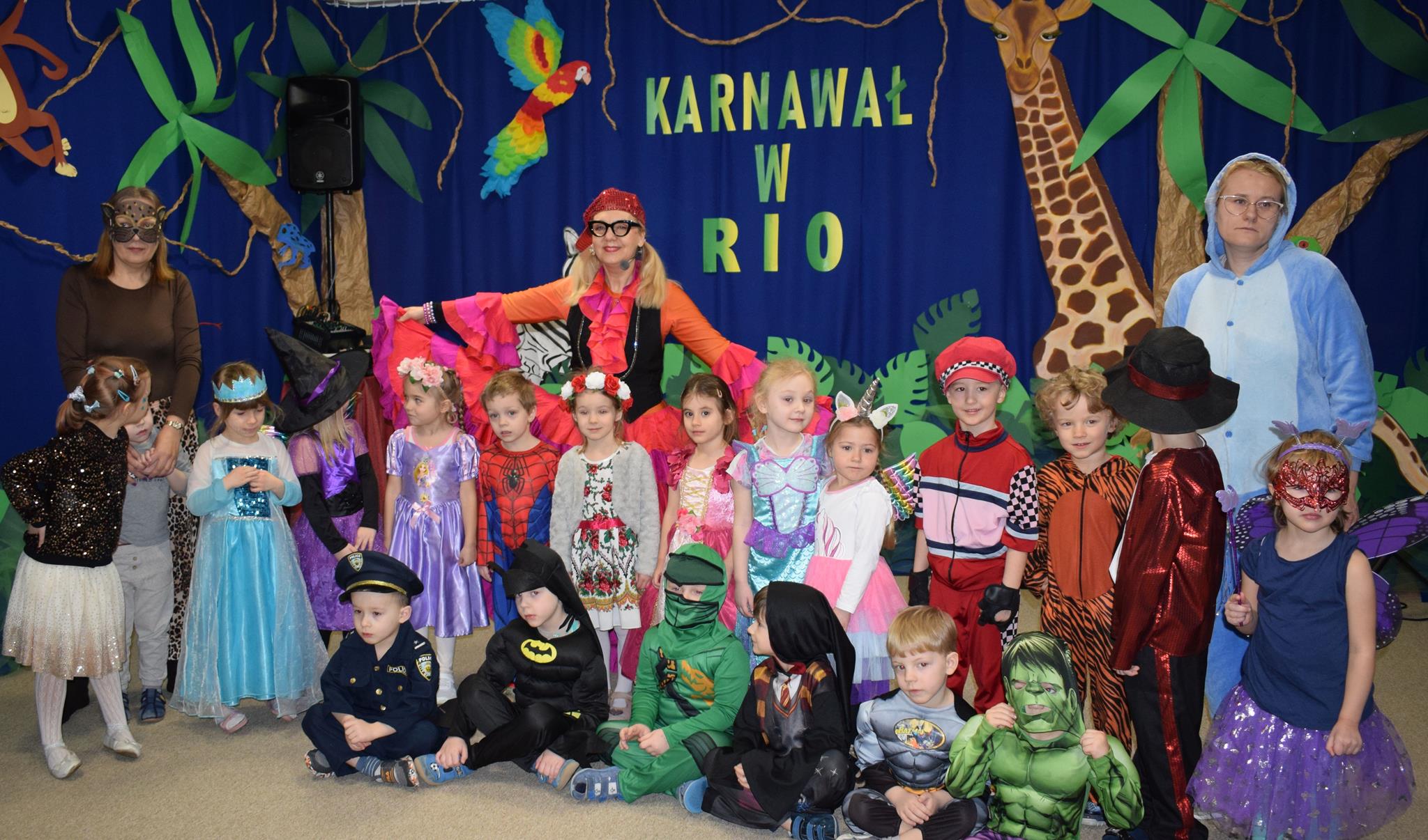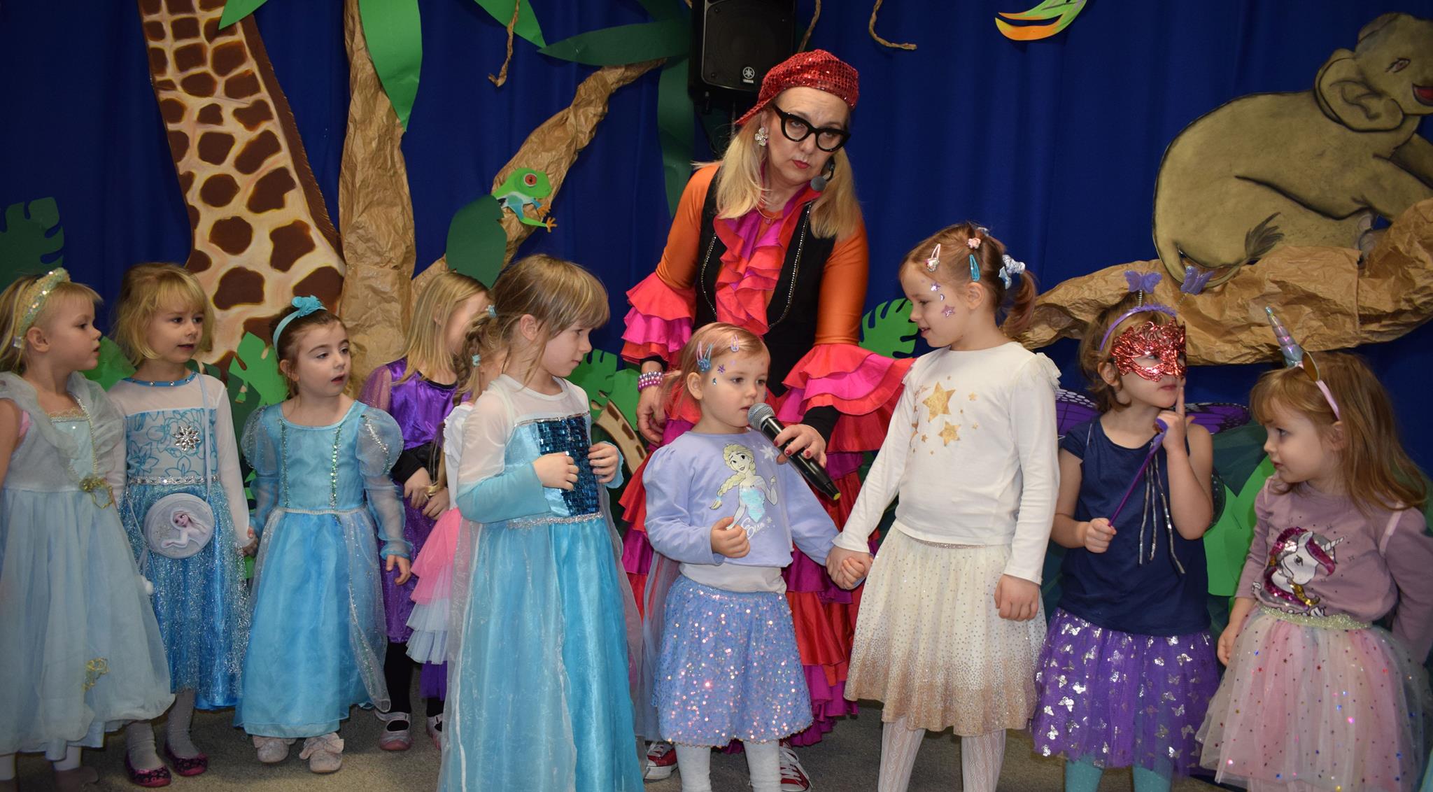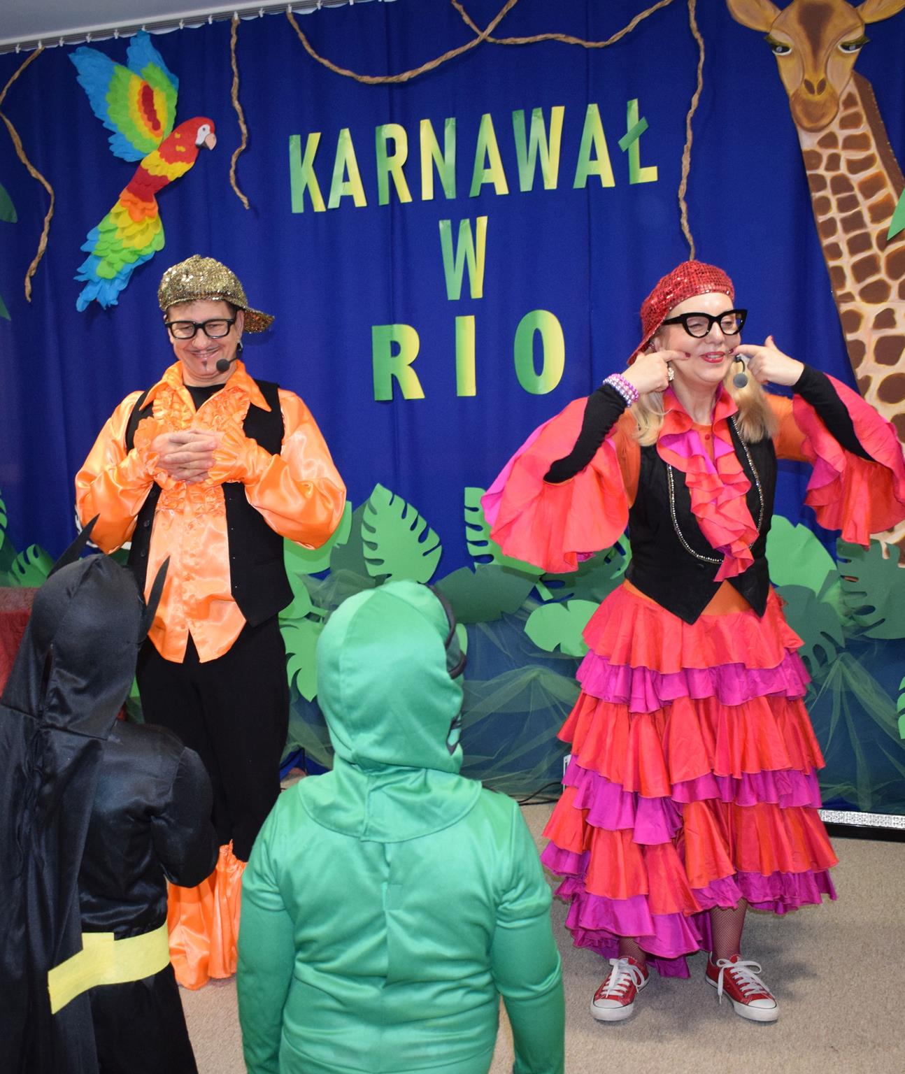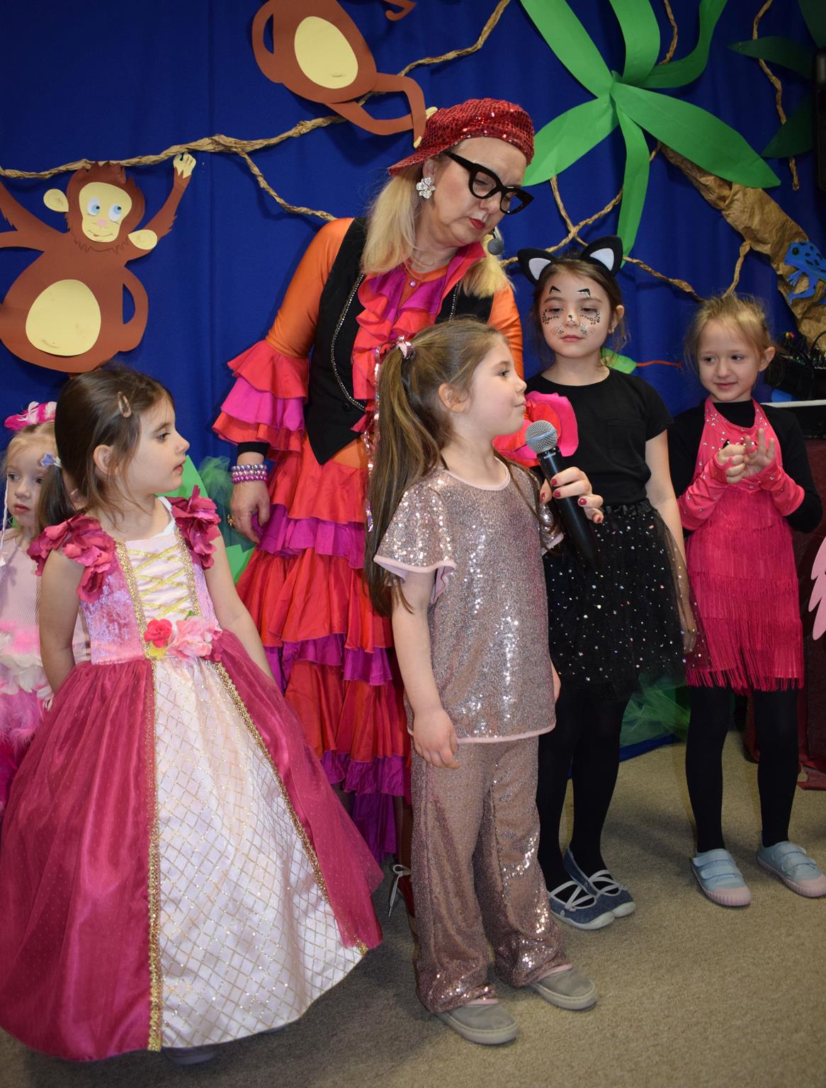 Tegoroczny karnawał rozpoczęliśmy taneczną imprezą. Żywiołowa muzyka pobudziła do tańca nawet najbardziej zasiedziałe przedszkolaki. Sunęliśmy po parkiecie solo, w parach i w wężykach w rytmie gorącej jak brazylijskie słońce samby. Wiele przebojów znaliśmy na pamięć, więc śpiewaliśmy głośno, jakby marząc o tym, by usłyszano nas na Copacabanie. Prowadzących zaś aktorów z Teatru Złoty Dukat zachwyciliśmy nie tylko swoimi umiejętnościami tanecznymi czy wokalnymi, lecz także wielobarwnymi strojami. Na parkiecie nie zabrakło policjantów, strażaków, postaci bajkowych, zwierzątek. Czas karnawałowych pląsów umilały liczne księżniczki i wróżki. Chwilami zdawało się, że wiosna już tuż-tuż, kiedy nagle swym kolorowym skrzydełkiem machnęła jakaś biedronka i motylek.