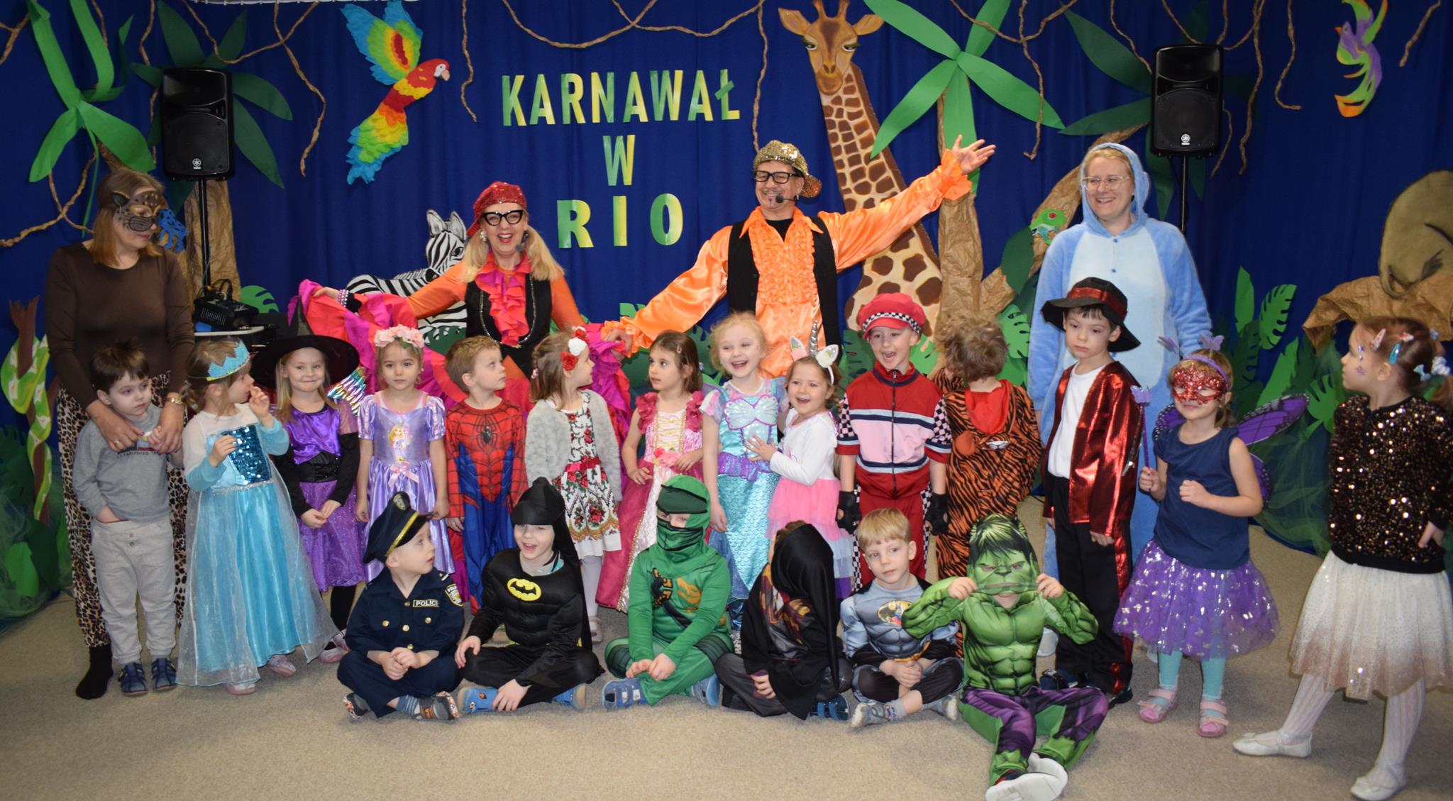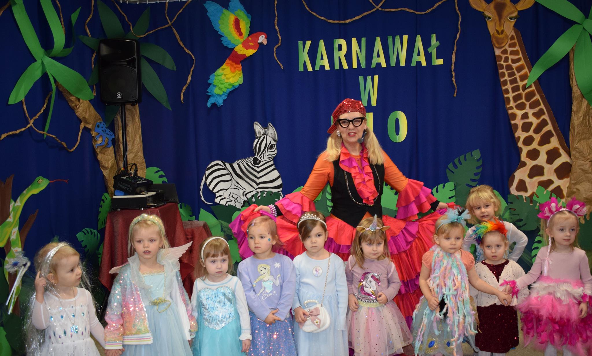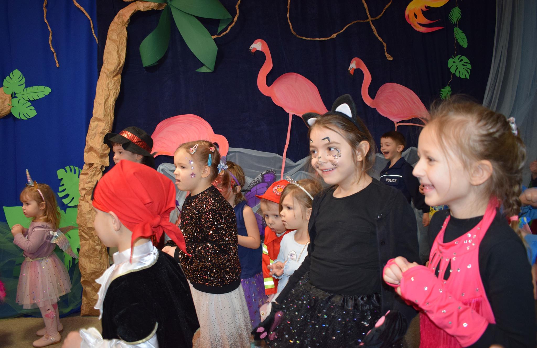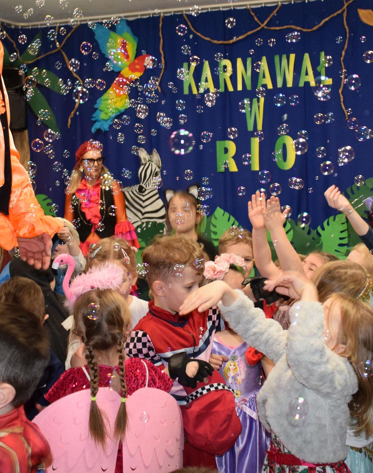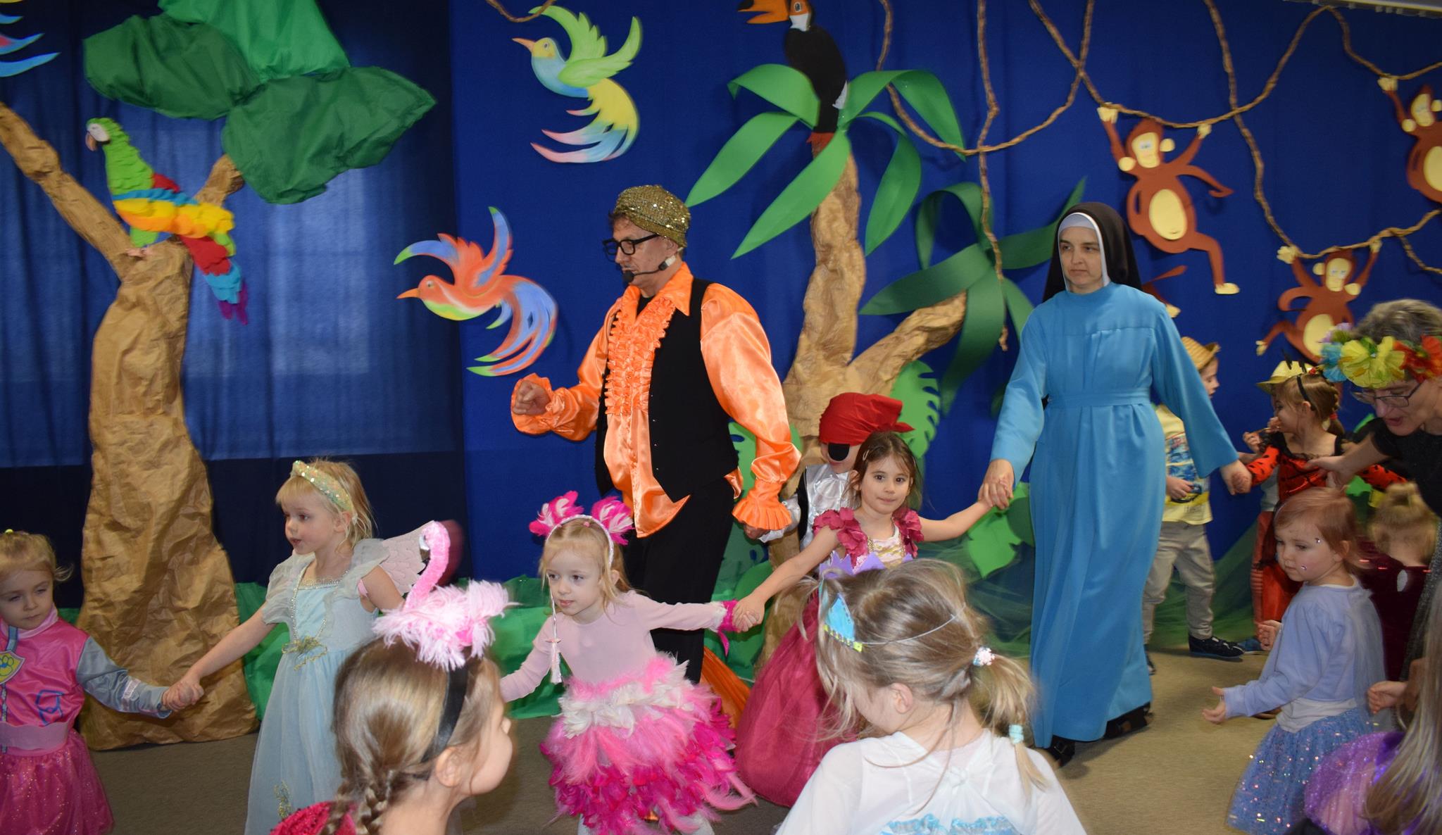 Tegoroczny karnawał rozpoczęliśmy taneczną imprezą. Żywiołowa muzyka pobudziła do tańca nawet najbardziej zasiedziałe przedszkolaki. Sunęliśmy po parkiecie solo, w parach i w wężykach w rytmie gorącej jak brazylijskie słońce samby. Wiele przebojów znaliśmy na pamięć, więc śpiewaliśmy głośno, jakby marząc o tym, by usłyszano nas na Copacabanie. Prowadzących zaś aktorów z Teatru Złoty Dukat zachwyciliśmy nie tylko swoimi umiejętnościami tanecznymi czy wokalnymi, lecz także wielobarwnymi strojami. Na parkiecie nie zabrakło policjantów, strażaków, postaci bajkowych, zwierzątek. Czas karnawałowych pląsów umilały liczne księżniczki i wróżki. Chwilami zdawało się, że wiosna już tuż-tuż, kiedy nagle swym kolorowym skrzydełkiem machnęła jakaś biedronka i motylek.