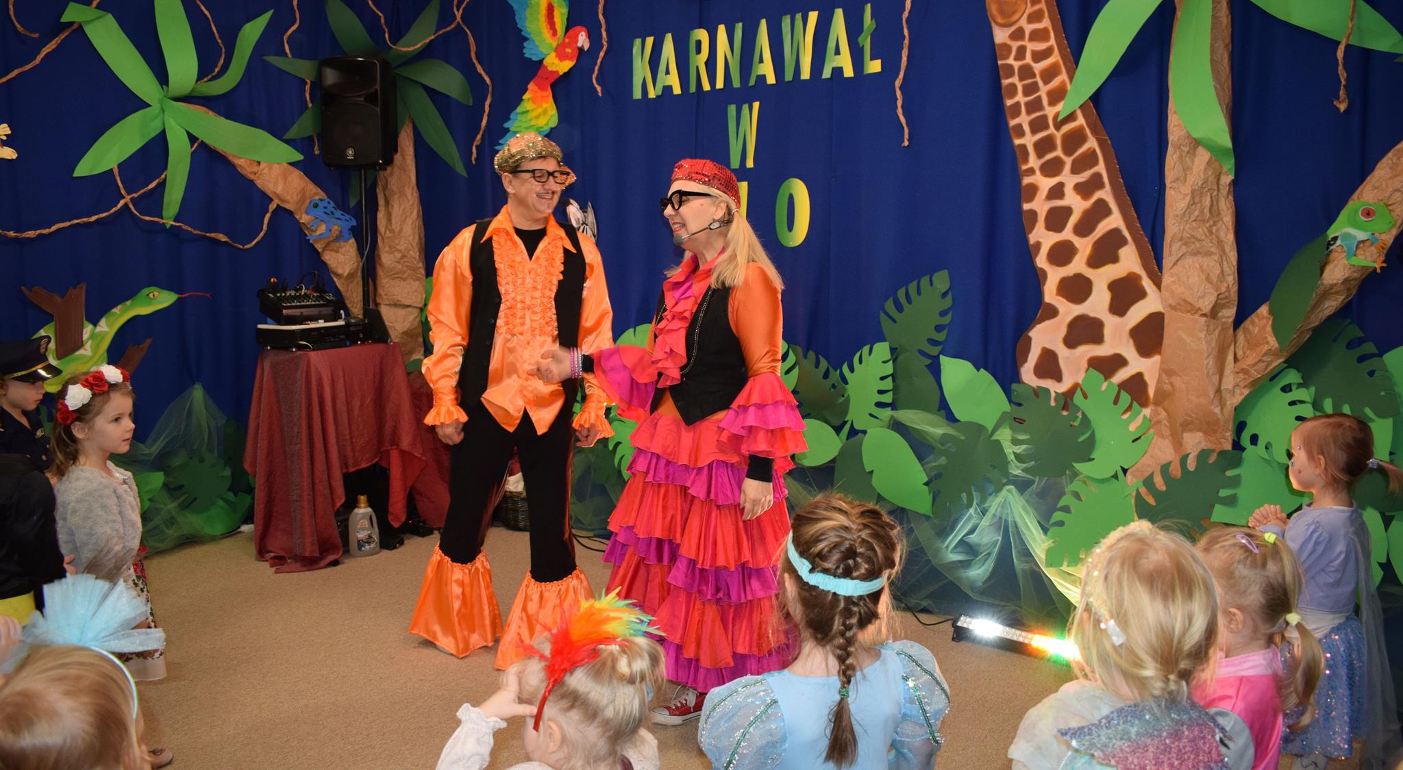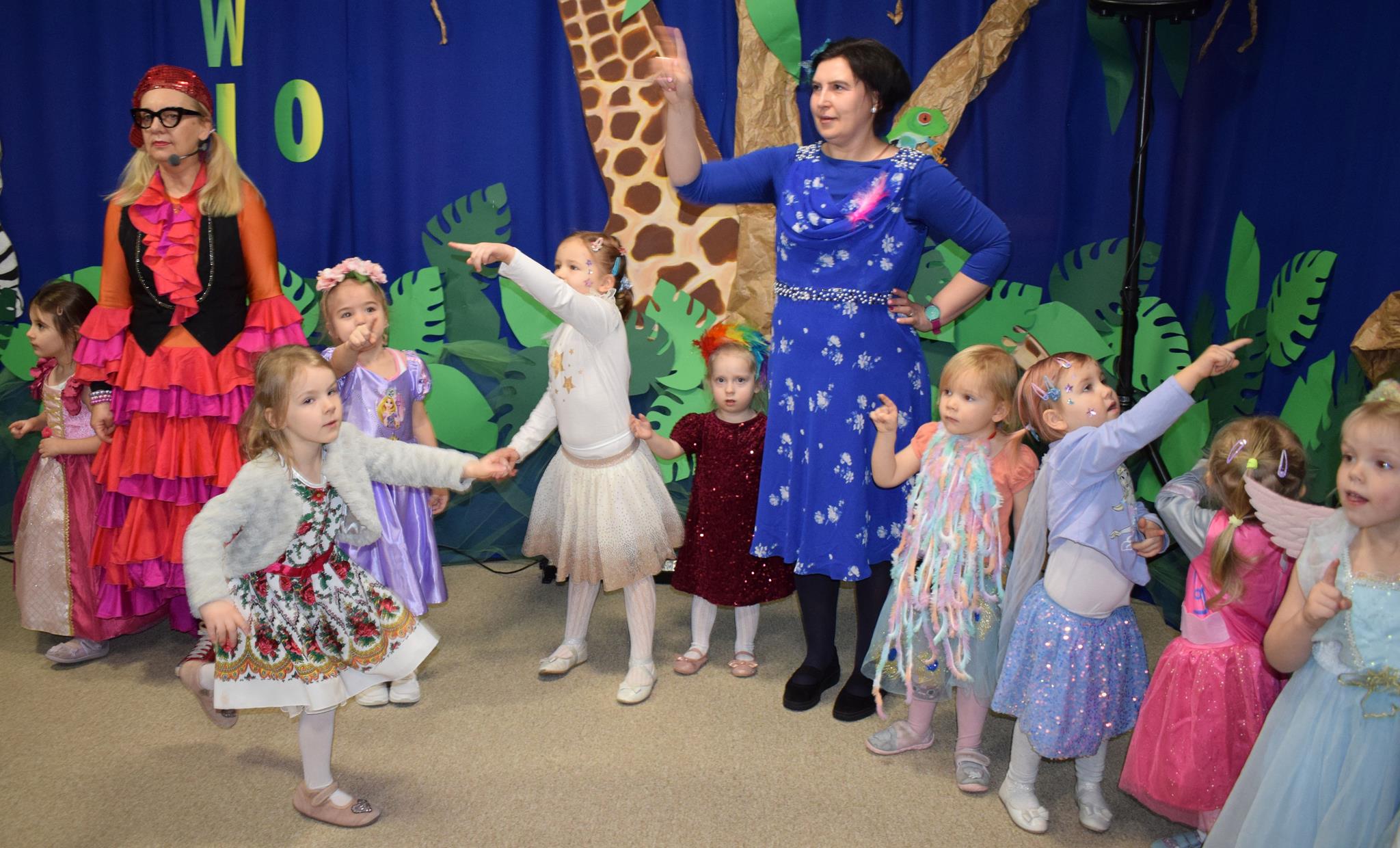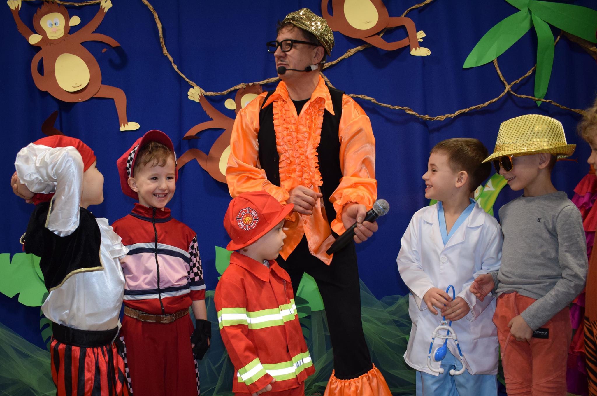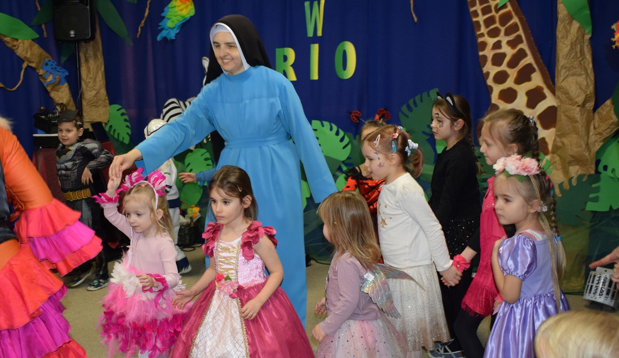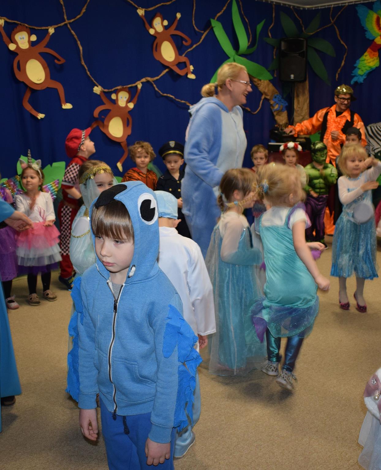 Tegoroczny karnawał rozpoczęliśmy taneczną imprezą. Żywiołowa muzyka pobudziła do tańca nawet najbardziej zasiedziałe przedszkolaki. Sunęliśmy po parkiecie solo, w parach i w wężykach w rytmie gorącej jak brazylijskie słońce samby. Wiele przebojów znaliśmy na pamięć, więc śpiewaliśmy głośno, jakby marząc o tym, by usłyszano nas na Copacabanie. Prowadzących zaś aktorów z Teatru Złoty Dukat zachwyciliśmy nie tylko swoimi umiejętnościami tanecznymi czy wokalnymi, lecz także wielobarwnymi strojami. Na parkiecie nie zabrakło policjantów, strażaków, postaci bajkowych, zwierzątek. Czas karnawałowych pląsów umilały liczne księżniczki i wróżki. Chwilami zdawało się, że wiosna już tuż-tuż, kiedy nagle swym kolorowym skrzydełkiem machnęła jakaś biedronka i motylek.