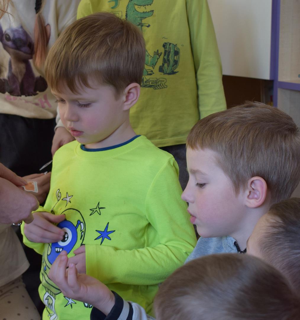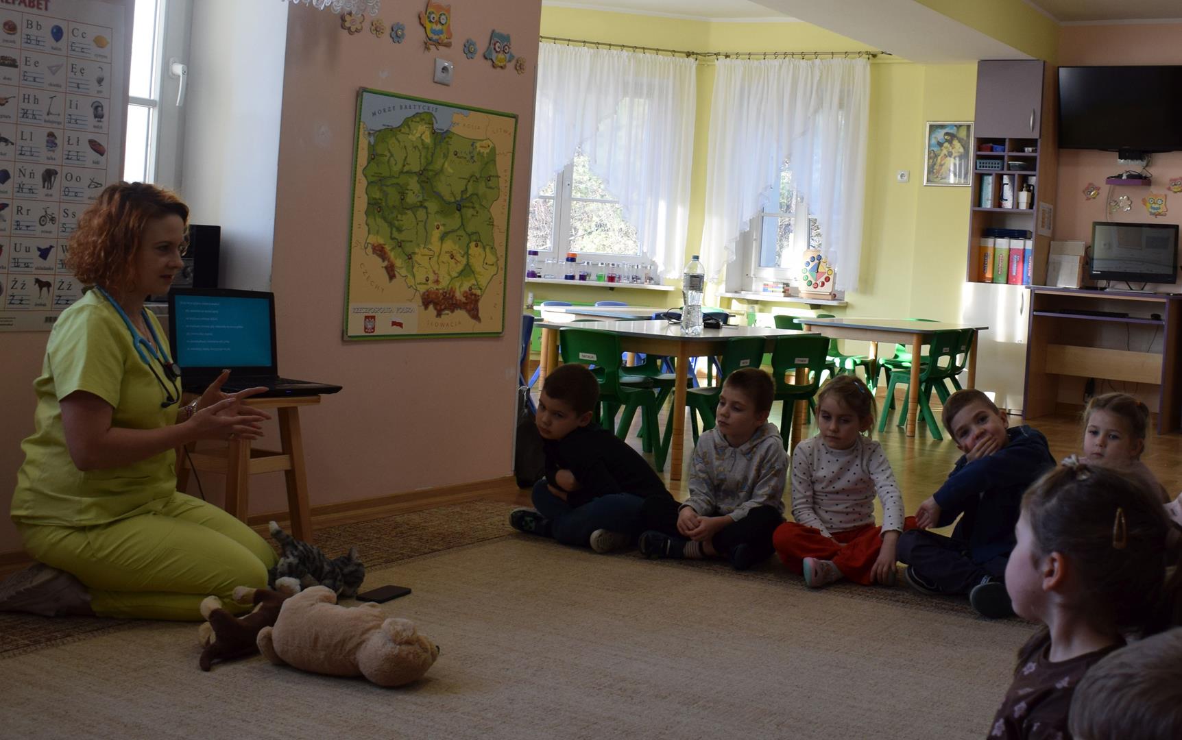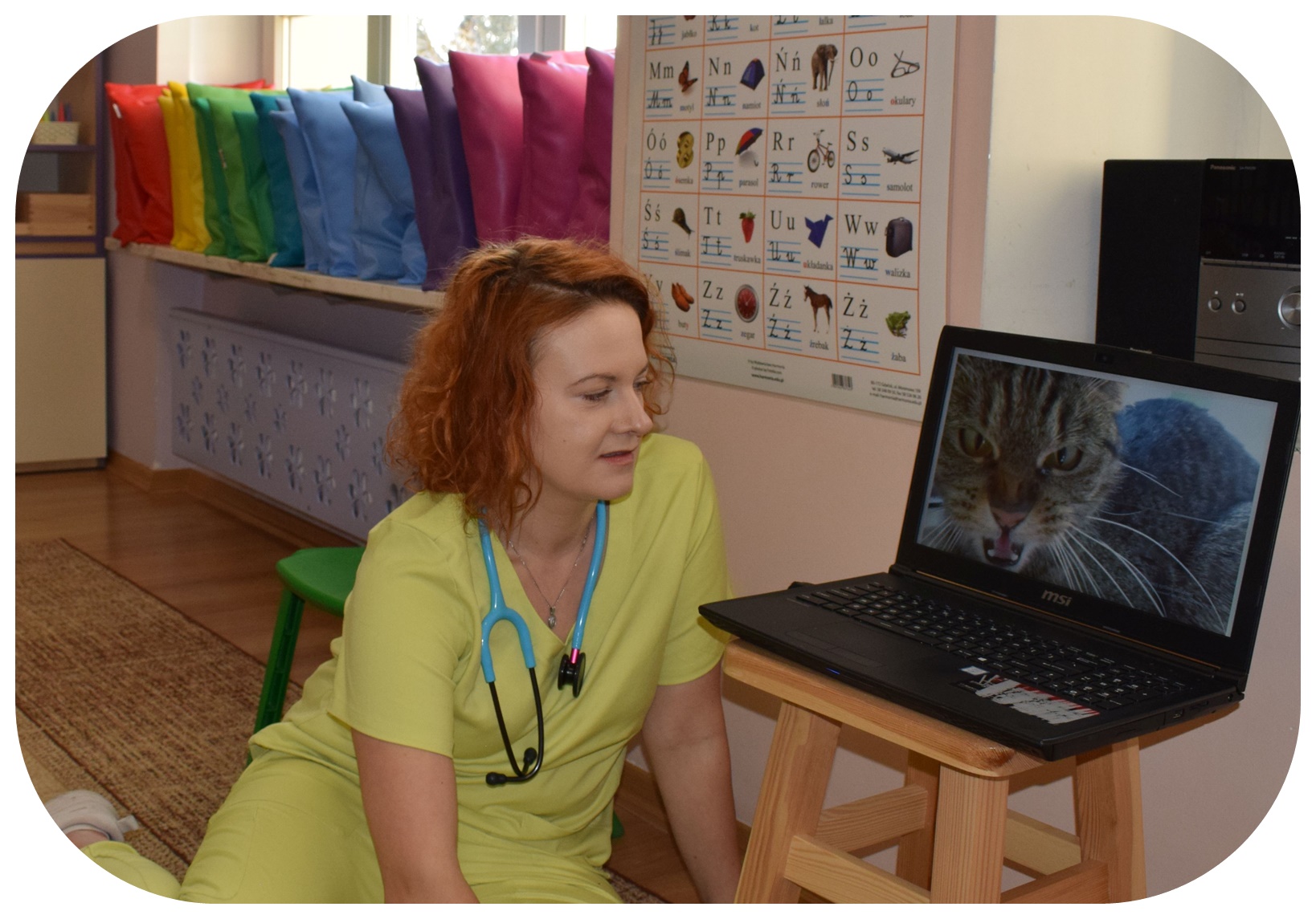 Spotkanie odbyło się w ramach współpracy z rodzicami dzieci naszego przedszkola. Gościliśmy Panią Aleksandrę – mamę Andrzeja. Pani Aleksandra jest z zawodu weterynarzem. Dzieci zdobyły wiedzę na temat: bezpiecznych zabaw ze zwierzętami, „czytanie” intencji zwierząt do nas, kiedy pies/kot chce się do nas przytulać, kiedy nasze pupile nie mają ochoty na zabawy i przytulanie, jak się zachować, gdy atakuje nas pies, czy można dotykać obce pieski lub kotki, czy można dotykać dzikie zwierzęta w parkach lub lasach. Dzieci omówiły również z Panią Aleksandrą jak należy kształtować pozytywną postawę wobec zwierząt. Zostały wyświetlone filmiki, na których były pokazane psy i koty chętne do zabawy oraz psy i koty wrogo nastawione do kontaktów z człowiekiem. Sówki brały aktywny udział w spotkaniu, zadawały pytania. Na koniec Pani Aleksandra podarowała każdemu dziecku naklejkę ze zwierzaczkiem. Bardzo dziękujemy za poświęcony czas i przeprowadzenie ciekawych zajęć w grupie Sówek:)