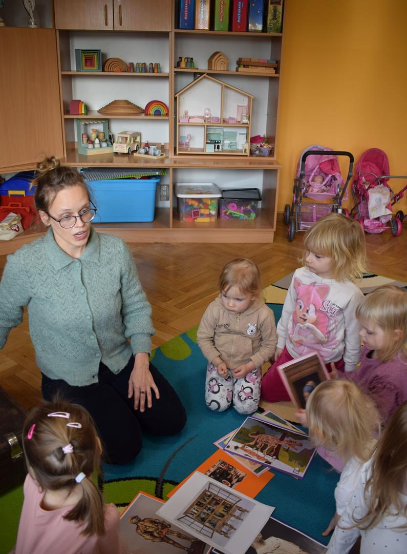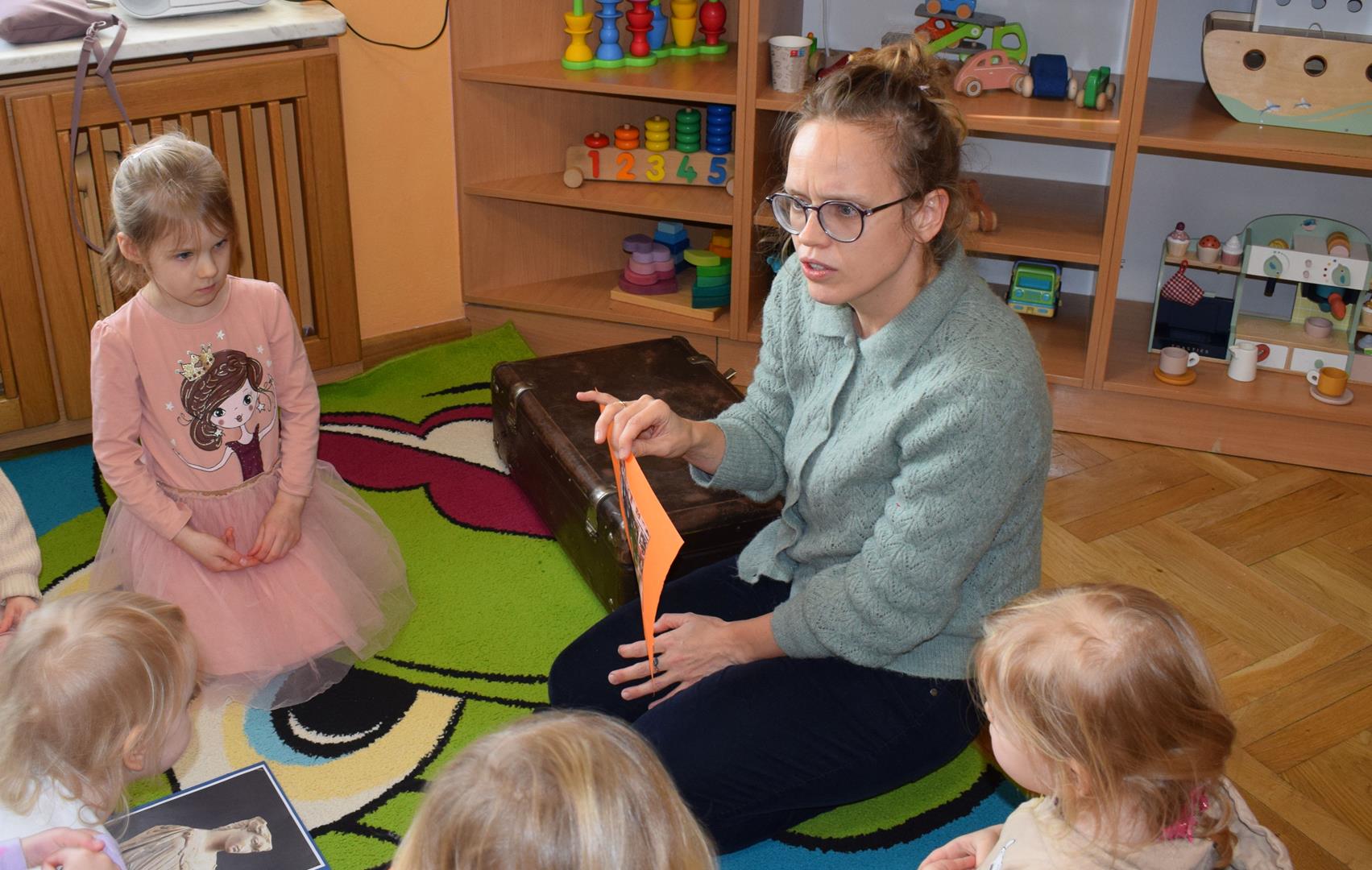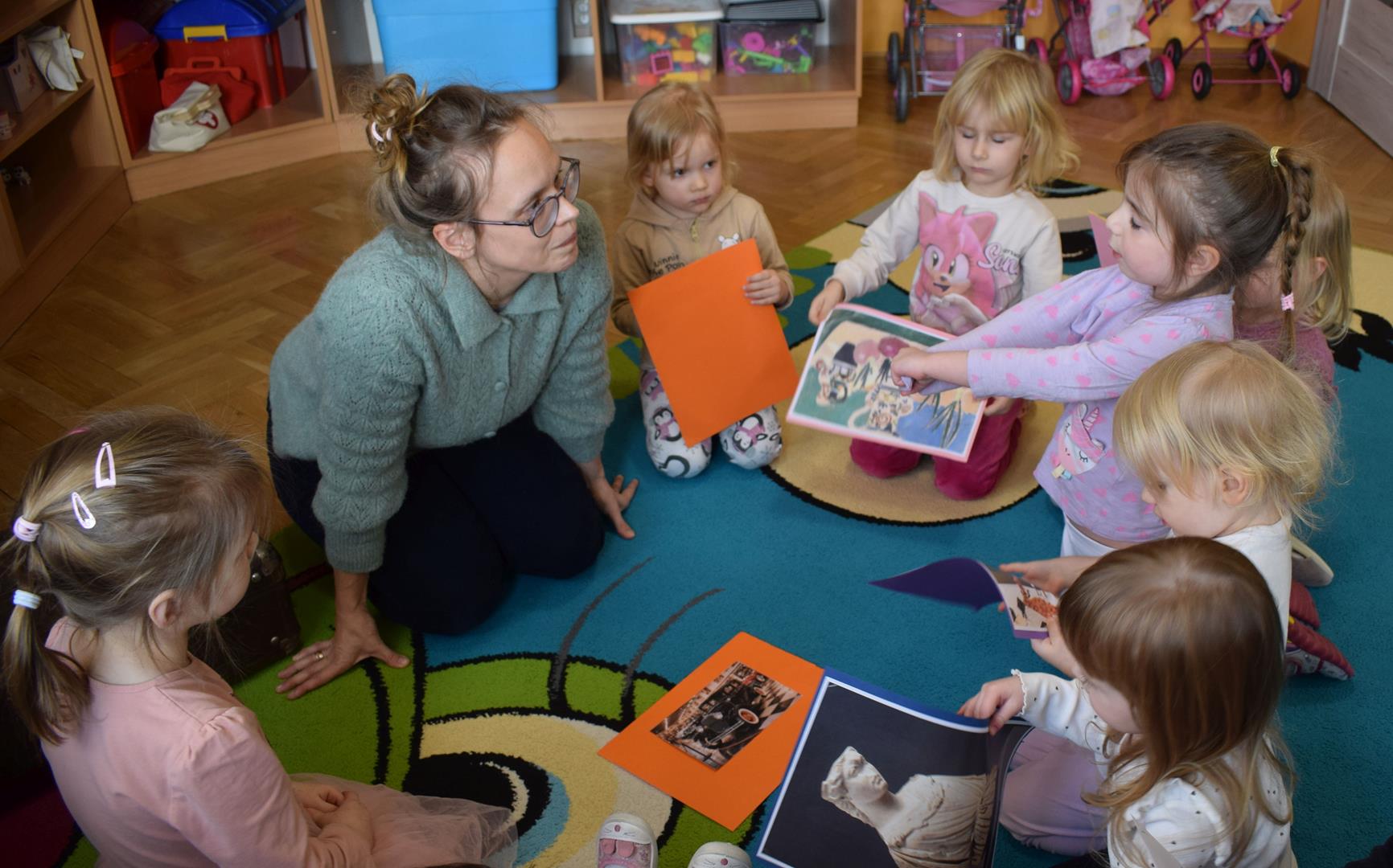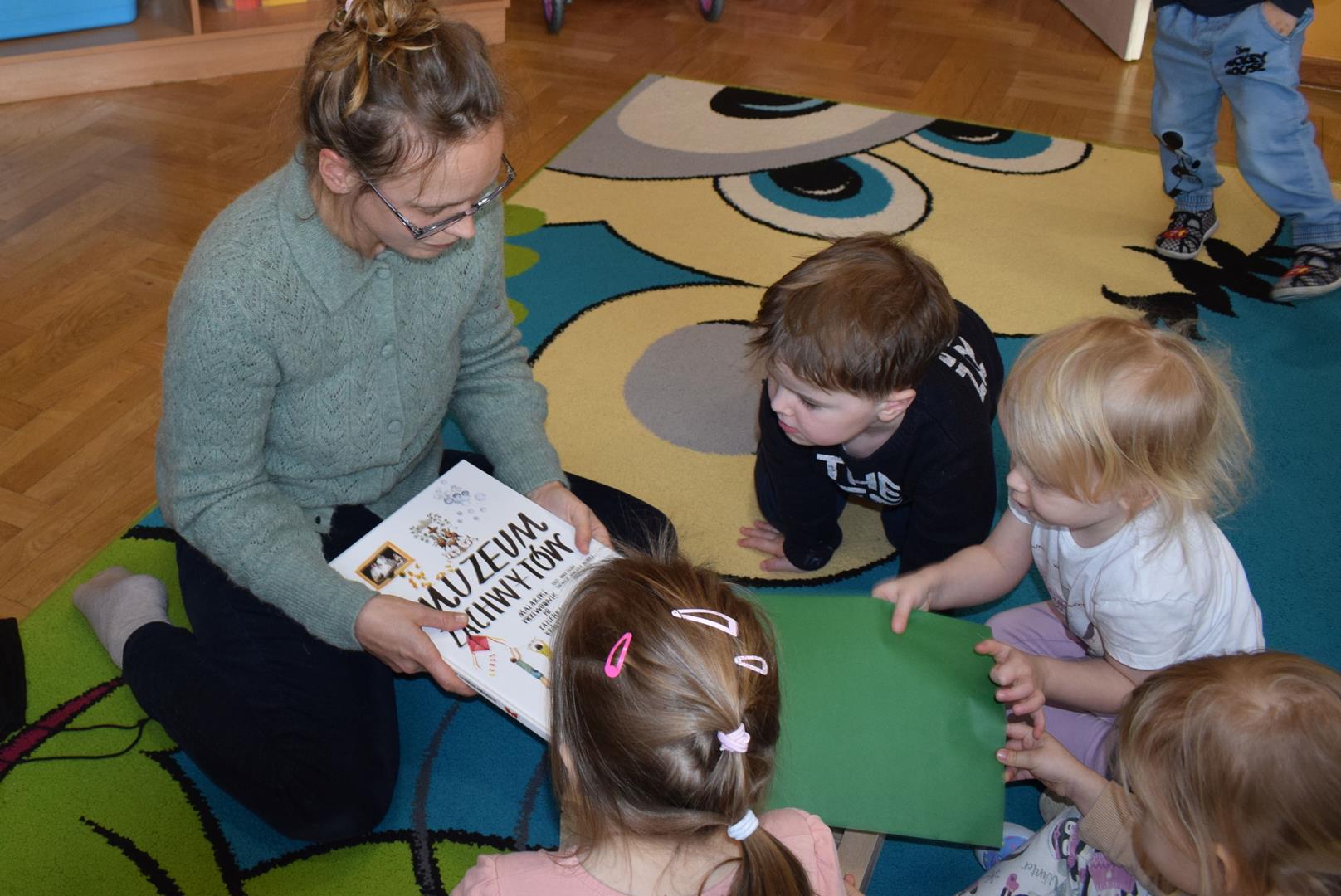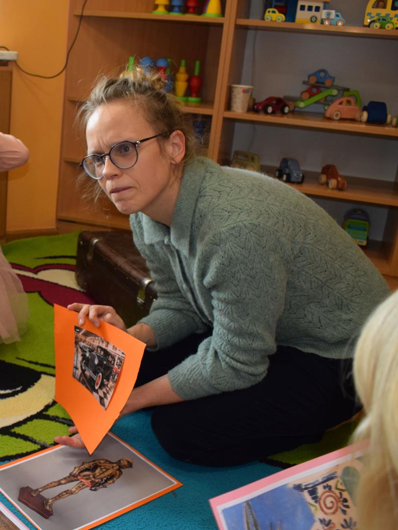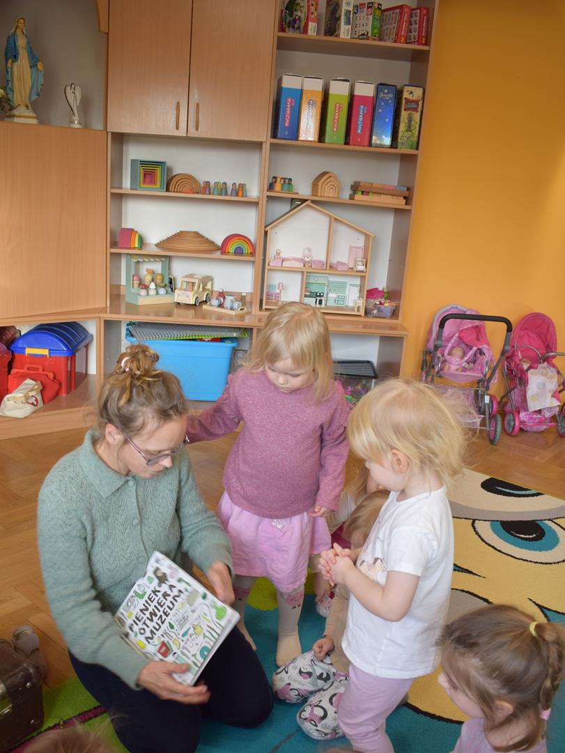 W grupie Delfinki gościliśmy Panią Agatę – mamę Jadzi, która w przystępny sposób opowiedziała dzieciom o muzeum. Pani Agata przyniosła ze sobą ogromną walizkę wypełnioną różnymi skarbami, które stopniowo pokazywała. Na początku wyjęła ilustracje różnych eksponatów muzealnych, skrywających swoją historię, które dzieci wnikliwie oglądały i próbowały nazywać. Z książki „Pieniek otwiera muzeum” autorstwa norweskiej pisarki i ilustratorki Åshild Kanstad Johnsen przedszkolaki poznały sympatycznego Pieńka, który uwielbia spacerować po lesie i kolekcjonować znalezione tam „skarby” – m.in. kamyki, szyszki, patyki i pióra. Gdy w jego leśnym domku zaczyna brakować miejsca na nowe znaleziska, za namową babci postanawia skatalogować swoje zbiory i otworzyć własne muzeum. Przedszkolaki zainspirowane Pieńkiem wspólnie stworzyły swoje muzeum w przyniesionej przez Panią Agatę skrzyni. Z tajemniczego worka losowały różne „skarby” i według ustalonego „klucza” je porządkowały. Jako, że Pani Agata zawodowo związana jest z Muzeum w Łazienkach, z wielkiej walizki wyłoniła się książka pt. „Muzeum zachwytów. Malarski przewodnik po Łazienkach Królewskich”. Ilustracje z przewodnika posłużyły do krótkiej zabawy w „bystre oczko”. Na koniec Pani Agata obdarowała dzieci zestawem naklejek do stworzenia własnego muzeum w domu, np. w zeszycie, na kartce… Bardzo dziękujemy za interesującą lekcję muzealną w przedszkolu oraz za zaproszenie do Łazienek Królewskich.
