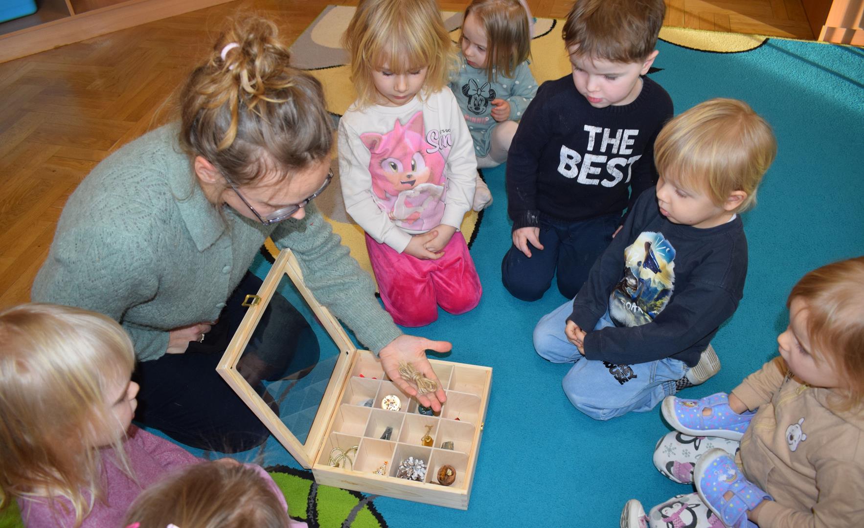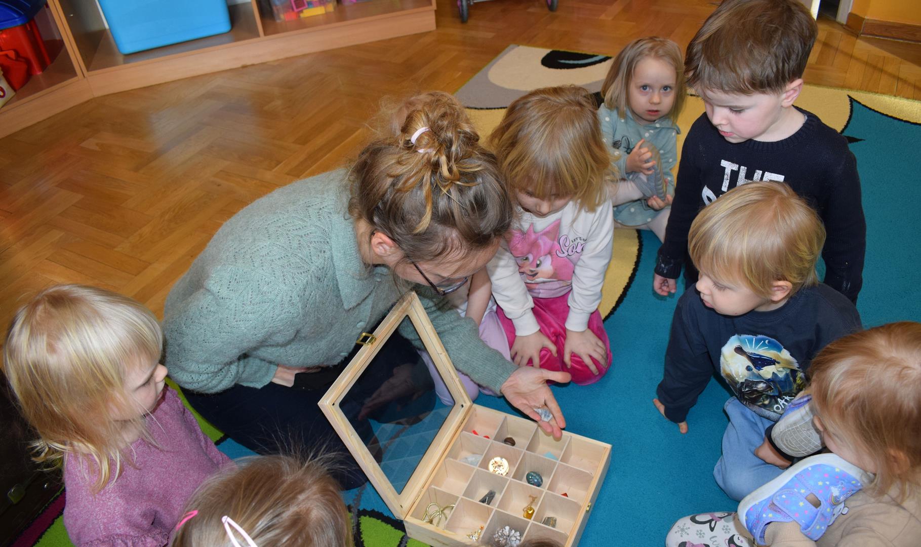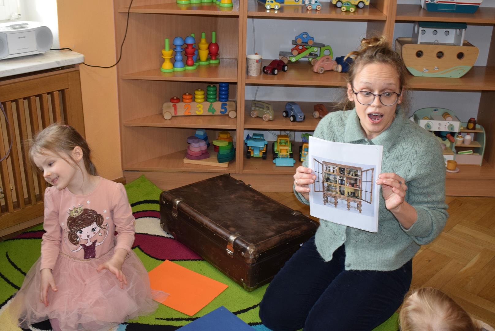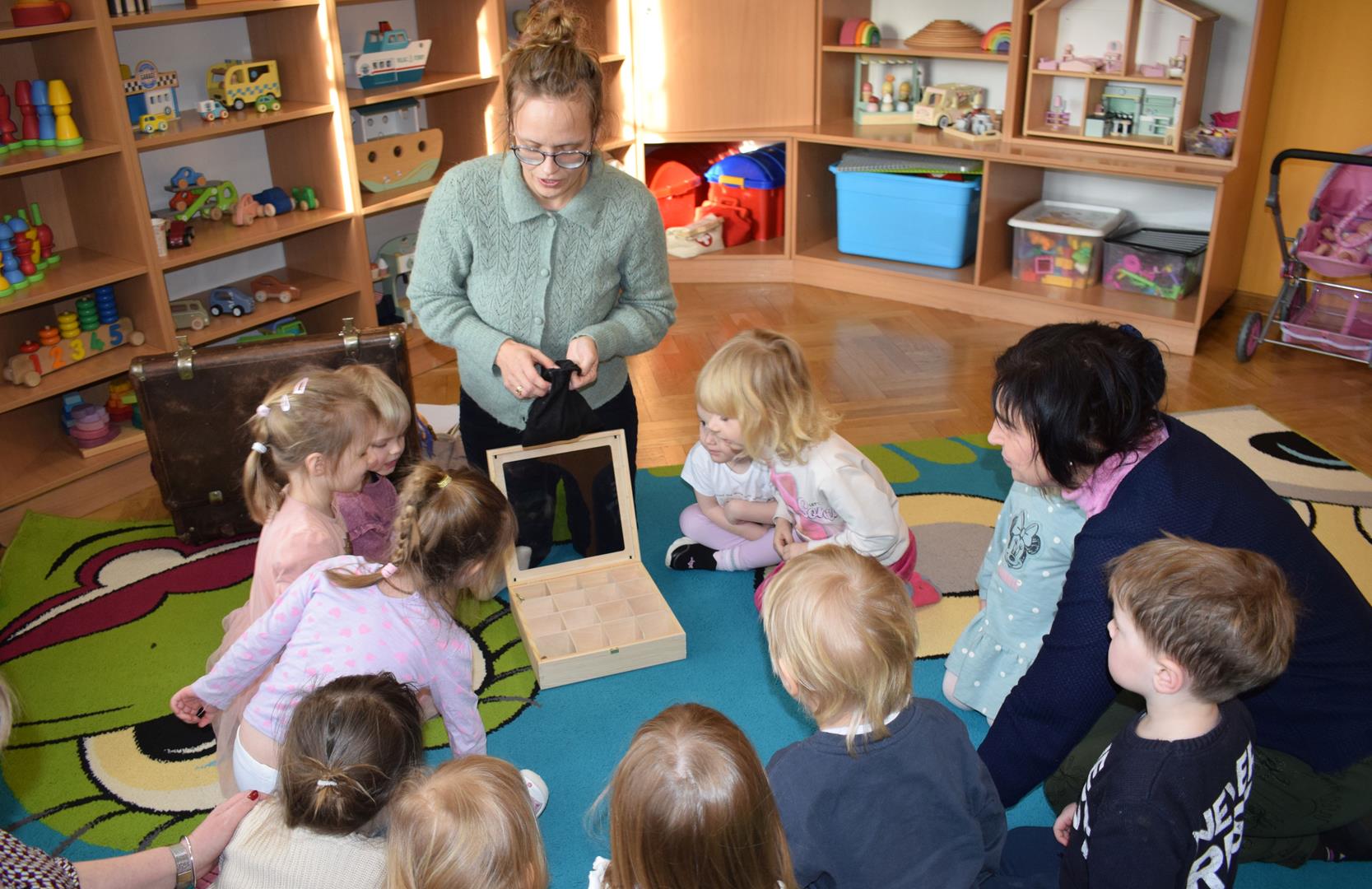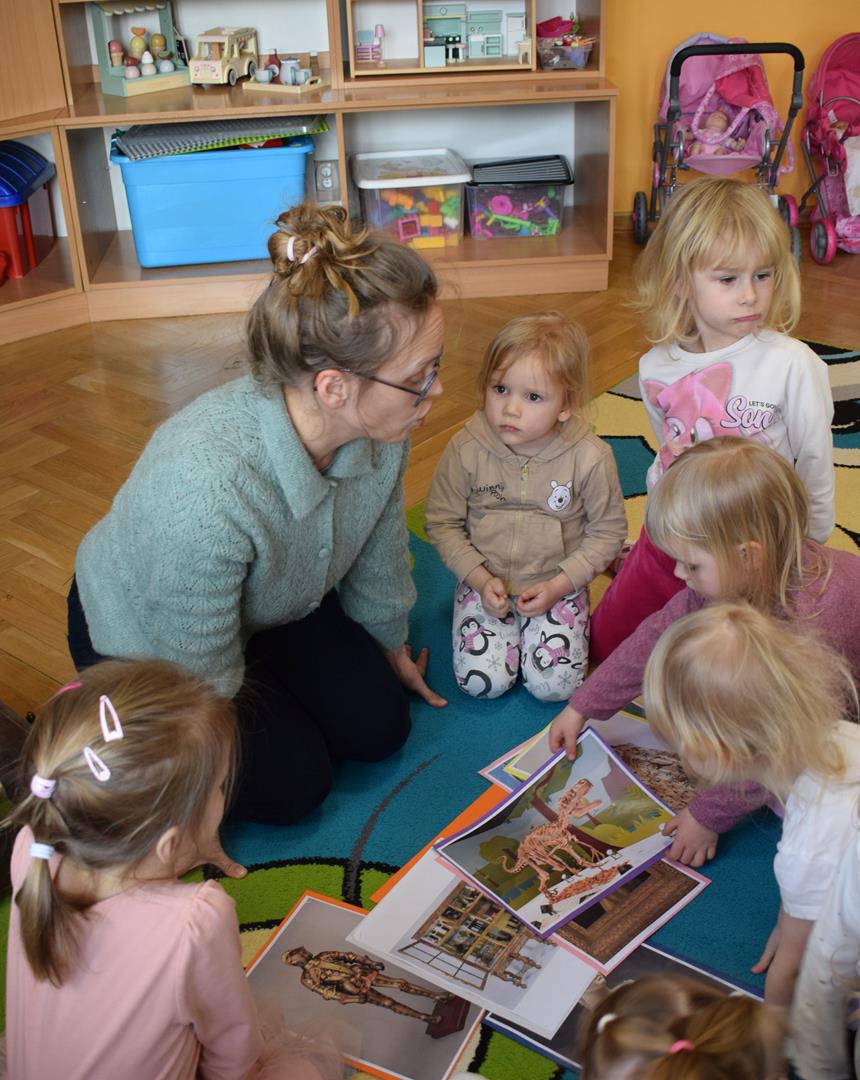 W grupie Delfinki gościliśmy Panią Agatę – mamę Jadzi, która w przystępny sposób opowiedziała dzieciom o muzeum. Pani Agata przyniosła ze sobą ogromną walizkę wypełnioną różnymi skarbami, które stopniowo pokazywała. Na początku wyjęła ilustracje różnych eksponatów muzealnych, skrywających swoją historię, które dzieci wnikliwie oglądały i próbowały nazywać. Z książki „Pieniek otwiera muzeum” autorstwa norweskiej pisarki i ilustratorki Åshild Kanstad Johnsen przedszkolaki poznały sympatycznego Pieńka, który uwielbia spacerować po lesie i kolekcjonować znalezione tam „skarby” – m.in. kamyki, szyszki, patyki i pióra. Gdy w jego leśnym domku zaczyna brakować miejsca na nowe znaleziska, za namową babci postanawia skatalogować swoje zbiory i otworzyć własne muzeum. Przedszkolaki zainspirowane Pieńkiem wspólnie stworzyły swoje muzeum w przyniesionej przez Panią Agatę skrzyni. Z tajemniczego worka losowały różne „skarby” i według ustalonego „klucza” je porządkowały. Jako, że Pani Agata zawodowo związana jest z Muzeum w Łazienkach, z wielkiej walizki wyłoniła się książka pt. „Muzeum zachwytów. Malarski przewodnik po Łazienkach Królewskich”. Ilustracje z przewodnika posłużyły do krótkiej zabawy w „bystre oczko”. Na koniec Pani Agata obdarowała dzieci zestawem naklejek do stworzenia własnego muzeum w domu, np. w zeszycie, na kartce… Bardzo dziękujemy za interesującą lekcję muzealną w przedszkolu oraz za zaproszenie do Łazienek Królewskich.