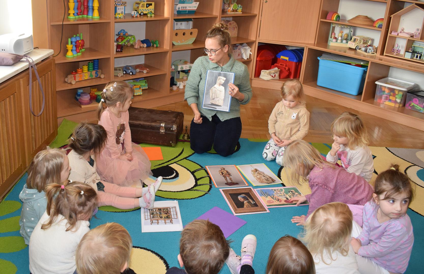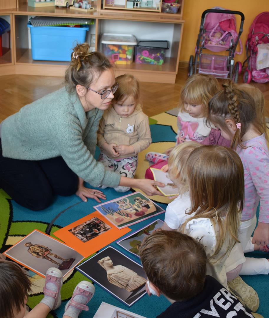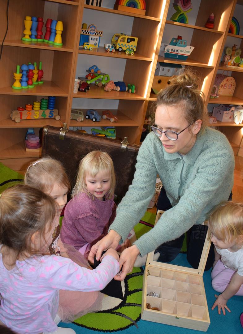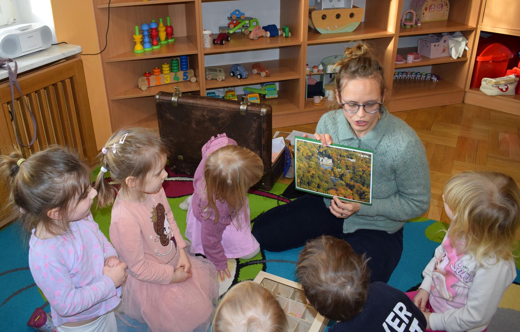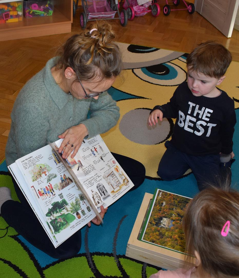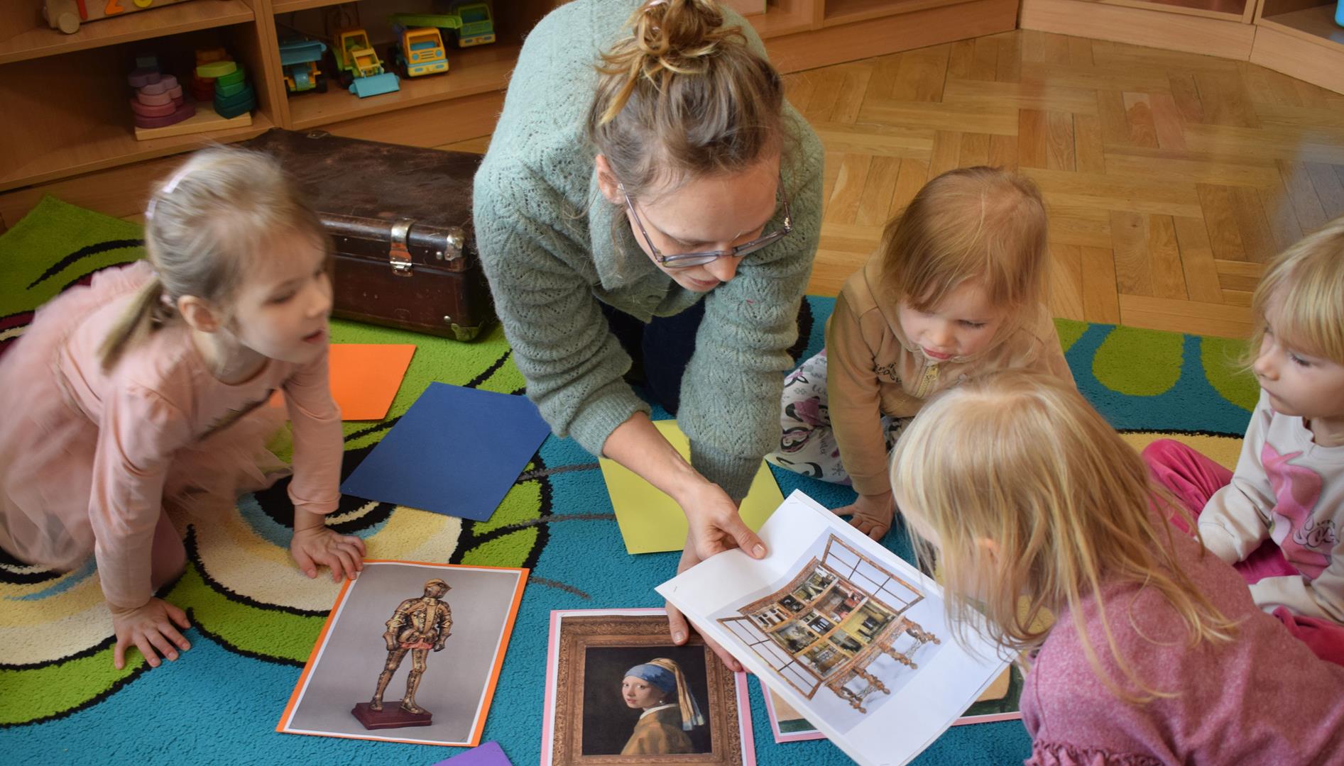 W grupie Delfinki gościliśmy Panią Agatę – mamę Jadzi, która w przystępny sposób opowiedziała dzieciom o muzeum. Pani Agata przyniosła ze sobą ogromną walizkę wypełnioną różnymi skarbami, które stopniowo pokazywała. Na początku wyjęła ilustracje różnych eksponatów muzealnych, skrywających swoją historię, które dzieci wnikliwie oglądały i próbowały nazywać. Z książki „Pieniek otwiera muzeum” autorstwa norweskiej pisarki i ilustratorki Åshild Kanstad Johnsen przedszkolaki poznały sympatycznego Pieńka, który uwielbia spacerować po lesie i kolekcjonować znalezione tam „skarby” – m.in. kamyki, szyszki, patyki i pióra. Gdy w jego leśnym domku zaczyna brakować miejsca na nowe znaleziska, za namową babci postanawia skatalogować swoje zbiory i otworzyć własne muzeum. Przedszkolaki zainspirowane Pieńkiem wspólnie stworzyły swoje muzeum w przyniesionej przez Panią Agatę skrzyni. Z tajemniczego worka losowały różne „skarby” i według ustalonego „klucza” je porządkowały. Jako, że Pani Agata zawodowo związana jest z Muzeum w Łazienkach, z wielkiej walizki wyłoniła się książka pt. „Muzeum zachwytów. Malarski przewodnik po Łazienkach Królewskich”. Ilustracje z przewodnika posłużyły do krótkiej zabawy w „bystre oczko”. Na koniec Pani Agata obdarowała dzieci zestawem naklejek do stworzenia własnego muzeum w domu, np. w zeszycie, na kartce… Bardzo dziękujemy za interesującą lekcję muzealną w przedszkolu oraz za zaproszenie do Łazienek Królewskich.
