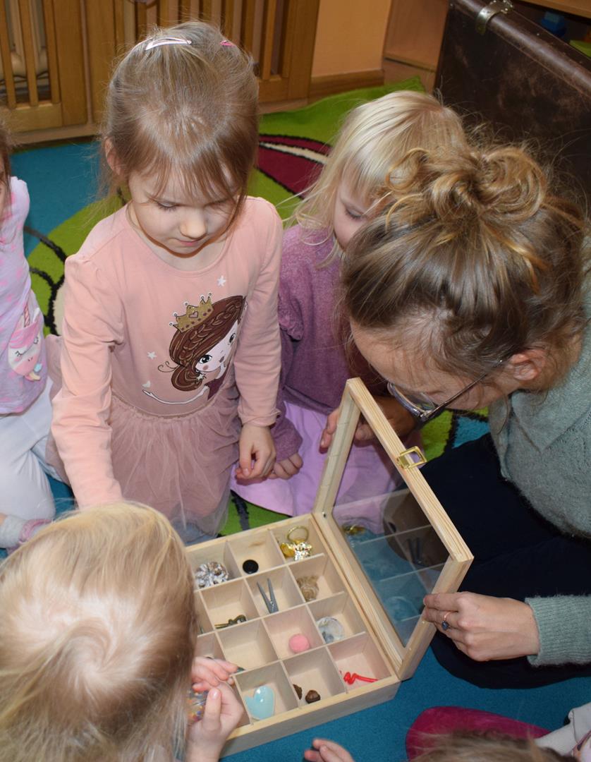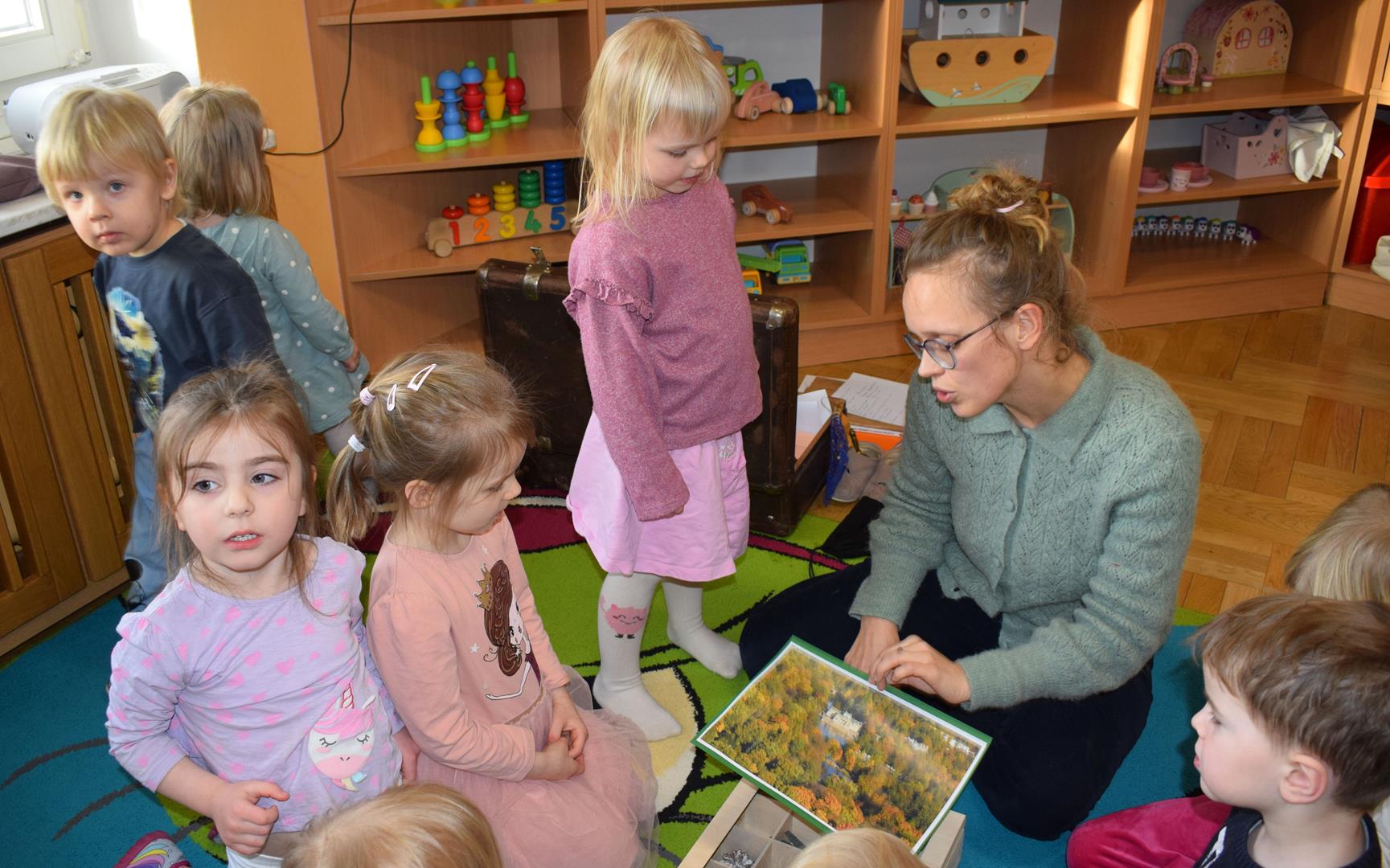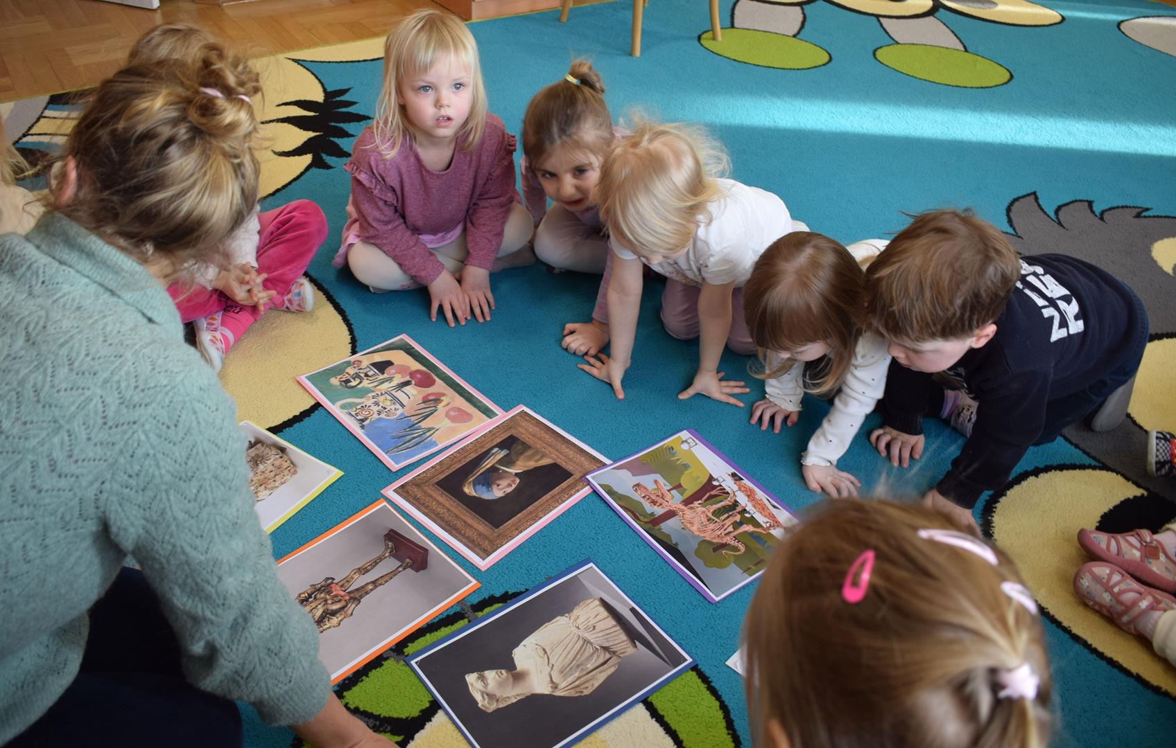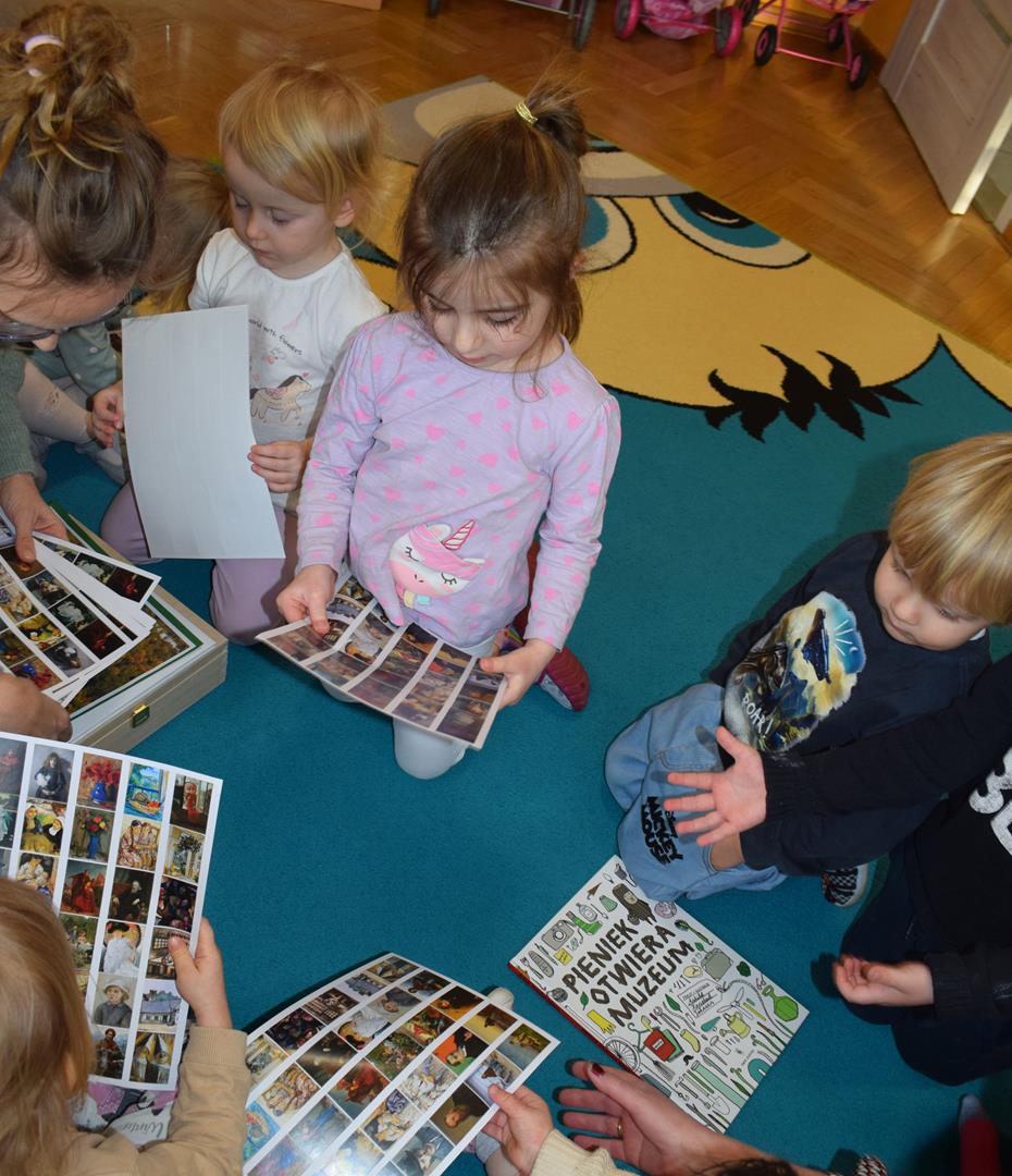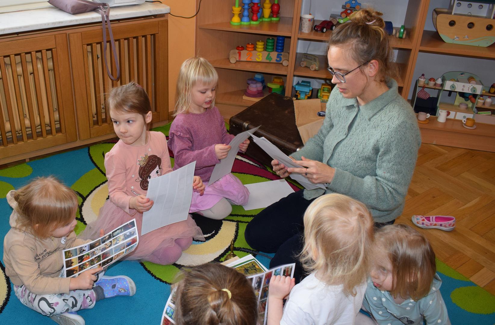 W grupie Delfinki gościliśmy Panią Agatę – mamę Jadzi, która w przystępny sposób opowiedziała dzieciom o muzeum. Pani Agata przyniosła ze sobą ogromną walizkę wypełnioną różnymi skarbami, które stopniowo pokazywała. Na początku wyjęła ilustracje różnych eksponatów muzealnych, skrywających swoją historię, które dzieci wnikliwie oglądały i próbowały nazywać. Z książki „Pieniek otwiera muzeum” autorstwa norweskiej pisarki i ilustratorki Åshild Kanstad Johnsen przedszkolaki poznały sympatycznego Pieńka, który uwielbia spacerować po lesie i kolekcjonować znalezione tam „skarby” – m.in. kamyki, szyszki, patyki i pióra. Gdy w jego leśnym domku zaczyna brakować miejsca na nowe znaleziska, za namową babci postanawia skatalogować swoje zbiory i otworzyć własne muzeum. Przedszkolaki zainspirowane Pieńkiem wspólnie stworzyły swoje muzeum w przyniesionej przez Panią Agatę skrzyni. Z tajemniczego worka losowały różne „skarby” i według ustalonego „klucza” je porządkowały. Jako, że Pani Agata zawodowo związana jest z Muzeum w Łazienkach, z wielkiej walizki wyłoniła się książka pt. „Muzeum zachwytów. Malarski przewodnik po Łazienkach Królewskich”. Ilustracje z przewodnika posłużyły do krótkiej zabawy w „bystre oczko”. Na koniec Pani Agata obdarowała dzieci zestawem naklejek do stworzenia własnego muzeum w domu, np. w zeszycie, na kartce… Bardzo dziękujemy za interesującą lekcję muzealną w przedszkolu oraz za zaproszenie do Łazienek Królewskich.
