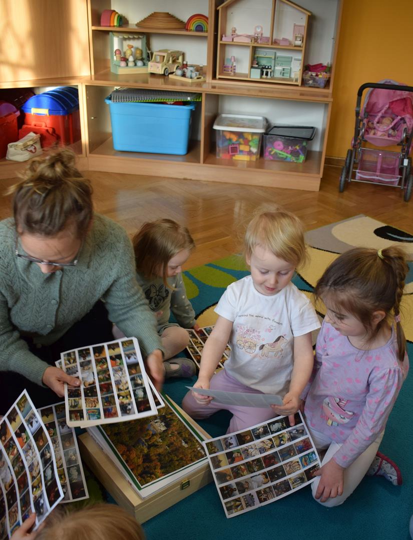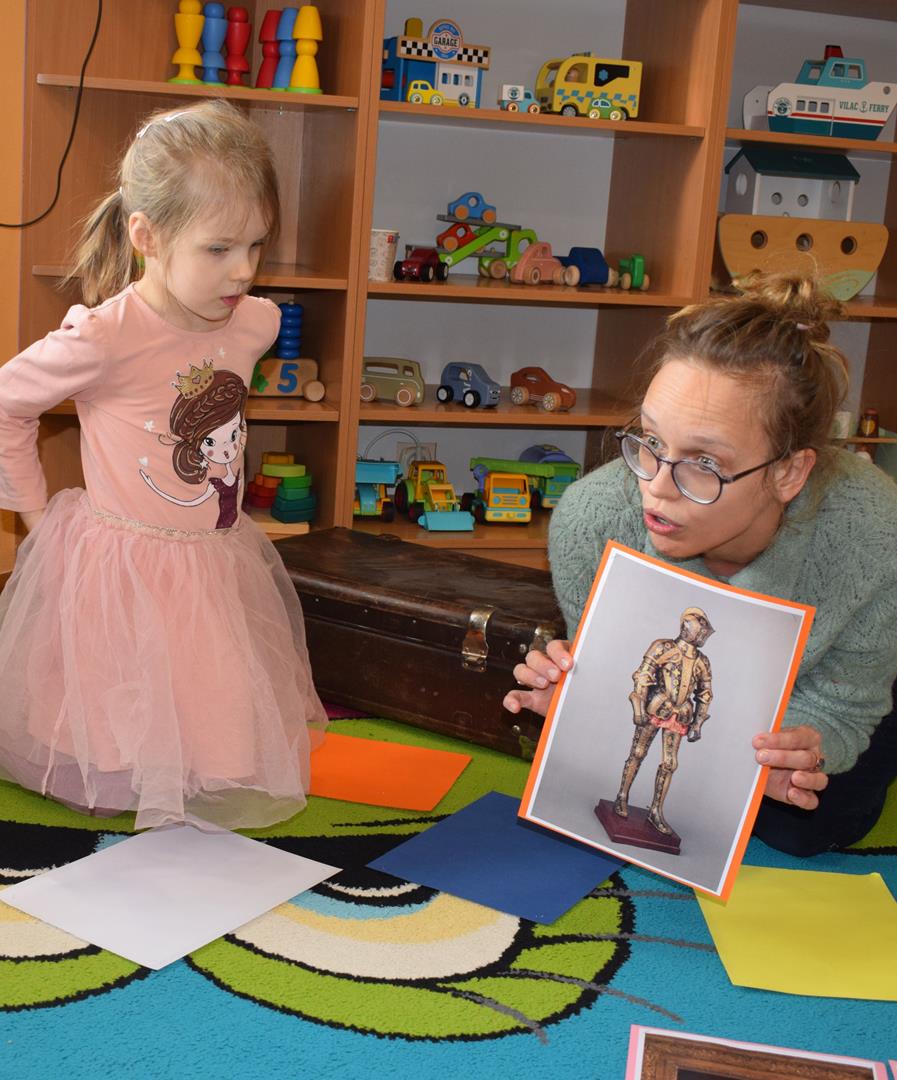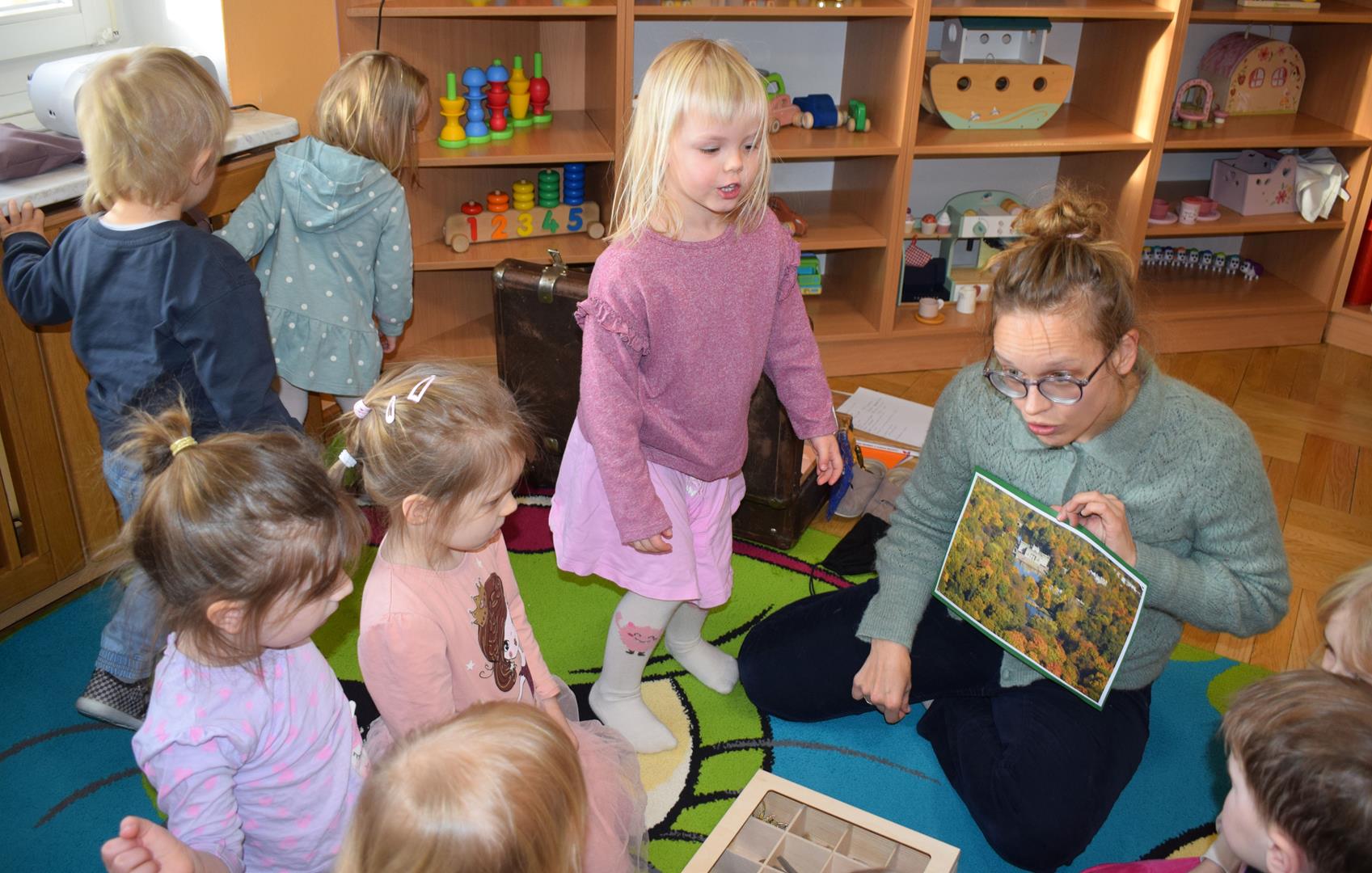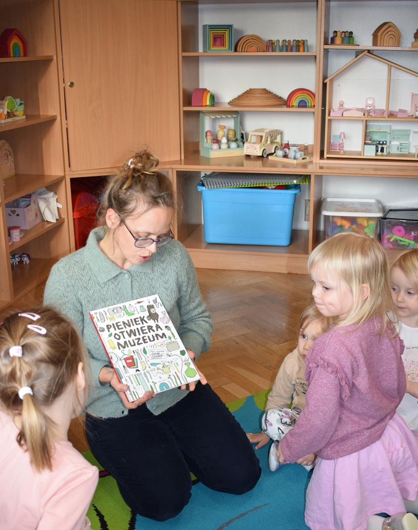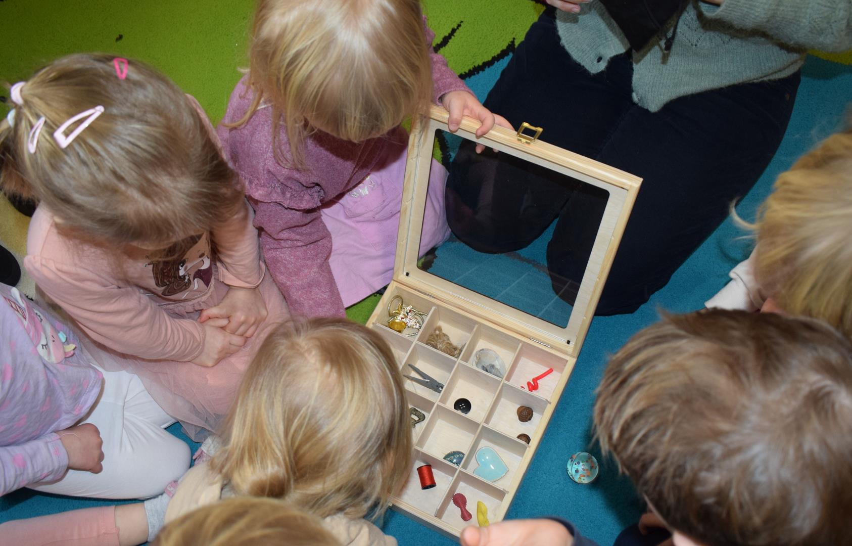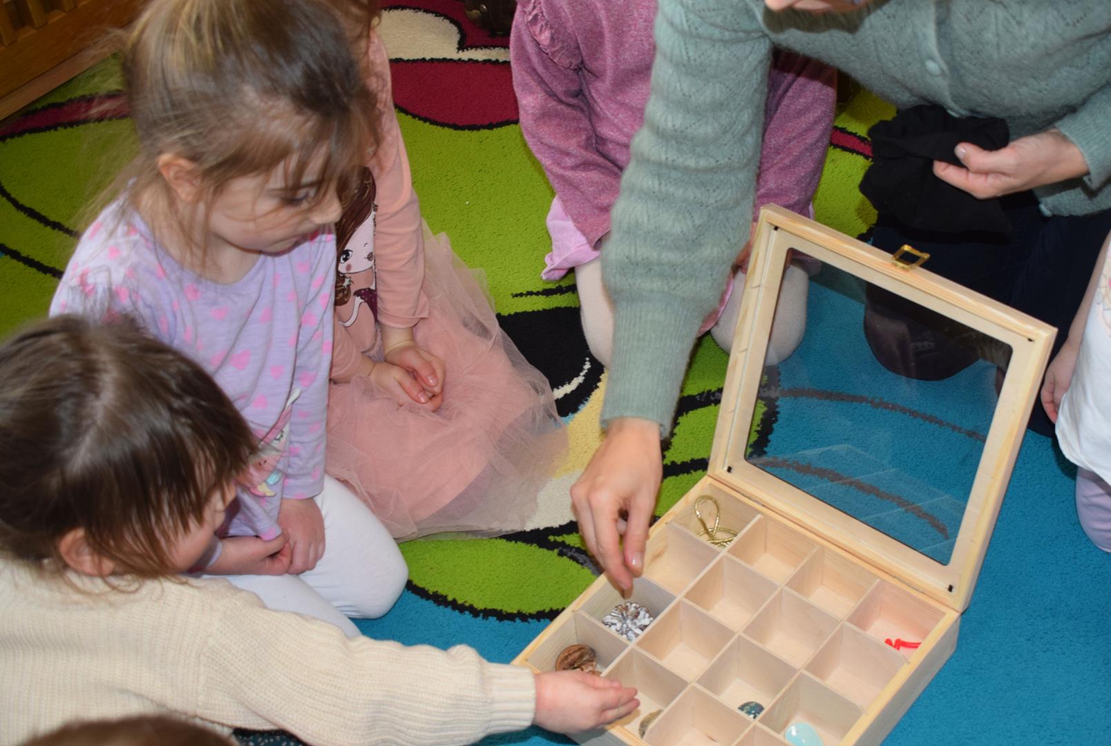 W grupie Delfinki gościliśmy Panią Agatę – mamę Jadzi, która w przystępny sposób opowiedziała dzieciom o muzeum. Pani Agata przyniosła ze sobą ogromną walizkę wypełnioną różnymi skarbami, które stopniowo pokazywała. Na początku wyjęła ilustracje różnych eksponatów muzealnych, skrywających swoją historię, które dzieci wnikliwie oglądały i próbowały nazywać. Z książki „Pieniek otwiera muzeum” autorstwa norweskiej pisarki i ilustratorki Åshild Kanstad Johnsen przedszkolaki poznały sympatycznego Pieńka, który uwielbia spacerować po lesie i kolekcjonować znalezione tam „skarby” – m.in. kamyki, szyszki, patyki i pióra. Gdy w jego leśnym domku zaczyna brakować miejsca na nowe znaleziska, za namową babci postanawia skatalogować swoje zbiory i otworzyć własne muzeum. Przedszkolaki zainspirowane Pieńkiem wspólnie stworzyły swoje muzeum w przyniesionej przez Panią Agatę skrzyni. Z tajemniczego worka losowały różne „skarby” i według ustalonego „klucza” je porządkowały. Jako, że Pani Agata zawodowo związana jest z Muzeum w Łazienkach, z wielkiej walizki wyłoniła się książka pt. „Muzeum zachwytów. Malarski przewodnik po Łazienkach Królewskich”. Ilustracje z przewodnika posłużyły do krótkiej zabawy w „bystre oczko”. Na koniec Pani Agata obdarowała dzieci zestawem naklejek do stworzenia własnego muzeum w domu, np. w zeszycie, na kartce… Bardzo dziękujemy za interesującą lekcję muzealną w przedszkolu oraz za zaproszenie do Łazienek Królewskich.
