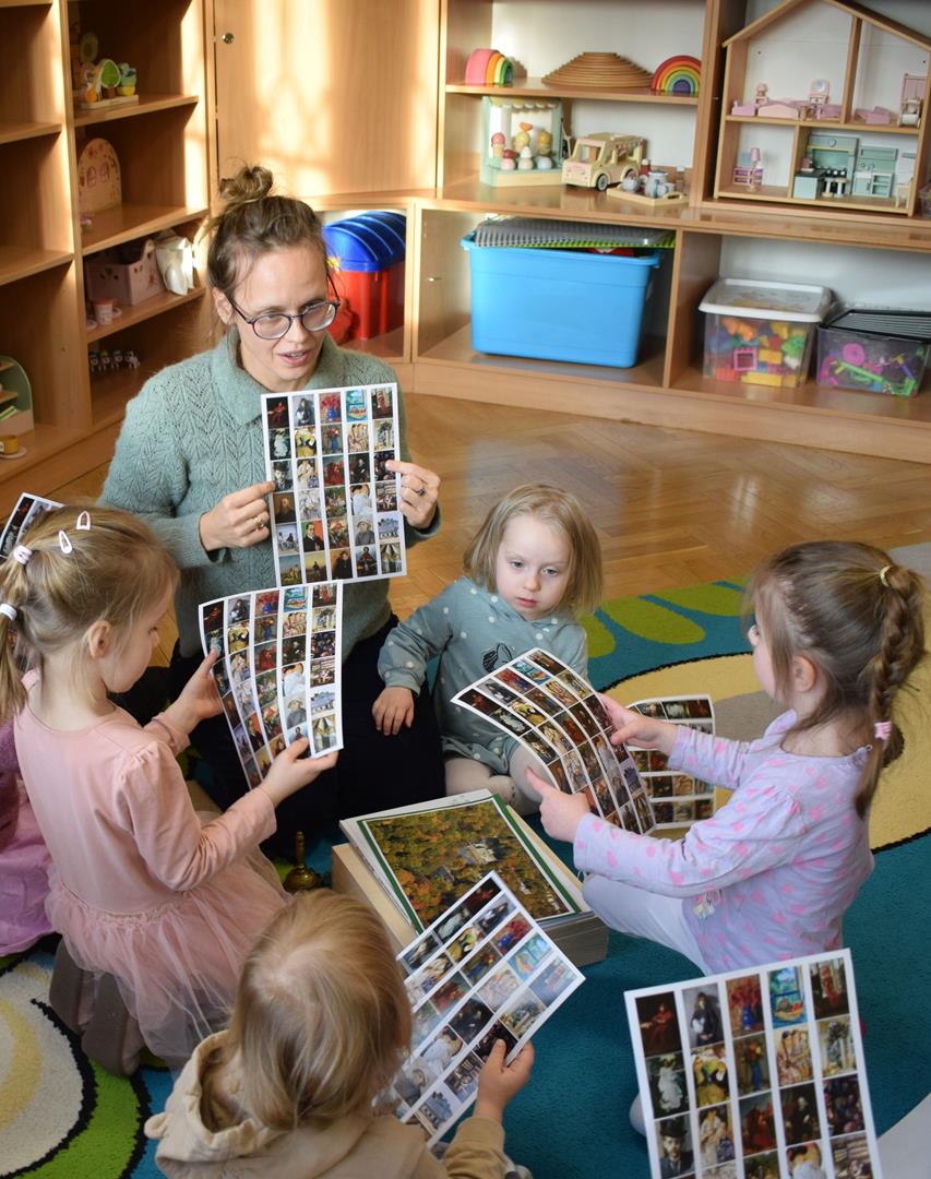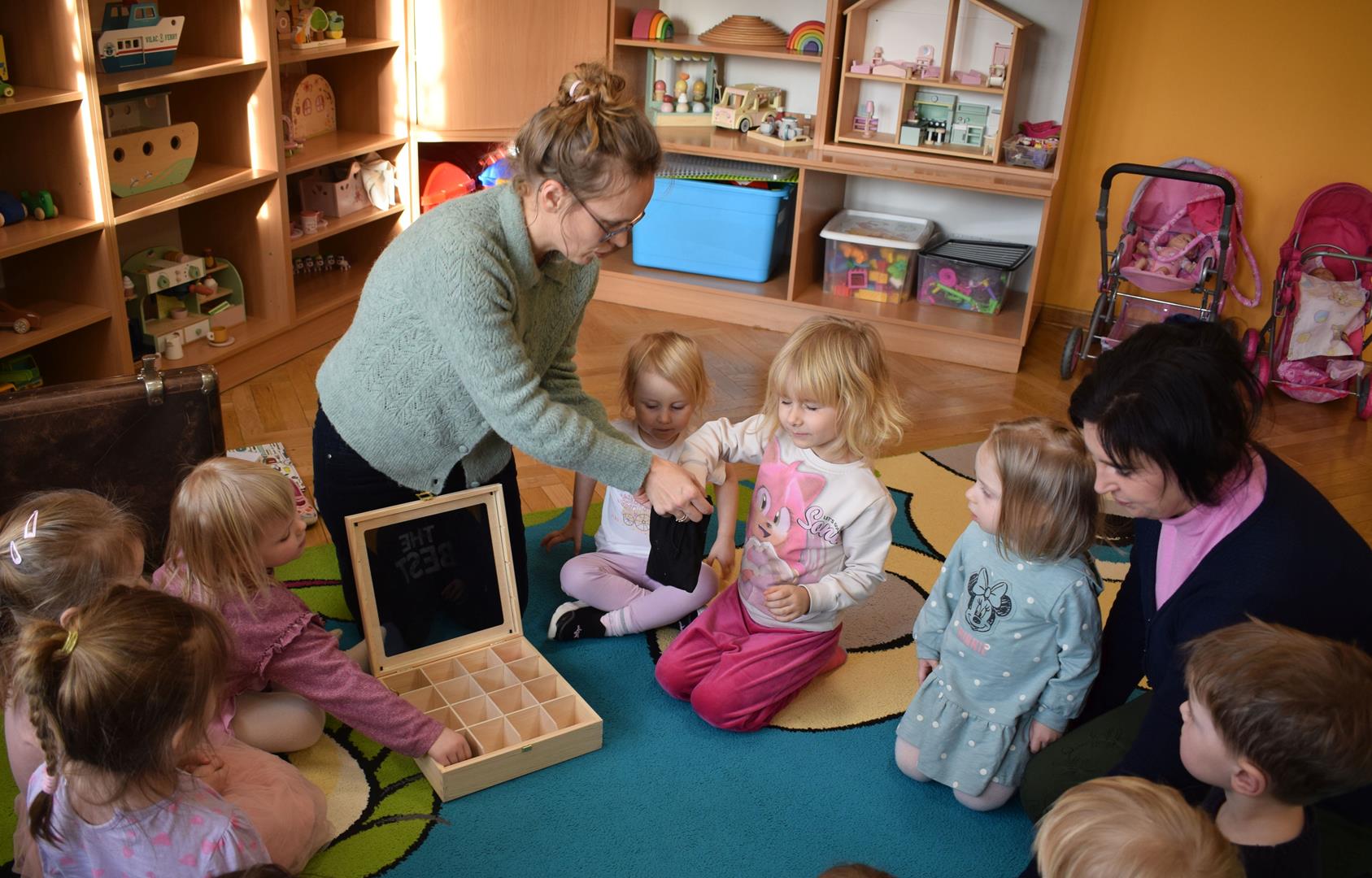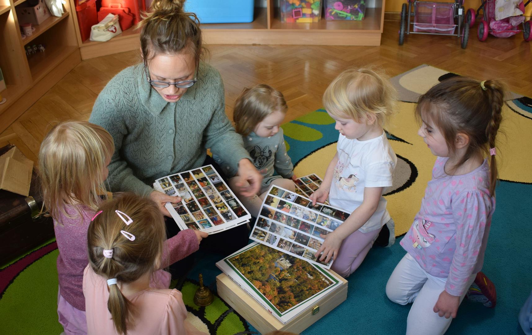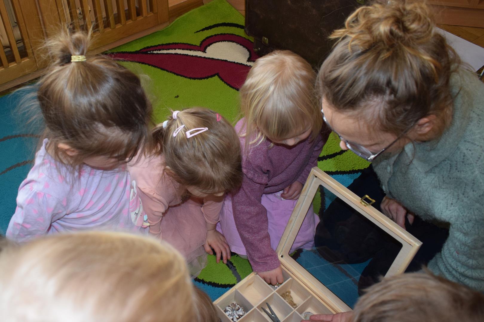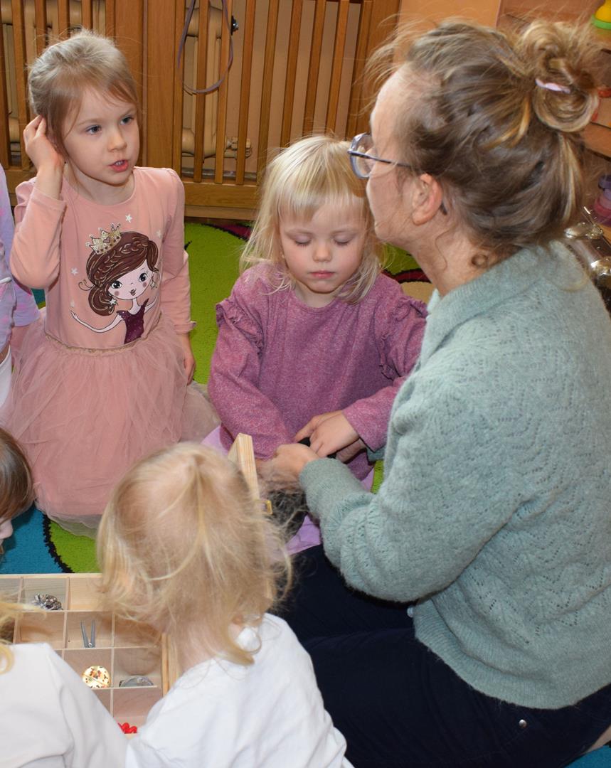 W grupie Delfinki gościliśmy Panią Agatę – mamę Jadzi, która w przystępny sposób opowiedziała dzieciom o muzeum. Pani Agata przyniosła ze sobą ogromną walizkę wypełnioną różnymi skarbami, które stopniowo pokazywała. Na początku wyjęła ilustracje różnych eksponatów muzealnych, skrywających swoją historię, które dzieci wnikliwie oglądały i próbowały nazywać. Z książki „Pieniek otwiera muzeum” autorstwa norweskiej pisarki i ilustratorki Åshild Kanstad Johnsen przedszkolaki poznały sympatycznego Pieńka, który uwielbia spacerować po lesie i kolekcjonować znalezione tam „skarby” – m.in. kamyki, szyszki, patyki i pióra. Gdy w jego leśnym domku zaczyna brakować miejsca na nowe znaleziska, za namową babci postanawia skatalogować swoje zbiory i otworzyć własne muzeum. Przedszkolaki zainspirowane Pieńkiem wspólnie stworzyły swoje muzeum w przyniesionej przez Panią Agatę skrzyni. Z tajemniczego worka losowały różne „skarby” i według ustalonego „klucza” je porządkowały. Jako, że Pani Agata zawodowo związana jest z Muzeum w Łazienkach, z wielkiej walizki wyłoniła się książka pt. „Muzeum zachwytów. Malarski przewodnik po Łazienkach Królewskich”. Ilustracje z przewodnika posłużyły do krótkiej zabawy w „bystre oczko”. Na koniec Pani Agata obdarowała dzieci zestawem naklejek do stworzenia własnego muzeum w domu, np. w zeszycie, na kartce… Bardzo dziękujemy za interesującą lekcję muzealną w przedszkolu oraz za zaproszenie do Łazienek Królewskich.