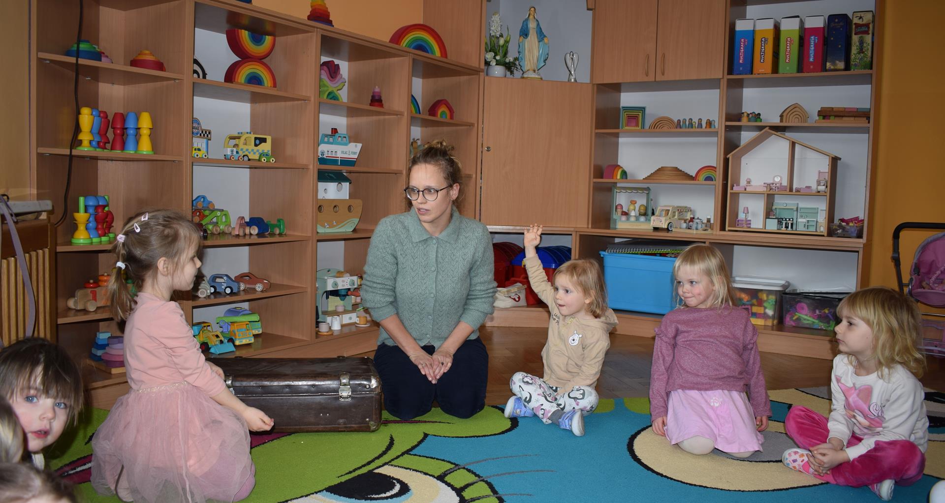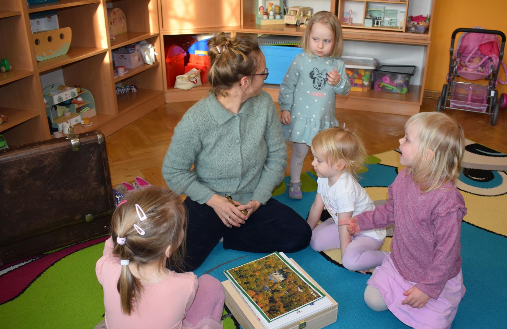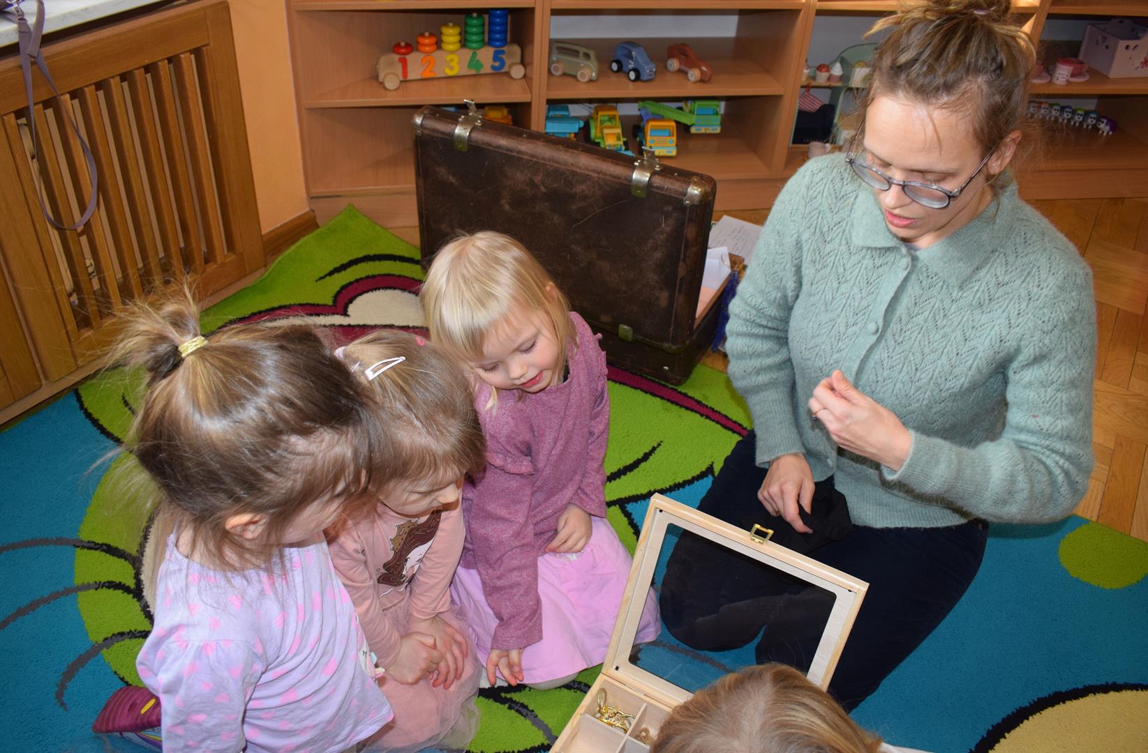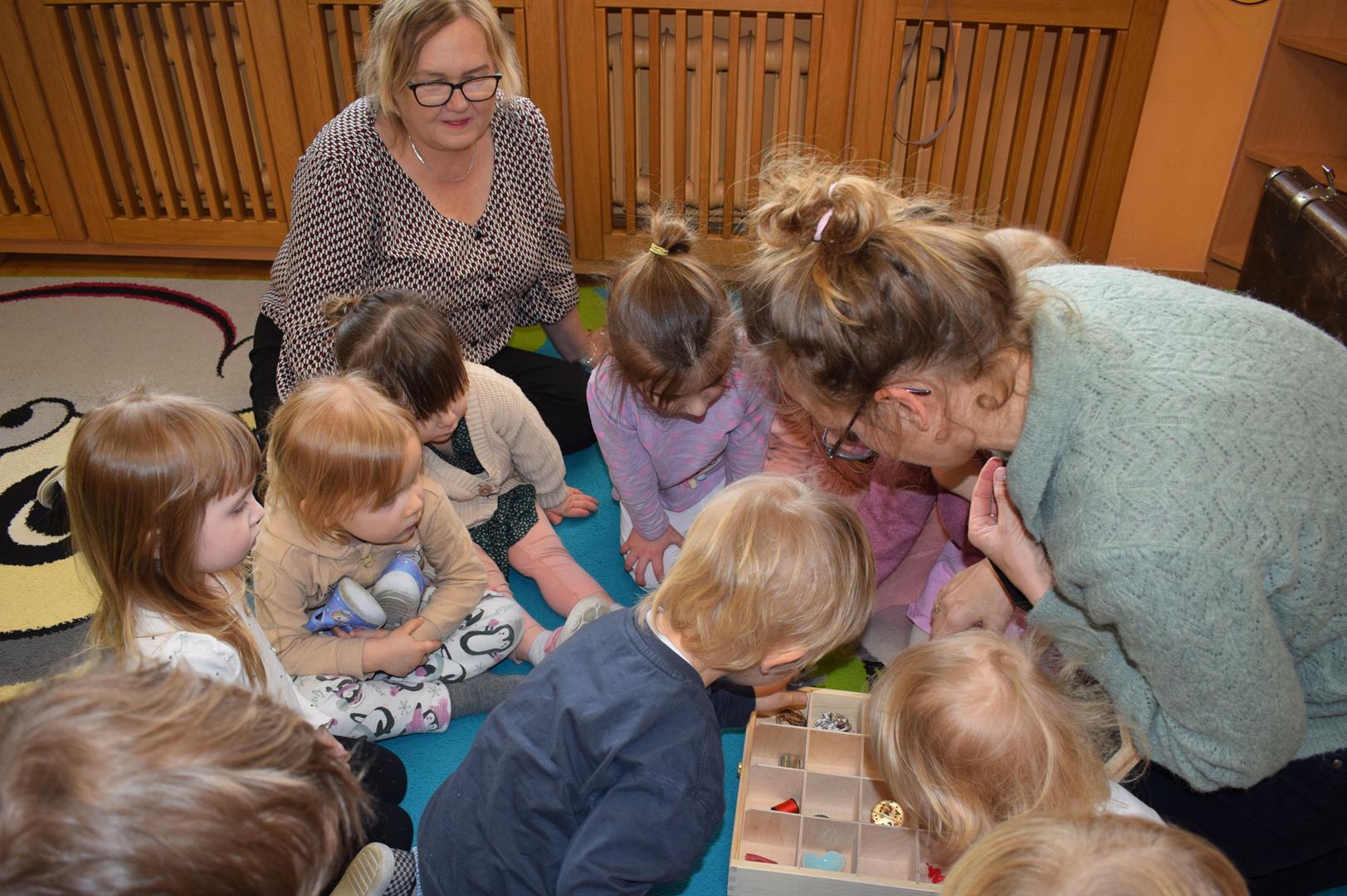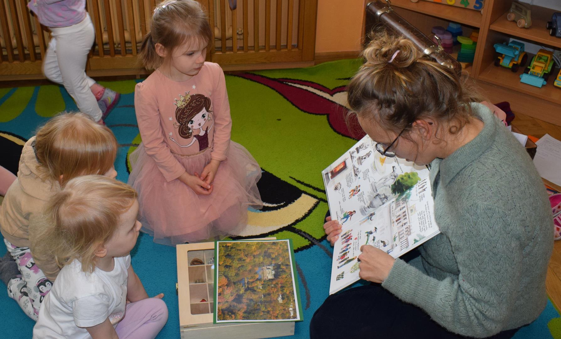 W grupie Delfinki gościliśmy Panią Agatę – mamę Jadzi, która w przystępny sposób opowiedziała dzieciom o muzeum. Pani Agata przyniosła ze sobą ogromną walizkę wypełnioną różnymi skarbami, które stopniowo pokazywała. Na początku wyjęła ilustracje różnych eksponatów muzealnych, skrywających swoją historię, które dzieci wnikliwie oglądały i próbowały nazywać. Z książki „Pieniek otwiera muzeum” autorstwa norweskiej pisarki i ilustratorki Åshild Kanstad Johnsen przedszkolaki poznały sympatycznego Pieńka, który uwielbia spacerować po lesie i kolekcjonować znalezione tam „skarby” – m.in. kamyki, szyszki, patyki i pióra. Gdy w jego leśnym domku zaczyna brakować miejsca na nowe znaleziska, za namową babci postanawia skatalogować swoje zbiory i otworzyć własne muzeum. Przedszkolaki zainspirowane Pieńkiem wspólnie stworzyły swoje muzeum w przyniesionej przez Panią Agatę skrzyni. Z tajemniczego worka losowały różne „skarby” i według ustalonego „klucza” je porządkowały. Jako, że Pani Agata zawodowo związana jest z Muzeum w Łazienkach, z wielkiej walizki wyłoniła się książka pt. „Muzeum zachwytów. Malarski przewodnik po Łazienkach Królewskich”. Ilustracje z przewodnika posłużyły do krótkiej zabawy w „bystre oczko”. Na koniec Pani Agata obdarowała dzieci zestawem naklejek do stworzenia własnego muzeum w domu, np. w zeszycie, na kartce… Bardzo dziękujemy za interesującą lekcję muzealną w przedszkolu oraz za zaproszenie do Łazienek Królewskich.