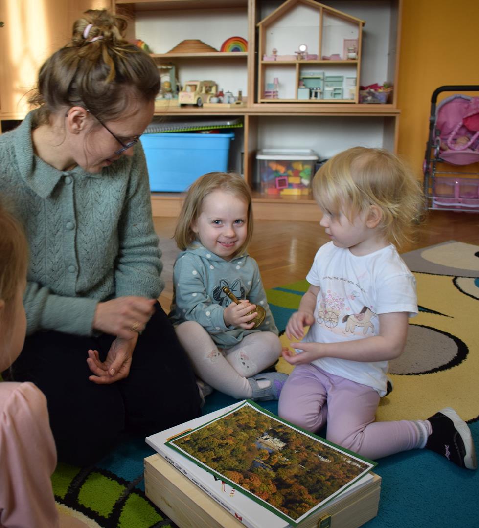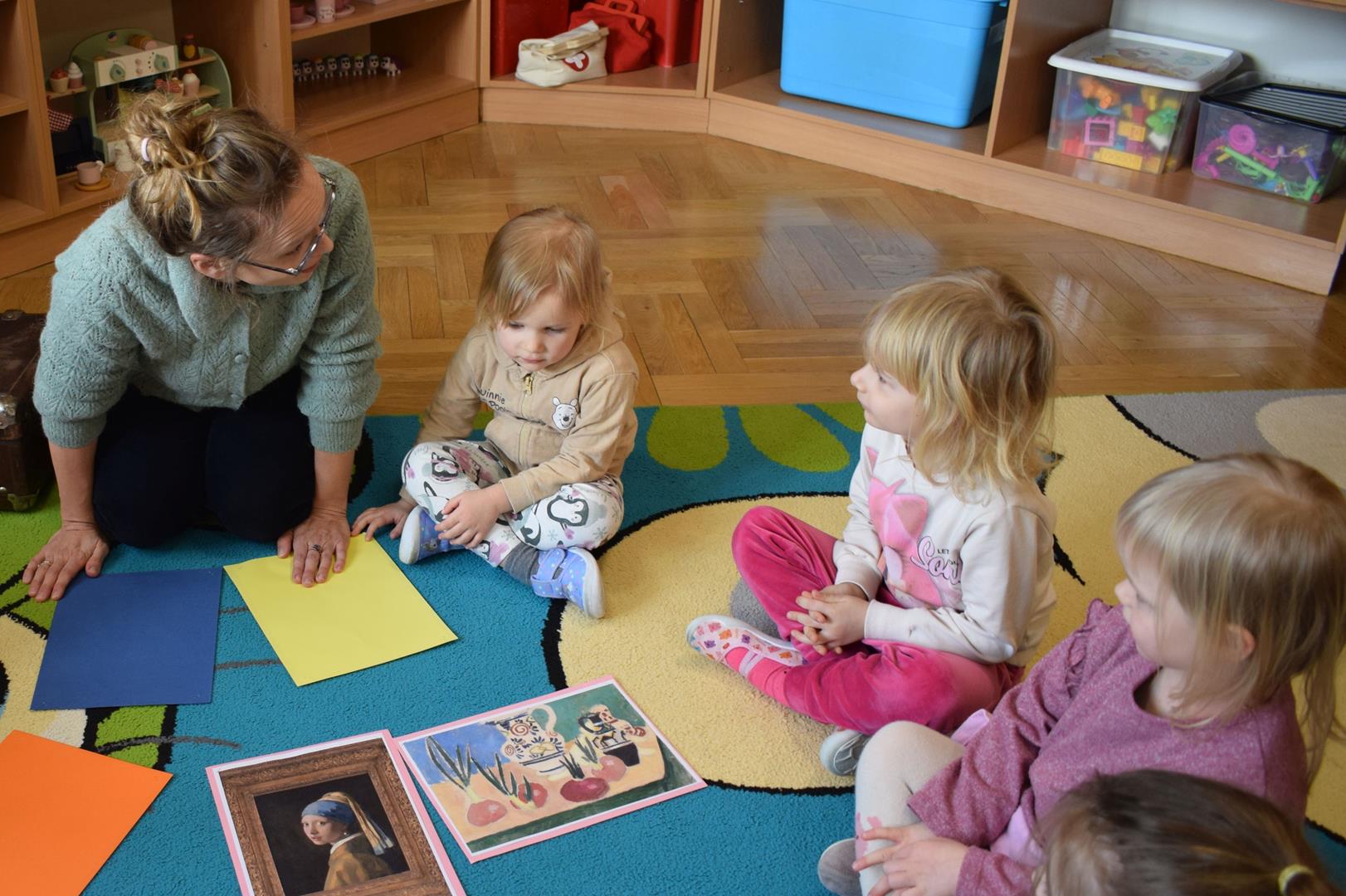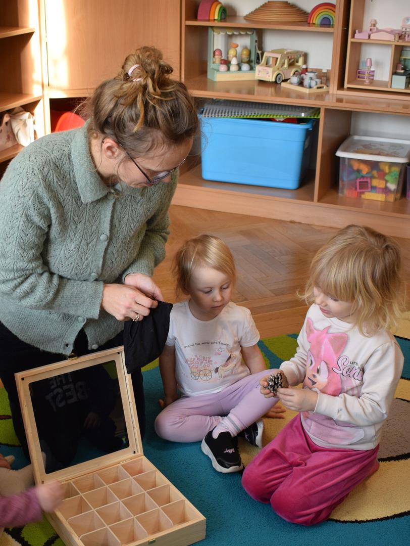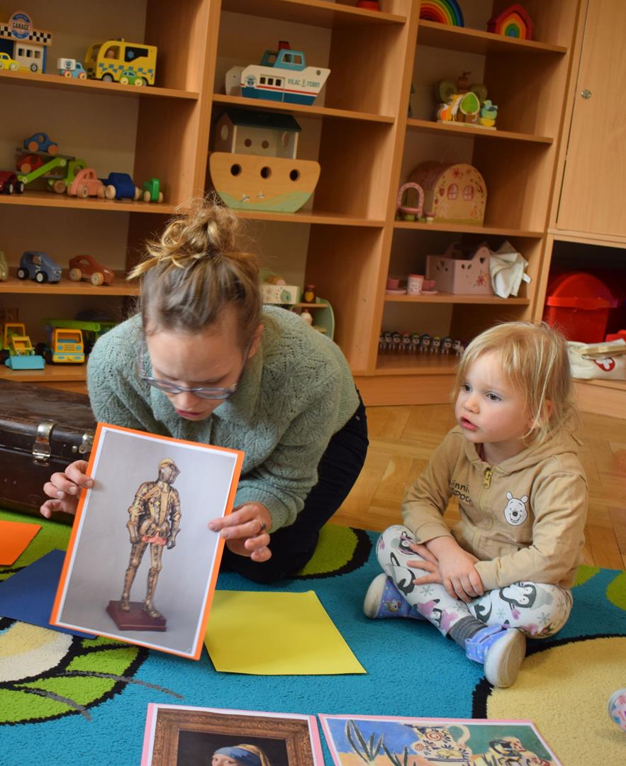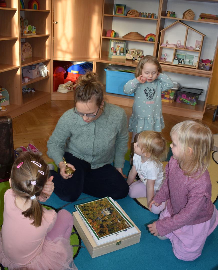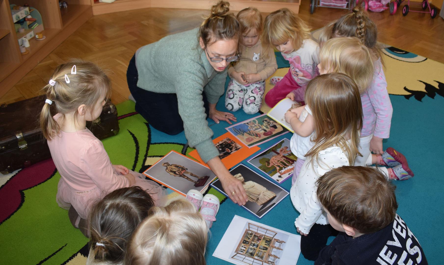 W grupie Delfinki gościliśmy Panią Agatę – mamę Jadzi, która w przystępny sposób opowiedziała dzieciom o muzeum. Pani Agata przyniosła ze sobą ogromną walizkę wypełnioną różnymi skarbami, które stopniowo pokazywała. Na początku wyjęła ilustracje różnych eksponatów muzealnych, skrywających swoją historię, które dzieci wnikliwie oglądały i próbowały nazywać. Z książki „Pieniek otwiera muzeum” autorstwa norweskiej pisarki i ilustratorki Åshild Kanstad Johnsen przedszkolaki poznały sympatycznego Pieńka, który uwielbia spacerować po lesie i kolekcjonować znalezione tam „skarby” – m.in. kamyki, szyszki, patyki i pióra. Gdy w jego leśnym domku zaczyna brakować miejsca na nowe znaleziska, za namową babci postanawia skatalogować swoje zbiory i otworzyć własne muzeum. Przedszkolaki zainspirowane Pieńkiem wspólnie stworzyły swoje muzeum w przyniesionej przez Panią Agatę skrzyni. Z tajemniczego worka losowały różne „skarby” i według ustalonego „klucza” je porządkowały. Jako, że Pani Agata zawodowo związana jest z Muzeum w Łazienkach, z wielkiej walizki wyłoniła się książka pt. „Muzeum zachwytów. Malarski przewodnik po Łazienkach Królewskich”. Ilustracje z przewodnika posłużyły do krótkiej zabawy w „bystre oczko”. Na koniec Pani Agata obdarowała dzieci zestawem naklejek do stworzenia własnego muzeum w domu, np. w zeszycie, na kartce… Bardzo dziękujemy za interesującą lekcję muzealną w przedszkolu oraz za zaproszenie do Łazienek Królewskich.