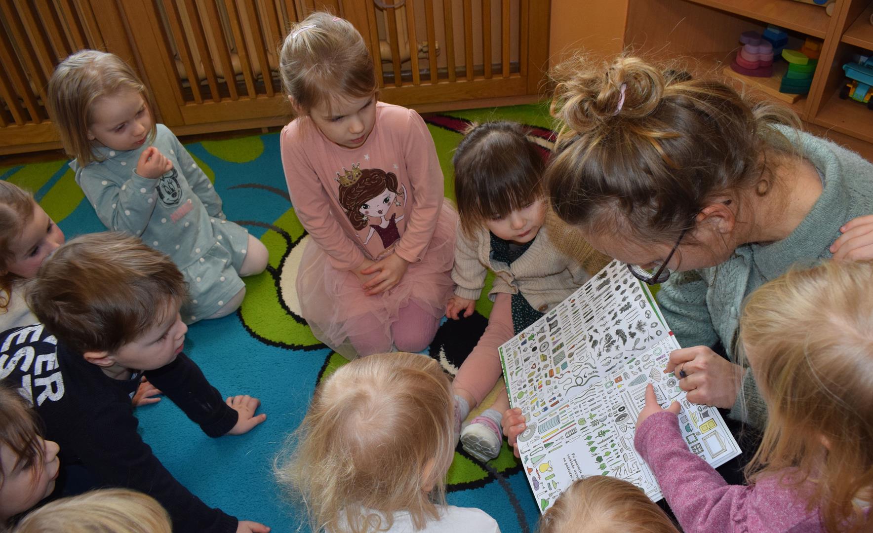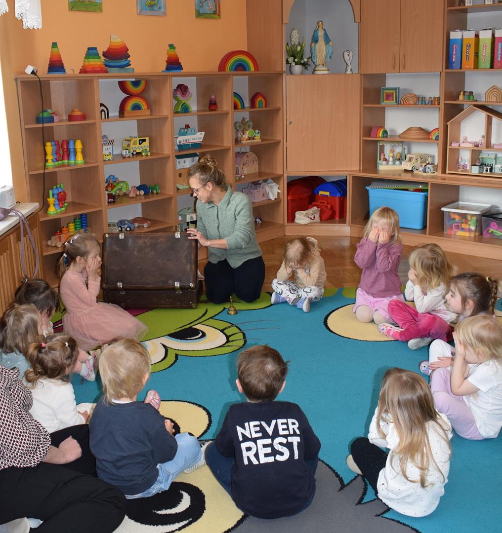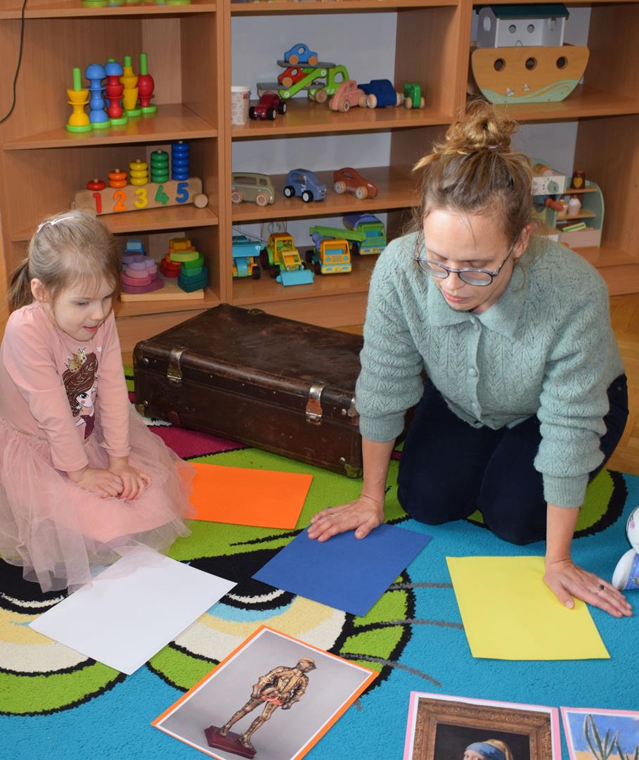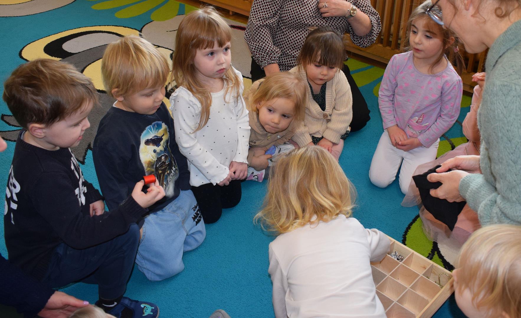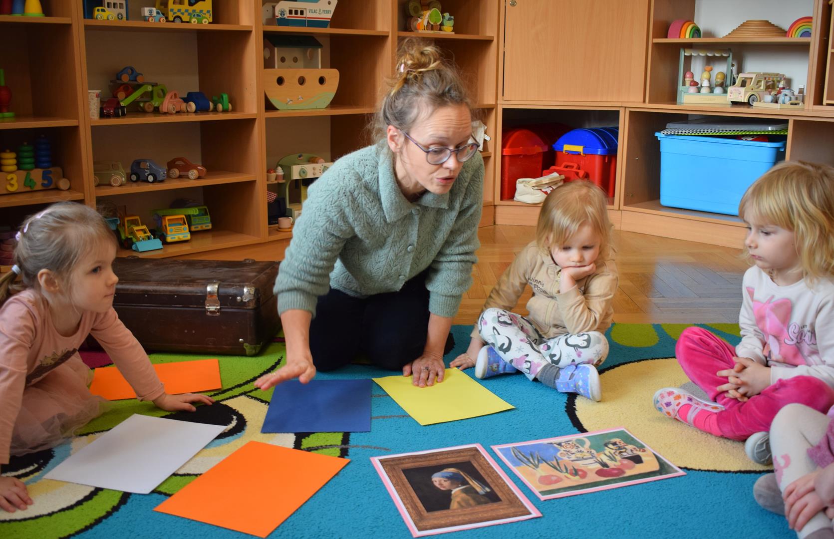 W grupie Delfinki gościliśmy Panią Agatę – mamę Jadzi, która w przystępny sposób opowiedziała dzieciom o muzeum. Pani Agata przyniosła ze sobą ogromną walizkę wypełnioną różnymi skarbami, które stopniowo pokazywała. Na początku wyjęła ilustracje różnych eksponatów muzealnych, skrywających swoją historię, które dzieci wnikliwie oglądały i próbowały nazywać. Z książki „Pieniek otwiera muzeum” autorstwa norweskiej pisarki i ilustratorki Åshild Kanstad Johnsen przedszkolaki poznały sympatycznego Pieńka, który uwielbia spacerować po lesie i kolekcjonować znalezione tam „skarby” – m.in. kamyki, szyszki, patyki i pióra. Gdy w jego leśnym domku zaczyna brakować miejsca na nowe znaleziska, za namową babci postanawia skatalogować swoje zbiory i otworzyć własne muzeum. Przedszkolaki zainspirowane Pieńkiem wspólnie stworzyły swoje muzeum w przyniesionej przez Panią Agatę skrzyni. Z tajemniczego worka losowały różne „skarby” i według ustalonego „klucza” je porządkowały. Jako, że Pani Agata zawodowo związana jest z Muzeum w Łazienkach, z wielkiej walizki wyłoniła się książka pt. „Muzeum zachwytów. Malarski przewodnik po Łazienkach Królewskich”. Ilustracje z przewodnika posłużyły do krótkiej zabawy w „bystre oczko”. Na koniec Pani Agata obdarowała dzieci zestawem naklejek do stworzenia własnego muzeum w domu, np. w zeszycie, na kartce… Bardzo dziękujemy za interesującą lekcję muzealną w przedszkolu oraz za zaproszenie do Łazienek Królewskich.