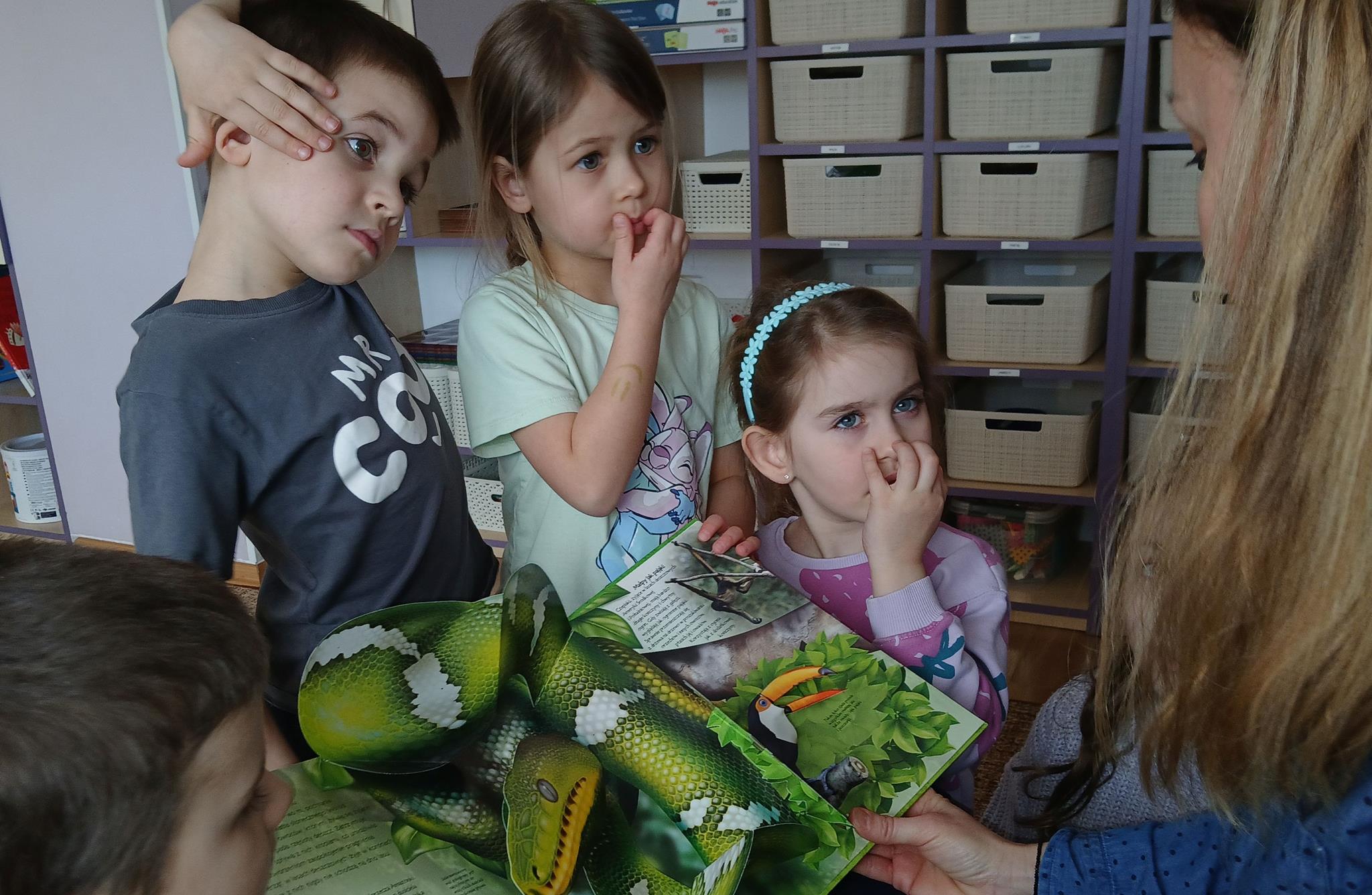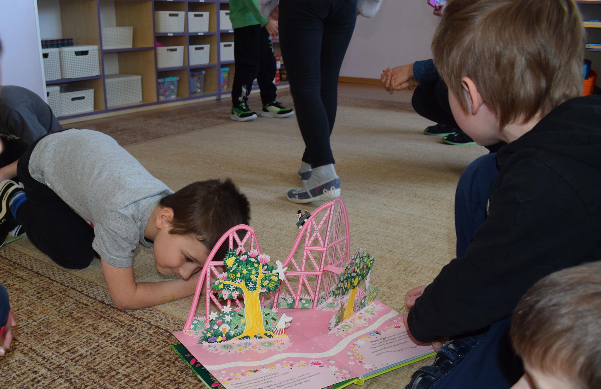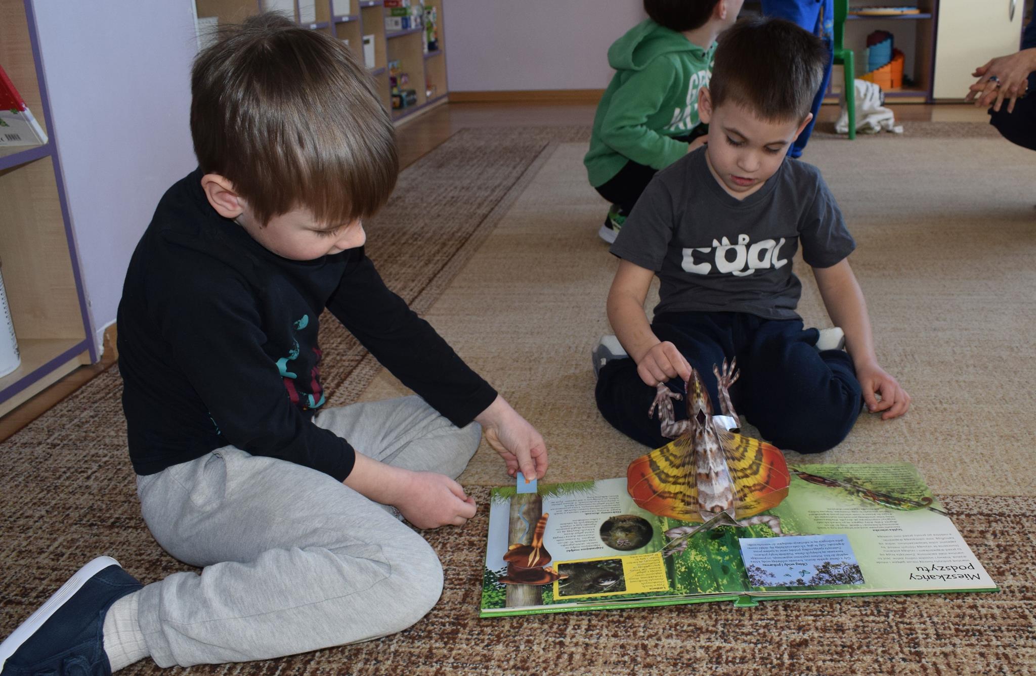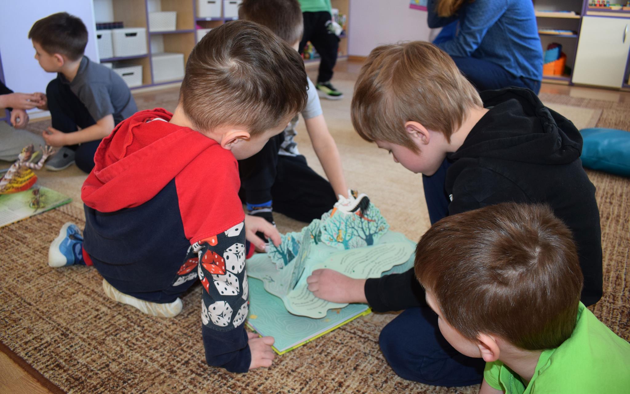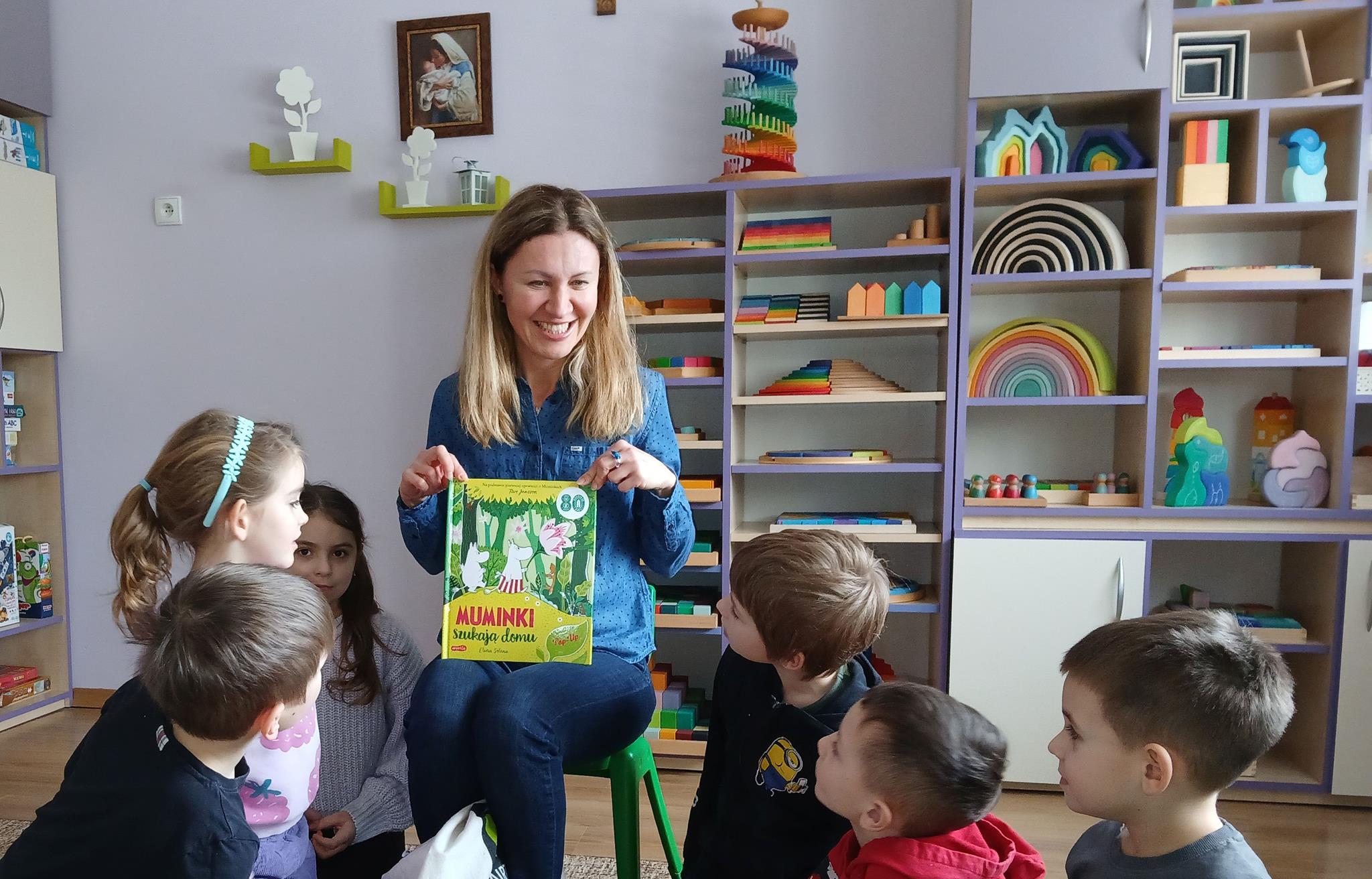 W ramach programu Rodzice Dzieciom gościliśmy w grupie Sówek mamę Iwa – panią Karinę. Pani Karina przygotowała dla dzieci wiele niespodzianek czytelniczych. Najpierw dzięki książce Tove’a Janssona pt. „Muminki szukają domu” z trójwymiarowymi obrazkami przenieśliśmy się do krainy Muminków. Następnie „odbyliśmy podróż” po wszystkich kontynentach poszerzając wiedzę o zwierzętach egzotycznych. Całość dopełniały kolorowe i autentyczne modele zwierząt zamieszczone w książce pt. „Tajemnice natury – przyroda w 3D”. Stworzyło to naszym przedszkolakom okazję do wymiany informacji o bogactwie świata przyrody i zdobycia nowej wiedzy. Na zakończenie mama Iwa przeczytała kilka wierszyków dla dzieci, które wywołały dużo radości. Bardzo dziękujemy za interesujące i pełne emocji spotkanie.