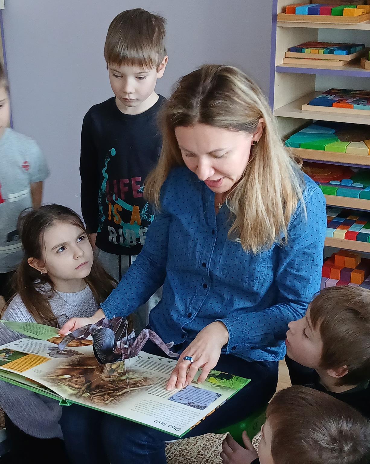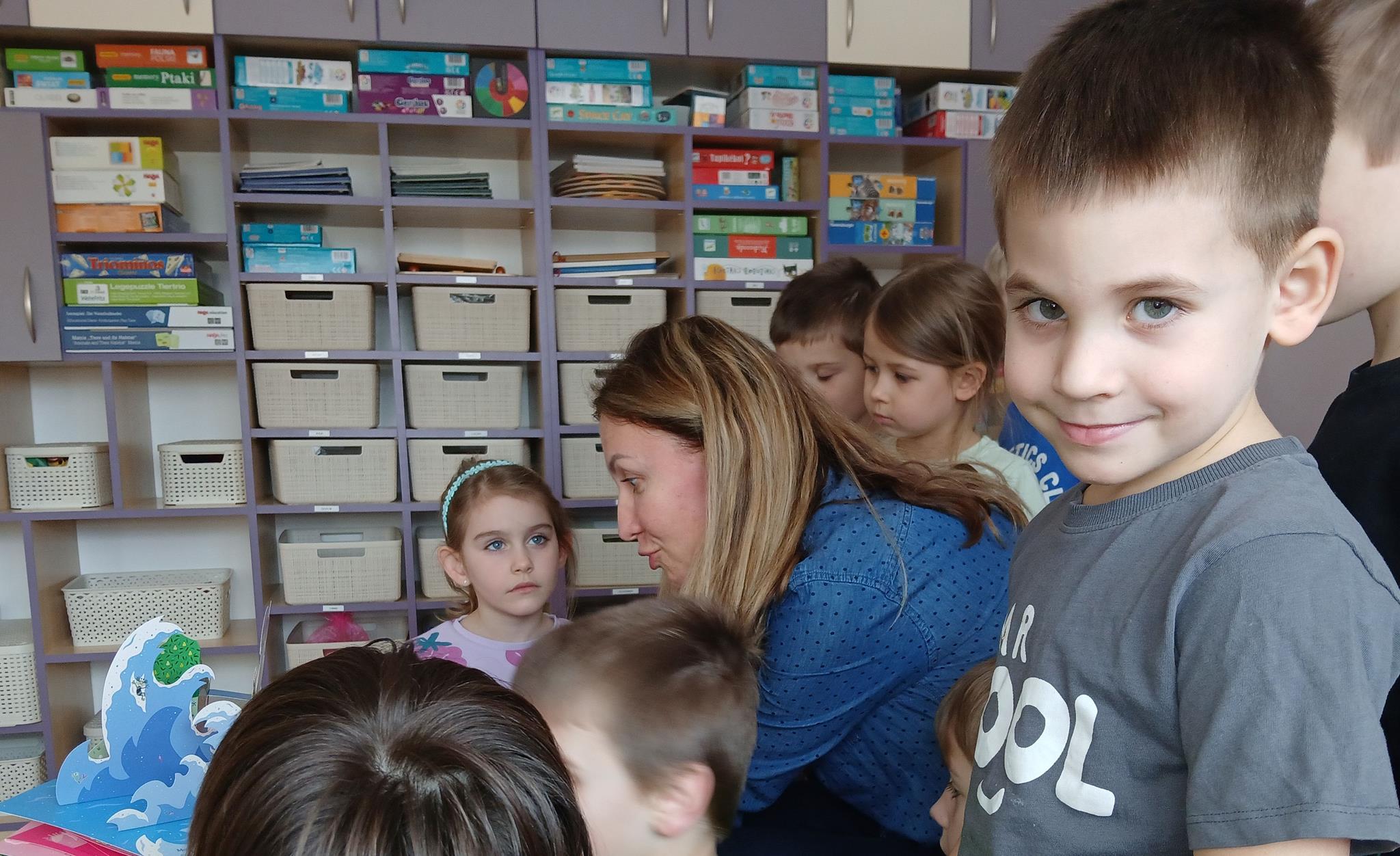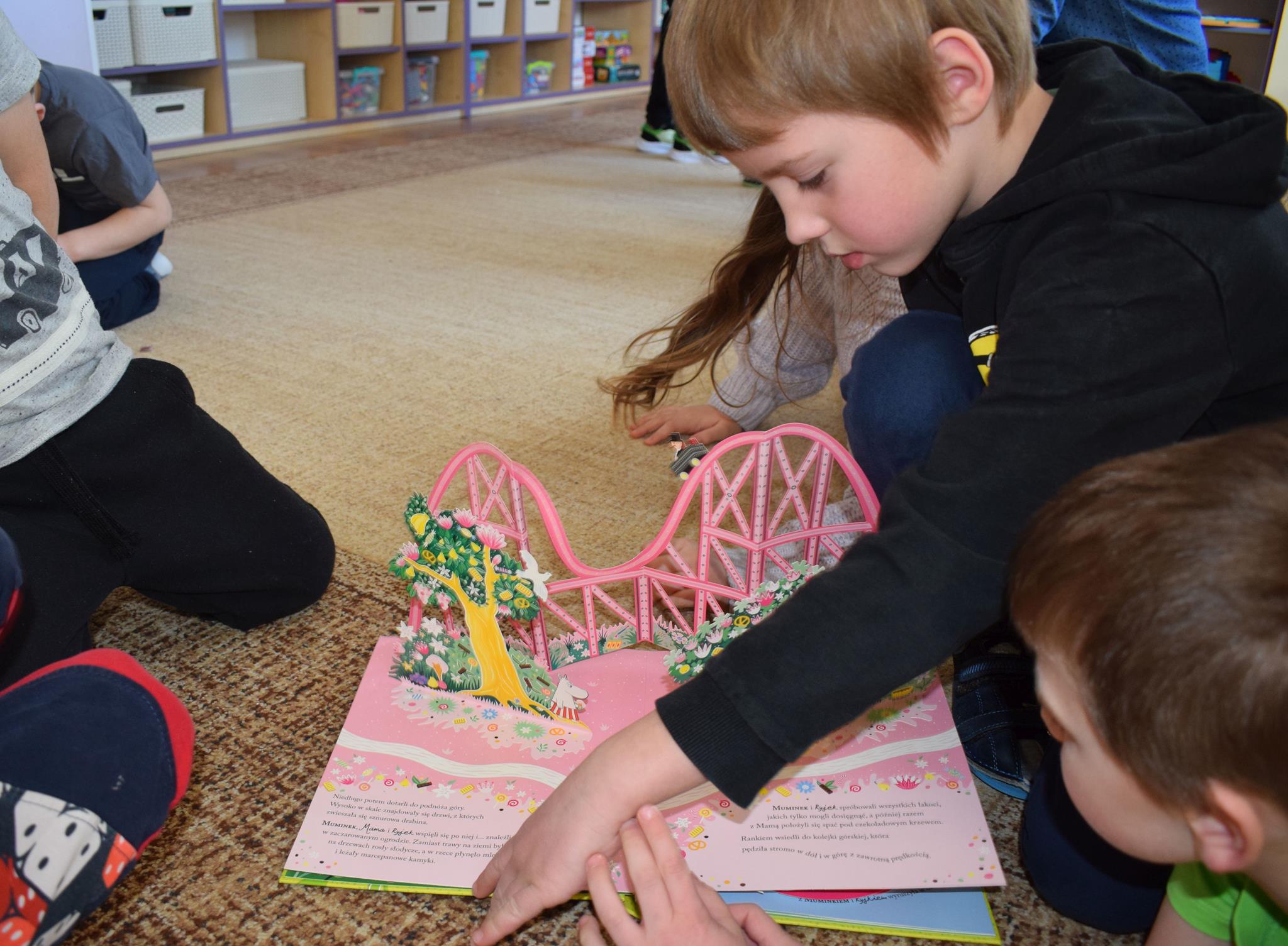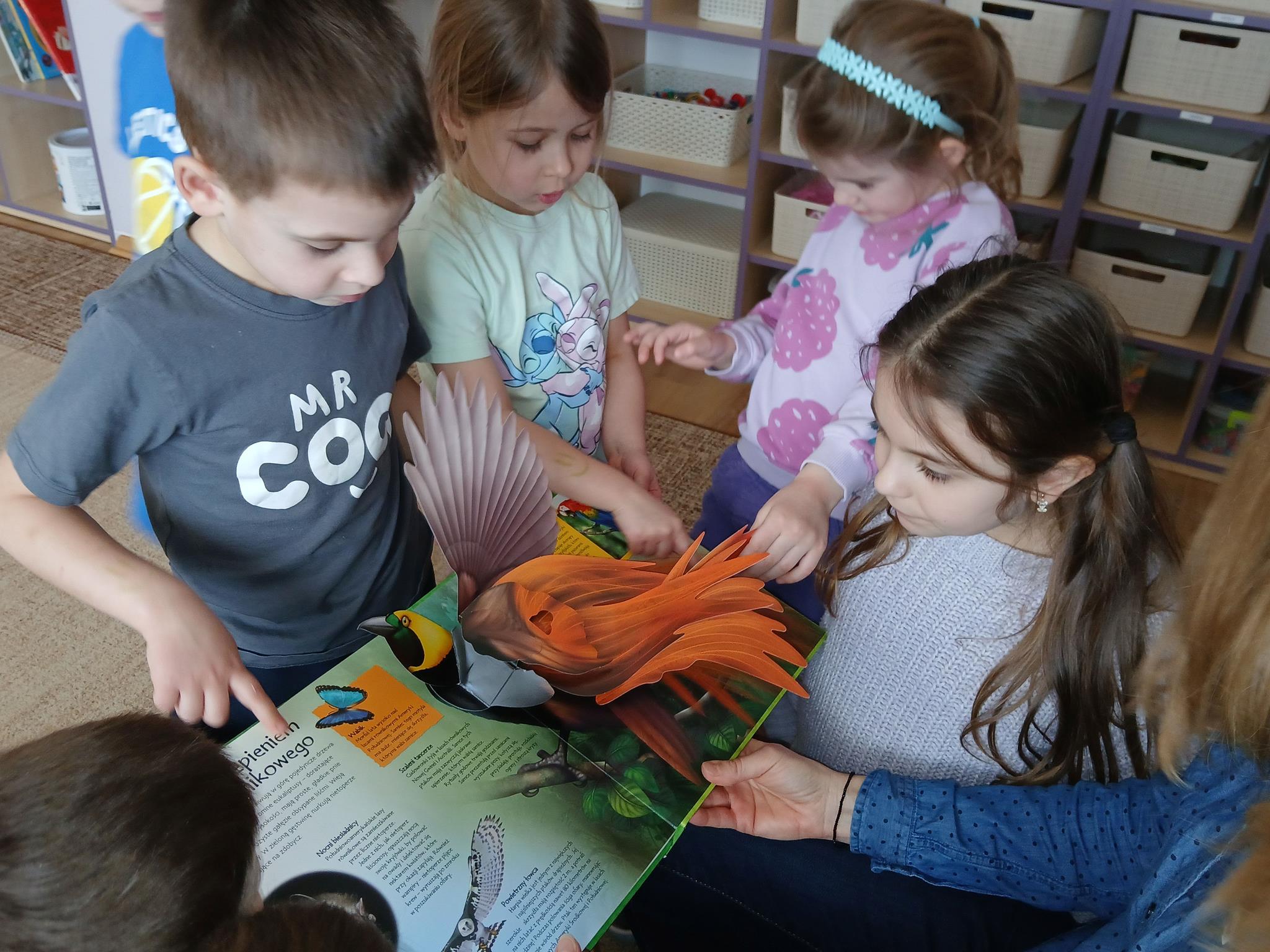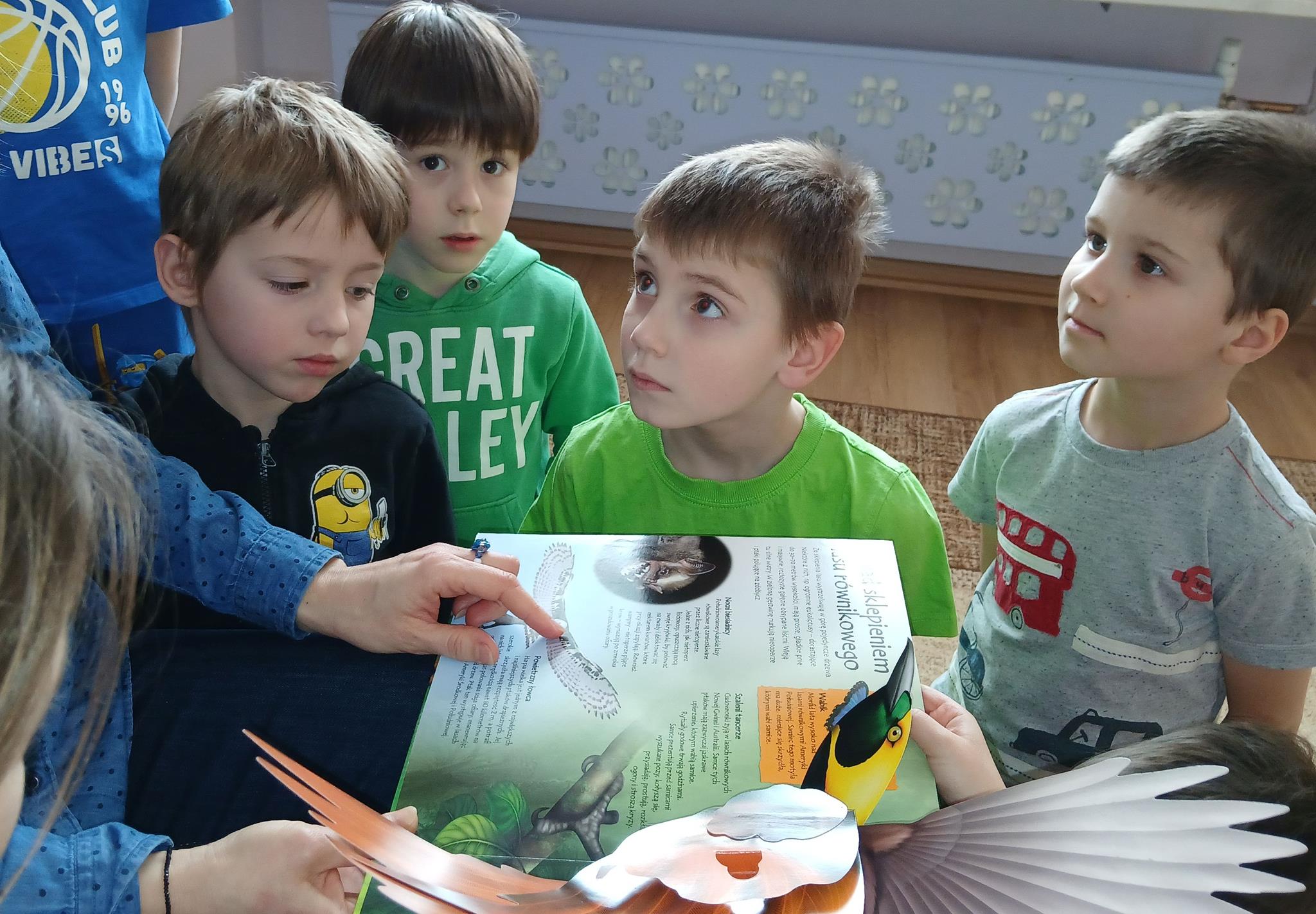 W ramach programu Rodzice Dzieciom gościliśmy w grupie Sówek mamę Iwa – panią Karinę. Pani Karina przygotowała dla dzieci wiele niespodzianek czytelniczych. Najpierw dzięki książce Tove’a Janssona pt. „Muminki szukają domu” z trójwymiarowymi obrazkami przenieśliśmy się do krainy Muminków. Następnie „odbyliśmy podróż” po wszystkich kontynentach poszerzając wiedzę o zwierzętach egzotycznych. Całość dopełniały kolorowe i autentyczne modele zwierząt zamieszczone w książce pt. „Tajemnice natury – przyroda w 3D”. Stworzyło to naszym przedszkolakom okazję do wymiany informacji o bogactwie świata przyrody i zdobycia nowej wiedzy. Na zakończenie mama Iwa przeczytała kilka wierszyków dla dzieci, które wywołały dużo radości. Bardzo dziękujemy za interesujące i pełne emocji spotkanie.