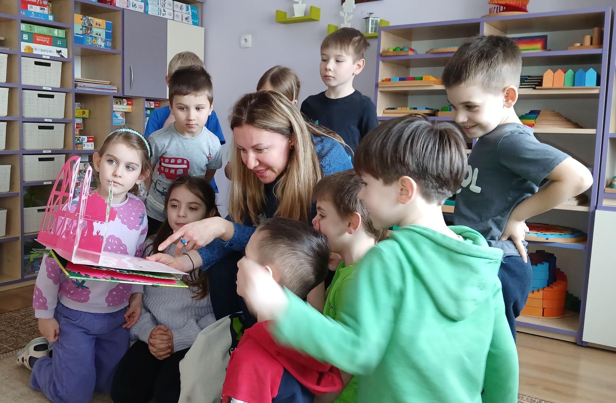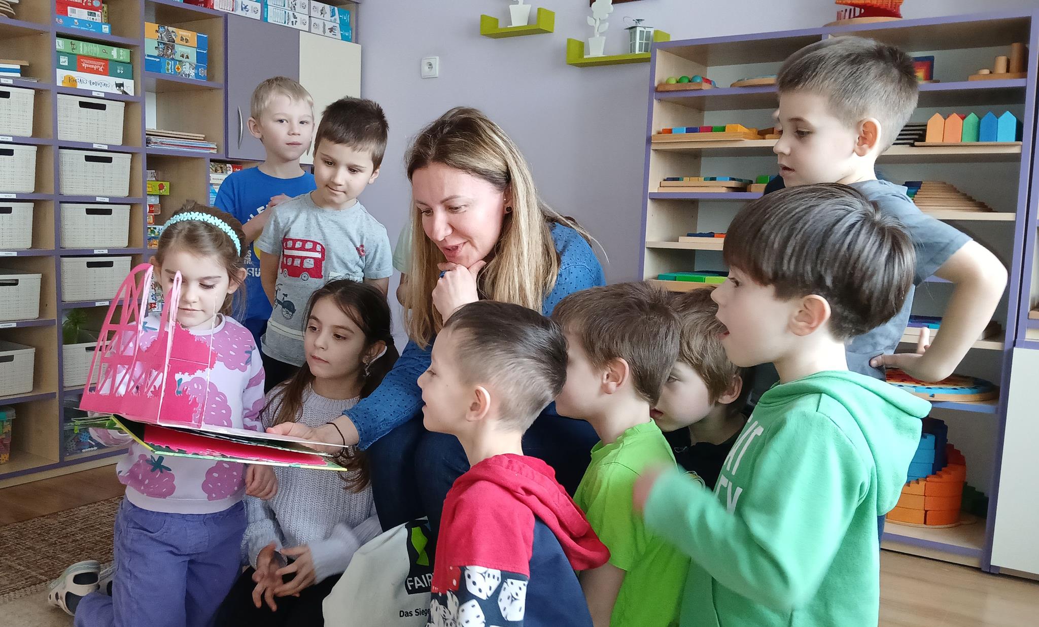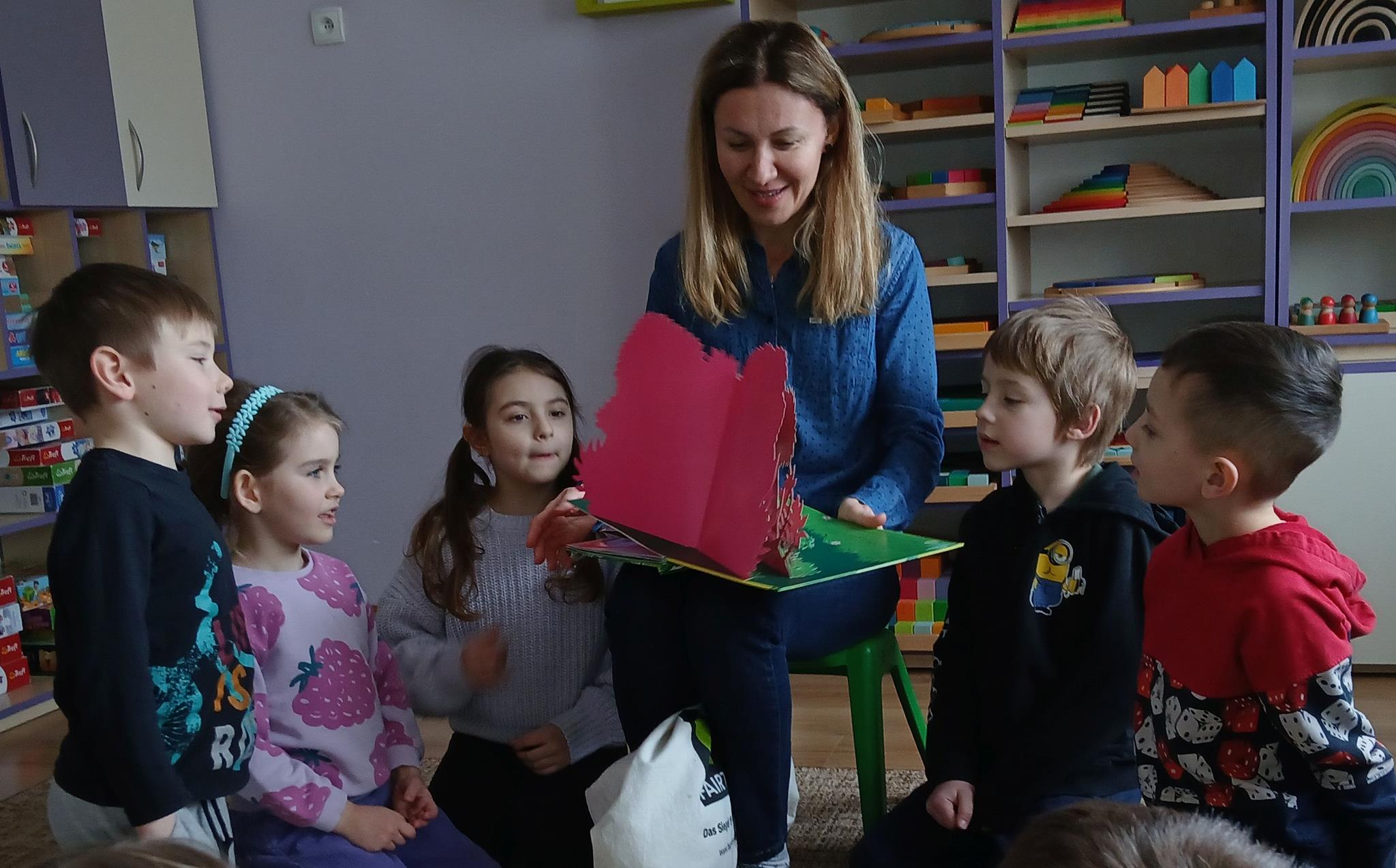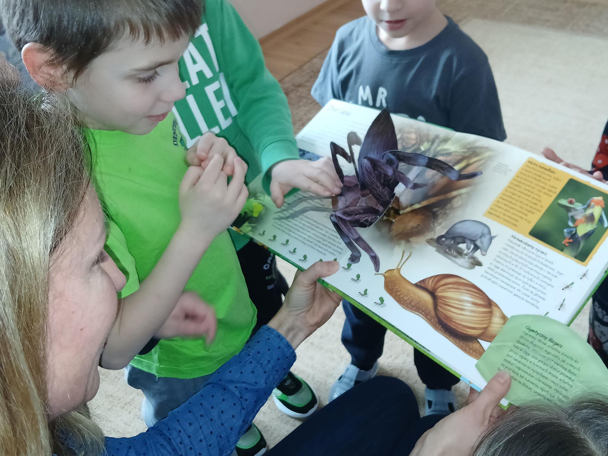 W ramach programu Rodzice Dzieciom gościliśmy w grupie Sówek mamę Iwa – panią Karinę. Pani Karina przygotowała dla dzieci wiele niespodzianek czytelniczych. Najpierw dzięki książce Tove’a Janssona pt. „Muminki szukają domu” z trójwymiarowymi obrazkami przenieśliśmy się do krainy Muminków. Następnie „odbyliśmy podróż” po wszystkich kontynentach poszerzając wiedzę o zwierzętach egzotycznych. Całość dopełniały kolorowe i autentyczne modele zwierząt zamieszczone w książce pt. „Tajemnice natury – przyroda w 3D”. Stworzyło to naszym przedszkolakom okazję do wymiany informacji o bogactwie świata przyrody i zdobycia nowej wiedzy. Na zakończenie mama Iwa przeczytała kilka wierszyków dla dzieci, które wywołały dużo radości. Bardzo dziękujemy za interesujące i pełne emocji spotkanie.