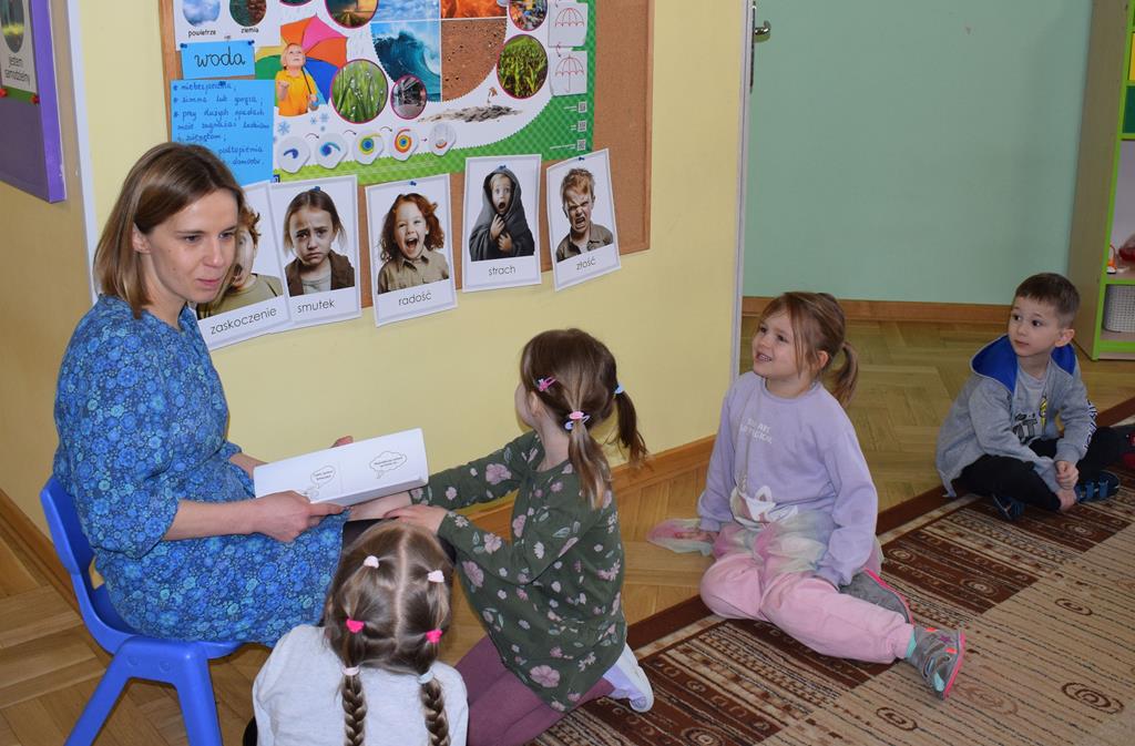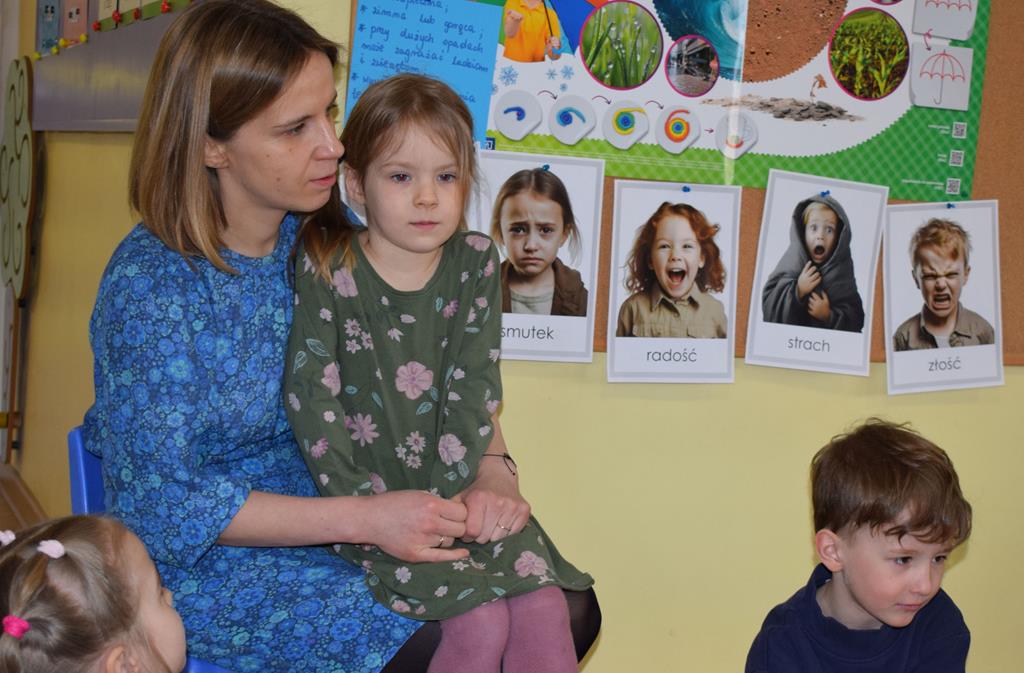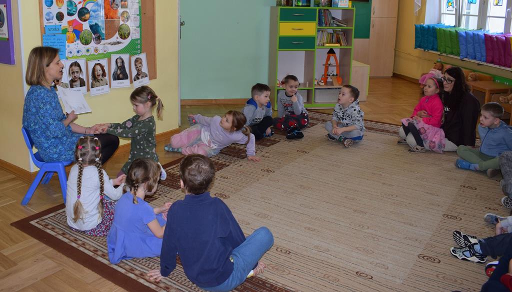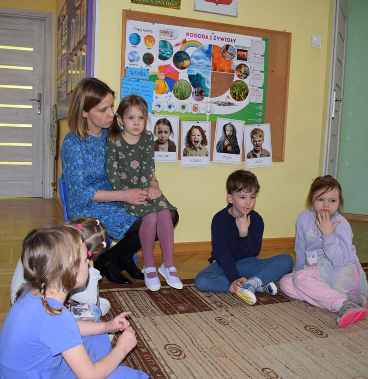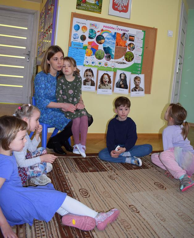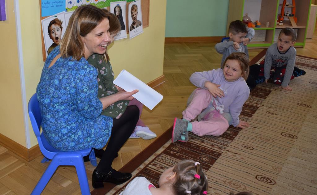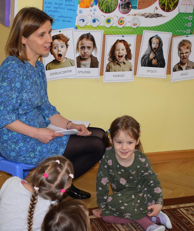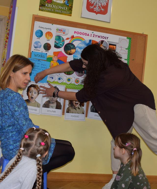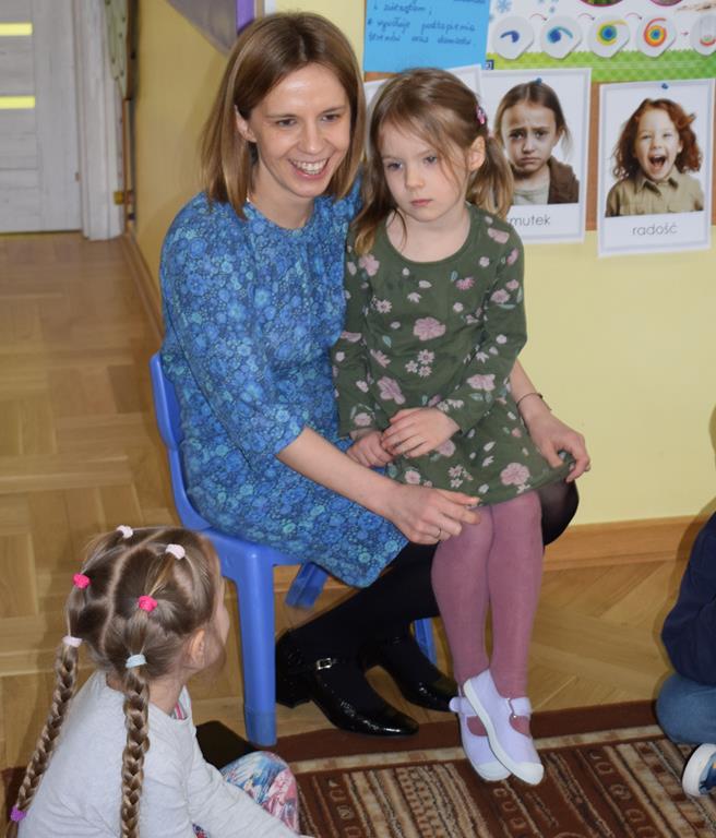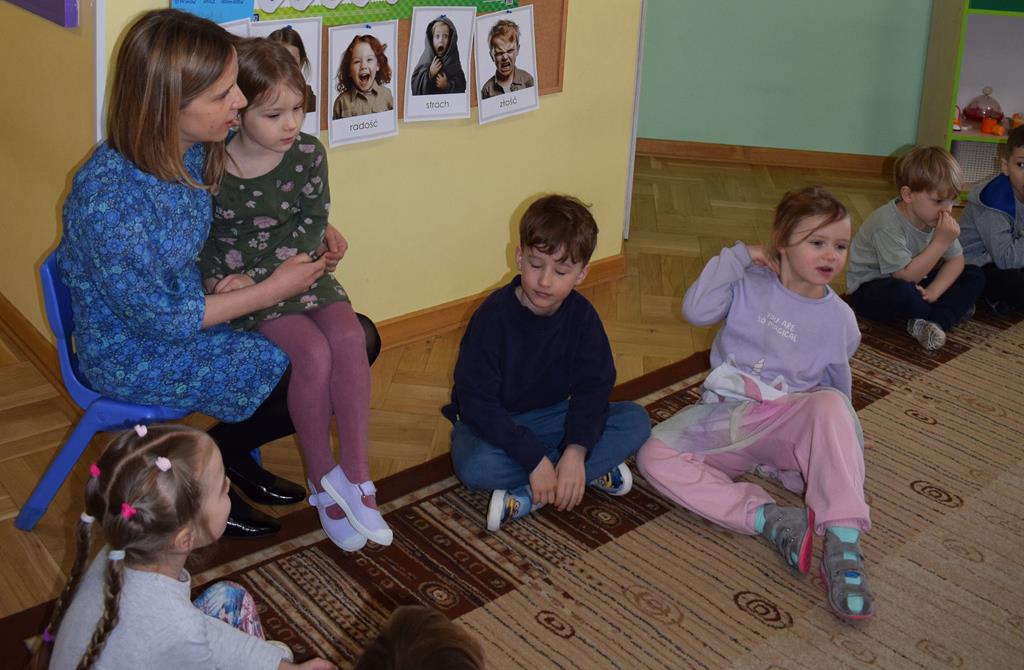 W ramach współpracy z rodzicami w gr. Motylki odbyło się spotkanie z Mamą Agatki, która z zawodu jest psychologiem. Pani Agnieszka przeprowadziła fantastyczne warsztaty o emocjach. Poprzez wspólną zabawę, zagadki i zestaw ilustracji dzieci uczyły się, jak rozpoznawać radość, smutek czy złość oraz jak radzić sobie z trudniejszymi emocjami. Odbyła się również zabawa ruchowa przy muzyce – dzieci z ogromnym entuzjazmem reagowały na zmieniające się rytmy, ucząc się rozpoznawać i wyrażać emocje poprzez taniec i gesty. Gdy muzyka była skoczna i wesoła, sala wypełniła się radosnymi podskokami, a przy wolniejszych tonach dzieci wyrażały smutek czy spokój. Było mnóstwo śmiechu, ale też chwil ważnego skupienia i empatii. Serdecznie dziękujemy mamie Agatki za poświęcony czas, kreatywność i serce włożone w przygotowanie tych zajęć.