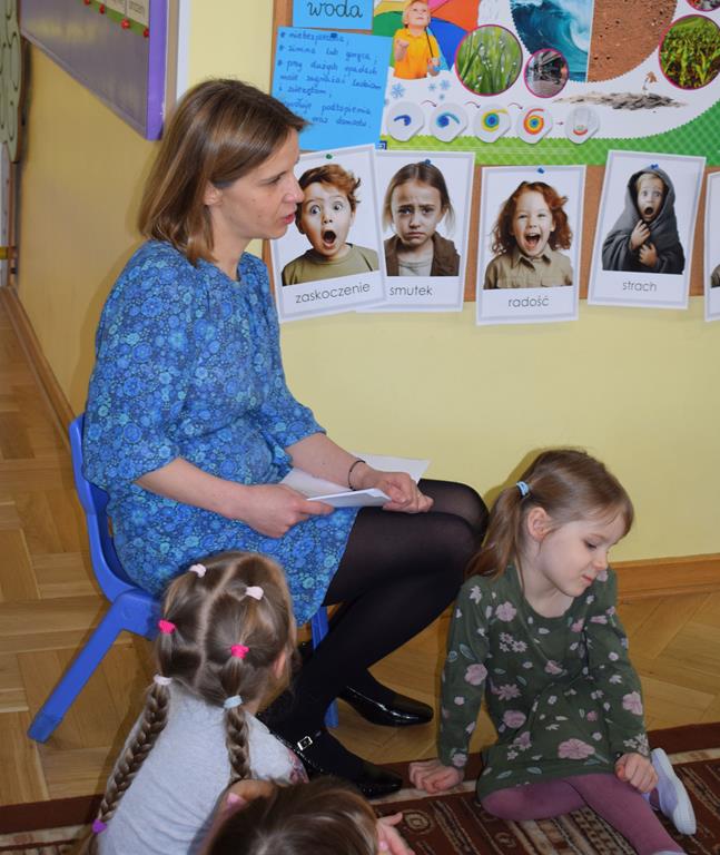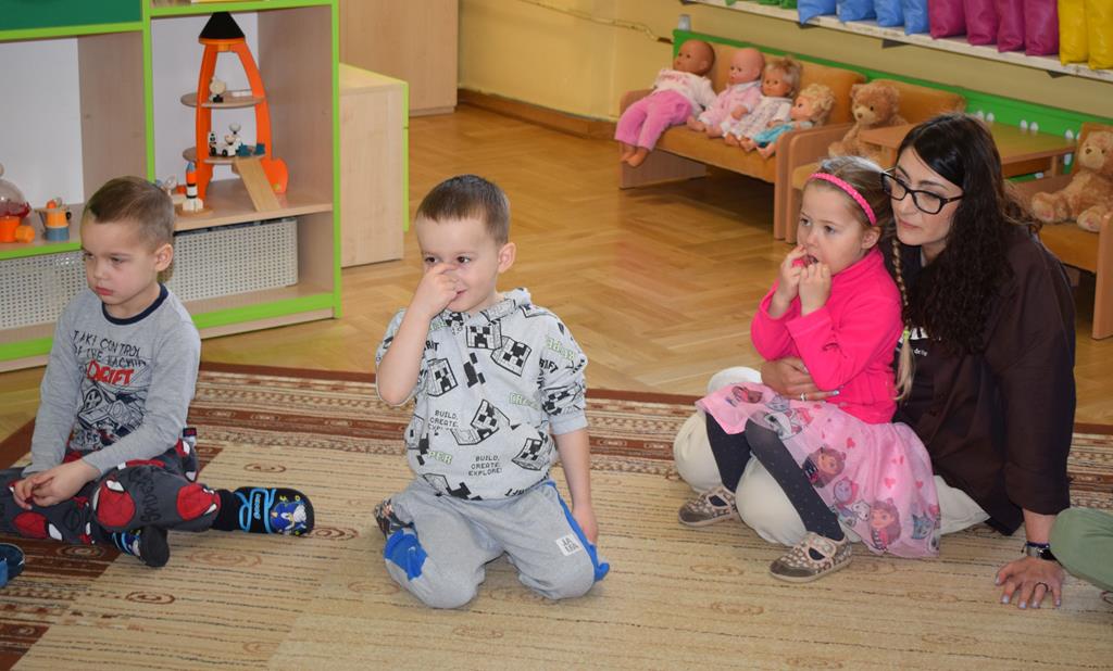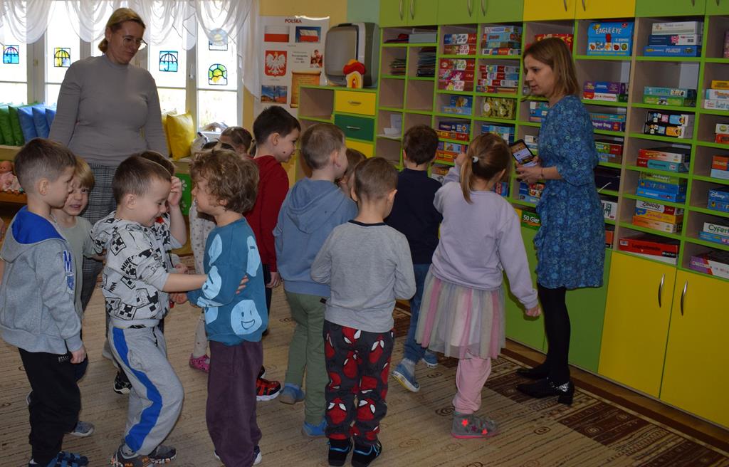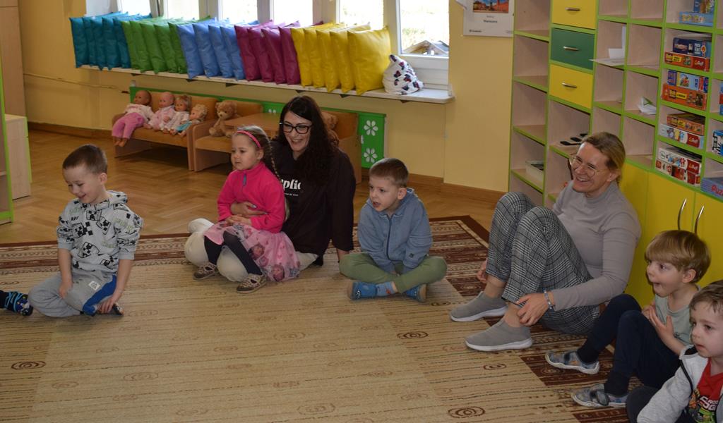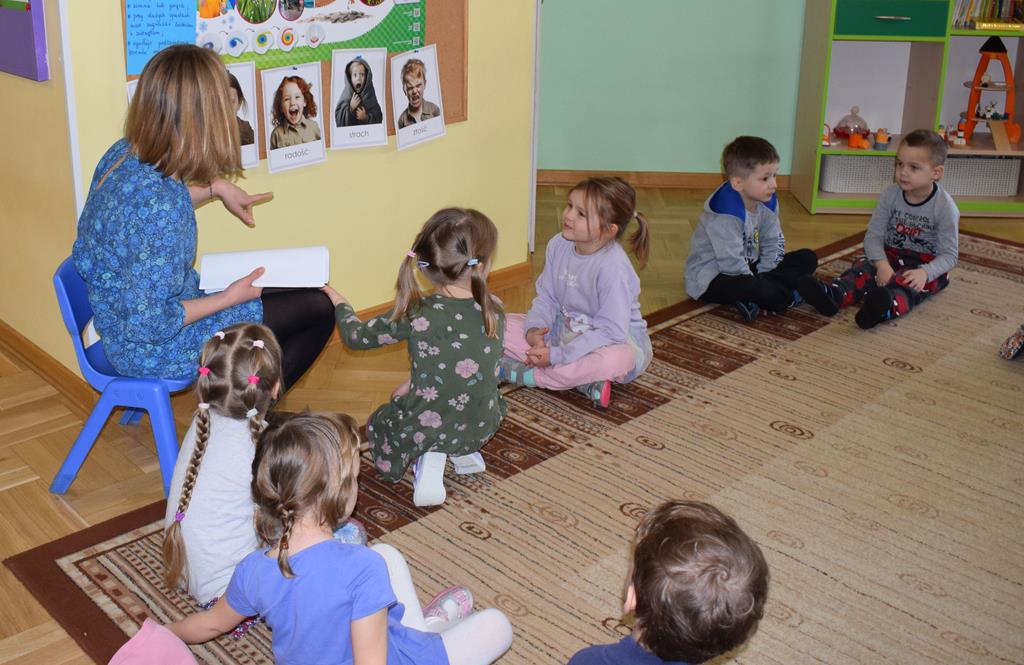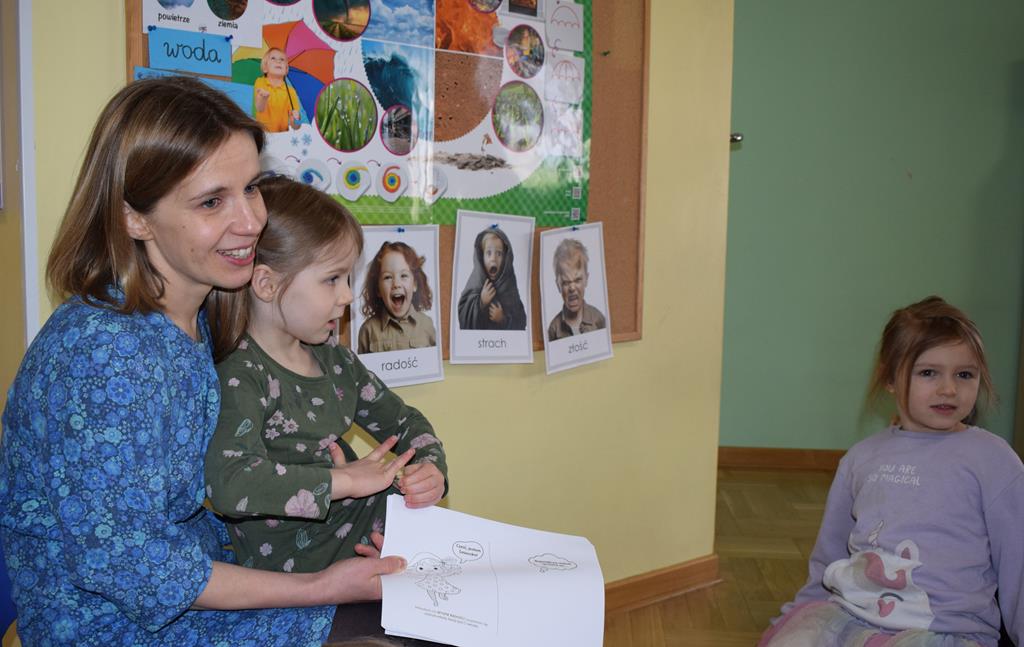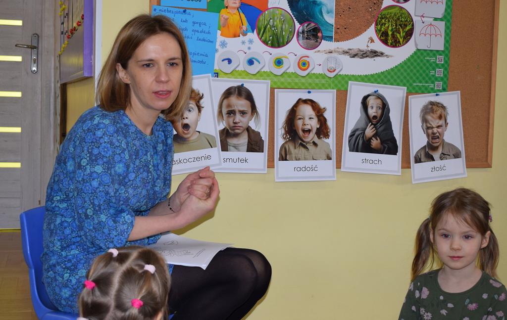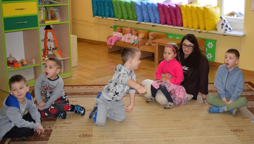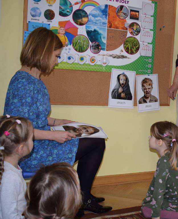 W ramach współpracy z rodzicami w gr. Motylki odbyło się spotkanie z Mamą Agatki, która z zawodu jest psychologiem. Pani Agnieszka przeprowadziła fantastyczne warsztaty o emocjach. Poprzez wspólną zabawę, zagadki i zestaw ilustracji dzieci uczyły się, jak rozpoznawać radość, smutek czy złość oraz jak radzić sobie z trudniejszymi emocjami. Odbyła się również zabawa ruchowa przy muzyce – dzieci z ogromnym entuzjazmem reagowały na zmieniające się rytmy, ucząc się rozpoznawać i wyrażać emocje poprzez taniec i gesty. Gdy muzyka była skoczna i wesoła, sala wypełniła się radosnymi podskokami, a przy wolniejszych tonach dzieci wyrażały smutek czy spokój. Było mnóstwo śmiechu, ale też chwil ważnego skupienia i empatii. Serdecznie dziękujemy mamie Agatki za poświęcony czas, kreatywność i serce włożone w przygotowanie tych zajęć.
