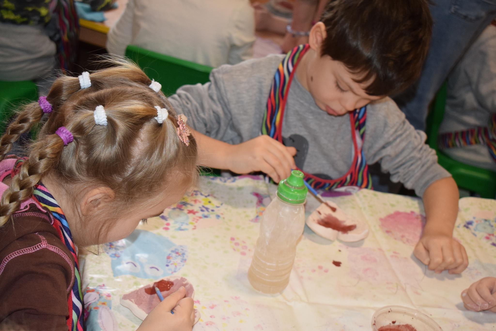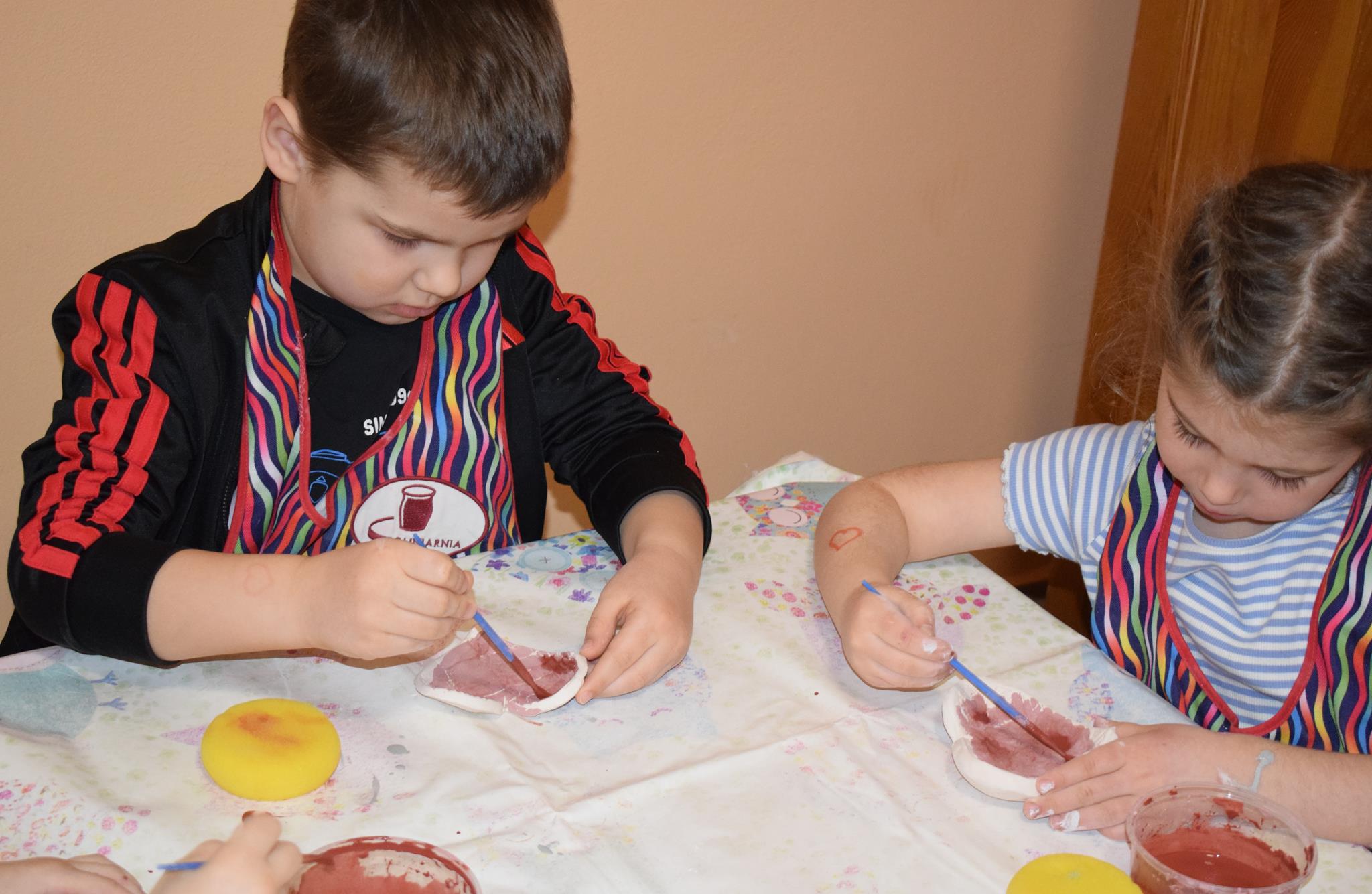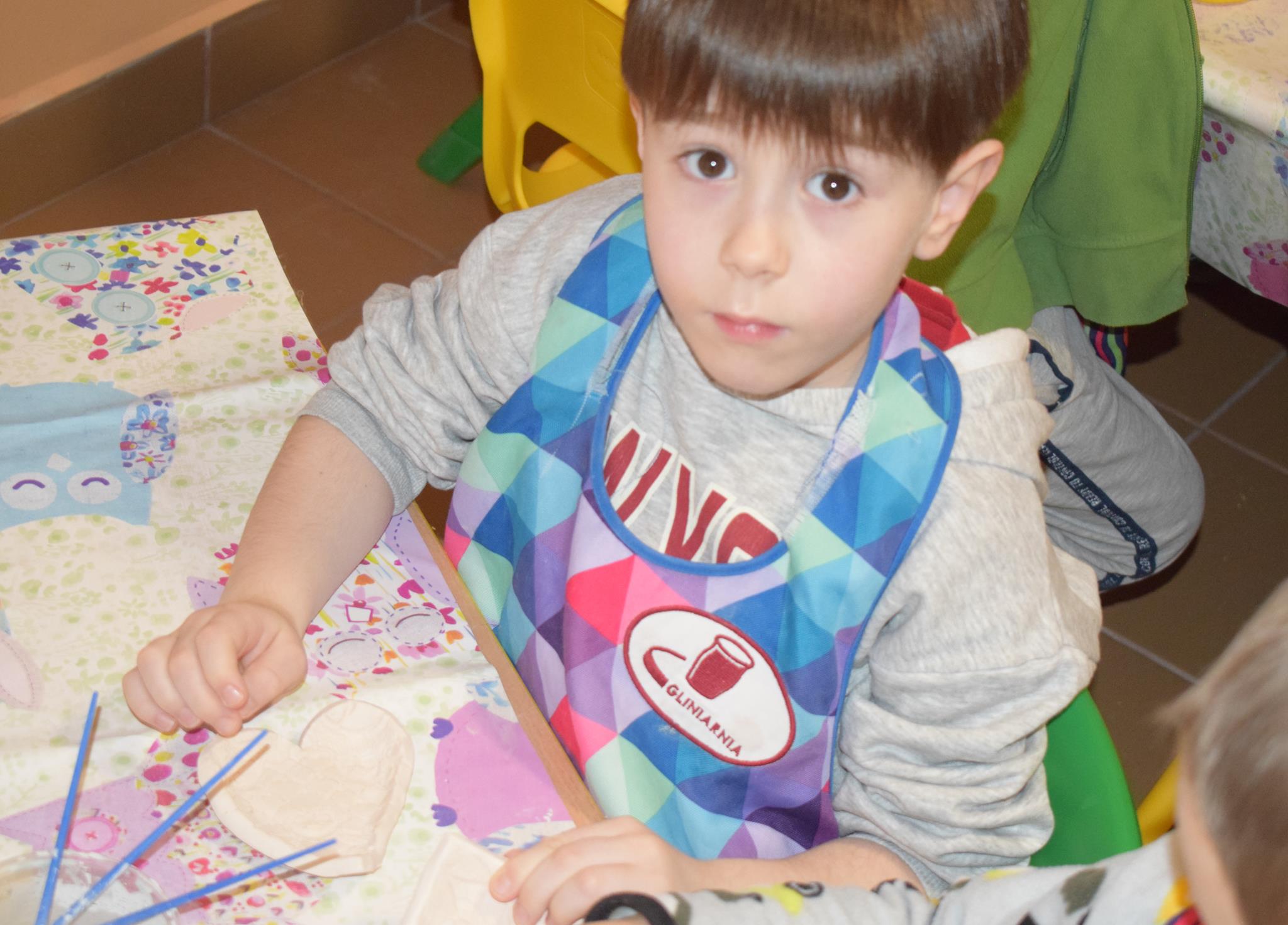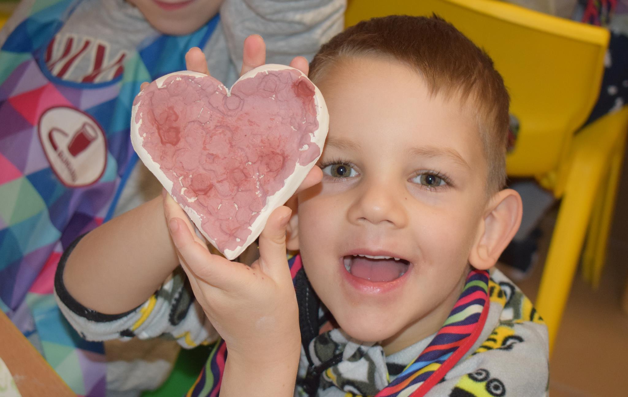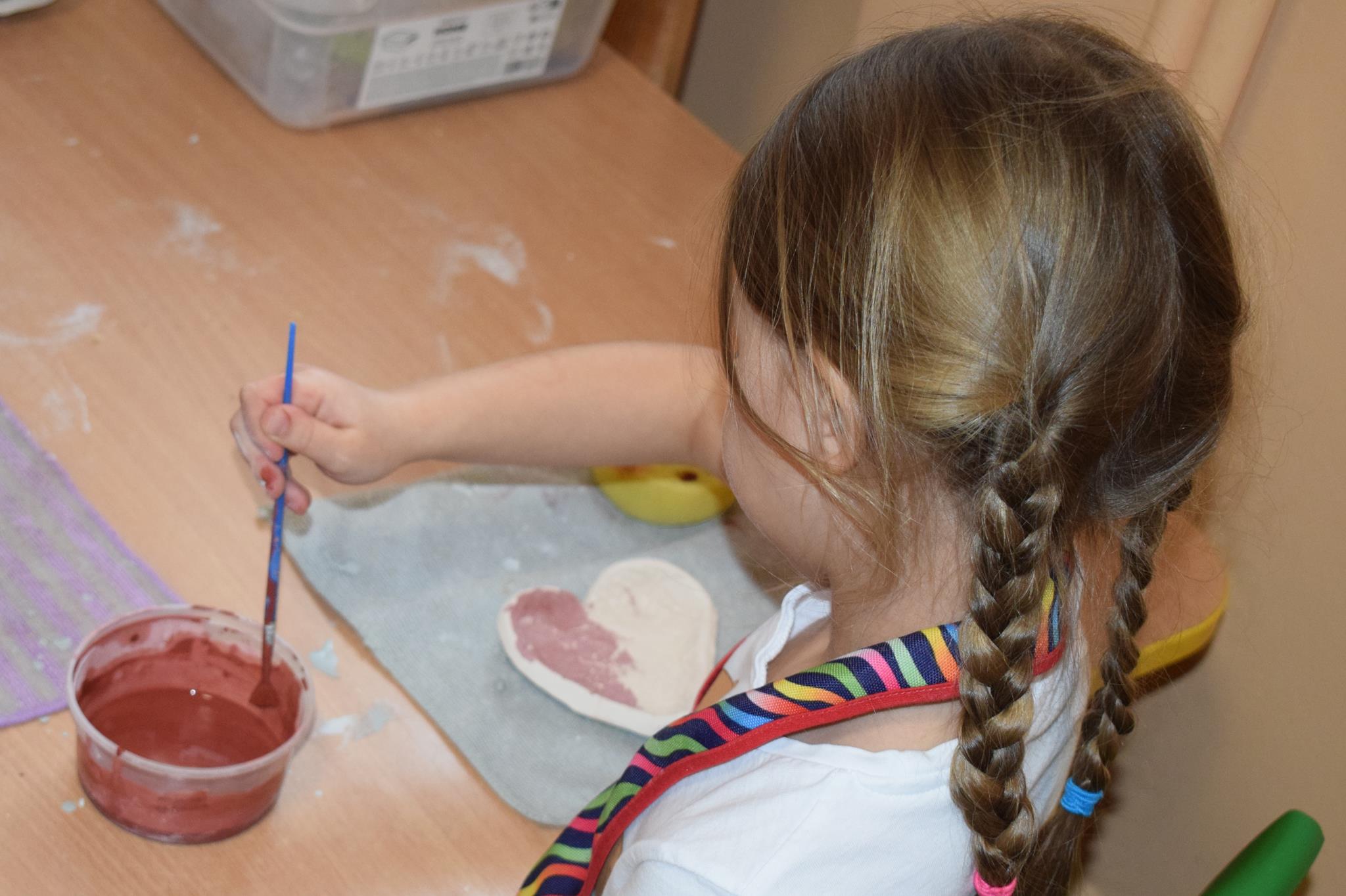 Dzieci delikatnie przecierały gąbką swoje prace, a następnie nakładały szkliwo. Po skończonych zajęciach Pani Julia zabierze serduszka do swojej pracowni i ponownie wypali je w piecu. Gotowe serduszka dzieci pięknie zapakują i podarują swoim kochanym Babciom i kochanym Dziadziusiom podczas przedszkolnych uroczystości, na które serdecznie zapraszamy Miłych Gości: