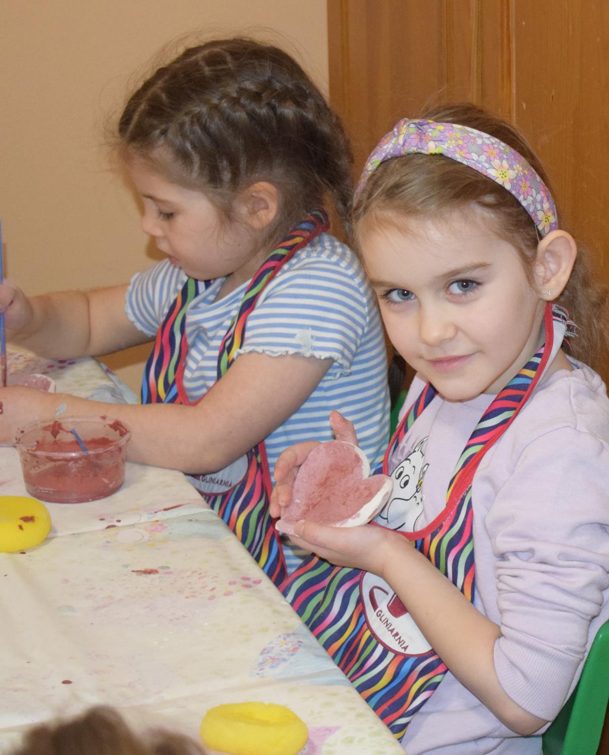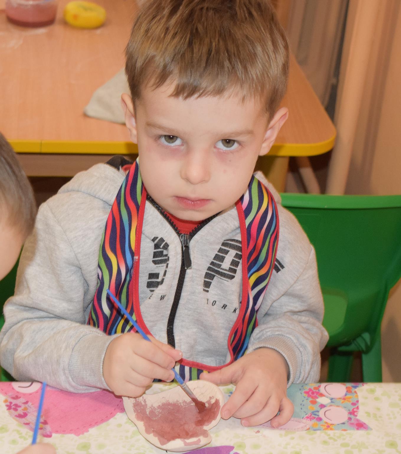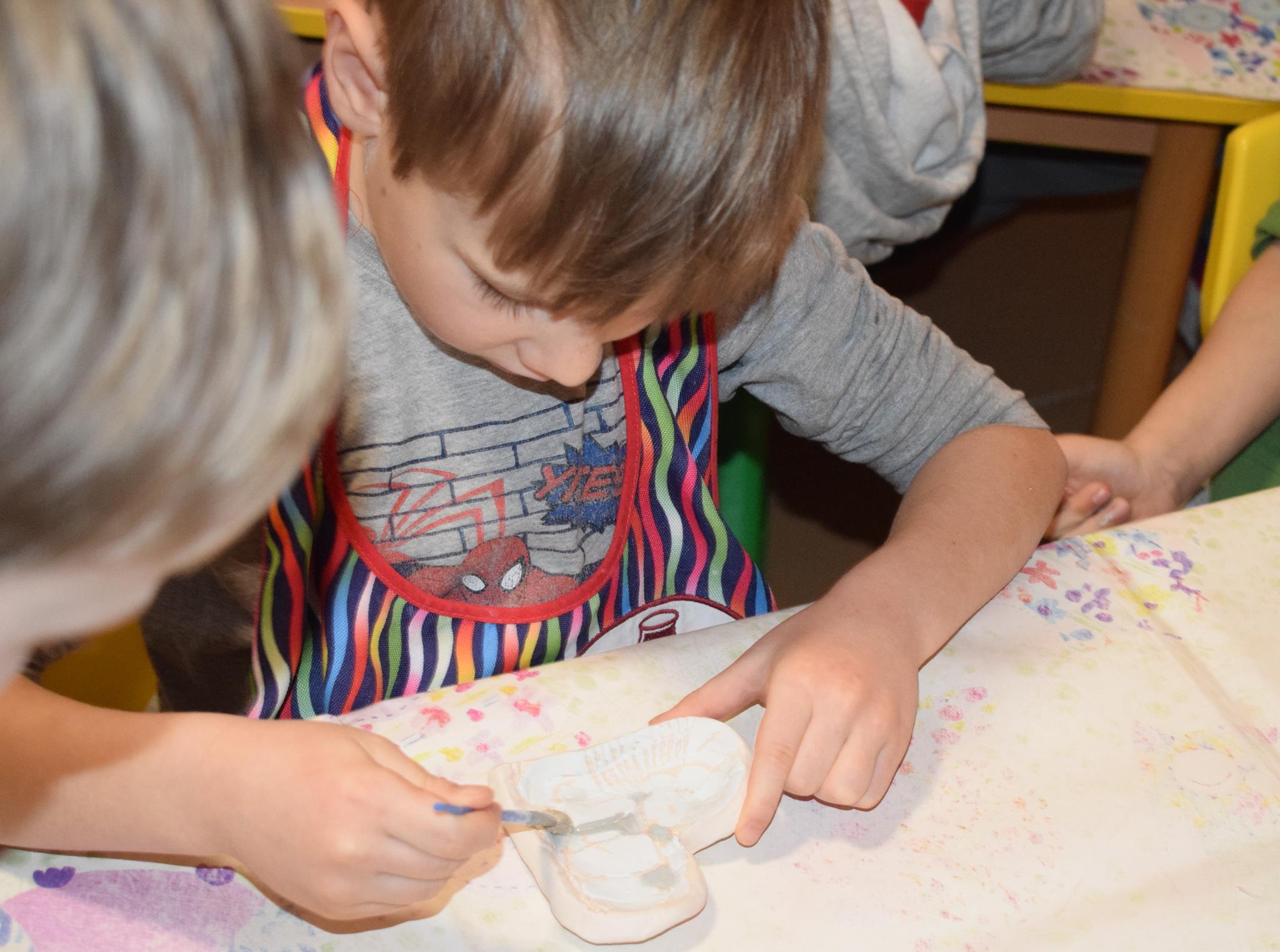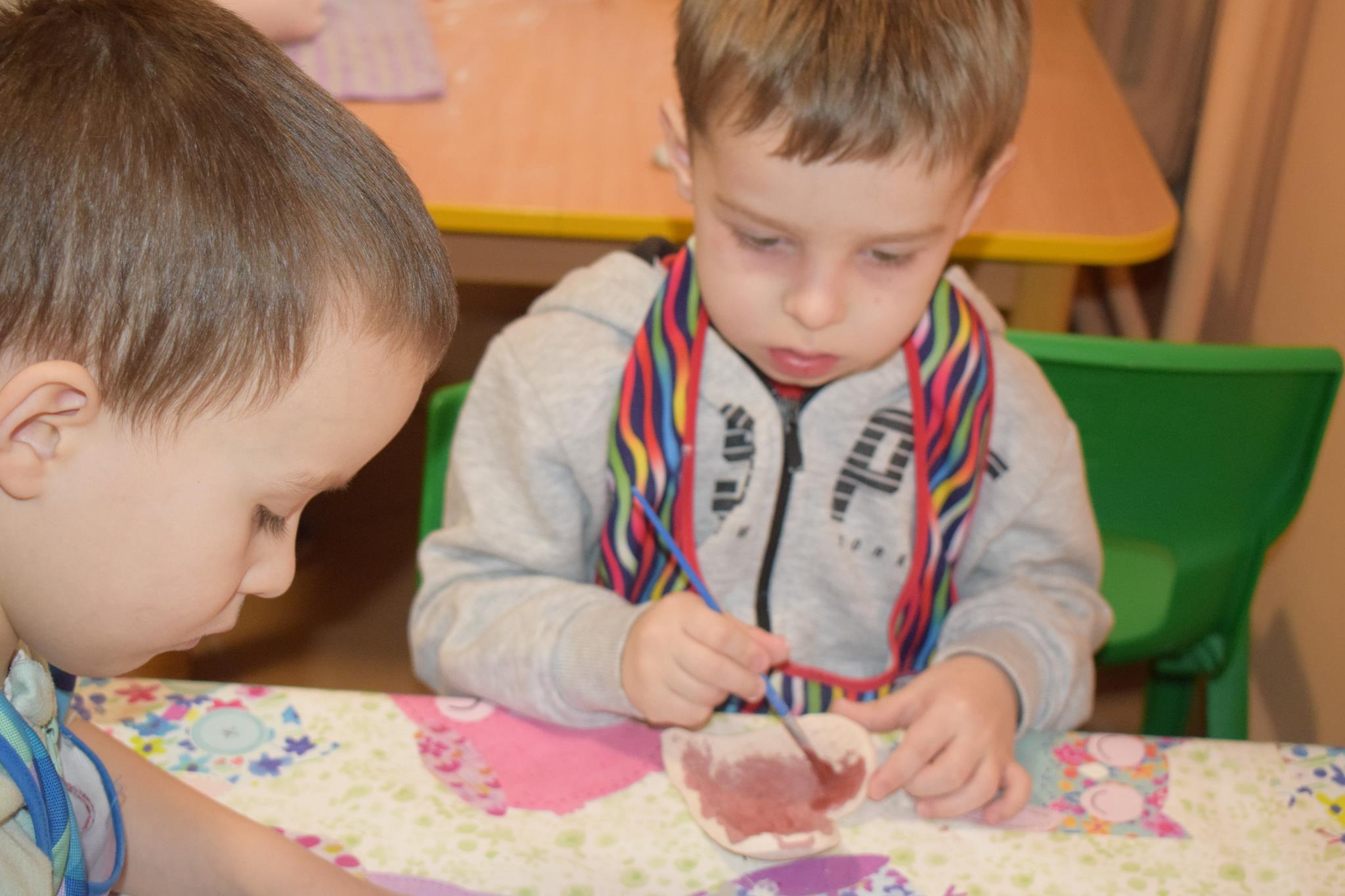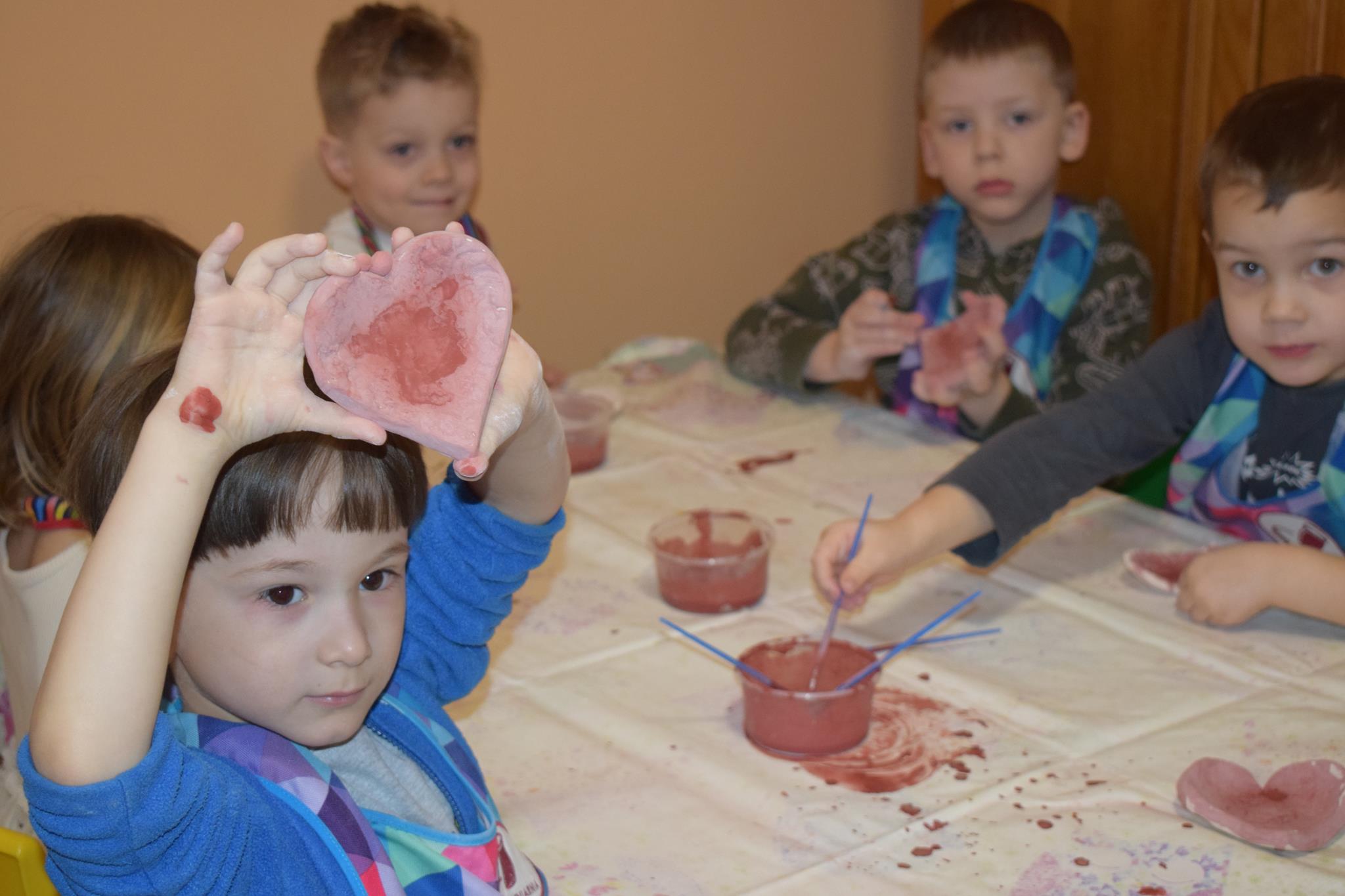 Dzieci delikatnie przecierały gąbką swoje prace, a następnie nakładały szkliwo. Po skończonych zajęciach Pani Julia zabierze serduszka do swojej pracowni i ponownie wypali je w piecu. Gotowe serduszka dzieci pięknie zapakują i podarują swoim kochanym Babciom i kochanym Dziadziusiom podczas przedszkolnych uroczystości, na które serdecznie zapraszamy Miłych Gości: