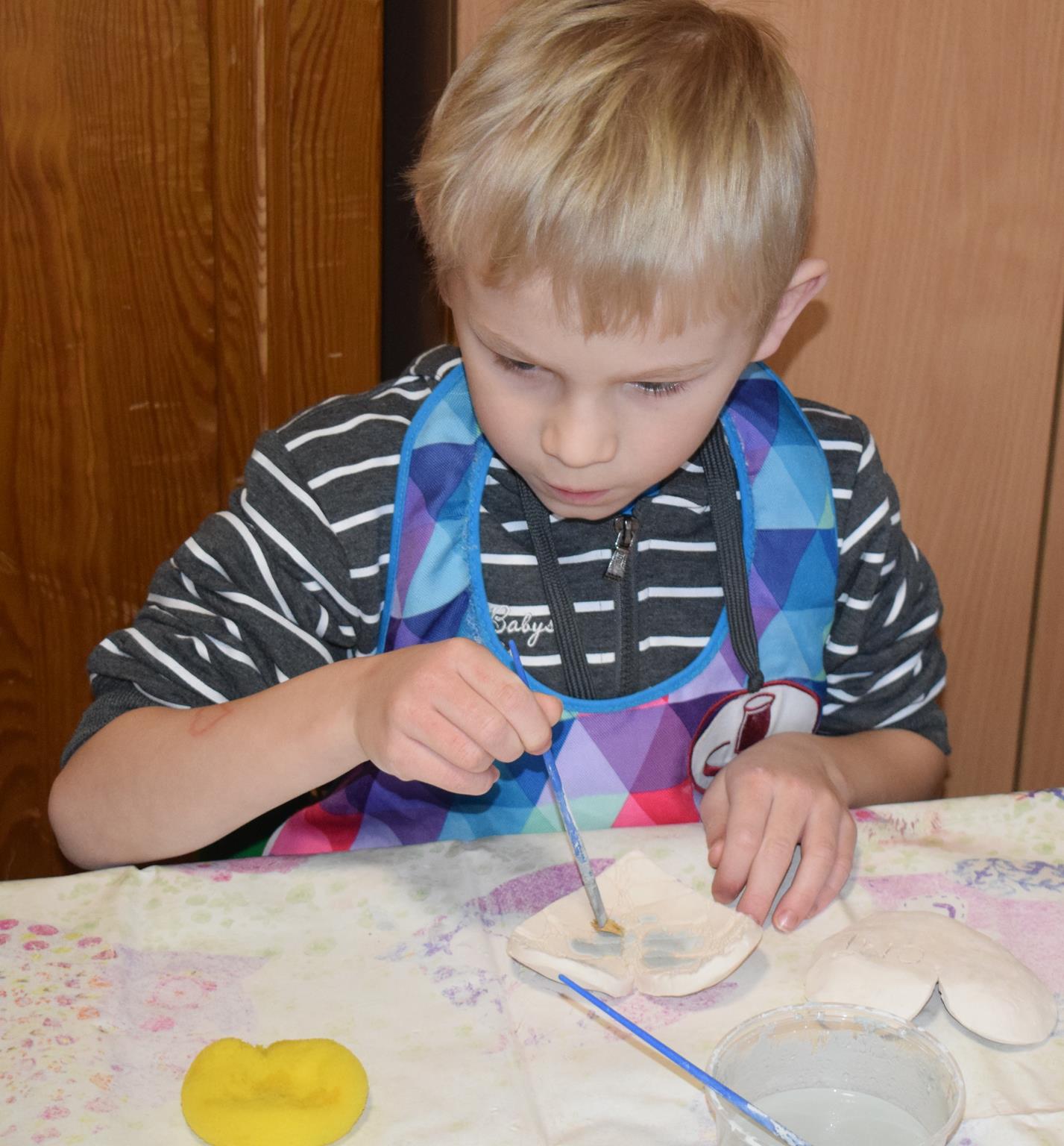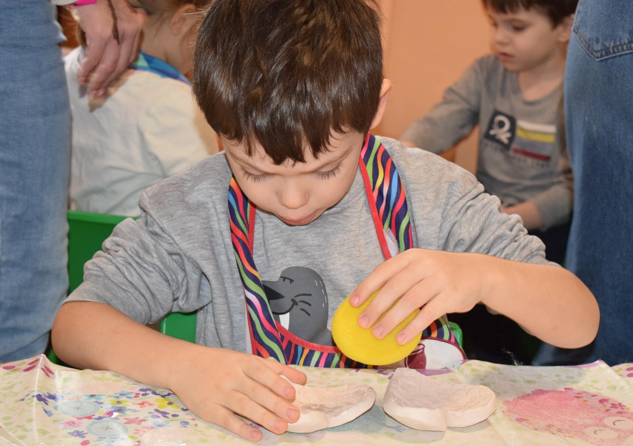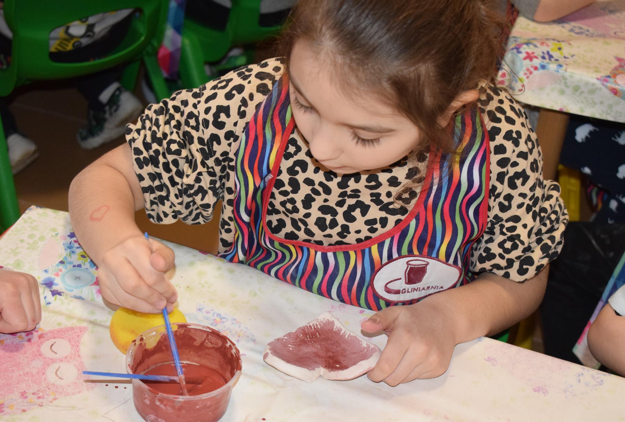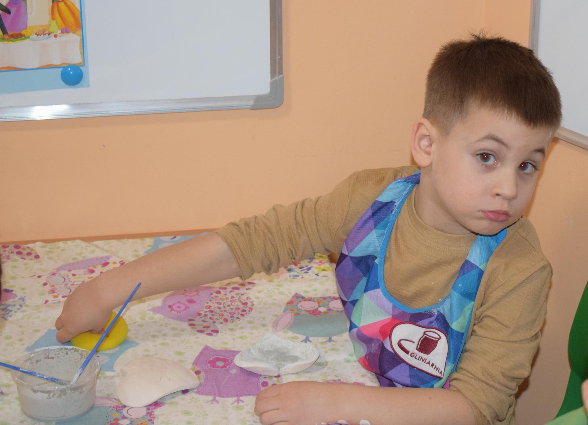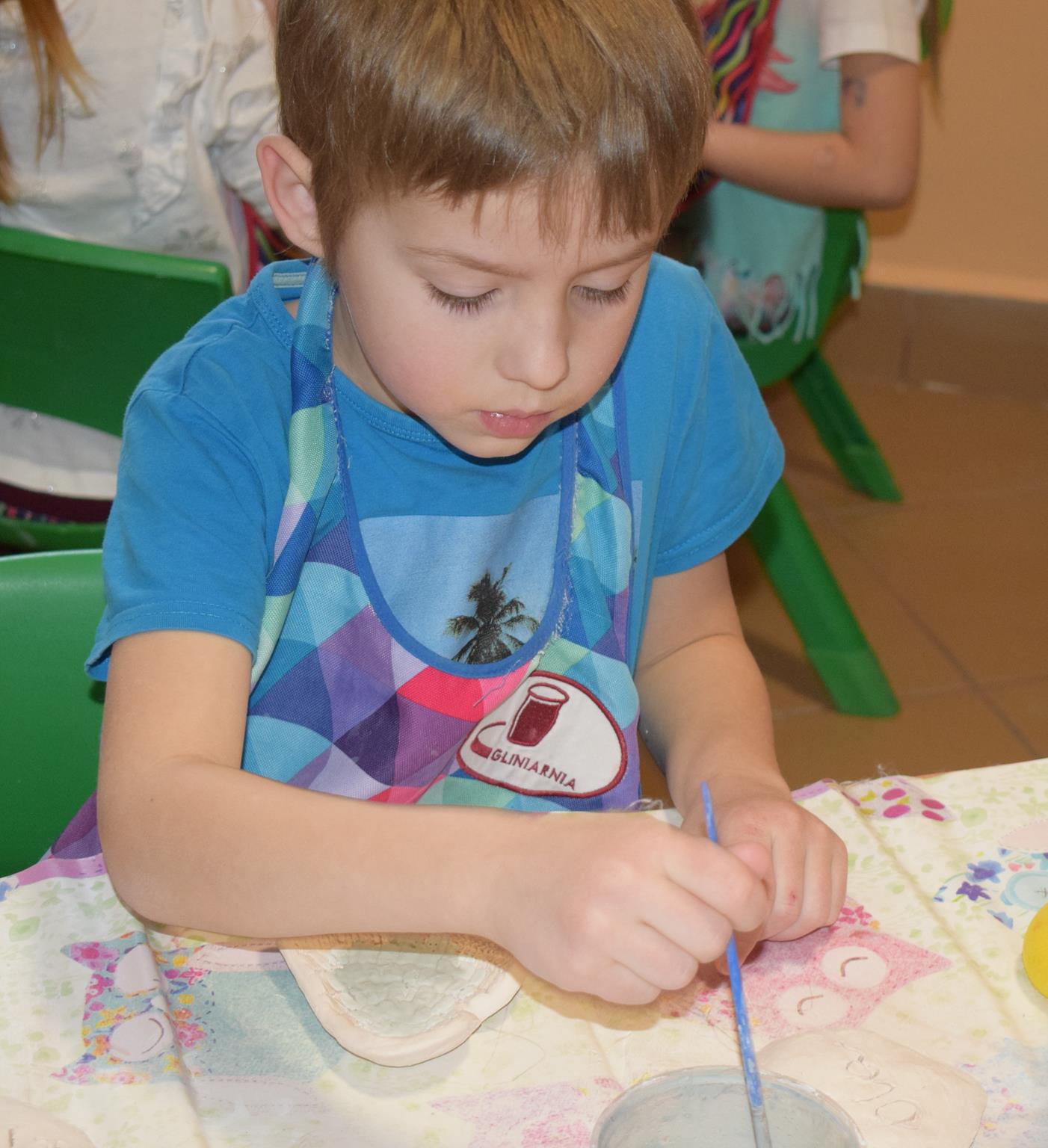 Dzieci delikatnie przecierały gąbką swoje prace, a następnie nakładały szkliwo. Po skończonych zajęciach Pani Julia zabierze serduszka do swojej pracowni i ponownie wypali je w piecu. Gotowe serduszka dzieci pięknie zapakują i podarują swoim kochanym Babciom i kochanym Dziadziusiom podczas przedszkolnych uroczystości, na które serdecznie zapraszamy Miłych Gości: