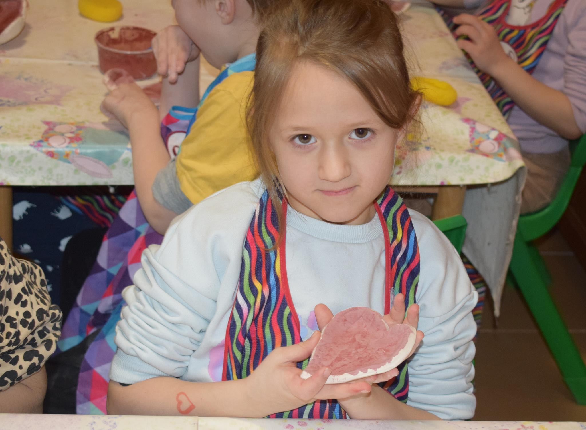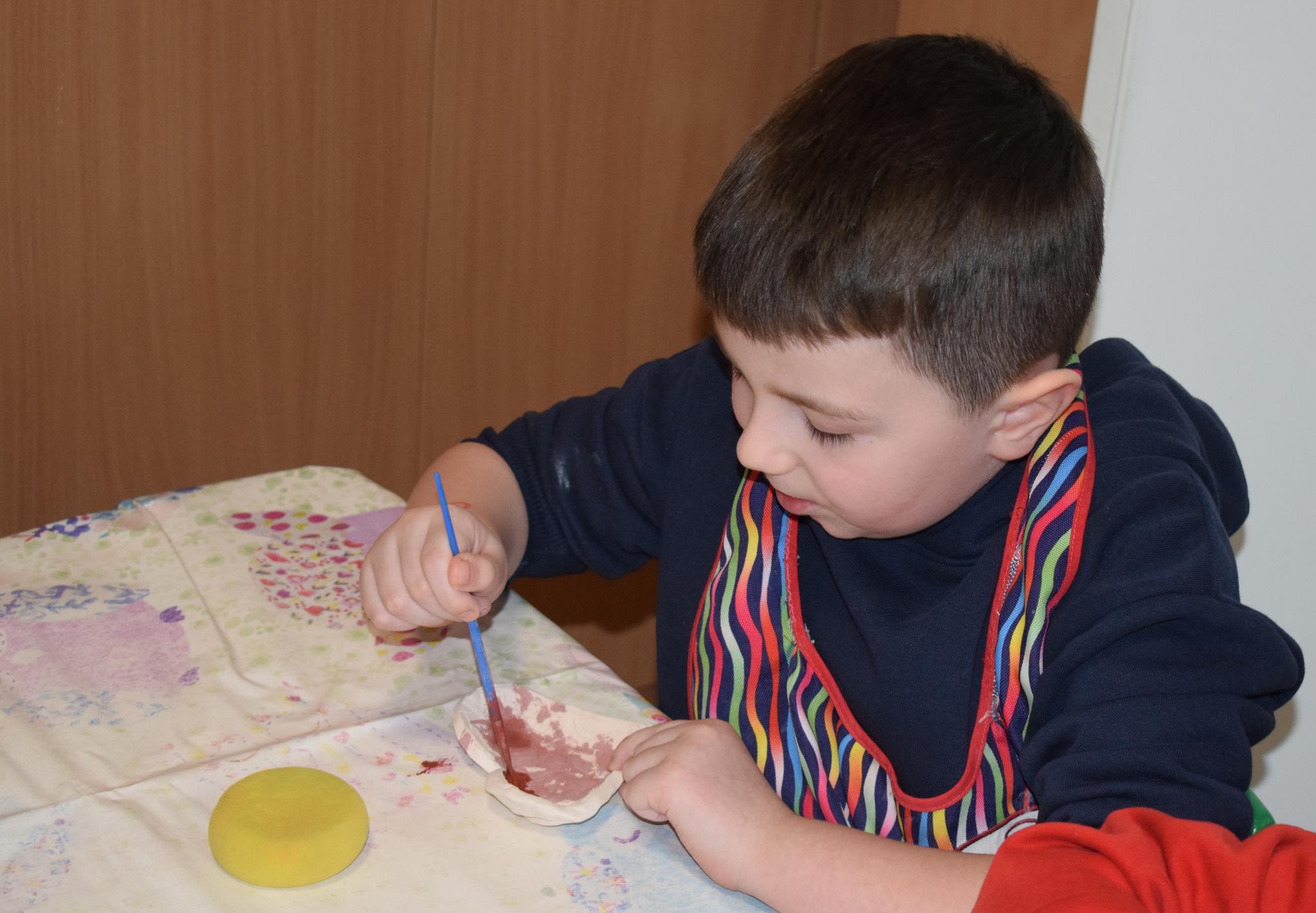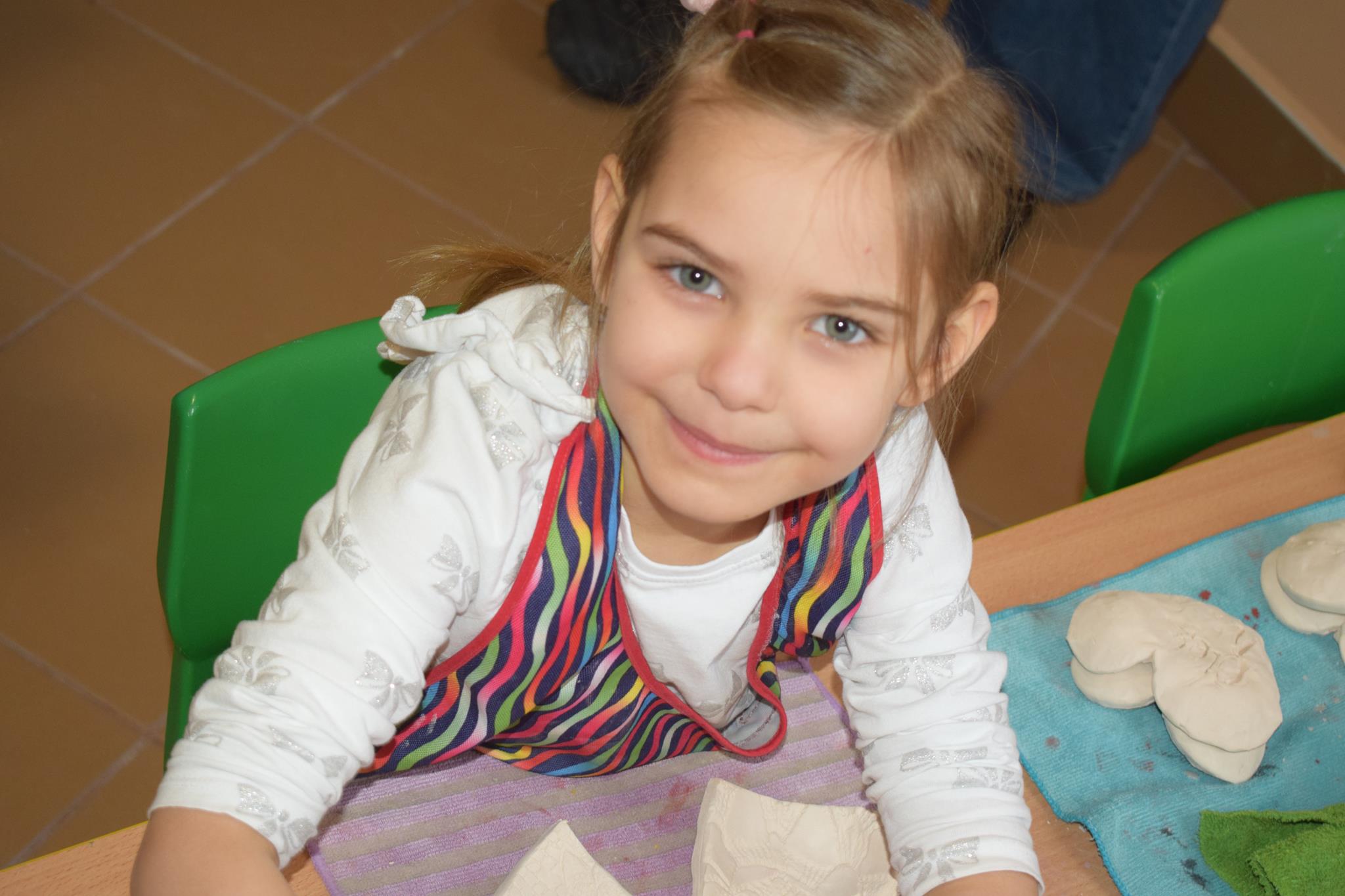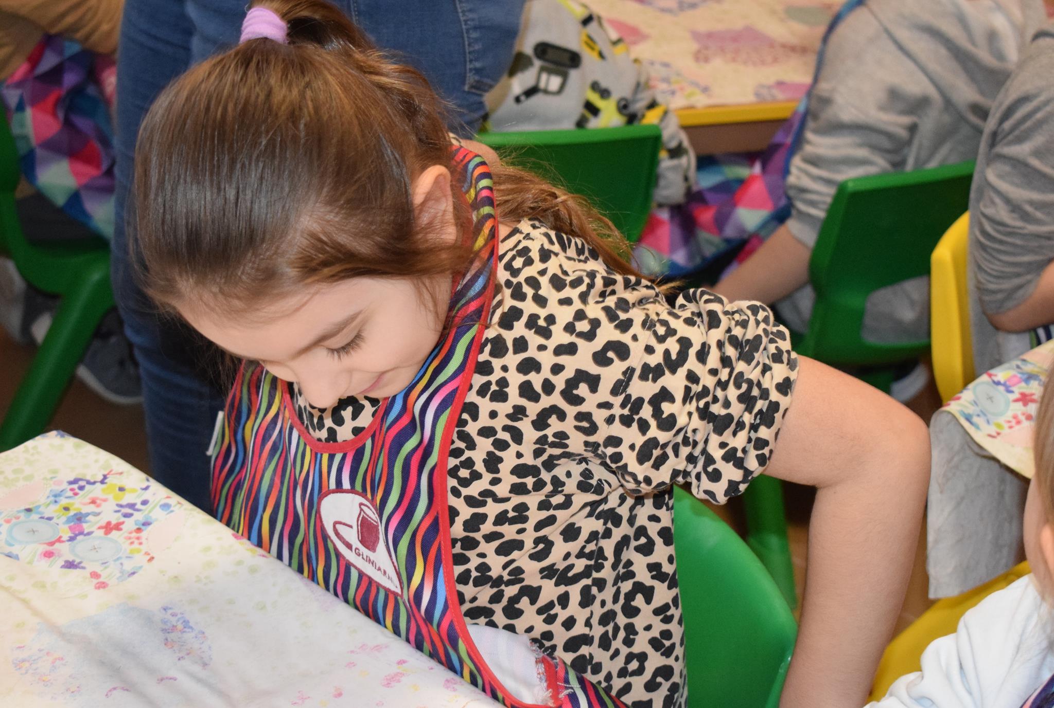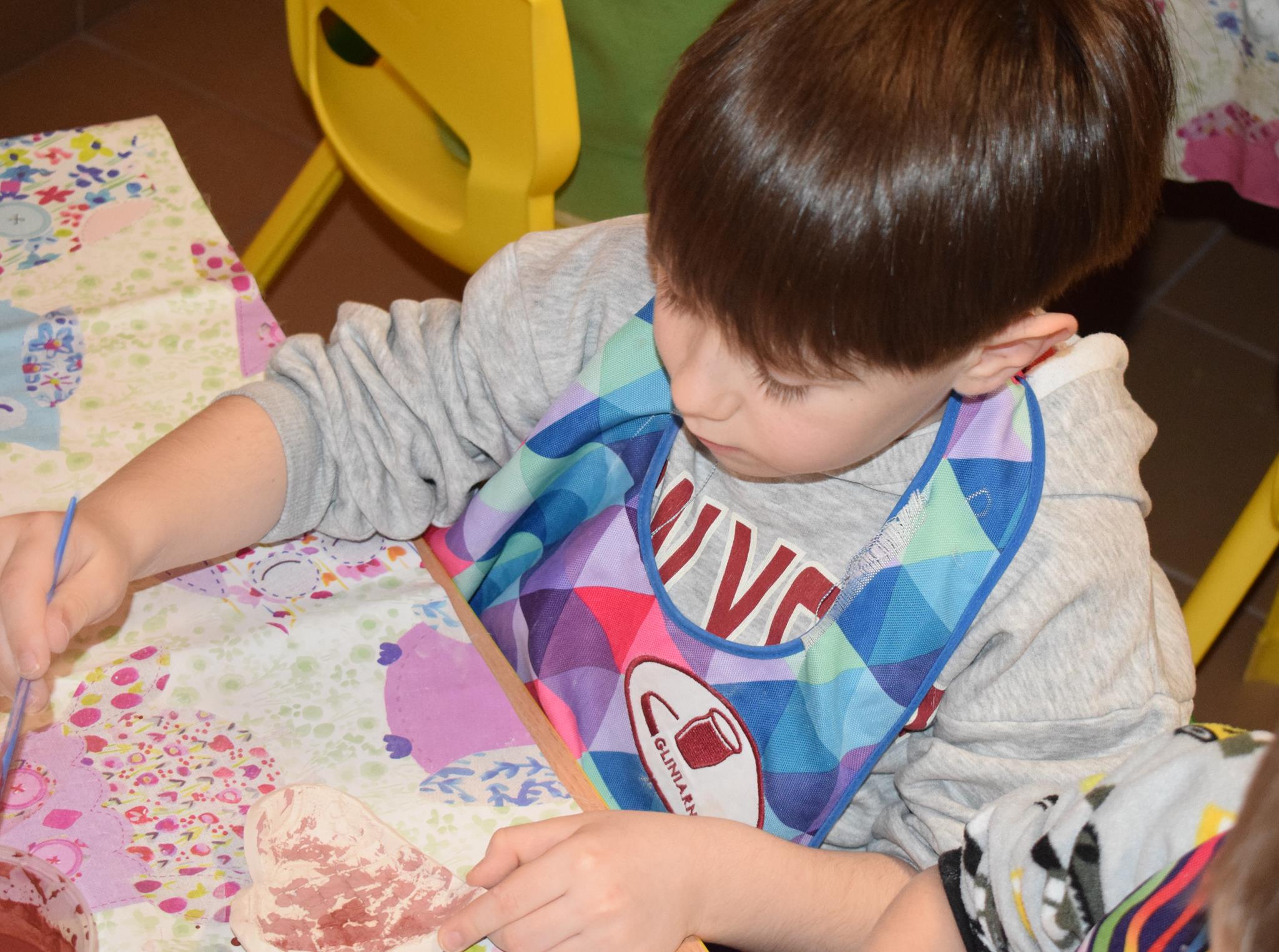 Dzieci delikatnie przecierały gąbką swoje prace, a następnie nakładały szkliwo. Po skończonych zajęciach Pani Julia zabierze serduszka do swojej pracowni i ponownie wypali je w piecu. Gotowe serduszka dzieci pięknie zapakują i podarują swoim kochanym Babciom i kochanym Dziadziusiom podczas przedszkolnych uroczystości, na które serdecznie zapraszamy Miłych Gości: