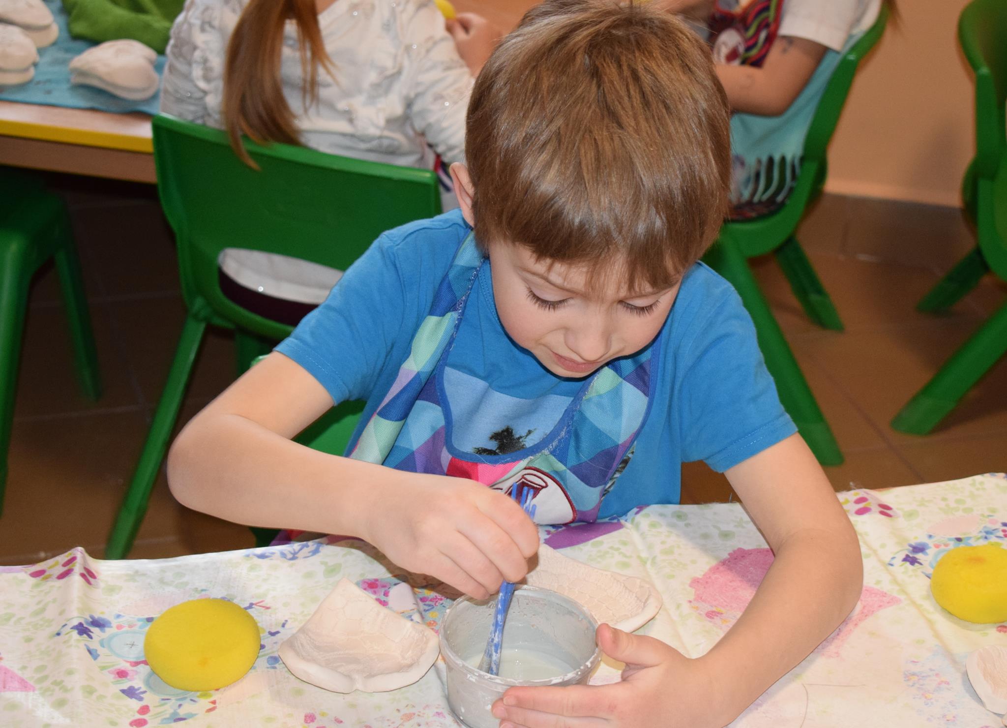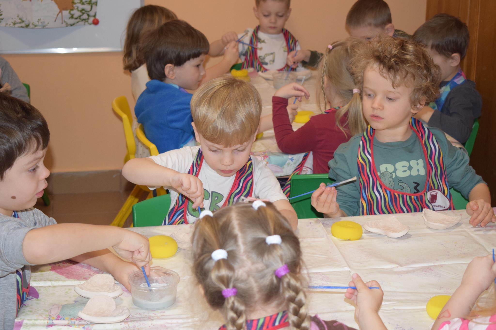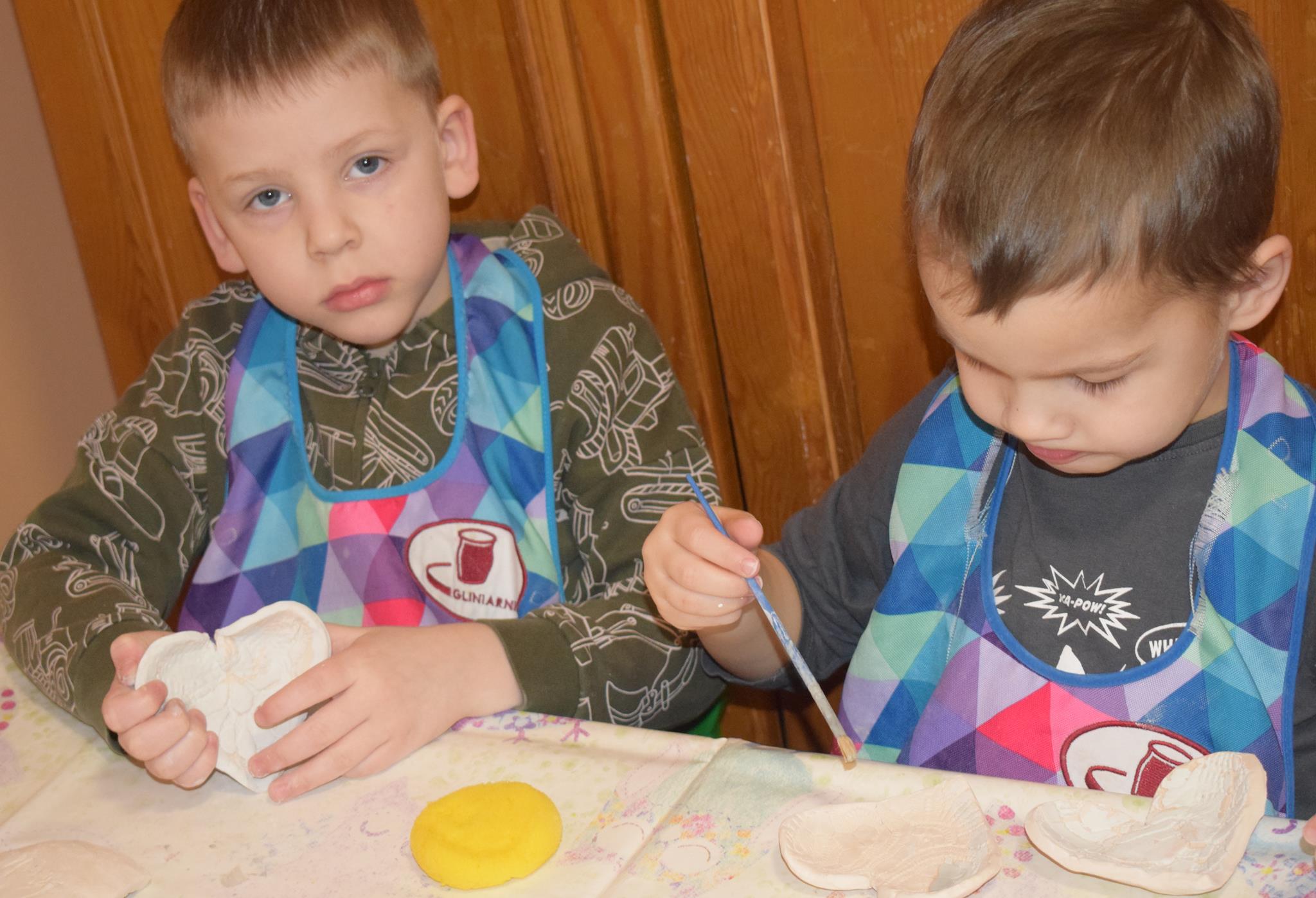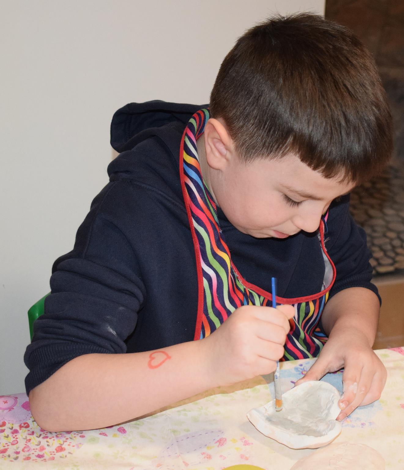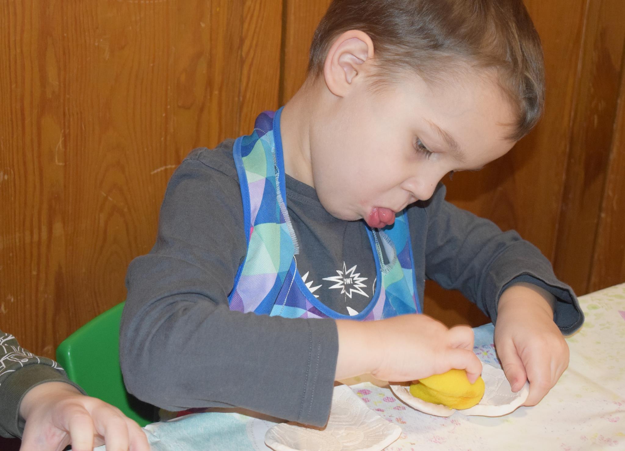 Dzieci delikatnie przecierały gąbką swoje prace, a następnie nakładały szkliwo. Po skończonych zajęciach Pani Julia zabierze serduszka do swojej pracowni i ponownie wypali je w piecu. Gotowe serduszka dzieci pięknie zapakują i podarują swoim kochanym Babciom i kochanym Dziadziusiom podczas przedszkolnych uroczystości, na które serdecznie zapraszamy Miłych Gości: