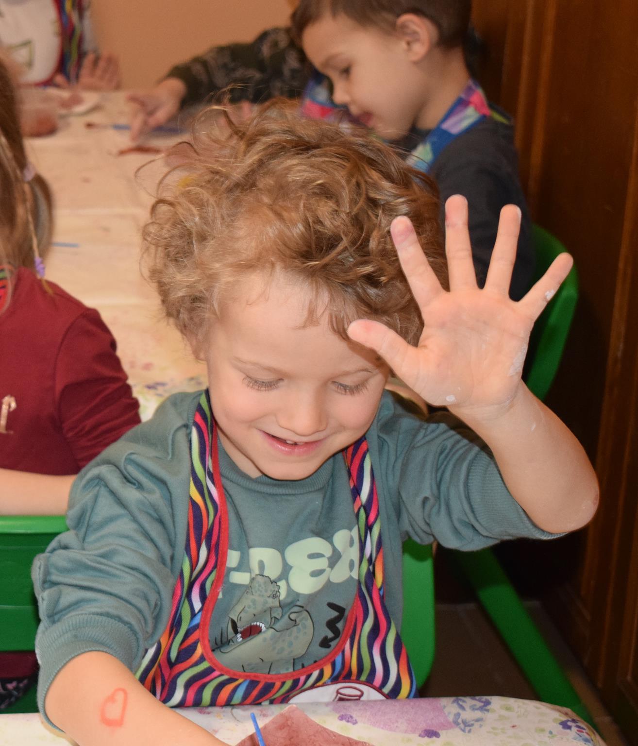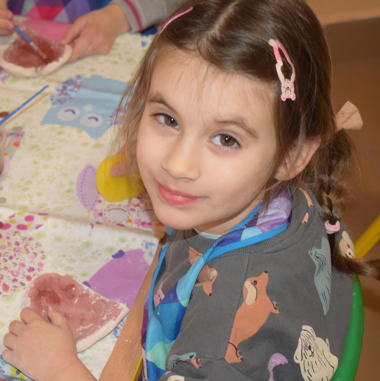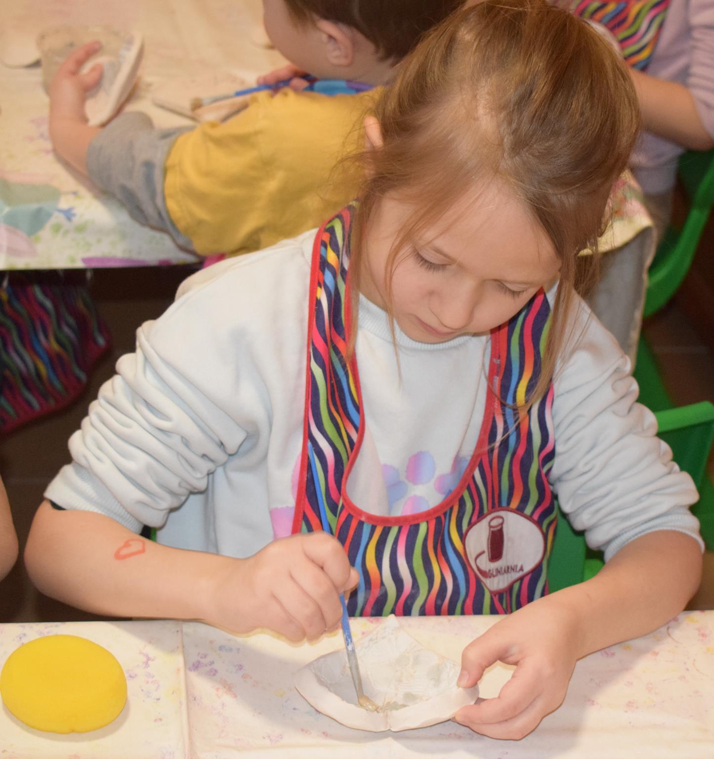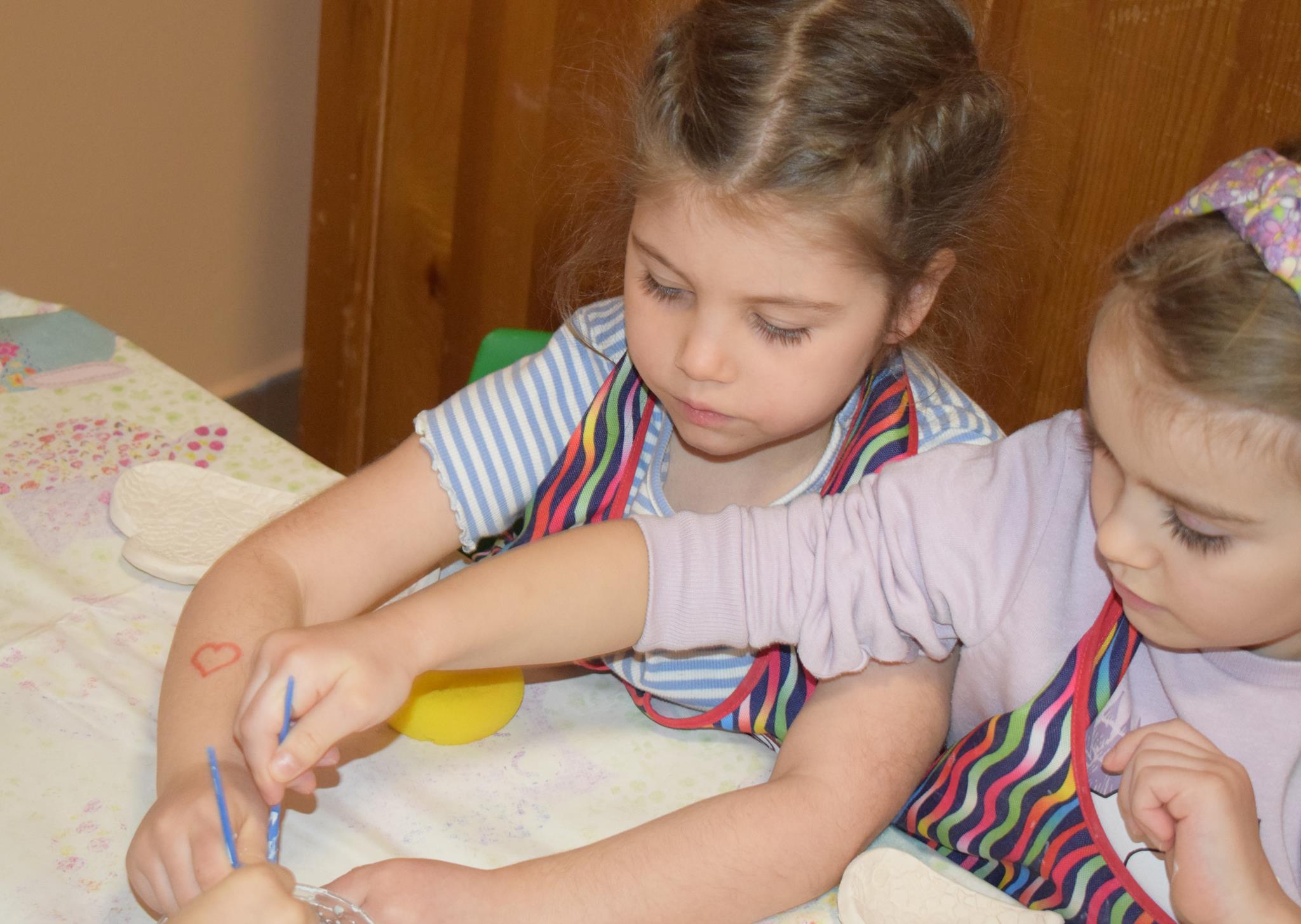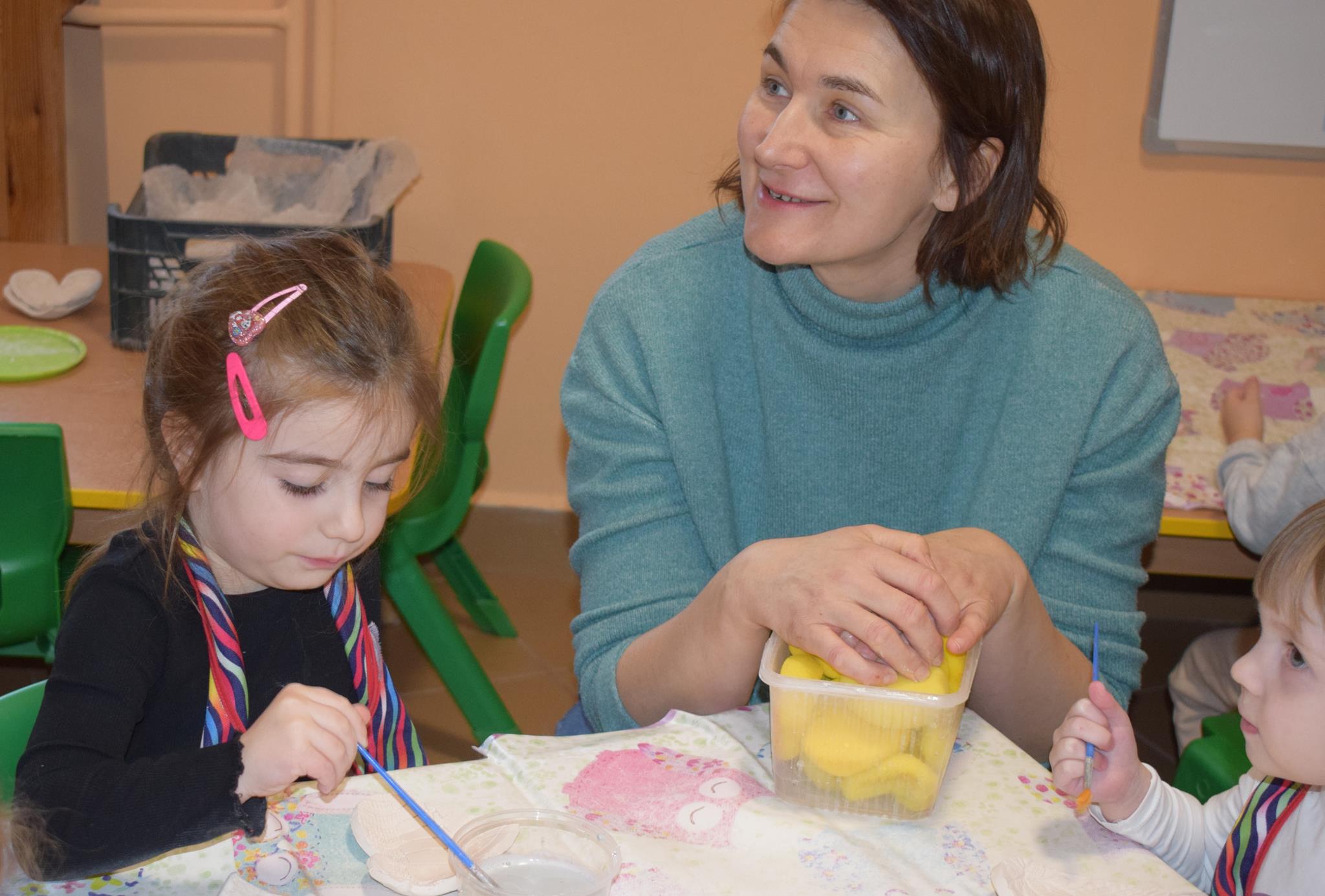 Dzieci delikatnie przecierały gąbką swoje prace, a następnie nakładały szkliwo. Po skończonych zajęciach Pani Julia zabierze serduszka do swojej pracowni i ponownie wypali je w piecu. Gotowe serduszka dzieci pięknie zapakują i podarują swoim kochanym Babciom i kochanym Dziadziusiom podczas przedszkolnych uroczystości, na które serdecznie zapraszamy Miłych Gości: