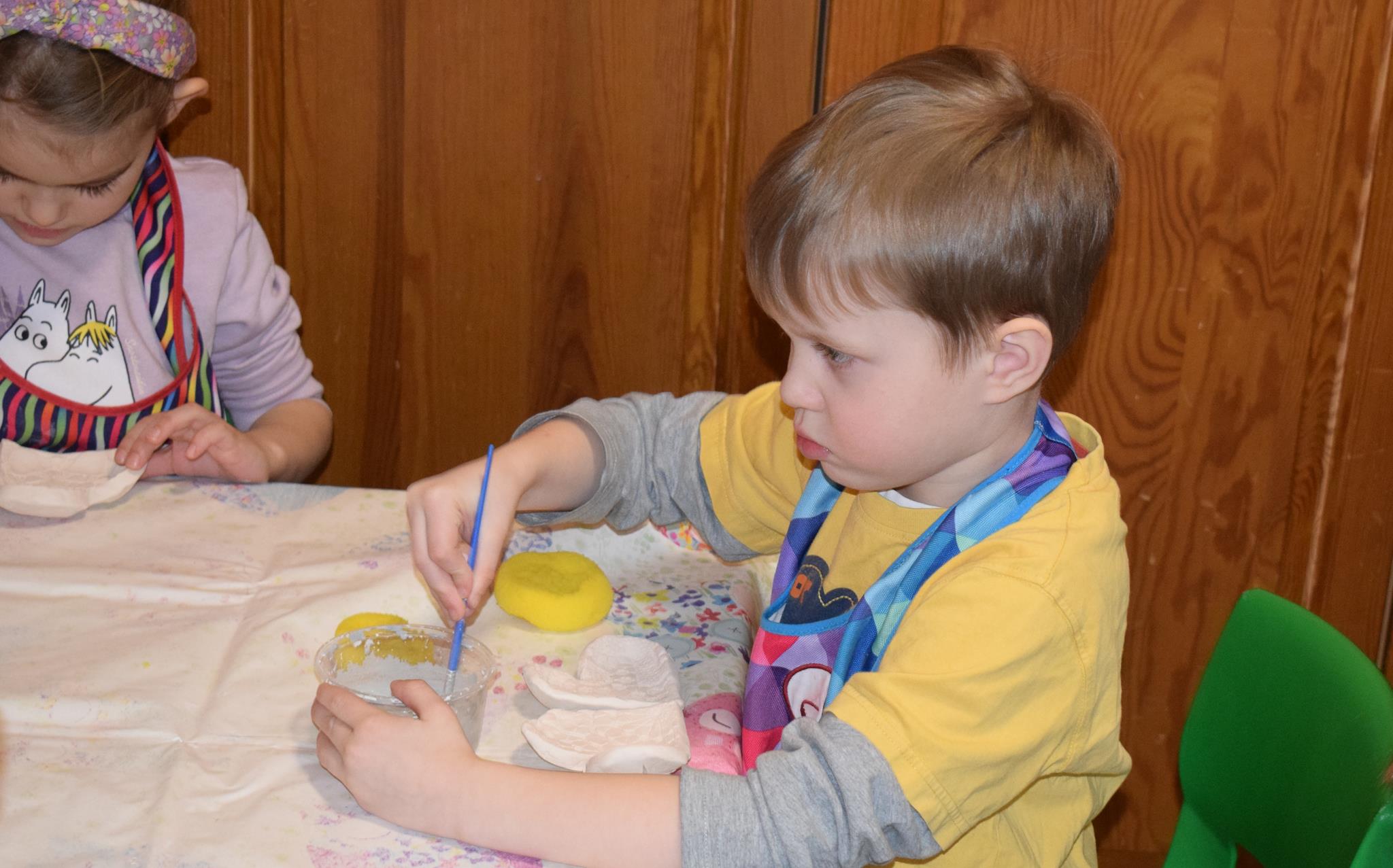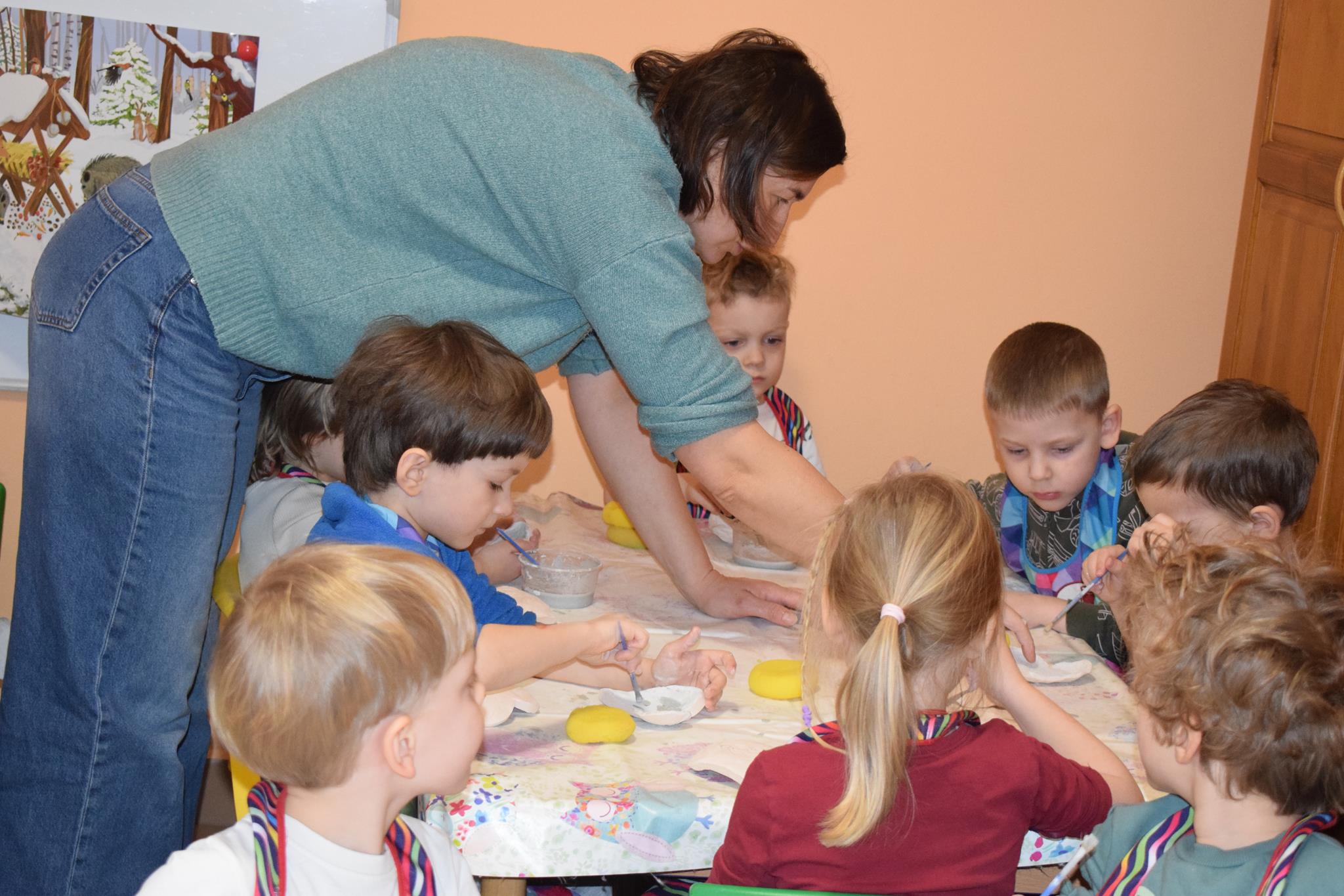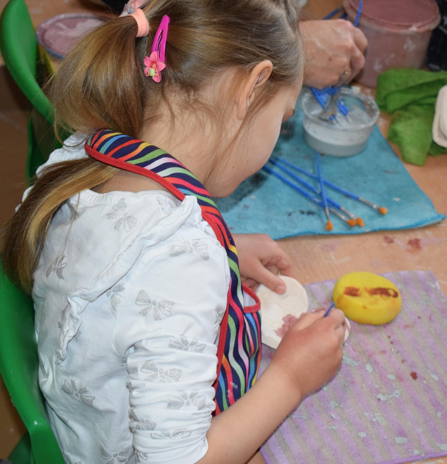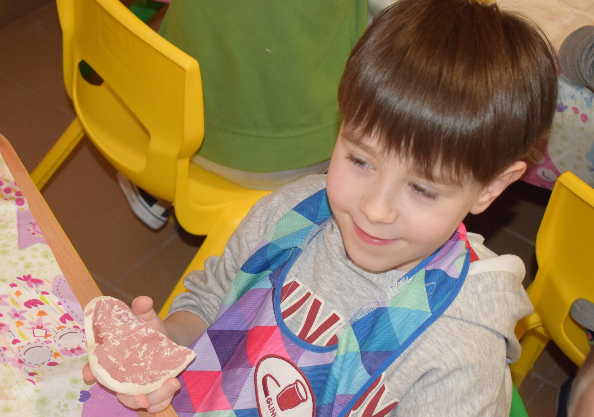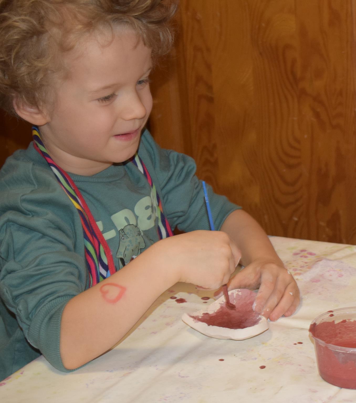 Dzieci delikatnie przecierały gąbką swoje prace, a następnie nakładały szkliwo. Po skończonych zajęciach Pani Julia zabierze serduszka do swojej pracowni i ponownie wypali je w piecu. Gotowe serduszka dzieci pięknie zapakują i podarują swoim kochanym Babciom i kochanym Dziadziusiom podczas przedszkolnych uroczystości, na które serdecznie zapraszamy Miłych Gości: