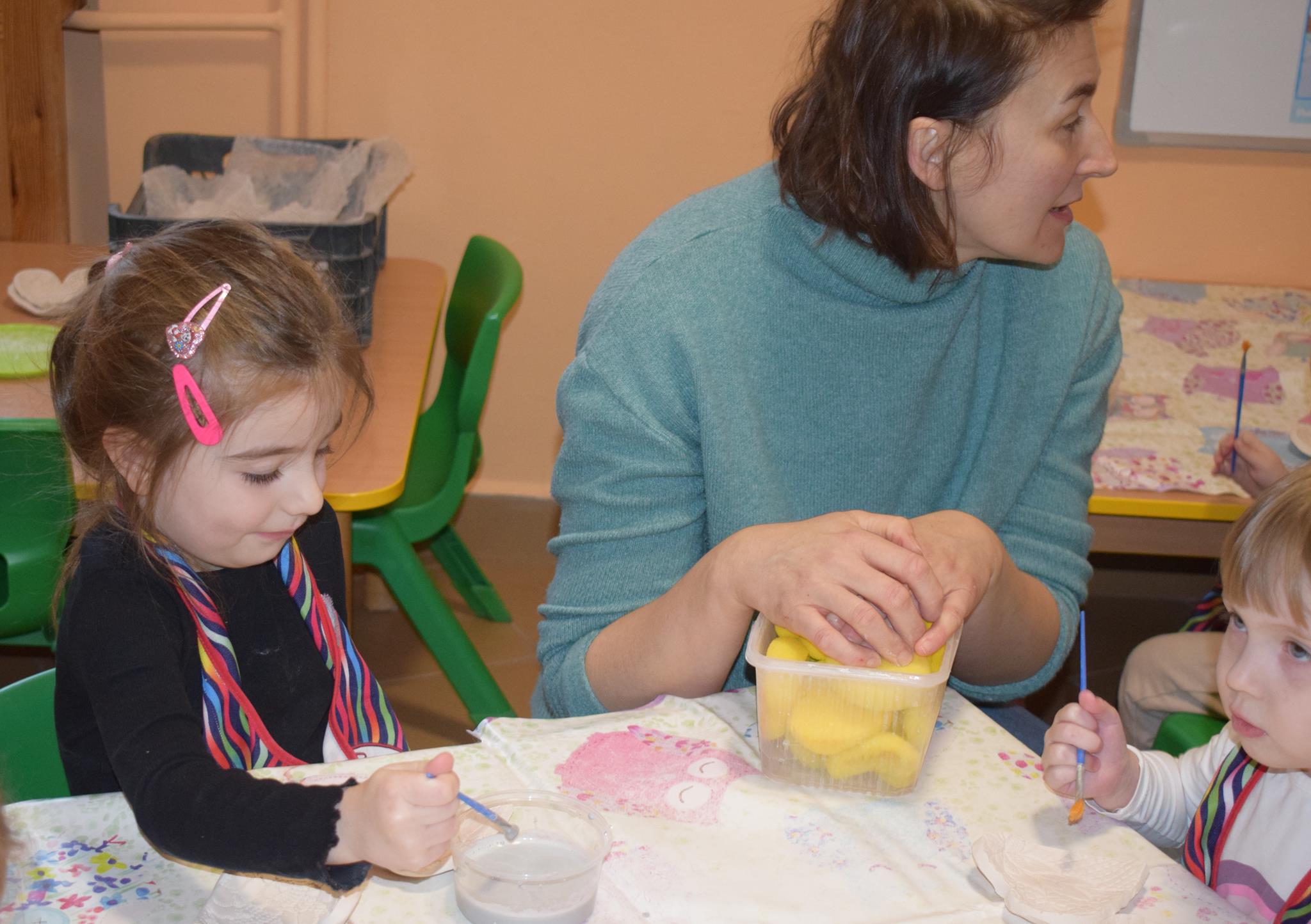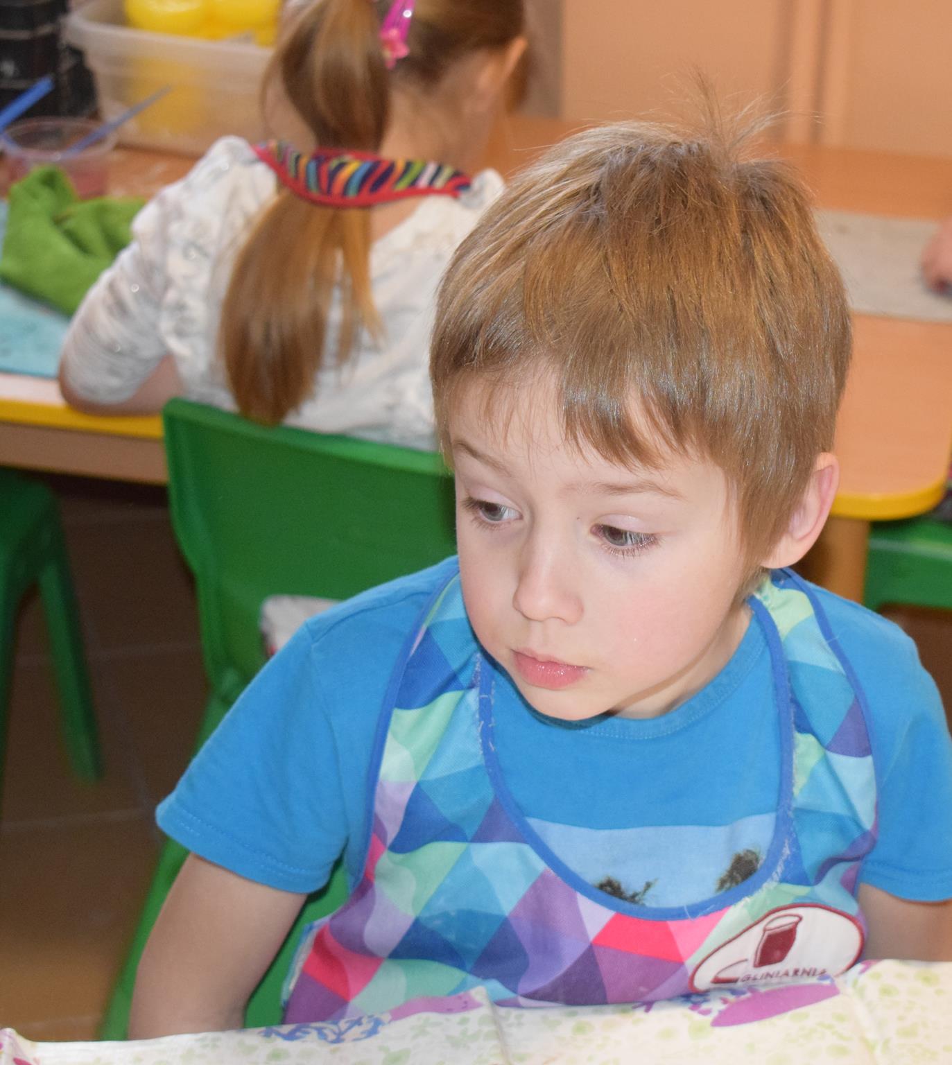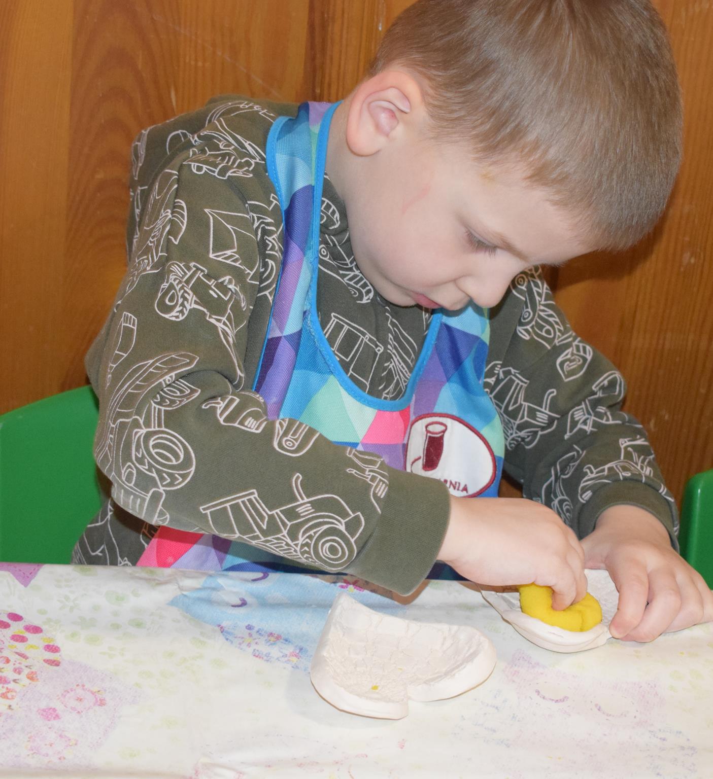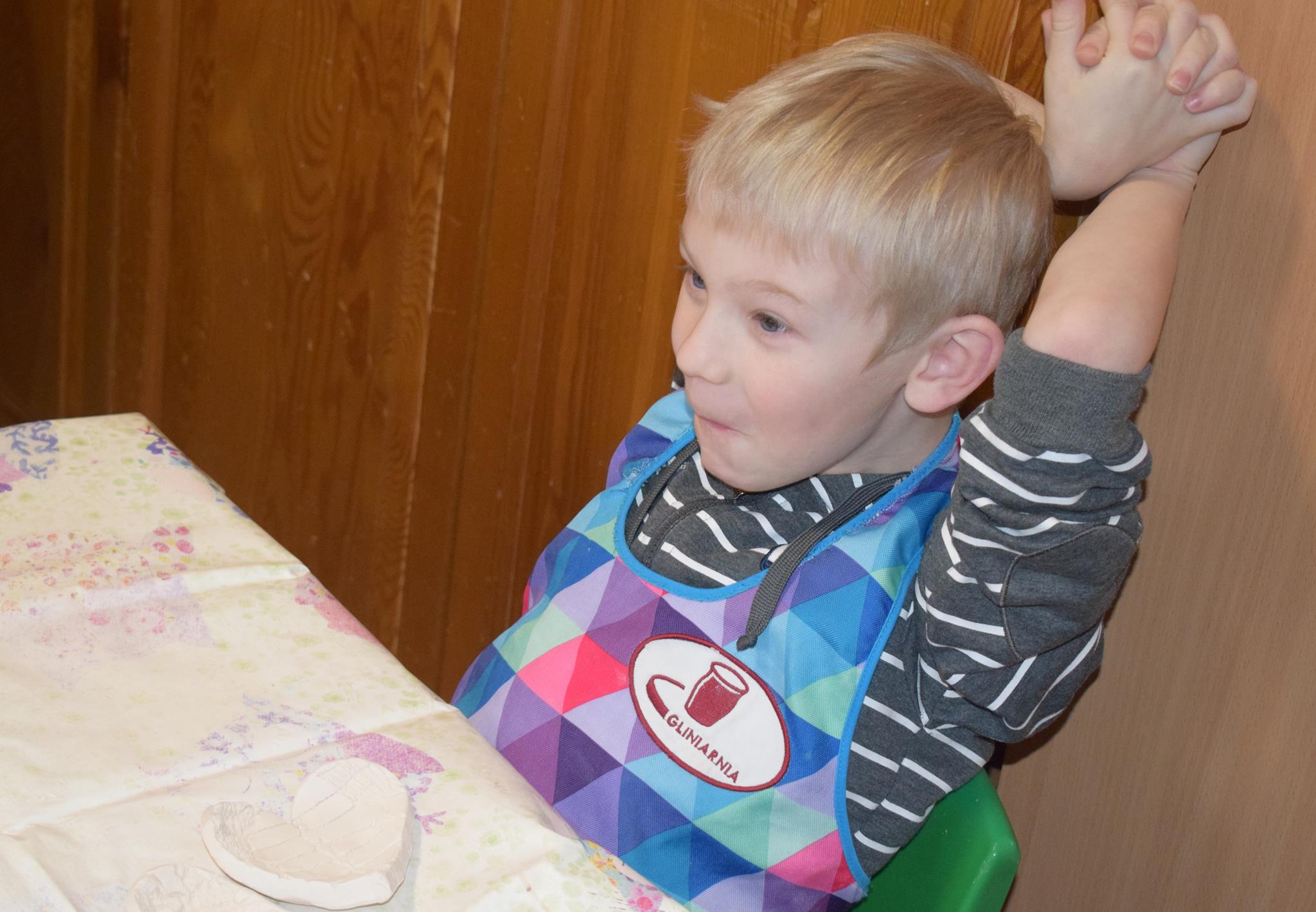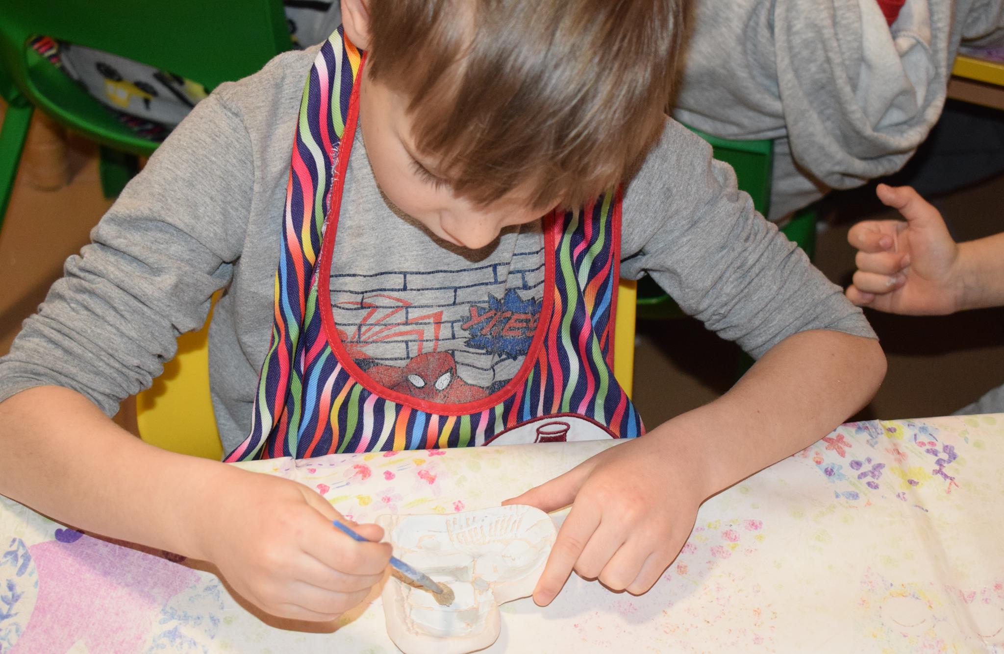 Dzieci delikatnie przecierały gąbką swoje prace, a następnie nakładały szkliwo. Po skończonych zajęciach Pani Julia zabierze serduszka do swojej pracowni i ponownie wypali je w piecu. Gotowe serduszka dzieci pięknie zapakują i podarują swoim kochanym Babciom i kochanym Dziadziusiom podczas przedszkolnych uroczystości, na które serdecznie zapraszamy Miłych Gości: