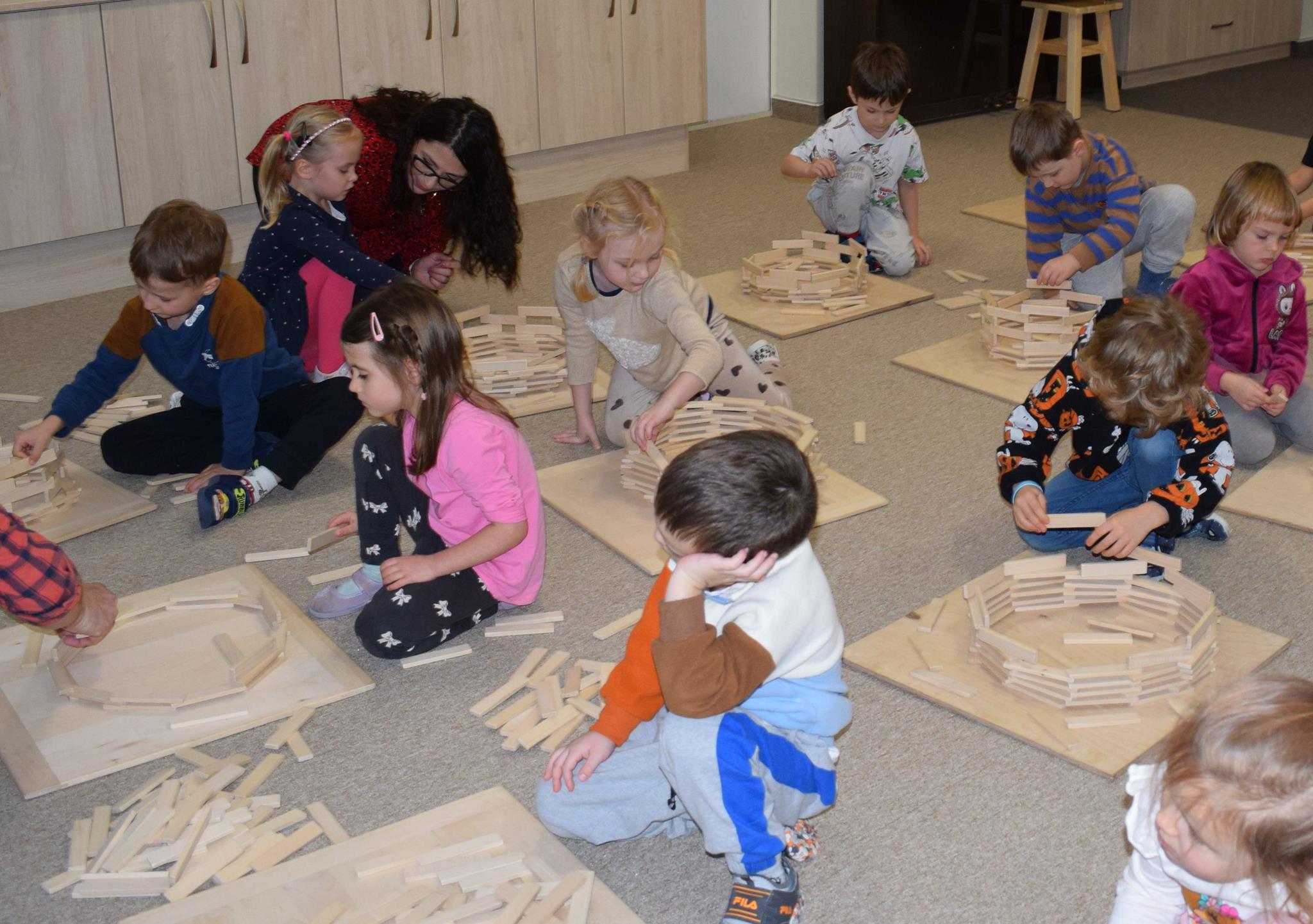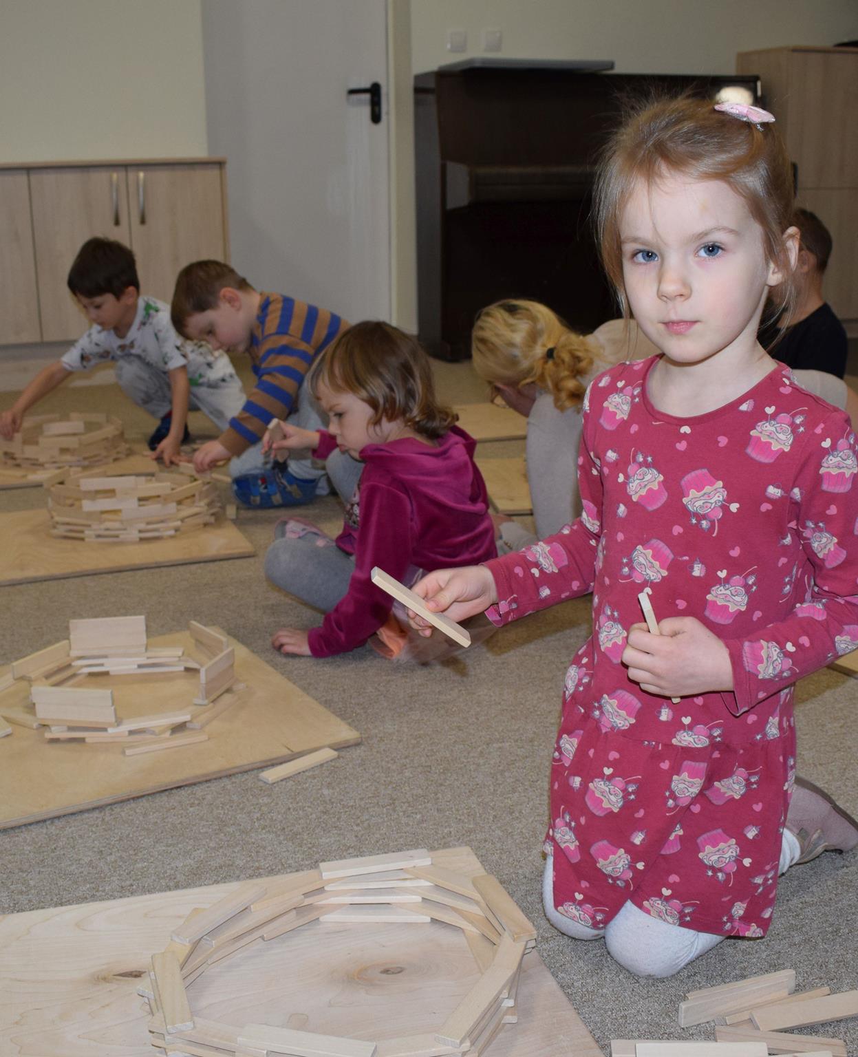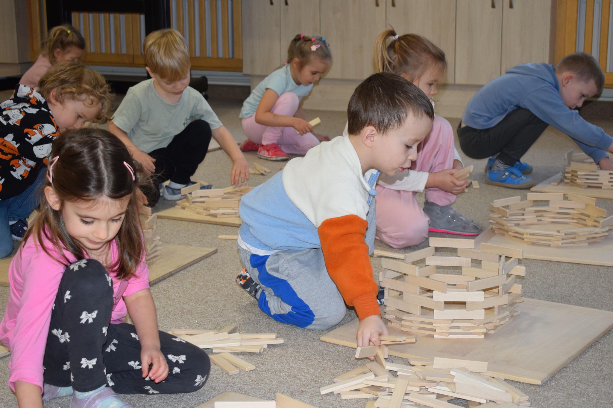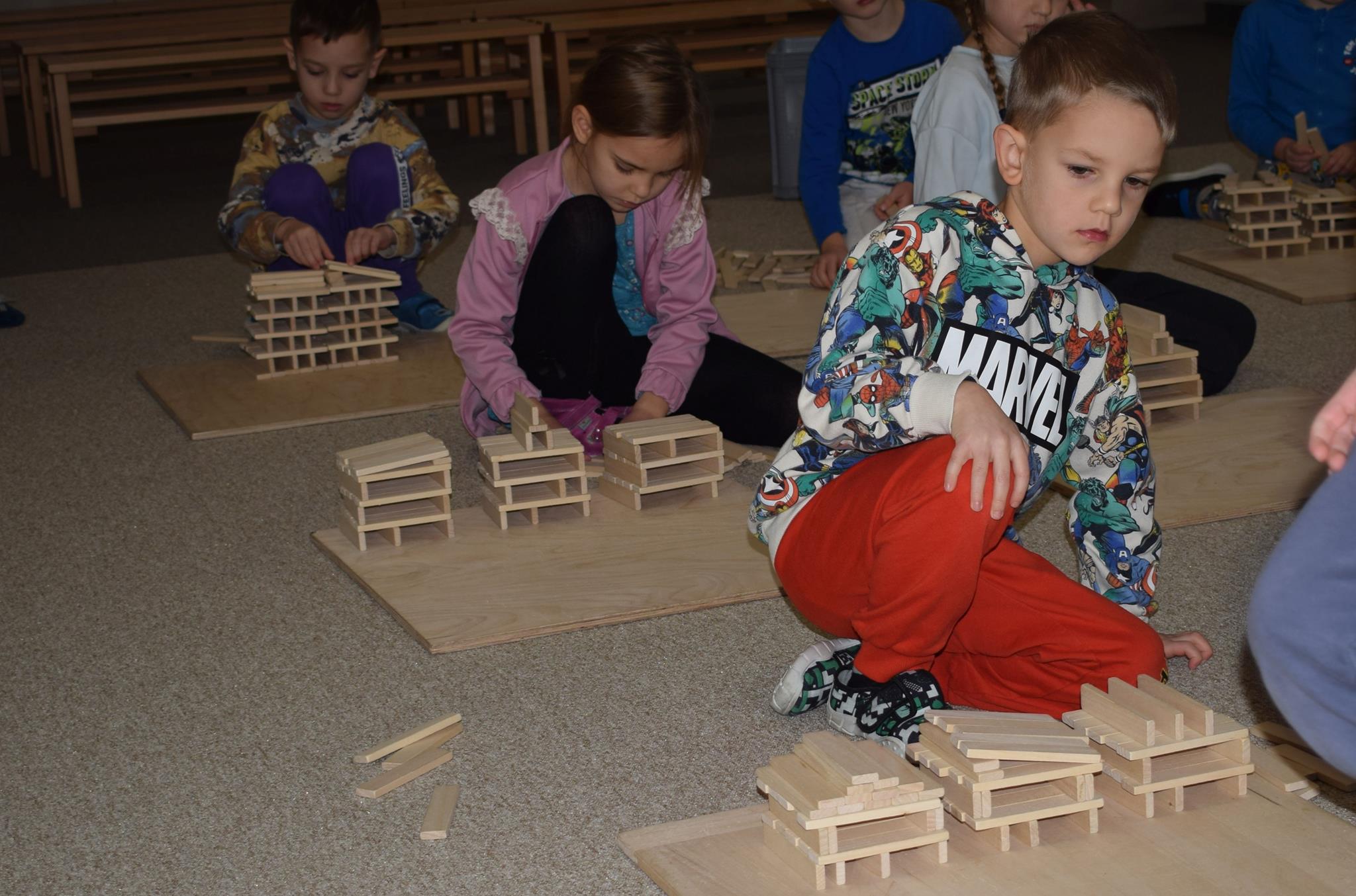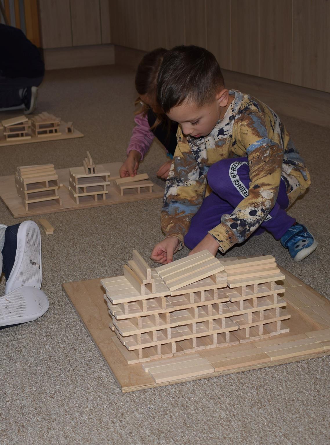 Po raz kolejny w tym roku dzieci uczestniczyły w warsztatach Małego Architekta. Wznosiły budowle pod czujnym okiem Pana Kreatka, musiały się wykazać umiejętnością uważnego słuchania, znajomością podstaw matematyki, a także zmysłem estetycznym, inicjatywą i umiejętnościami organizacyjnymi. Na pierwszy ogień poszły podstawowe konstrukcje geometryczne, takie jak trójkąty, kwadraty i koła. Motylki próbowały swoich sił we wznoszeniu budowli przypominającej rzymskie koloseum. Starszaki reprezentując wyższy poziom umiejętności, bo przecież to już trzeci rok, jak szlifują wymienione umiejętności, wznosiły budowle przypominające te z Rynku Starego Miasta w stolicy.