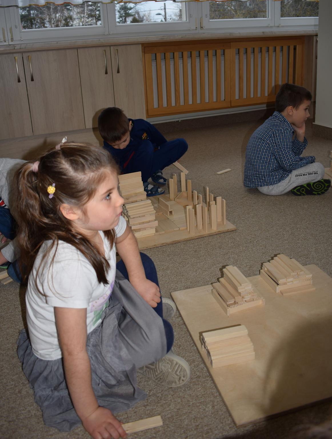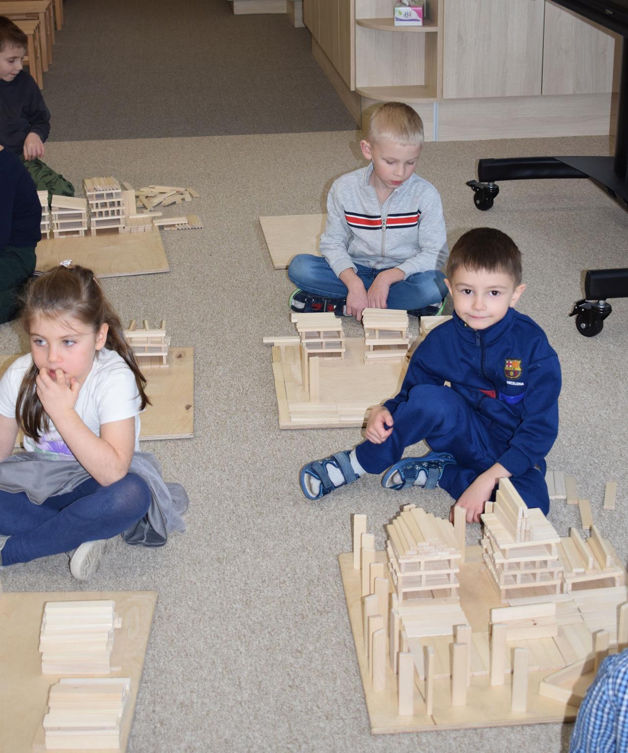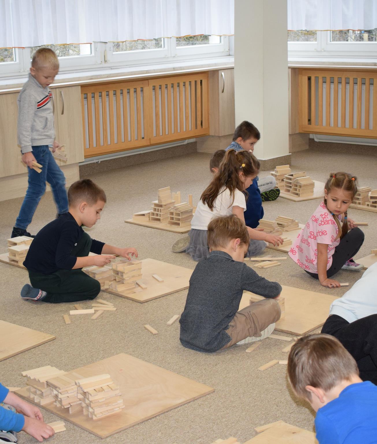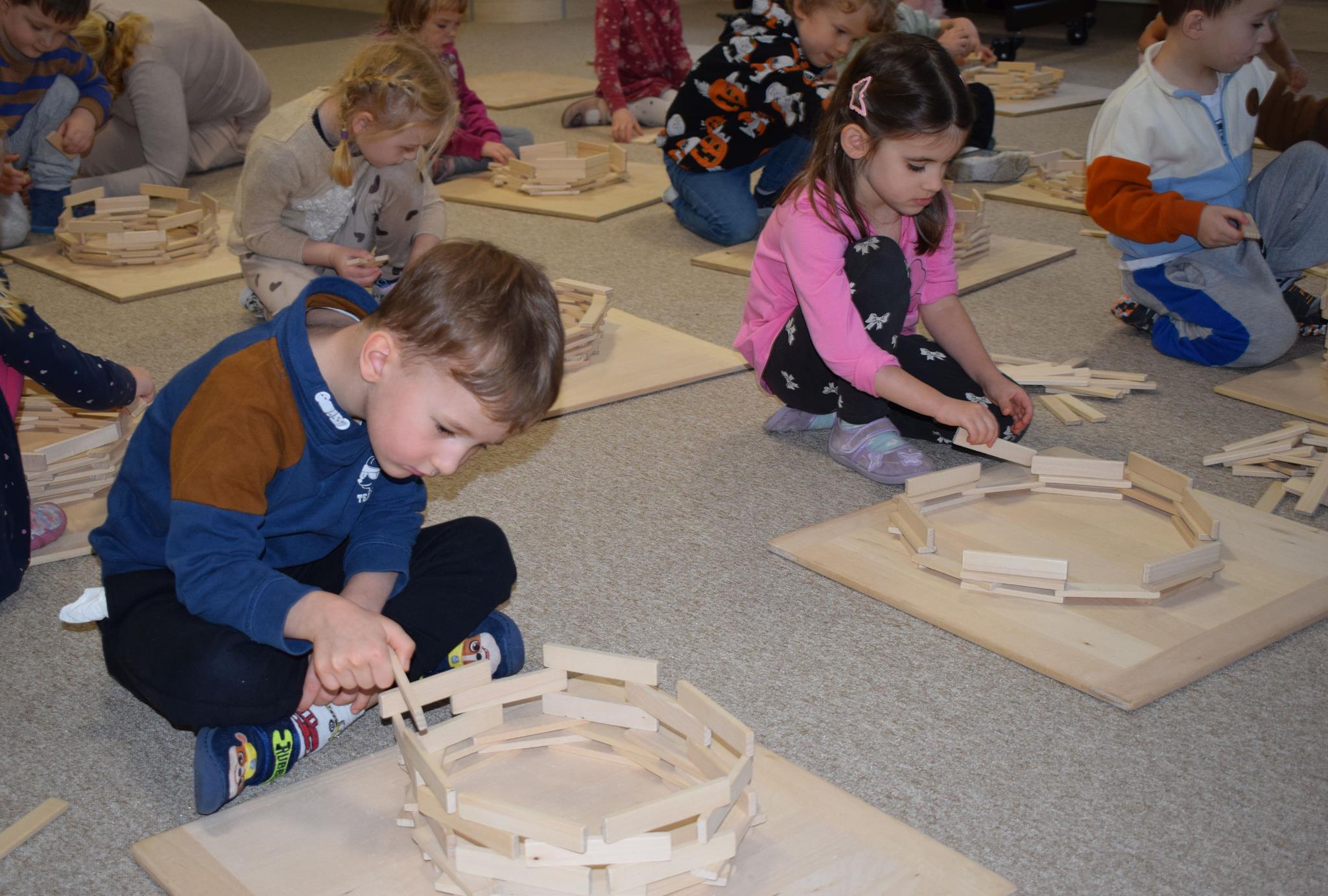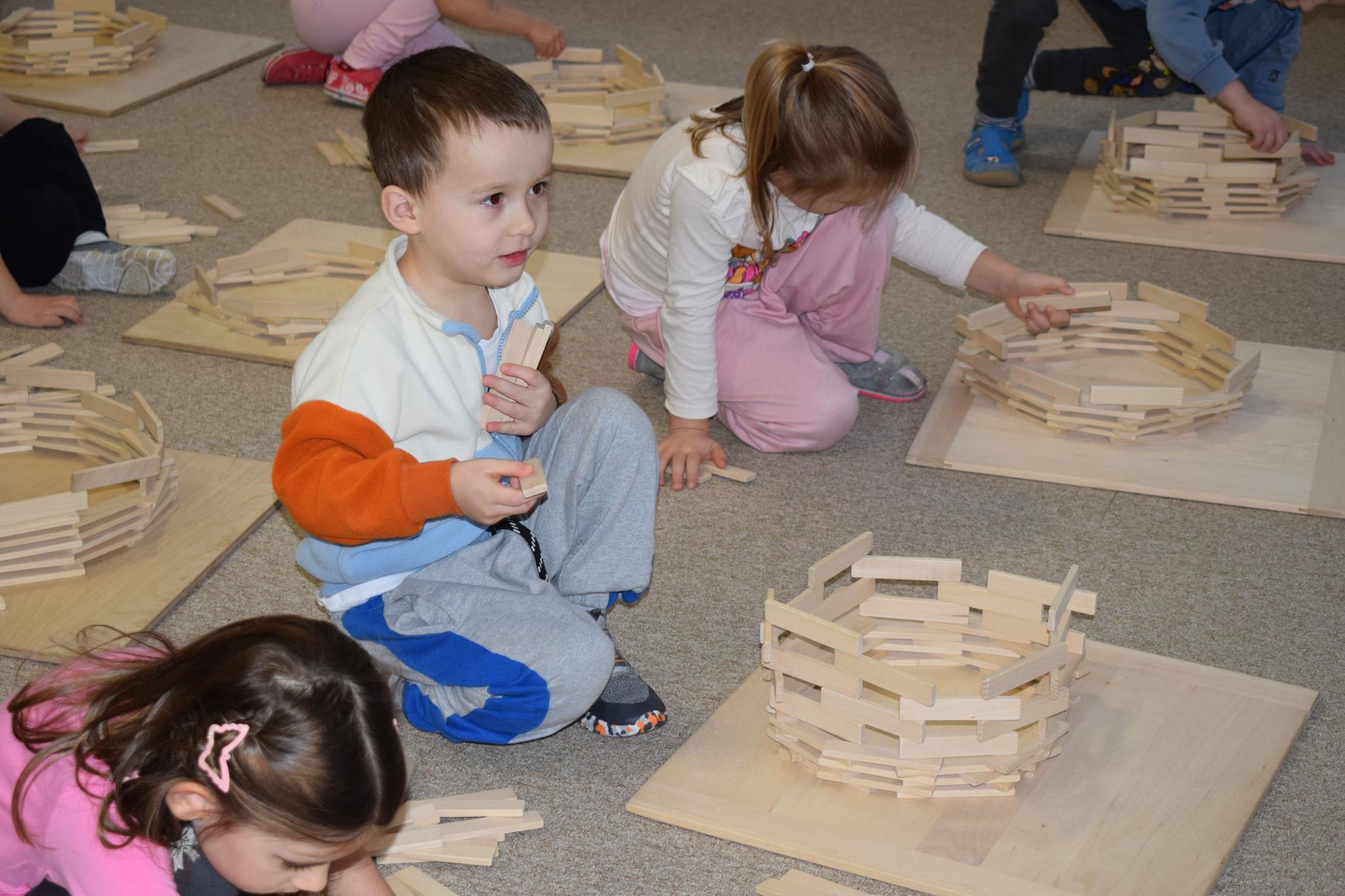 Po raz kolejny w tym roku dzieci uczestniczyły w warsztatach Małego Architekta. Wznosiły budowle pod czujnym okiem Pana Kreatka, musiały się wykazać umiejętnością uważnego słuchania, znajomością podstaw matematyki, a także zmysłem estetycznym, inicjatywą i umiejętnościami organizacyjnymi. Na pierwszy ogień poszły podstawowe konstrukcje geometryczne, takie jak trójkąty, kwadraty i koła. Motylki próbowały swoich sił we wznoszeniu budowli przypominającej rzymskie koloseum. Starszaki reprezentując wyższy poziom umiejętności, bo przecież to już trzeci rok, jak szlifują wymienione umiejętności, wznosiły budowle przypominające te z Rynku Starego Miasta w stolicy.