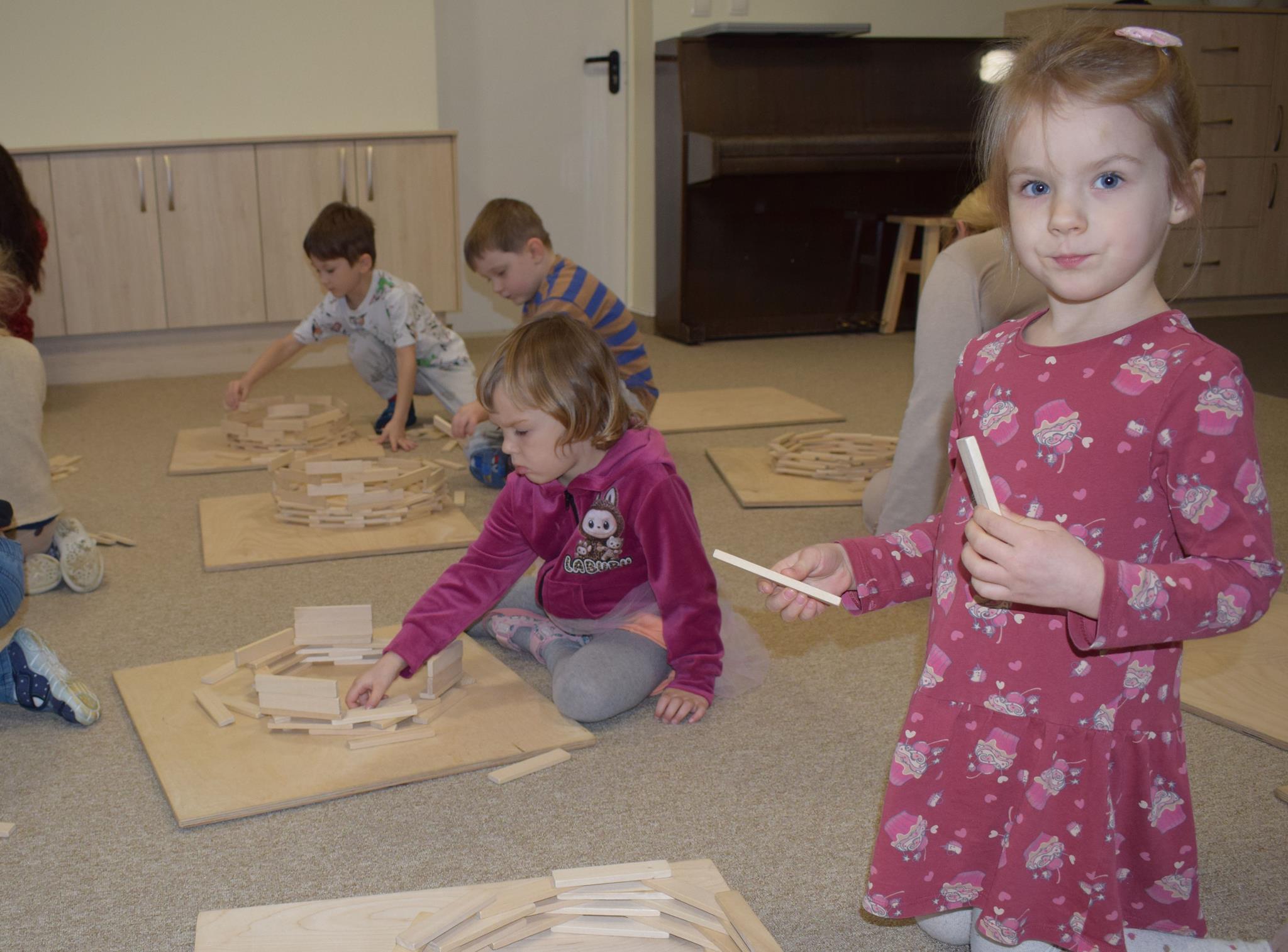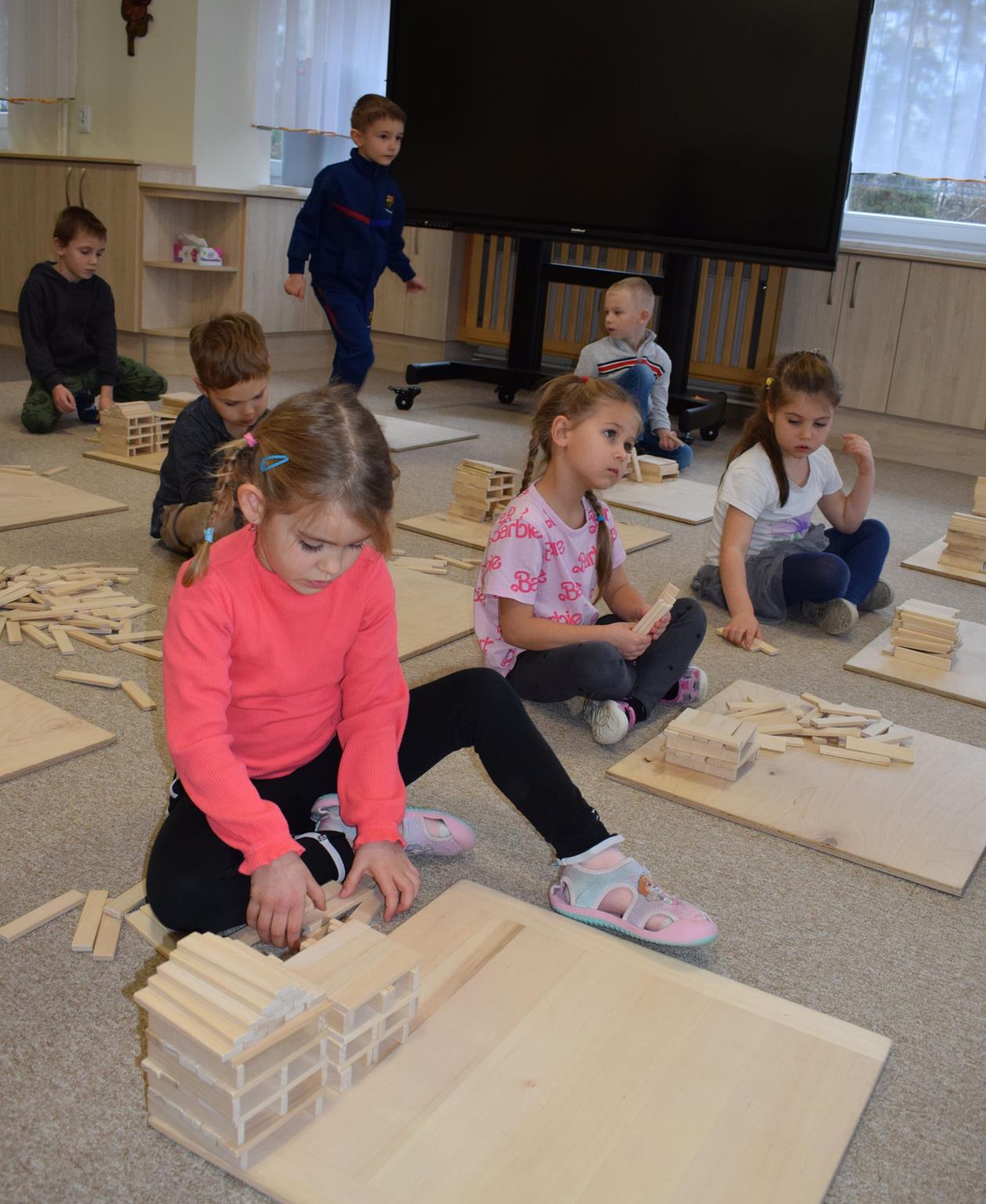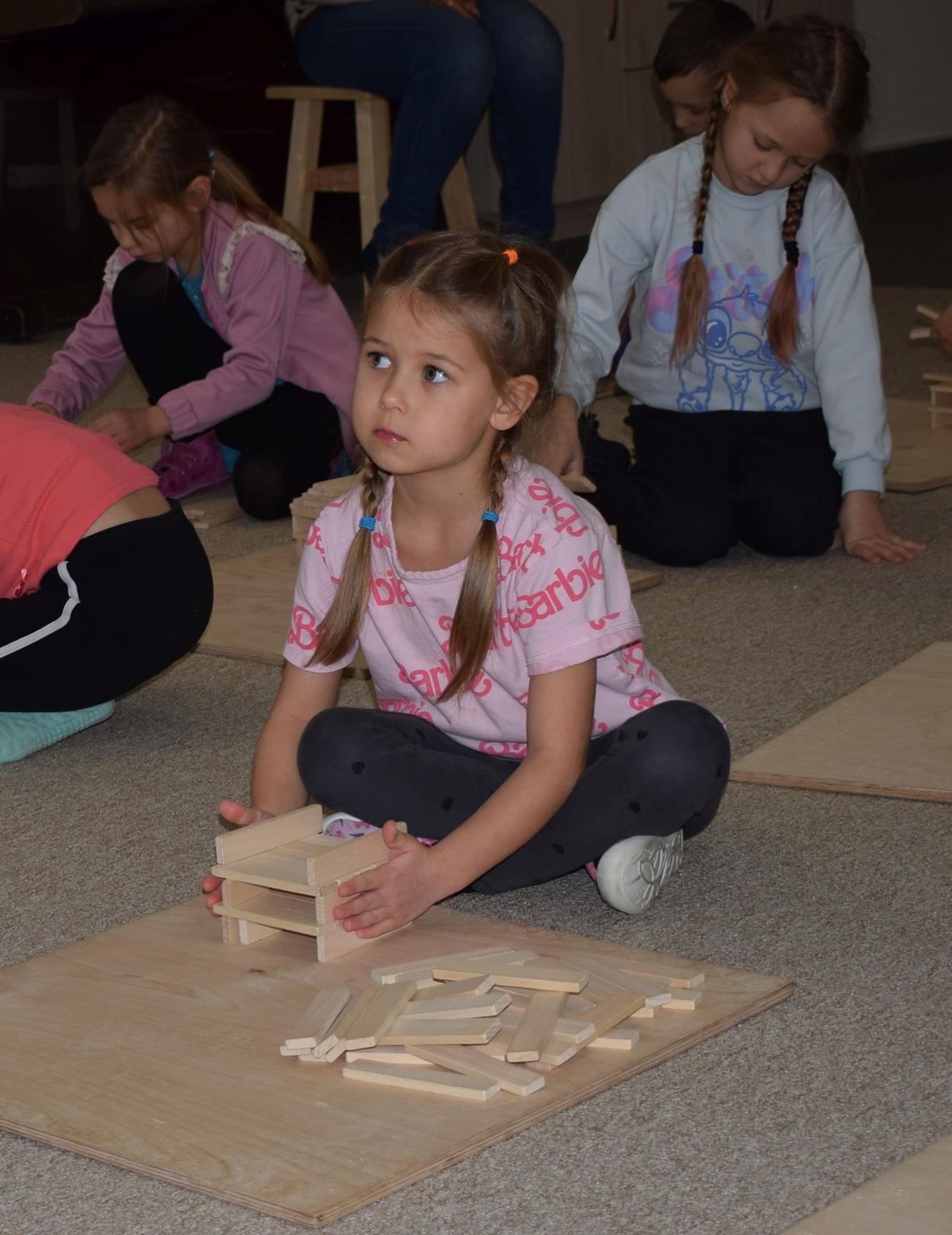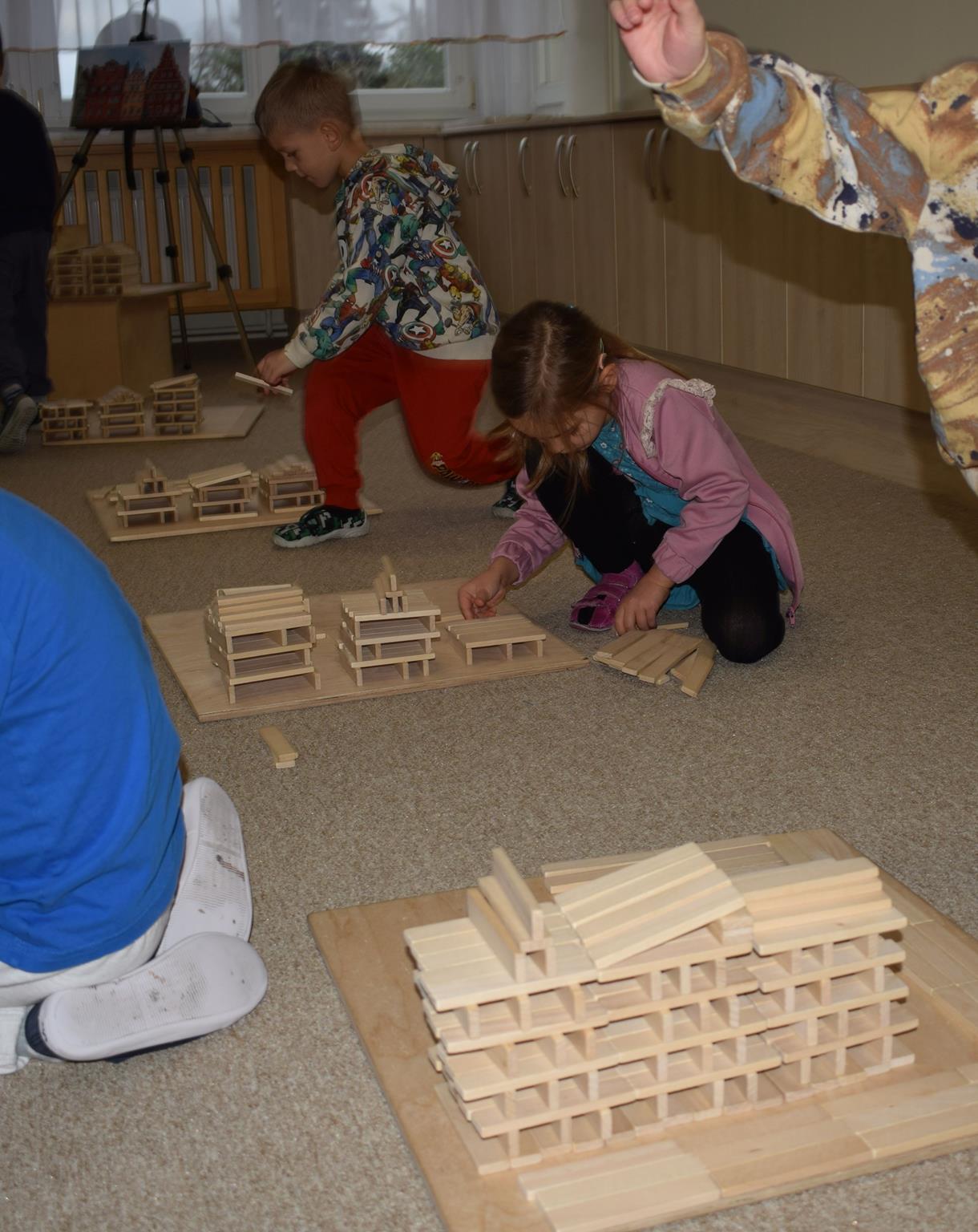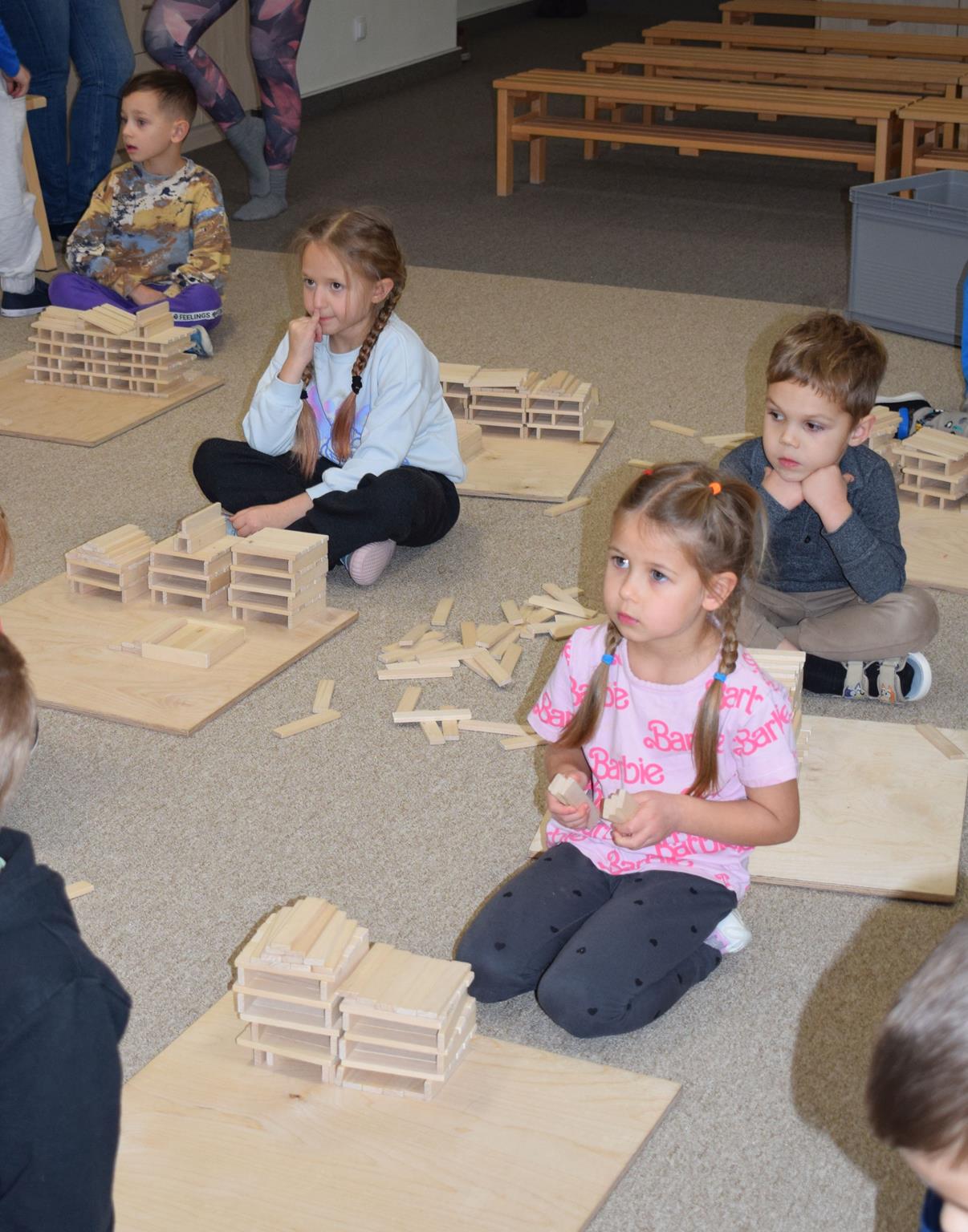 Po raz kolejny w tym roku dzieci uczestniczyły w warsztatach Małego Architekta. Wznosiły budowle pod czujnym okiem Pana Kreatka, musiały się wykazać umiejętnością uważnego słuchania, znajomością podstaw matematyki, a także zmysłem estetycznym, inicjatywą i umiejętnościami organizacyjnymi. Na pierwszy ogień poszły podstawowe konstrukcje geometryczne, takie jak trójkąty, kwadraty i koła. Motylki próbowały swoich sił we wznoszeniu budowli przypominającej rzymskie koloseum. Starszaki reprezentując wyższy poziom umiejętności, bo przecież to już trzeci rok, jak szlifują wymienione umiejętności, wznosiły budowle przypominające te z Rynku Starego Miasta w stolicy.
