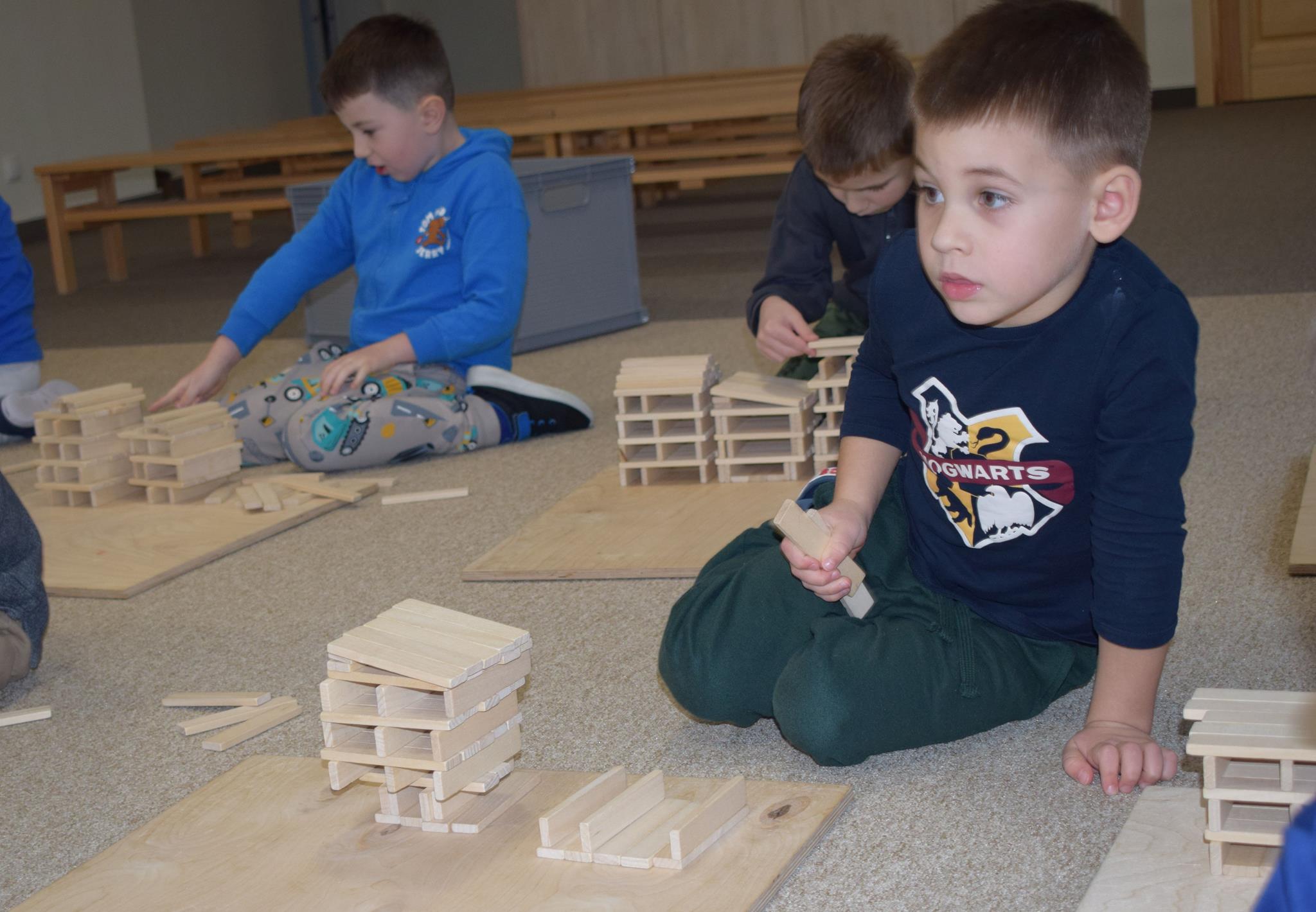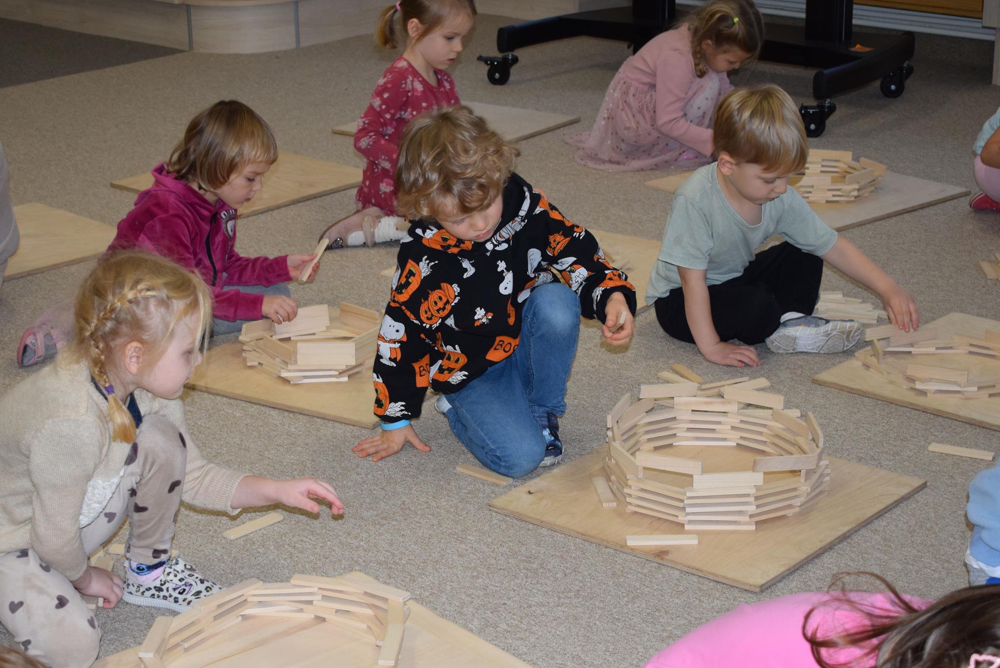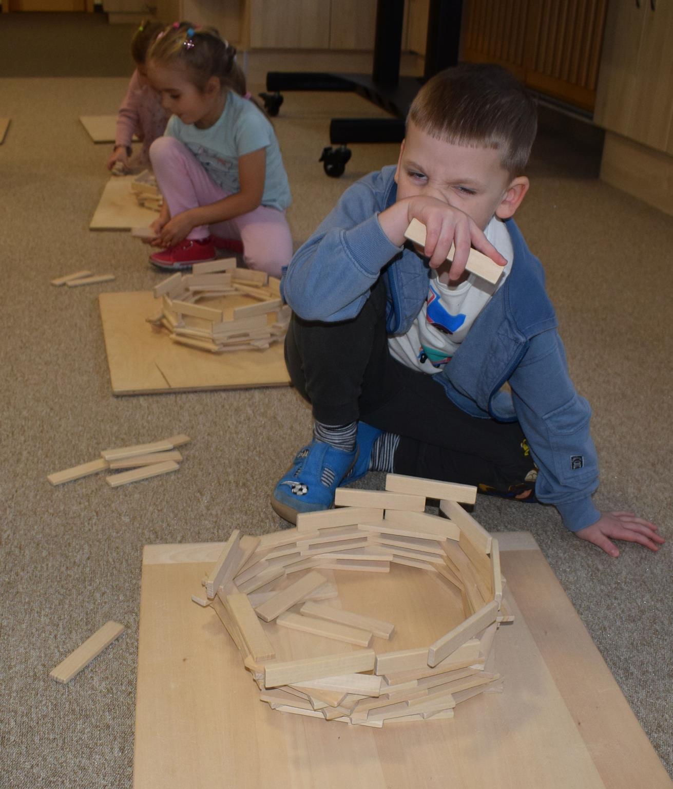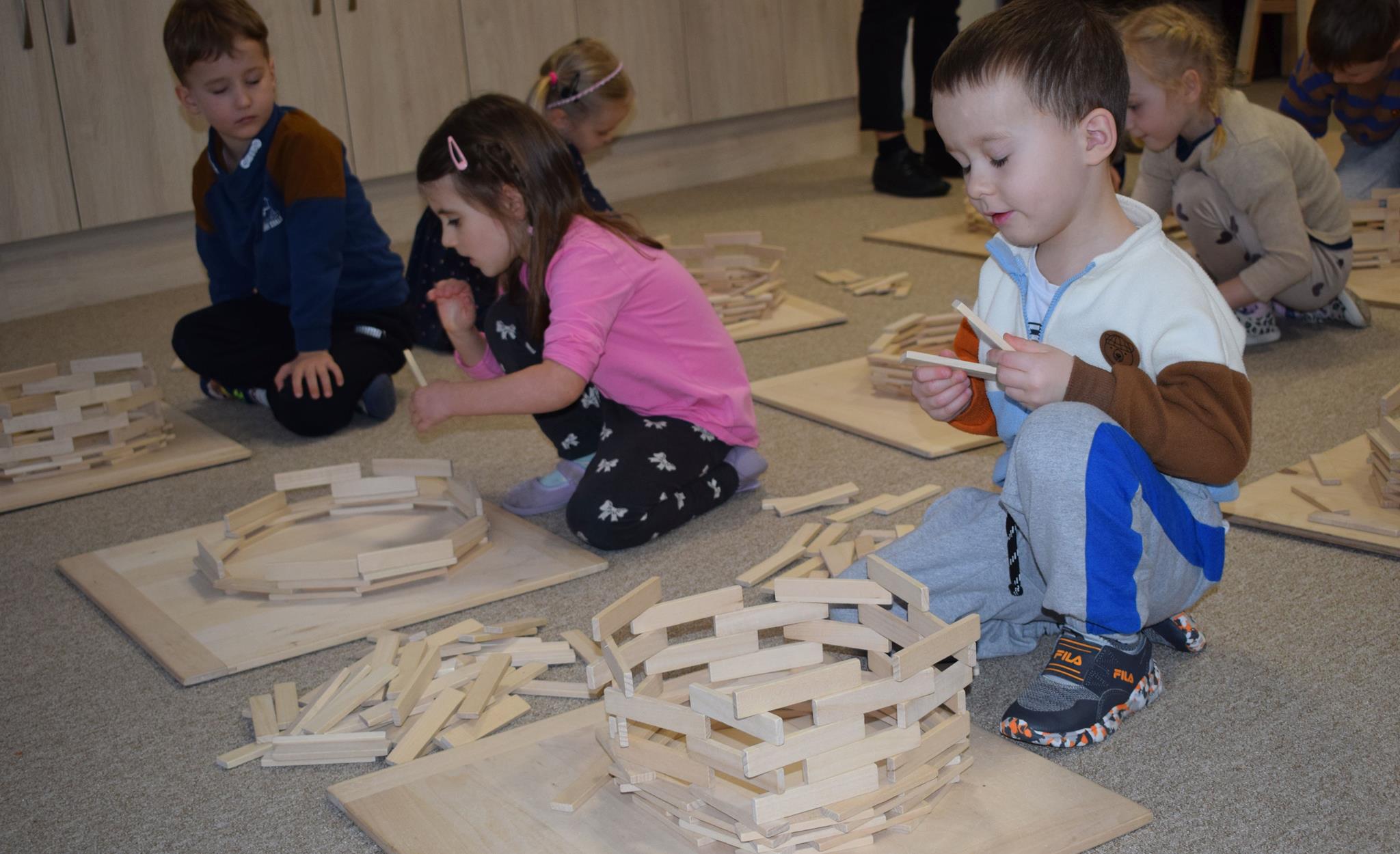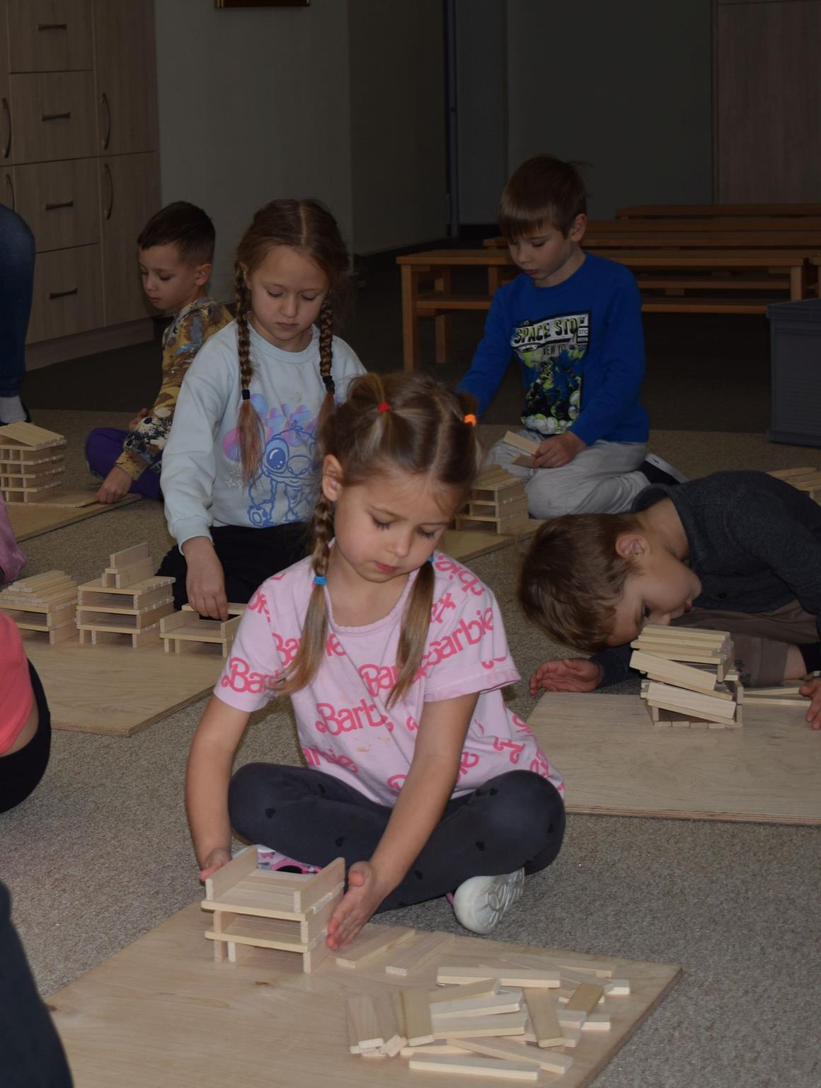 Po raz kolejny w tym roku dzieci uczestniczyły w warsztatach Małego Architekta. Wznosiły budowle pod czujnym okiem Pana Kreatka, musiały się wykazać umiejętnością uważnego słuchania, znajomością podstaw matematyki, a także zmysłem estetycznym, inicjatywą i umiejętnościami organizacyjnymi. Na pierwszy ogień poszły podstawowe konstrukcje geometryczne, takie jak trójkąty, kwadraty i koła. Motylki próbowały swoich sił we wznoszeniu budowli przypominającej rzymskie koloseum. Starszaki reprezentując wyższy poziom umiejętności, bo przecież to już trzeci rok, jak szlifują wymienione umiejętności, wznosiły budowle przypominające te z Rynku Starego Miasta w stolicy.
