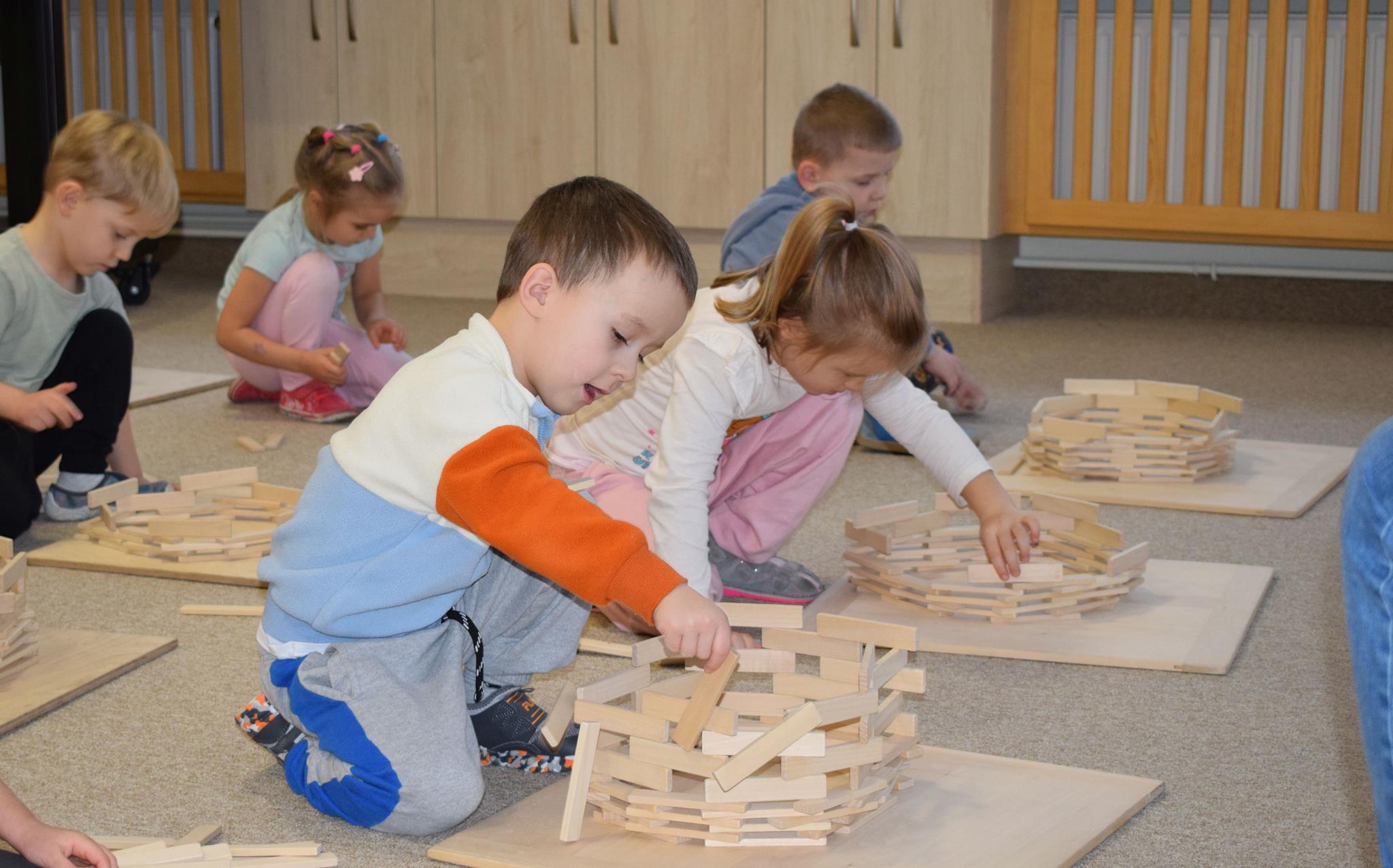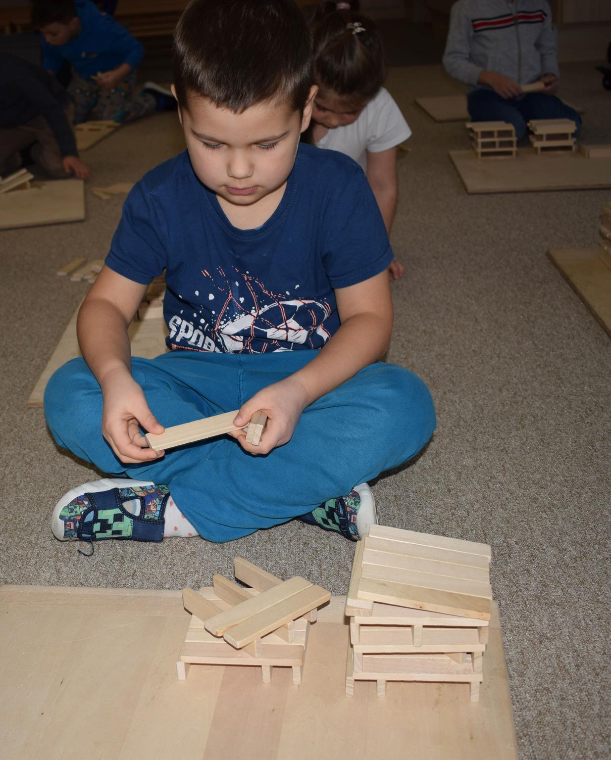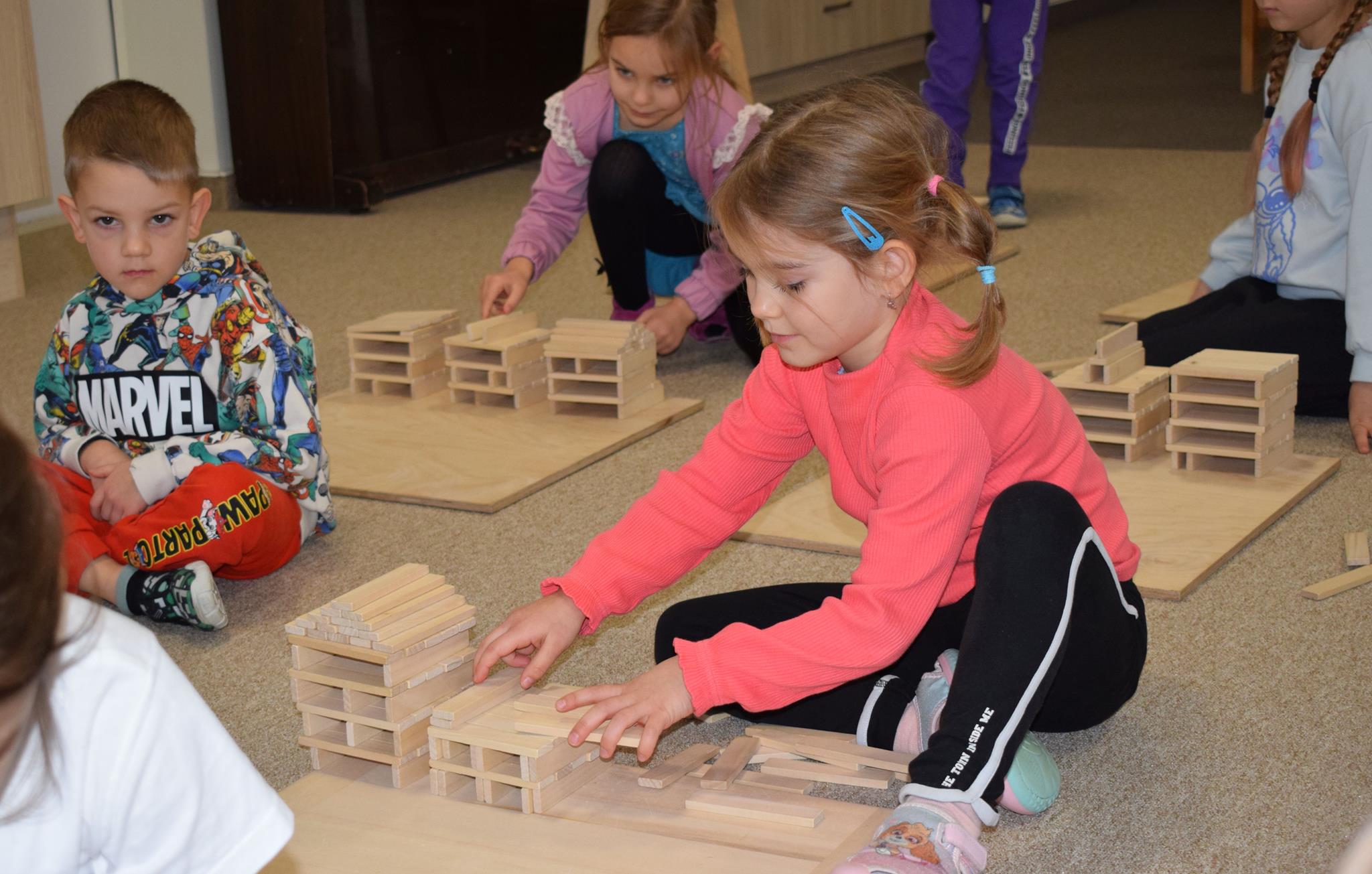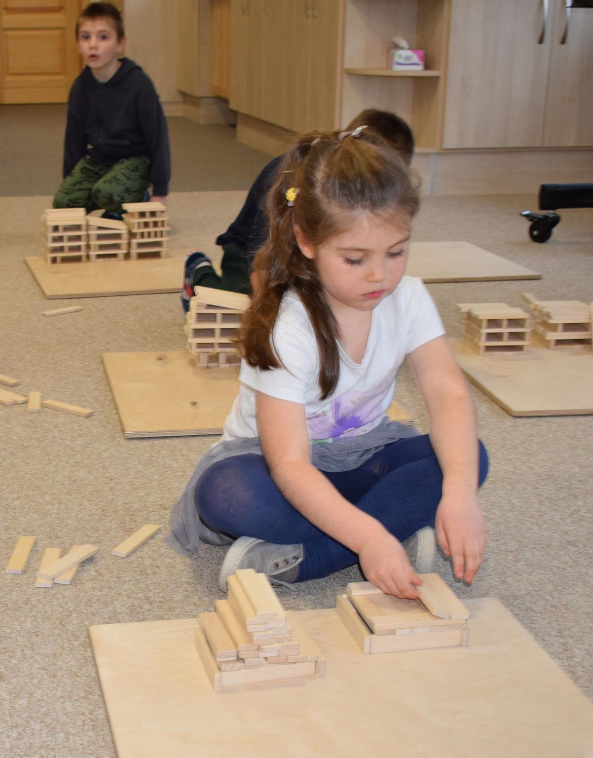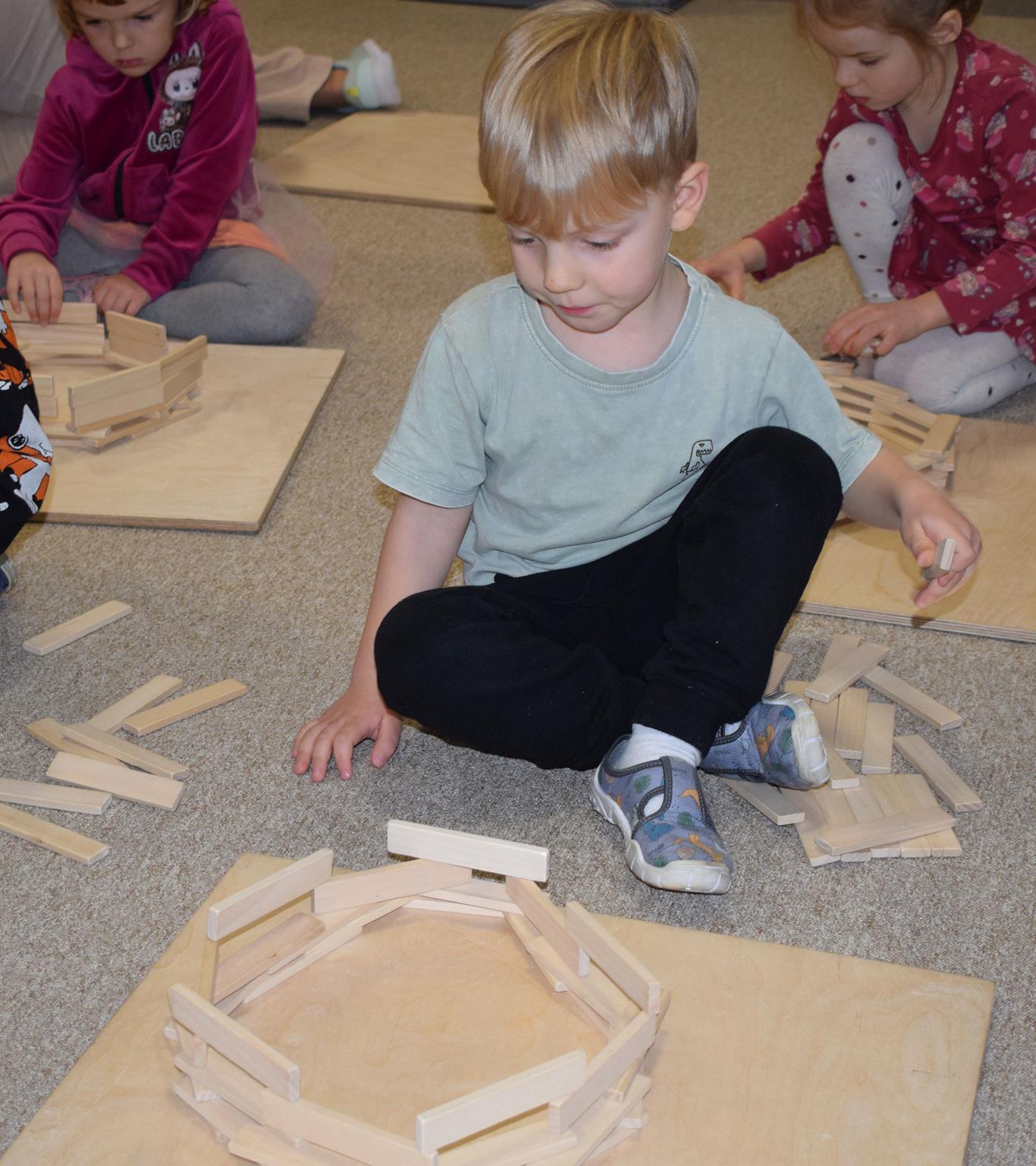 Po raz kolejny w tym roku dzieci uczestniczyły w warsztatach Małego Architekta. Wznosiły budowle pod czujnym okiem Pana Kreatka, musiały się wykazać umiejętnością uważnego słuchania, znajomością podstaw matematyki, a także zmysłem estetycznym, inicjatywą i umiejętnościami organizacyjnymi. Na pierwszy ogień poszły podstawowe konstrukcje geometryczne, takie jak trójkąty, kwadraty i koła. Motylki próbowały swoich sił we wznoszeniu budowli przypominającej rzymskie koloseum. Starszaki reprezentując wyższy poziom umiejętności, bo przecież to już trzeci rok, jak szlifują wymienione umiejętności, wznosiły budowle przypominające te z Rynku Starego Miasta w stolicy.