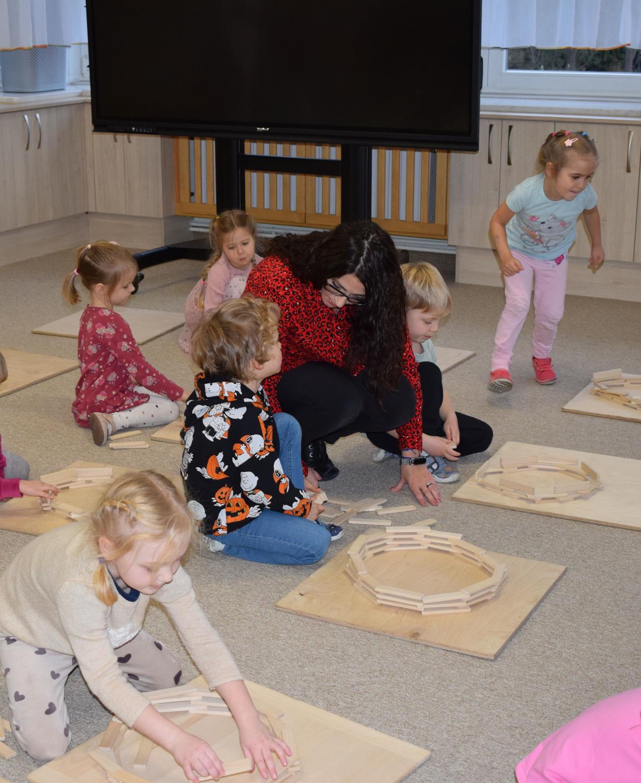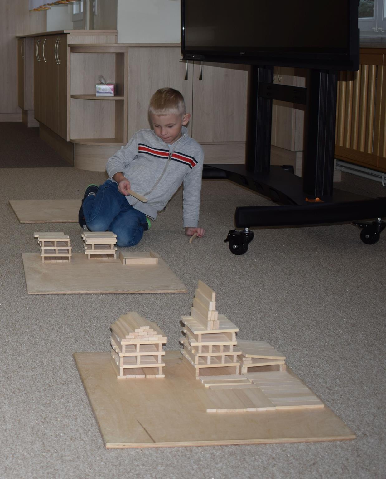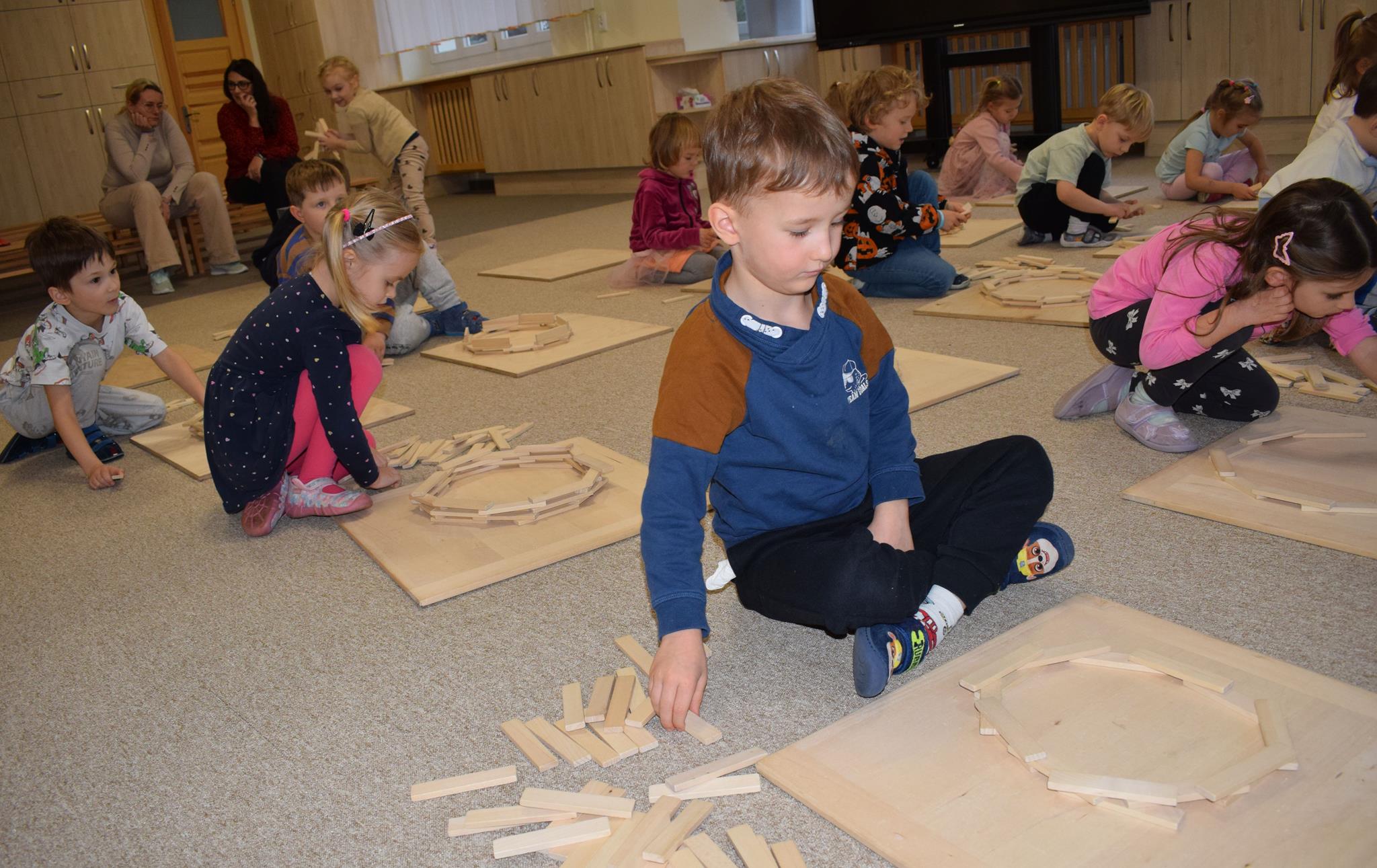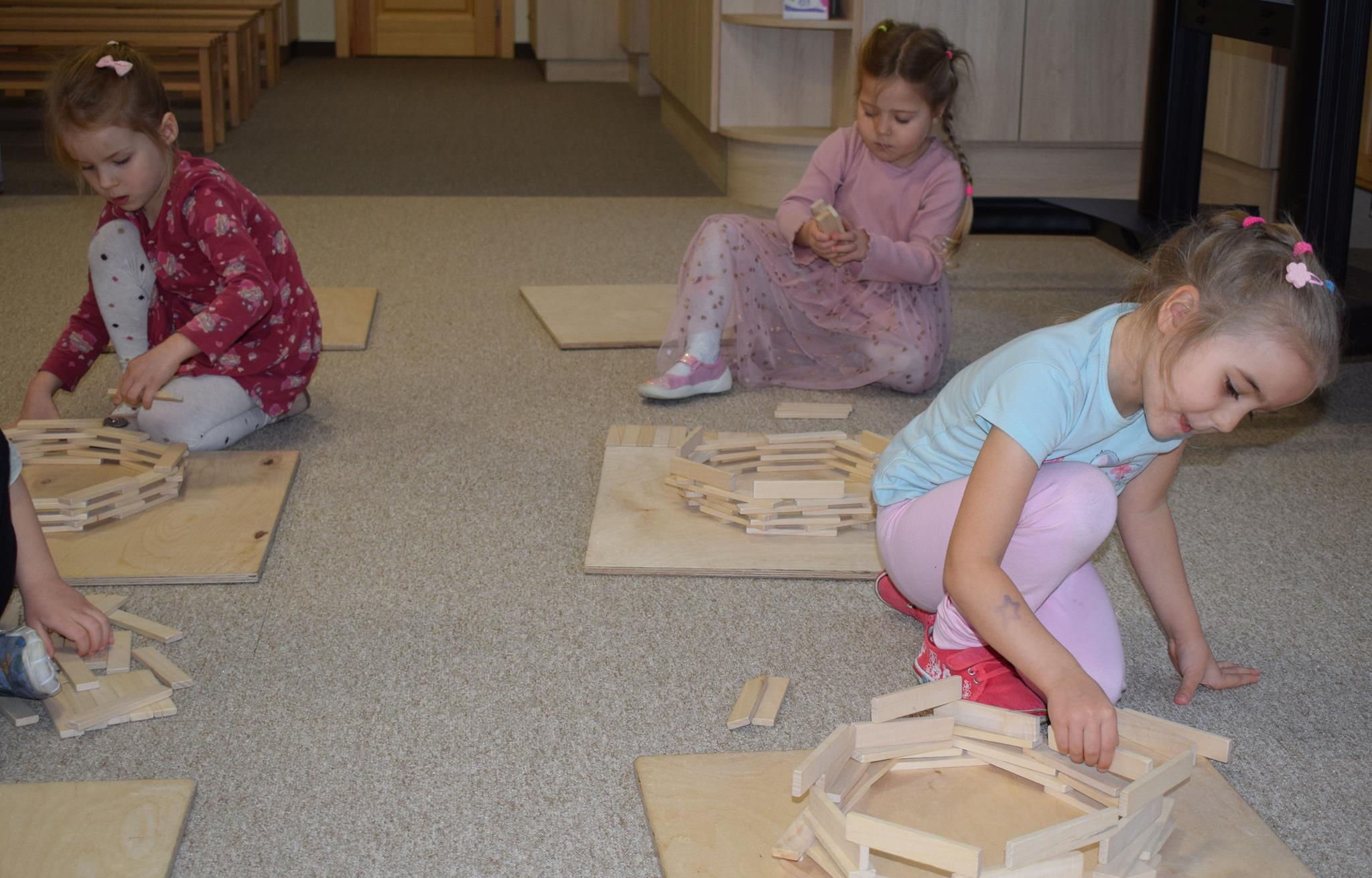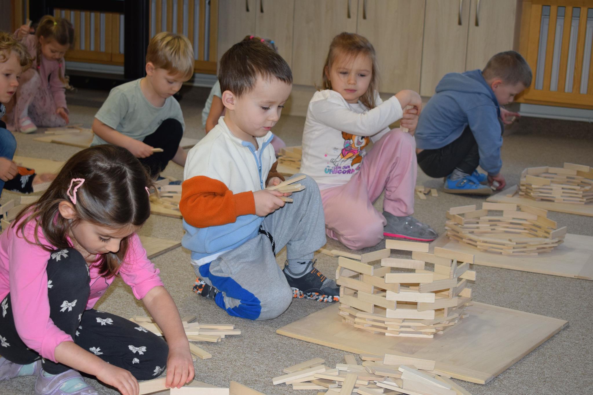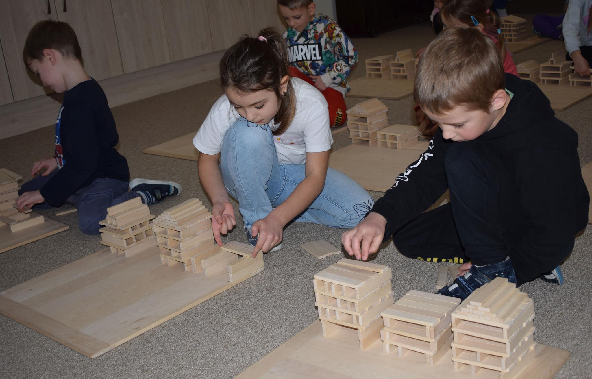 Po raz kolejny w tym roku dzieci uczestniczyły w warsztatach Małego Architekta. Wznosiły budowle pod czujnym okiem Pana Kreatka, musiały się wykazać umiejętnością uważnego słuchania, znajomością podstaw matematyki, a także zmysłem estetycznym, inicjatywą i umiejętnościami organizacyjnymi. Na pierwszy ogień poszły podstawowe konstrukcje geometryczne, takie jak trójkąty, kwadraty i koła. Motylki próbowały swoich sił we wznoszeniu budowli przypominającej rzymskie koloseum. Starszaki reprezentując wyższy poziom umiejętności, bo przecież to już trzeci rok, jak szlifują wymienione umiejętności, wznosiły budowle przypominające te z Rynku Starego Miasta w stolicy.