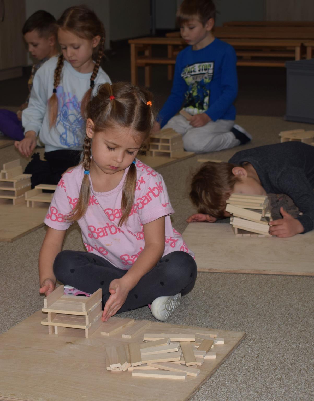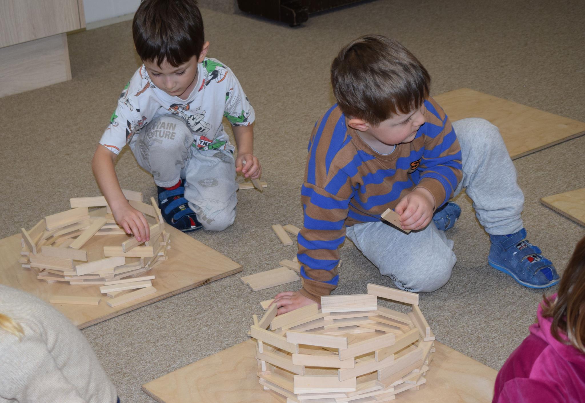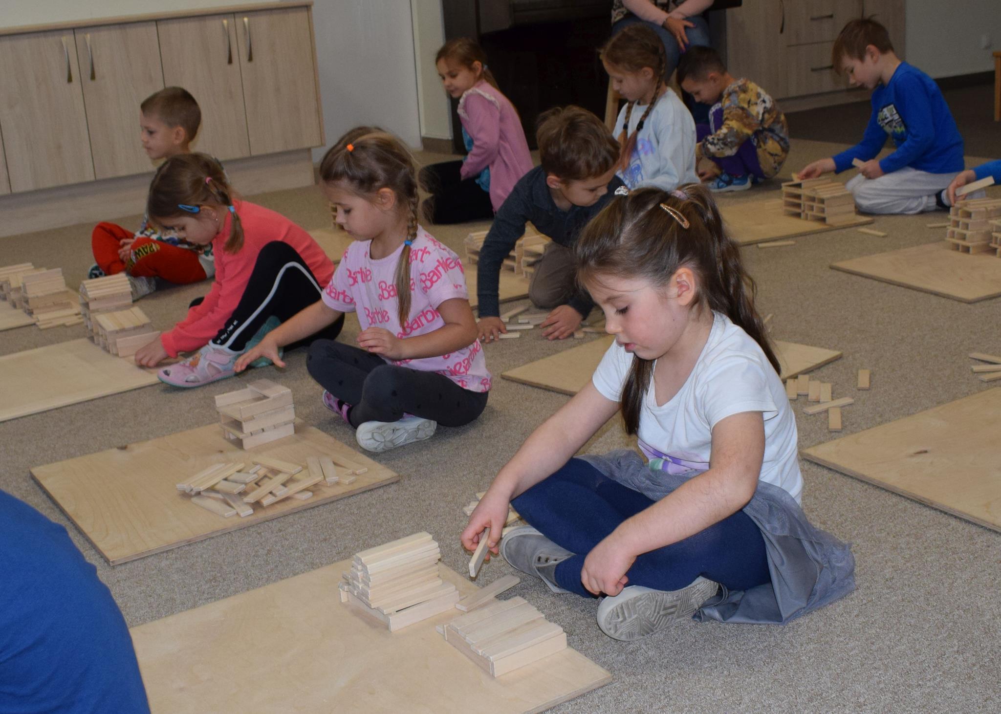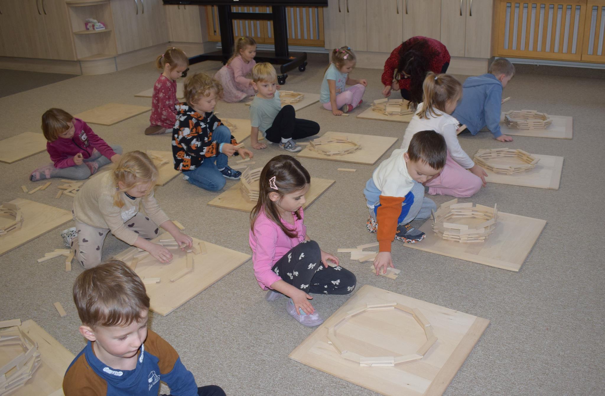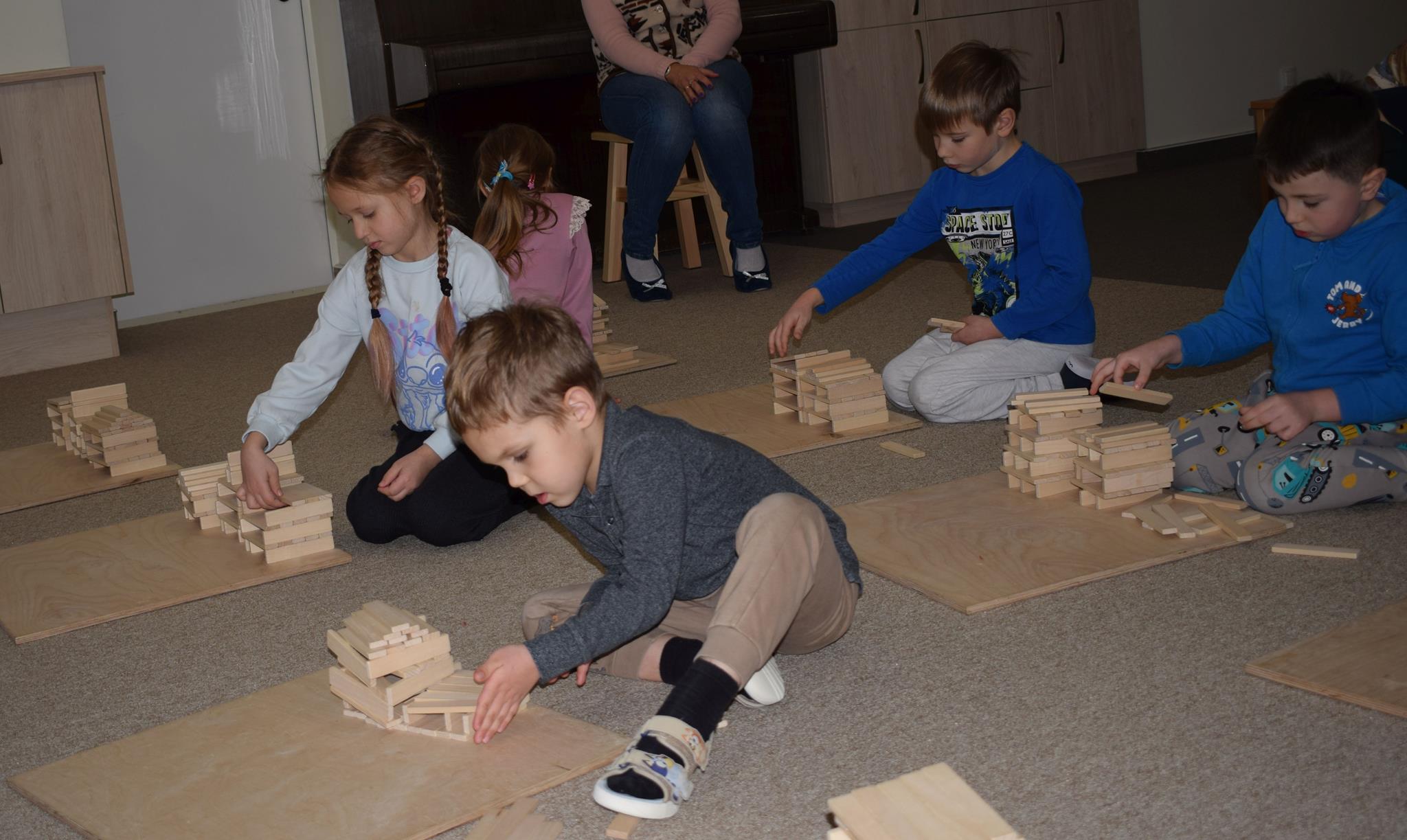 Po raz kolejny w tym roku dzieci uczestniczyły w warsztatach Małego Architekta. Wznosiły budowle pod czujnym okiem Pana Kreatka, musiały się wykazać umiejętnością uważnego słuchania, znajomością podstaw matematyki, a także zmysłem estetycznym, inicjatywą i umiejętnościami organizacyjnymi. Na pierwszy ogień poszły podstawowe konstrukcje geometryczne, takie jak trójkąty, kwadraty i koła. Motylki próbowały swoich sił we wznoszeniu budowli przypominającej rzymskie koloseum. Starszaki reprezentując wyższy poziom umiejętności, bo przecież to już trzeci rok, jak szlifują wymienione umiejętności, wznosiły budowle przypominające te z Rynku Starego Miasta w stolicy.