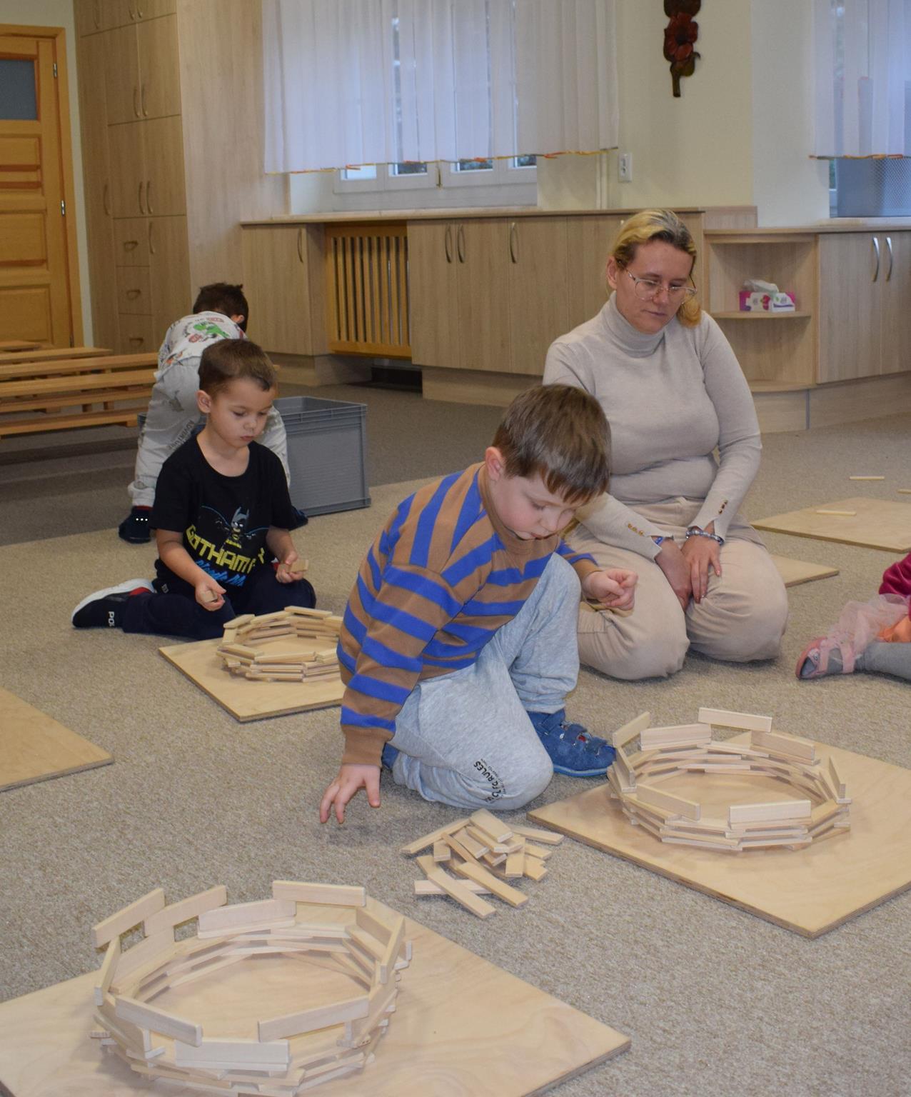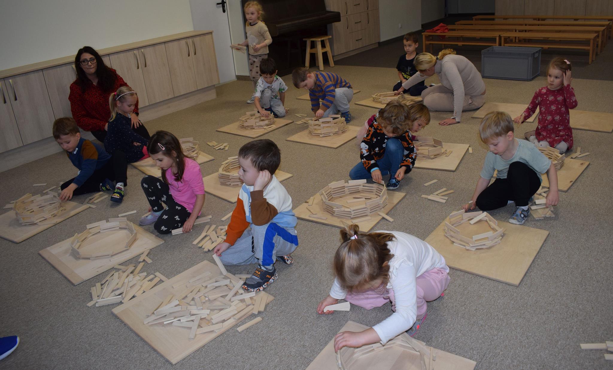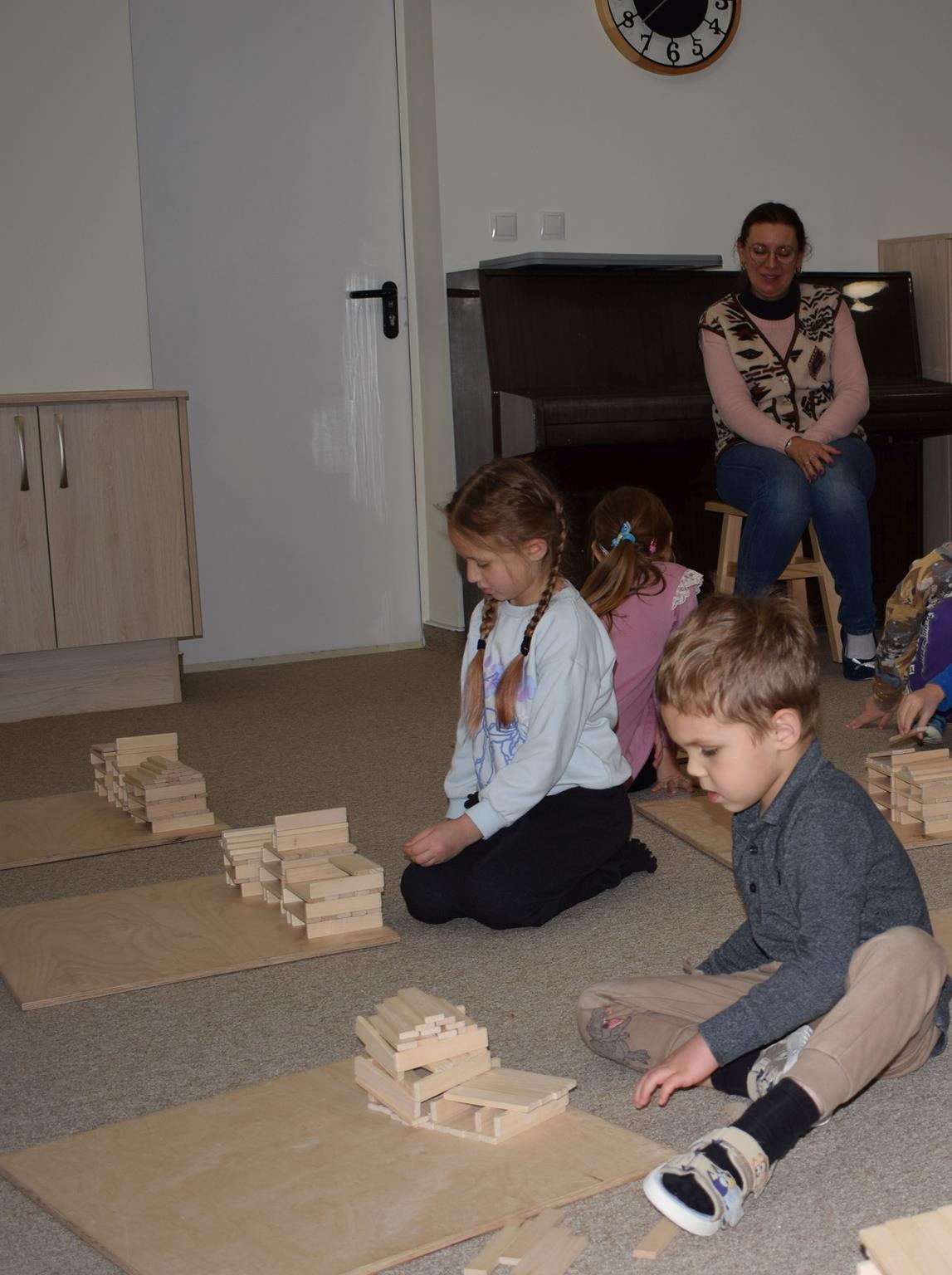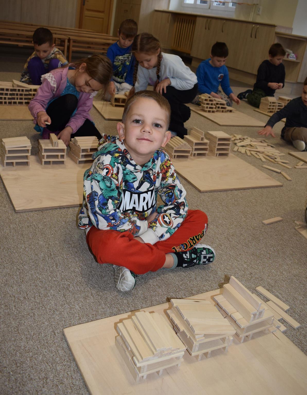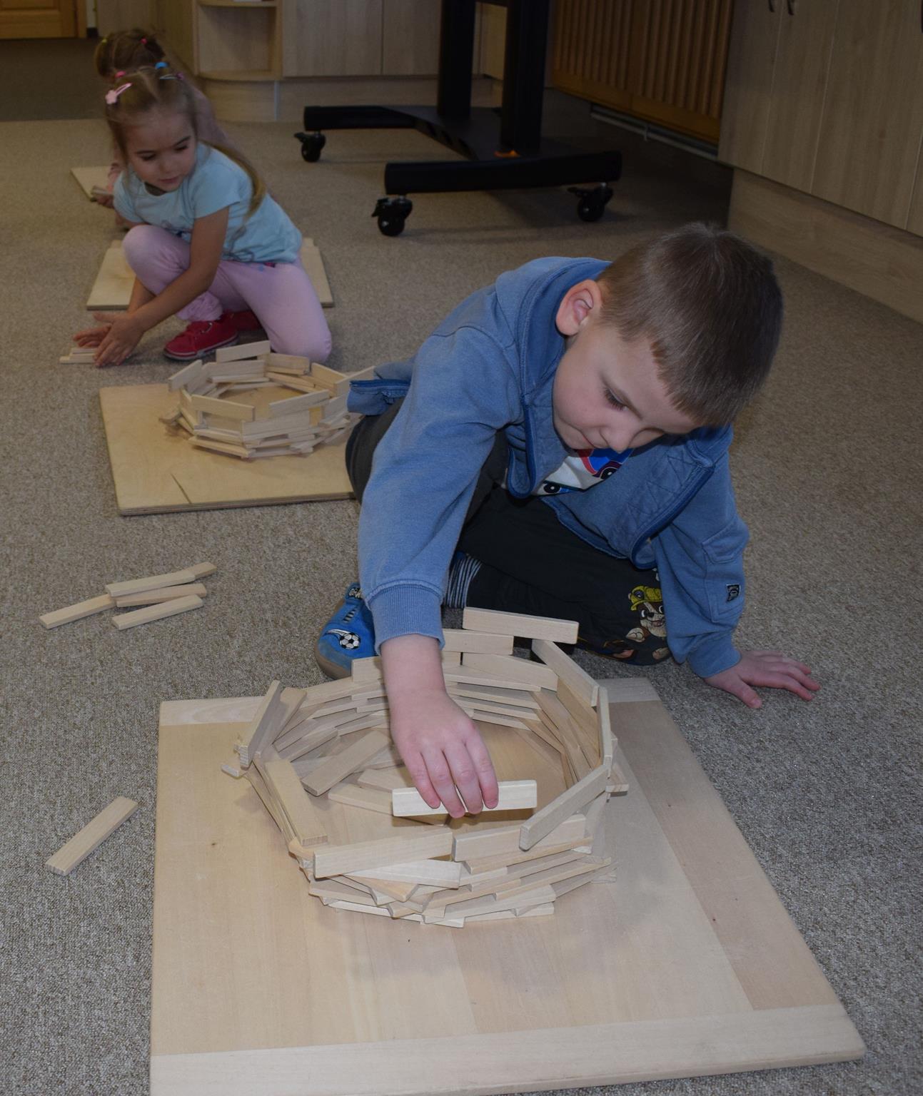 Po raz kolejny w tym roku dzieci uczestniczyły w warsztatach Małego Architekta. Wznosiły budowle pod czujnym okiem Pana Kreatka, musiały się wykazać umiejętnością uważnego słuchania, znajomością podstaw matematyki, a także zmysłem estetycznym, inicjatywą i umiejętnościami organizacyjnymi. Na pierwszy ogień poszły podstawowe konstrukcje geometryczne, takie jak trójkąty, kwadraty i koła. Motylki próbowały swoich sił we wznoszeniu budowli przypominającej rzymskie koloseum. Starszaki reprezentując wyższy poziom umiejętności, bo przecież to już trzeci rok, jak szlifują wymienione umiejętności, wznosiły budowle przypominające te z Rynku Starego Miasta w stolicy.