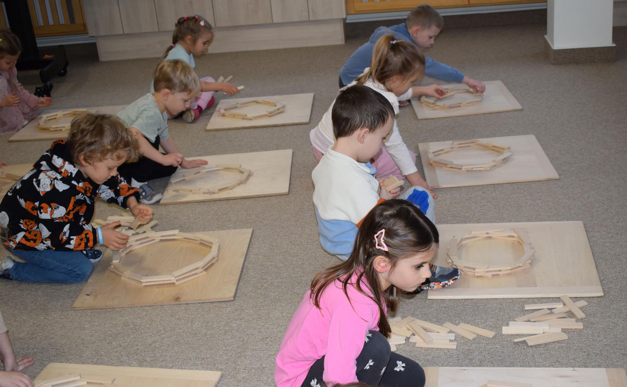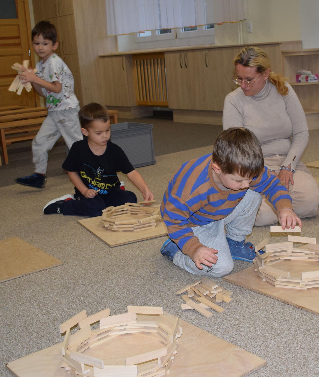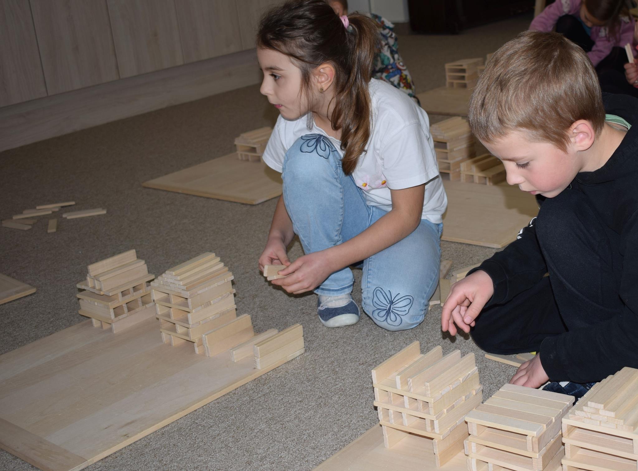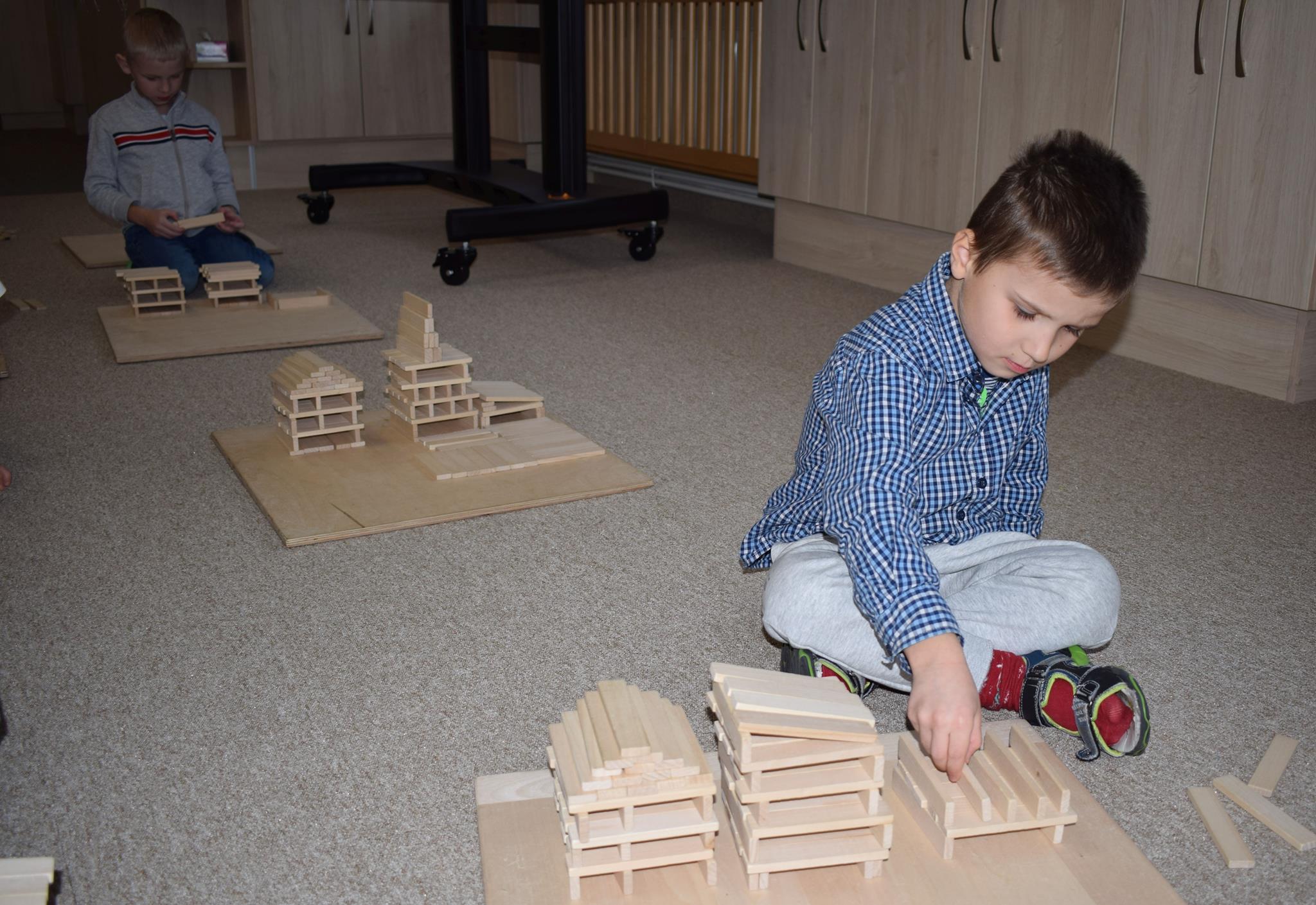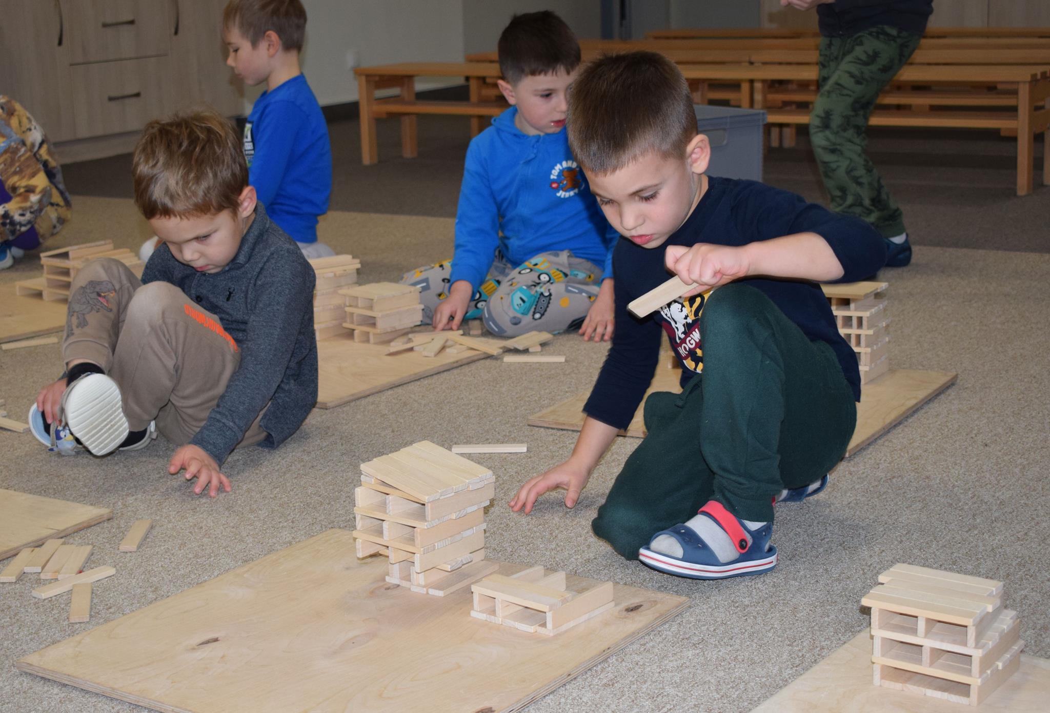 Po raz kolejny w tym roku dzieci uczestniczyły w warsztatach Małego Architekta. Wznosiły budowle pod czujnym okiem Pana Kreatka, musiały się wykazać umiejętnością uważnego słuchania, znajomością podstaw matematyki, a także zmysłem estetycznym, inicjatywą i umiejętnościami organizacyjnymi. Na pierwszy ogień poszły podstawowe konstrukcje geometryczne, takie jak trójkąty, kwadraty i koła. Motylki próbowały swoich sił we wznoszeniu budowli przypominającej rzymskie koloseum. Starszaki reprezentując wyższy poziom umiejętności, bo przecież to już trzeci rok, jak szlifują wymienione umiejętności, wznosiły budowle przypominające te z Rynku Starego Miasta w stolicy.