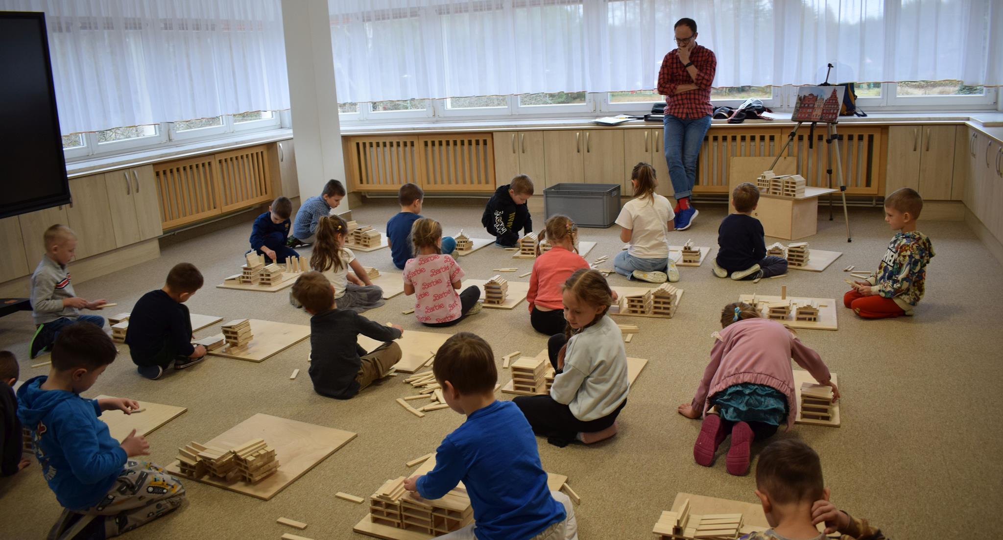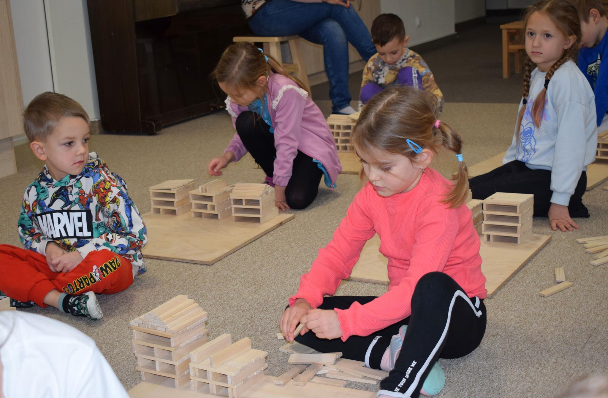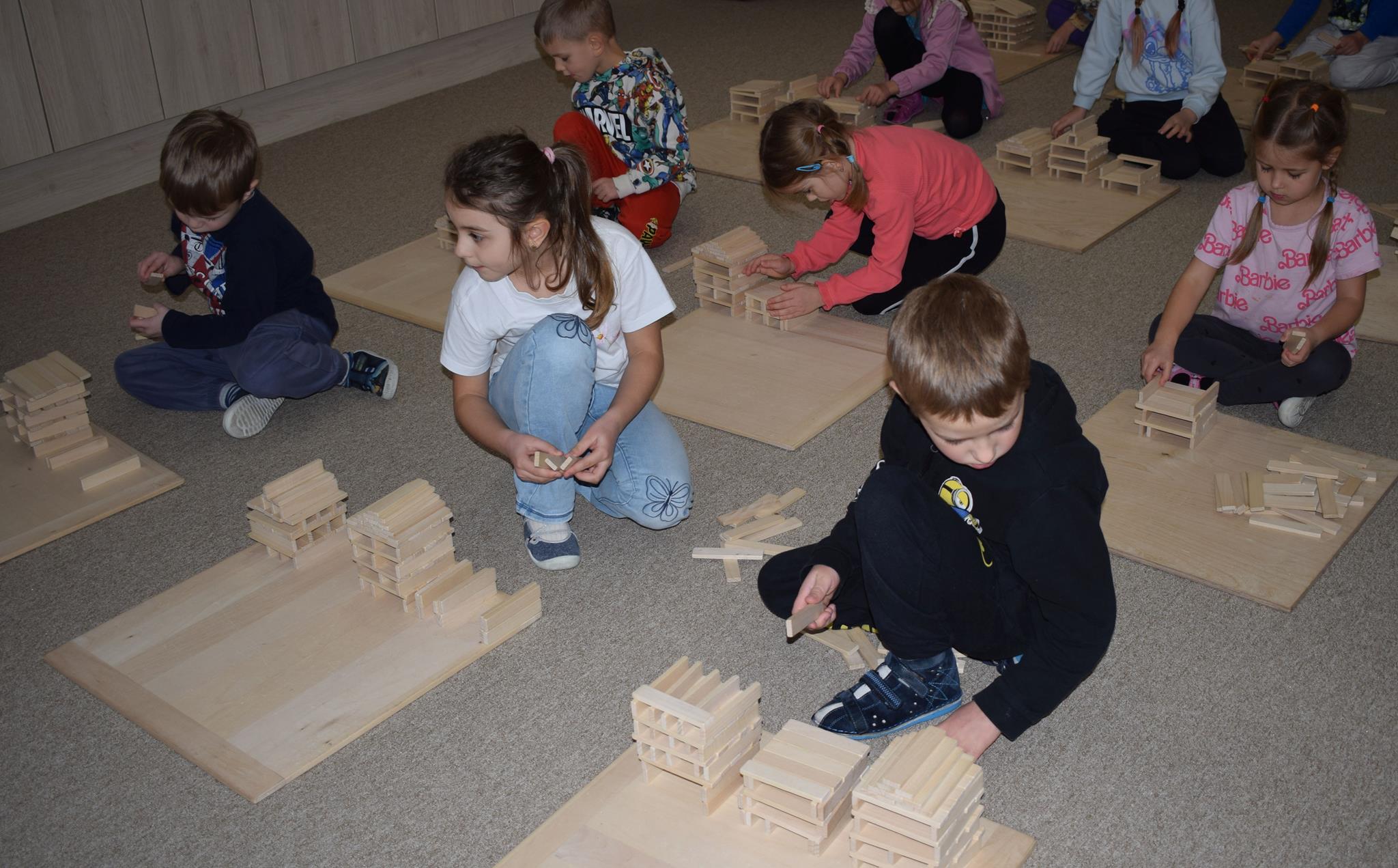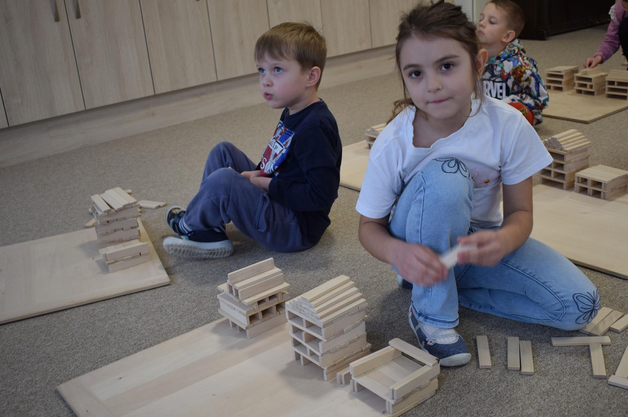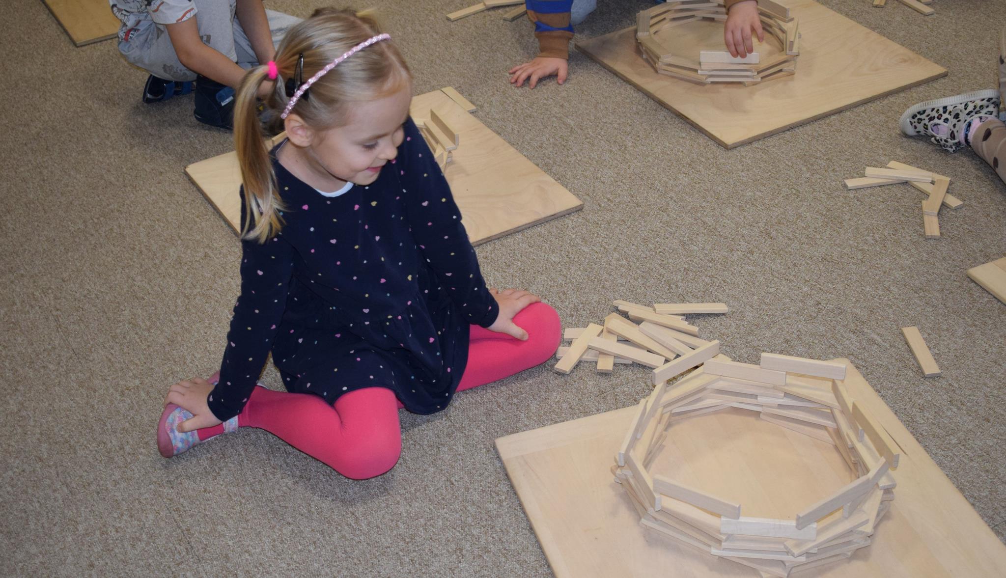 Po raz kolejny w tym roku dzieci uczestniczyły w warsztatach Małego Architekta. Wznosiły budowle pod czujnym okiem Pana Kreatka, musiały się wykazać umiejętnością uważnego słuchania, znajomością podstaw matematyki, a także zmysłem estetycznym, inicjatywą i umiejętnościami organizacyjnymi. Na pierwszy ogień poszły podstawowe konstrukcje geometryczne, takie jak trójkąty, kwadraty i koła. Motylki próbowały swoich sił we wznoszeniu budowli przypominającej rzymskie koloseum. Starszaki reprezentując wyższy poziom umiejętności, bo przecież to już trzeci rok, jak szlifują wymienione umiejętności, wznosiły budowle przypominające te z Rynku Starego Miasta w stolicy.