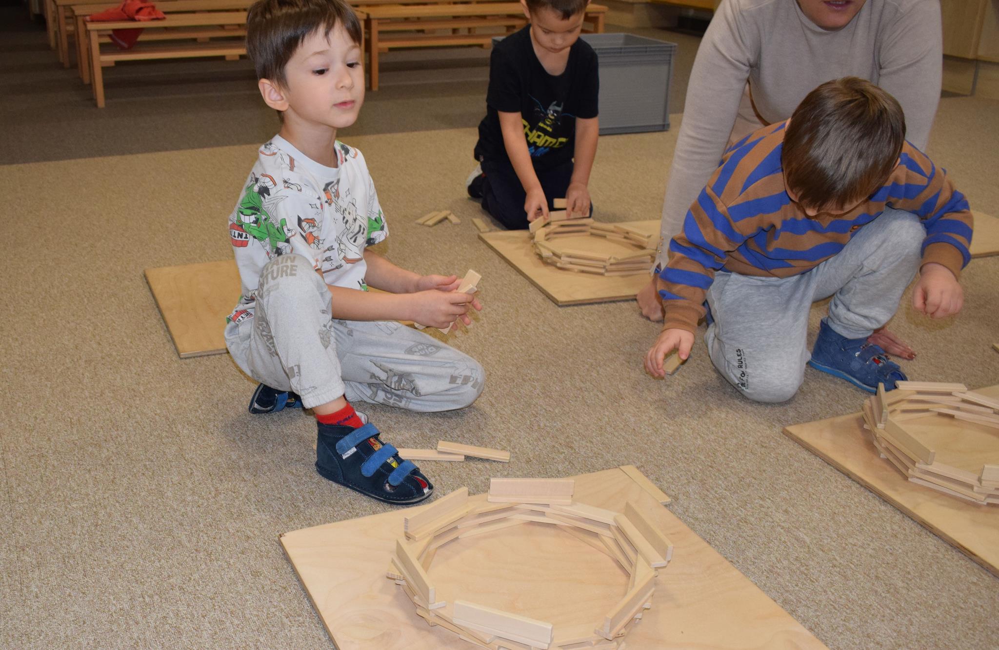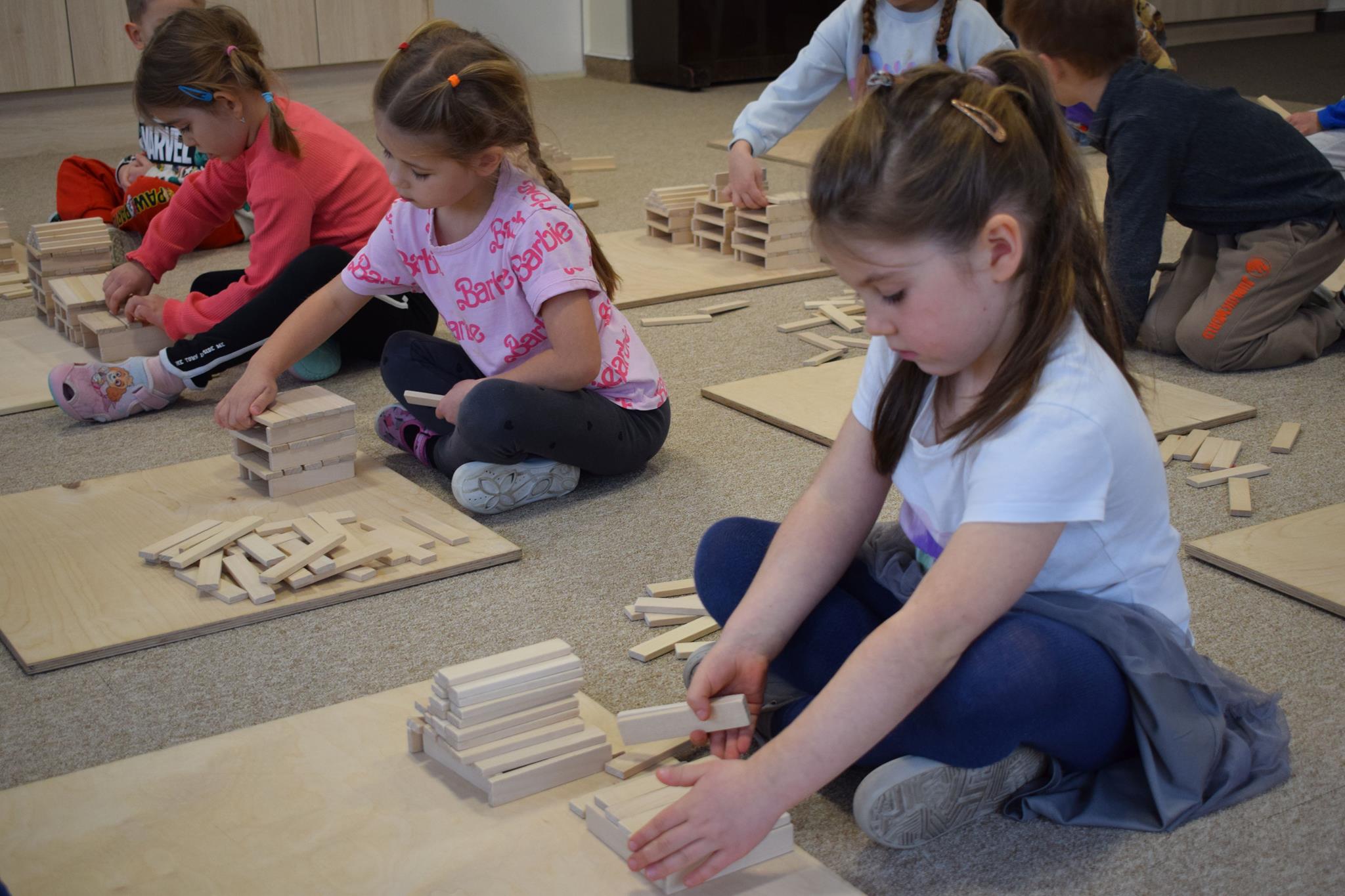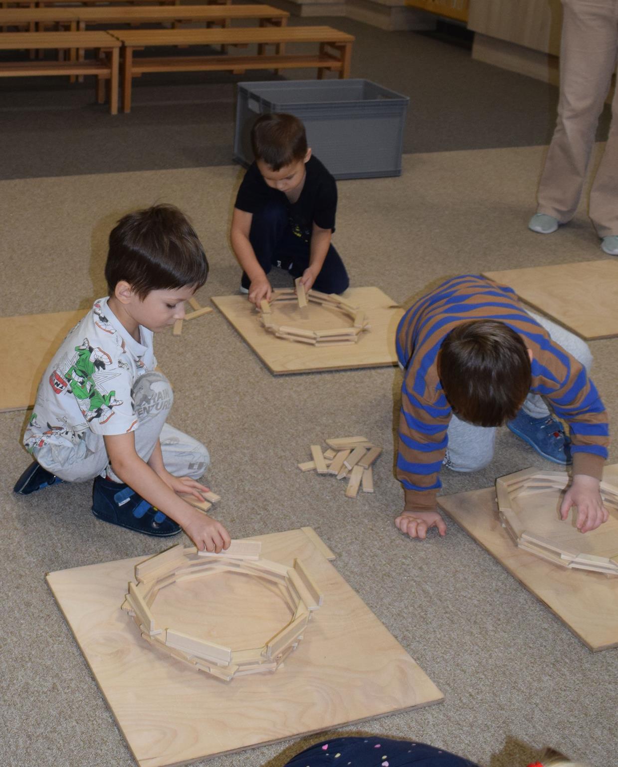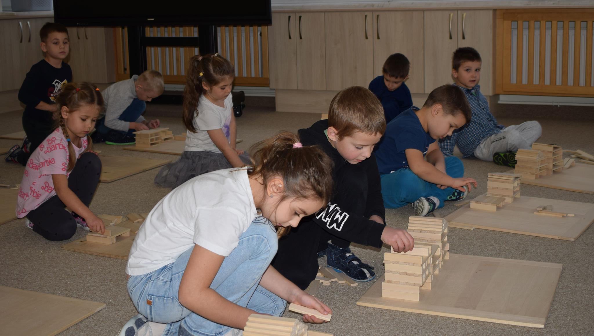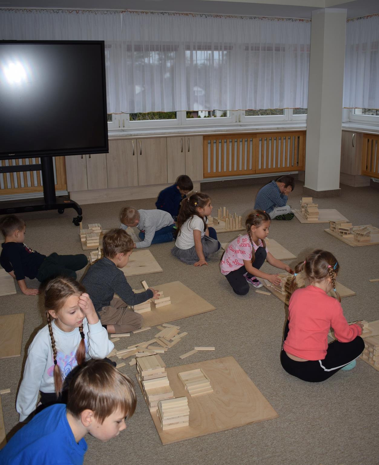 Po raz kolejny w tym roku dzieci uczestniczyły w warsztatach Małego Architekta. Wznosiły budowle pod czujnym okiem Pana Kreatka, musiały się wykazać umiejętnością uważnego słuchania, znajomością podstaw matematyki, a także zmysłem estetycznym, inicjatywą i umiejętnościami organizacyjnymi. Na pierwszy ogień poszły podstawowe konstrukcje geometryczne, takie jak trójkąty, kwadraty i koła. Motylki próbowały swoich sił we wznoszeniu budowli przypominającej rzymskie koloseum. Starszaki reprezentując wyższy poziom umiejętności, bo przecież to już trzeci rok, jak szlifują wymienione umiejętności, wznosiły budowle przypominające te z Rynku Starego Miasta w stolicy.