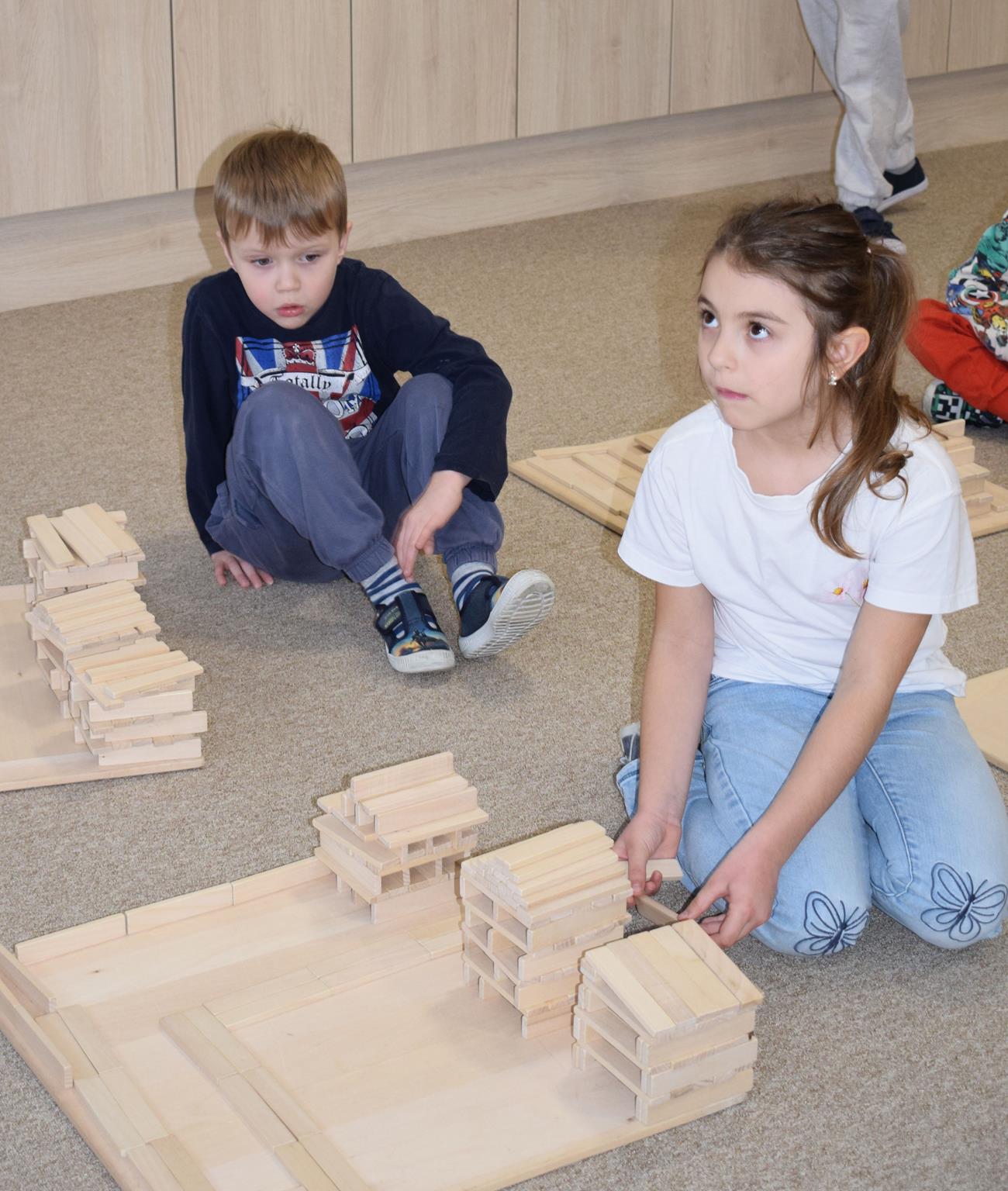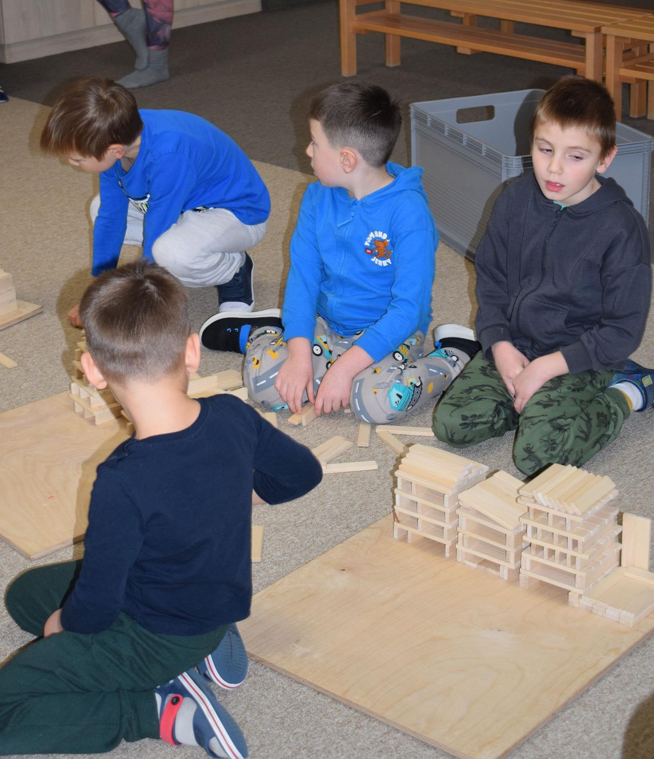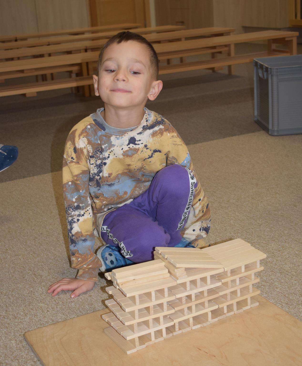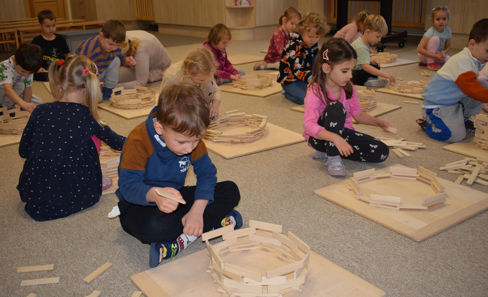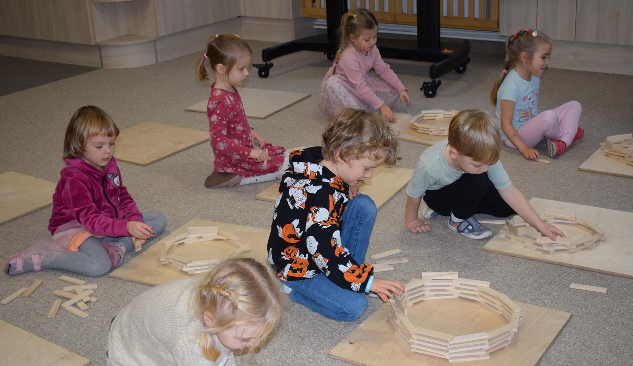 Po raz kolejny w tym roku dzieci uczestniczyły w warsztatach Małego Architekta. Wznosiły budowle pod czujnym okiem Pana Kreatka, musiały się wykazać umiejętnością uważnego słuchania, znajomością podstaw matematyki, a także zmysłem estetycznym, inicjatywą i umiejętnościami organizacyjnymi. Na pierwszy ogień poszły podstawowe konstrukcje geometryczne, takie jak trójkąty, kwadraty i koła. Motylki próbowały swoich sił we wznoszeniu budowli przypominającej rzymskie koloseum. Starszaki reprezentując wyższy poziom umiejętności, bo przecież to już trzeci rok, jak szlifują wymienione umiejętności, wznosiły budowle przypominające te z Rynku Starego Miasta w stolicy.