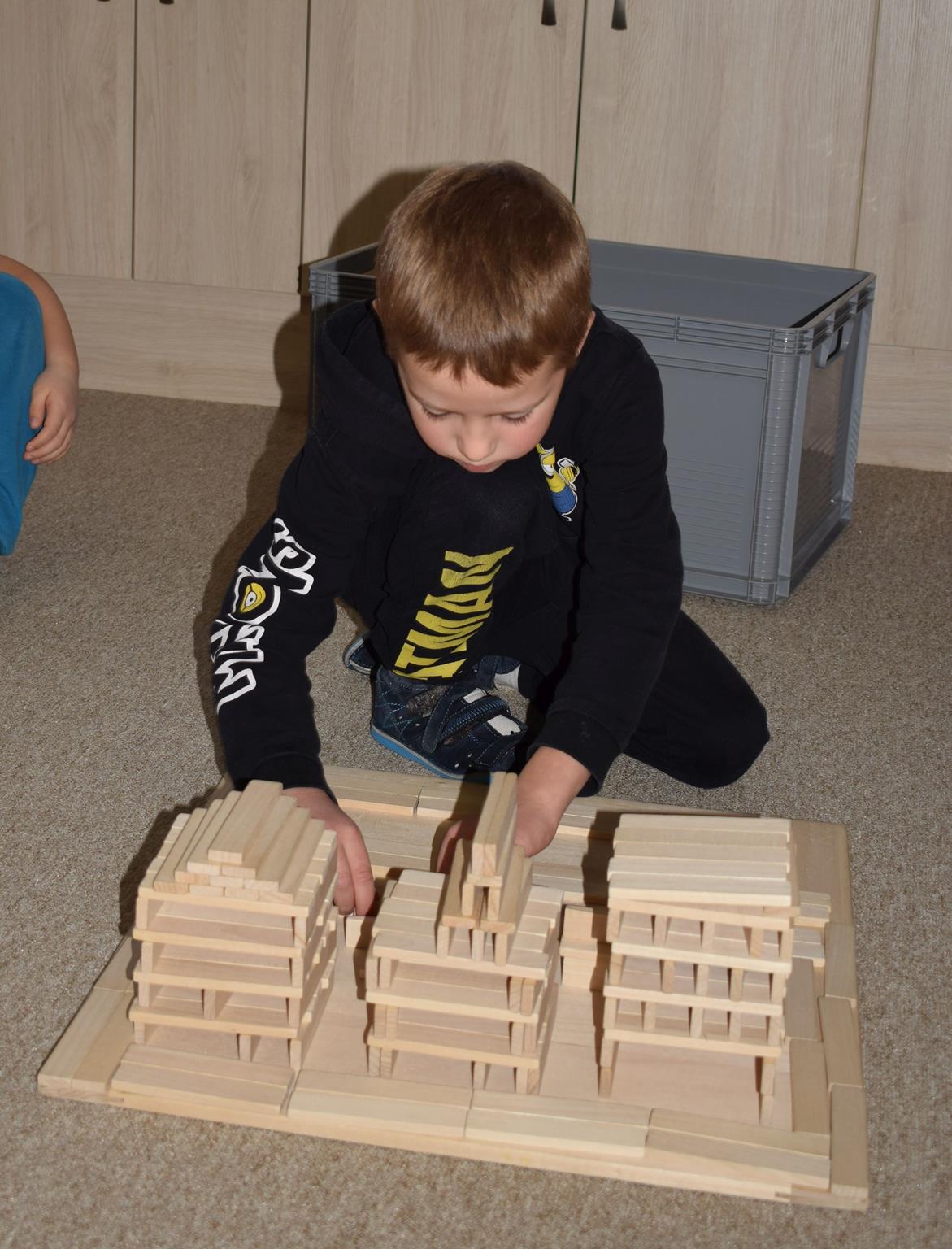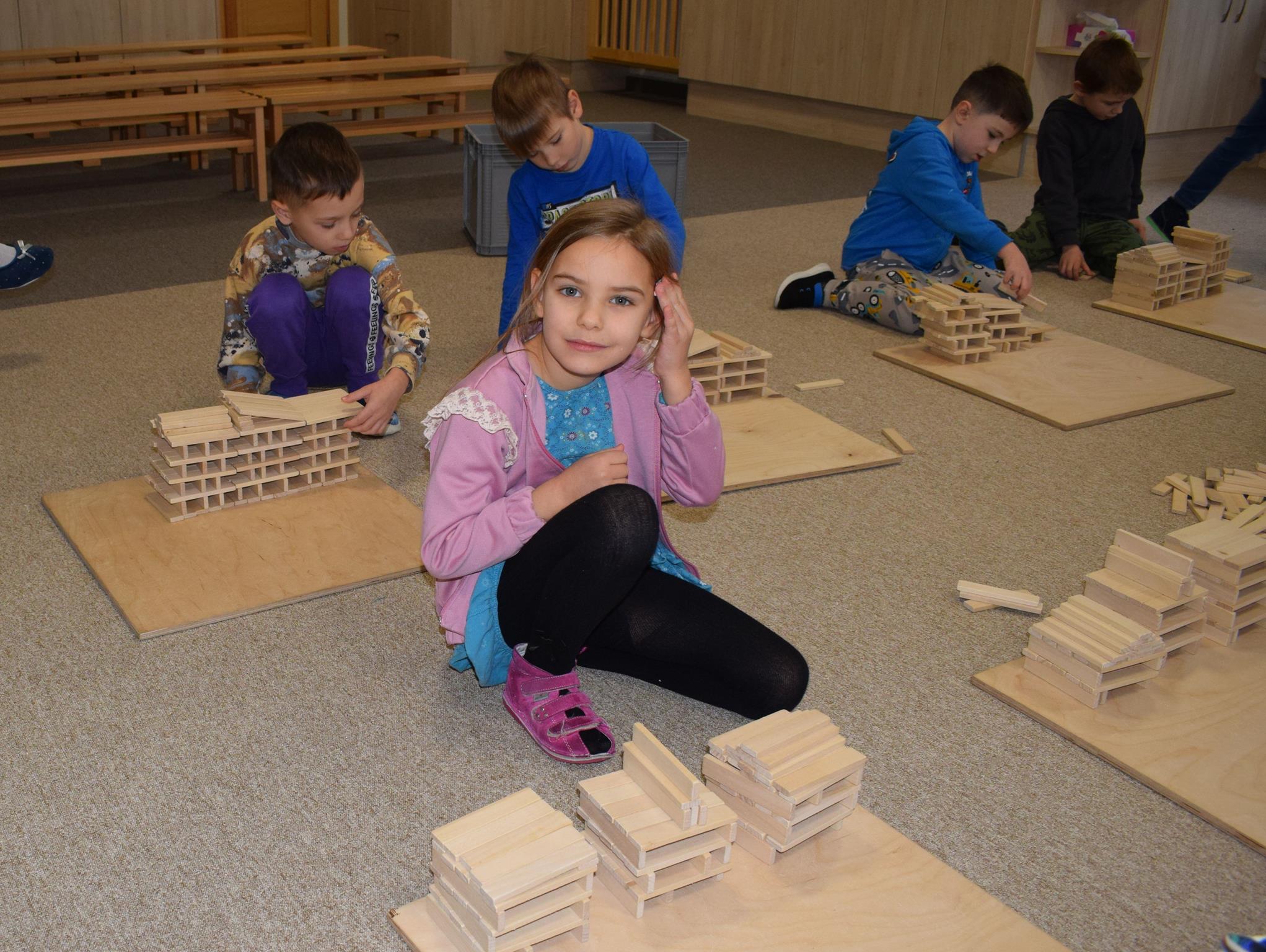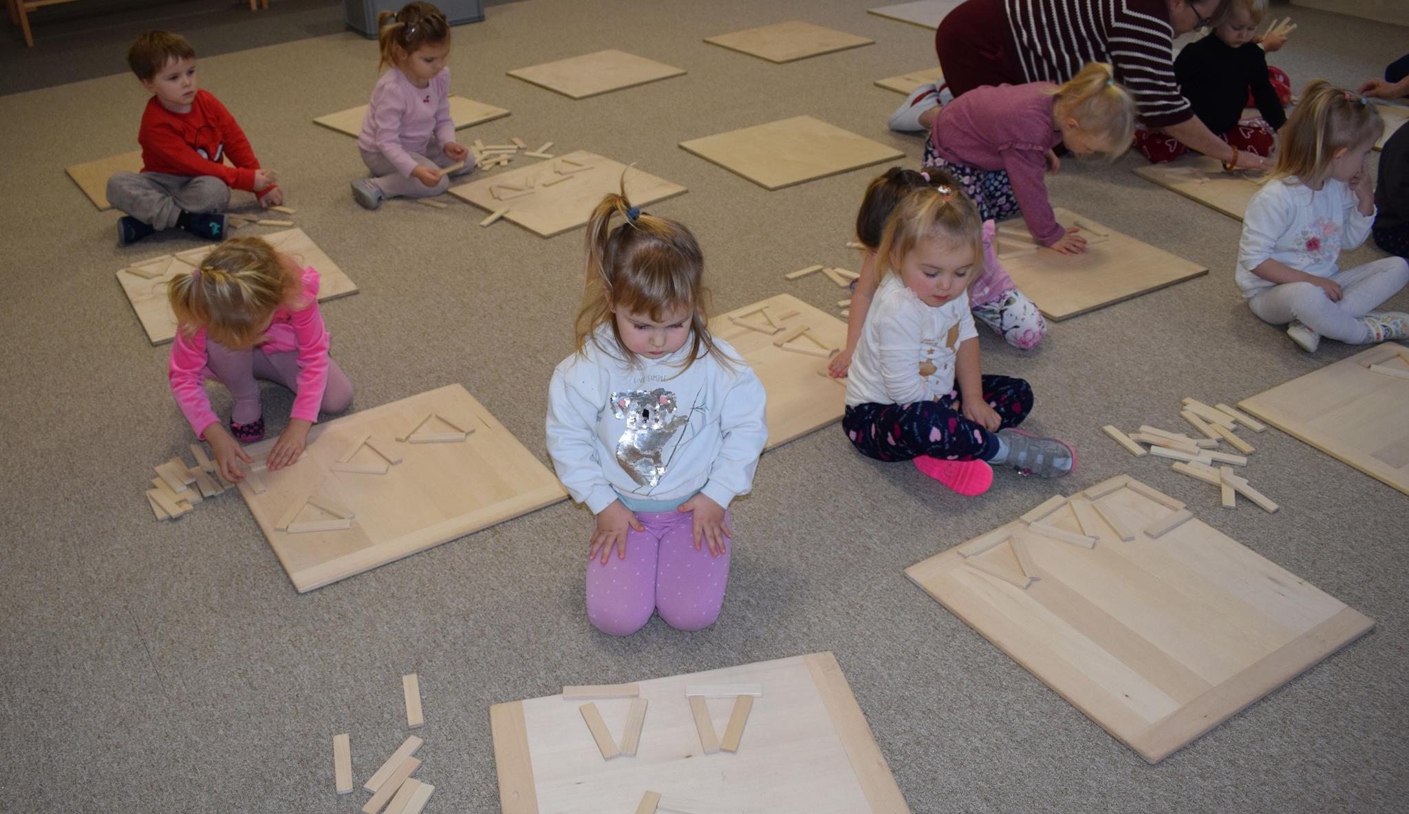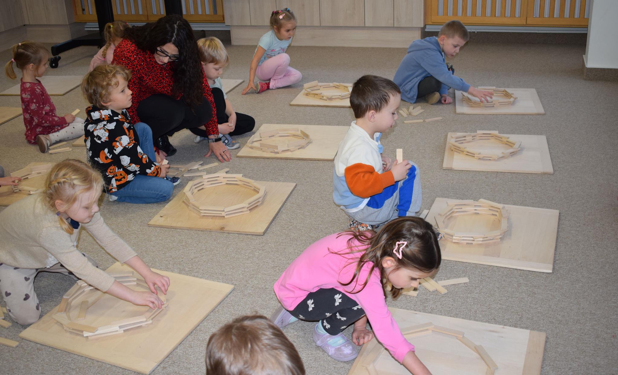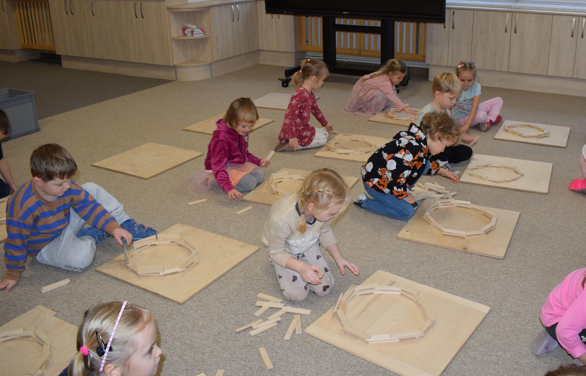 Po raz kolejny w tym roku dzieci uczestniczyły w warsztatach Małego Architekta. Wznosiły budowle pod czujnym okiem Pana Kreatka, musiały się wykazać umiejętnością uważnego słuchania, znajomością podstaw matematyki, a także zmysłem estetycznym, inicjatywą i umiejętnościami organizacyjnymi. Na pierwszy ogień poszły podstawowe konstrukcje geometryczne, takie jak trójkąty, kwadraty i koła. Motylki próbowały swoich sił we wznoszeniu budowli przypominającej rzymskie koloseum. Starszaki reprezentując wyższy poziom umiejętności, bo przecież to już trzeci rok, jak szlifują wymienione umiejętności, wznosiły budowle przypominające te z Rynku Starego Miasta w stolicy.